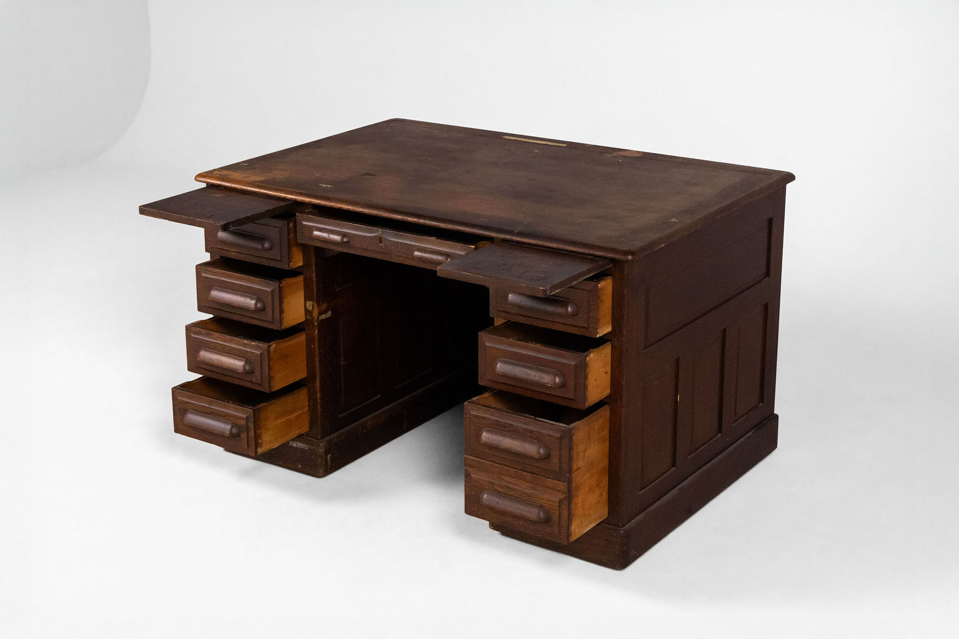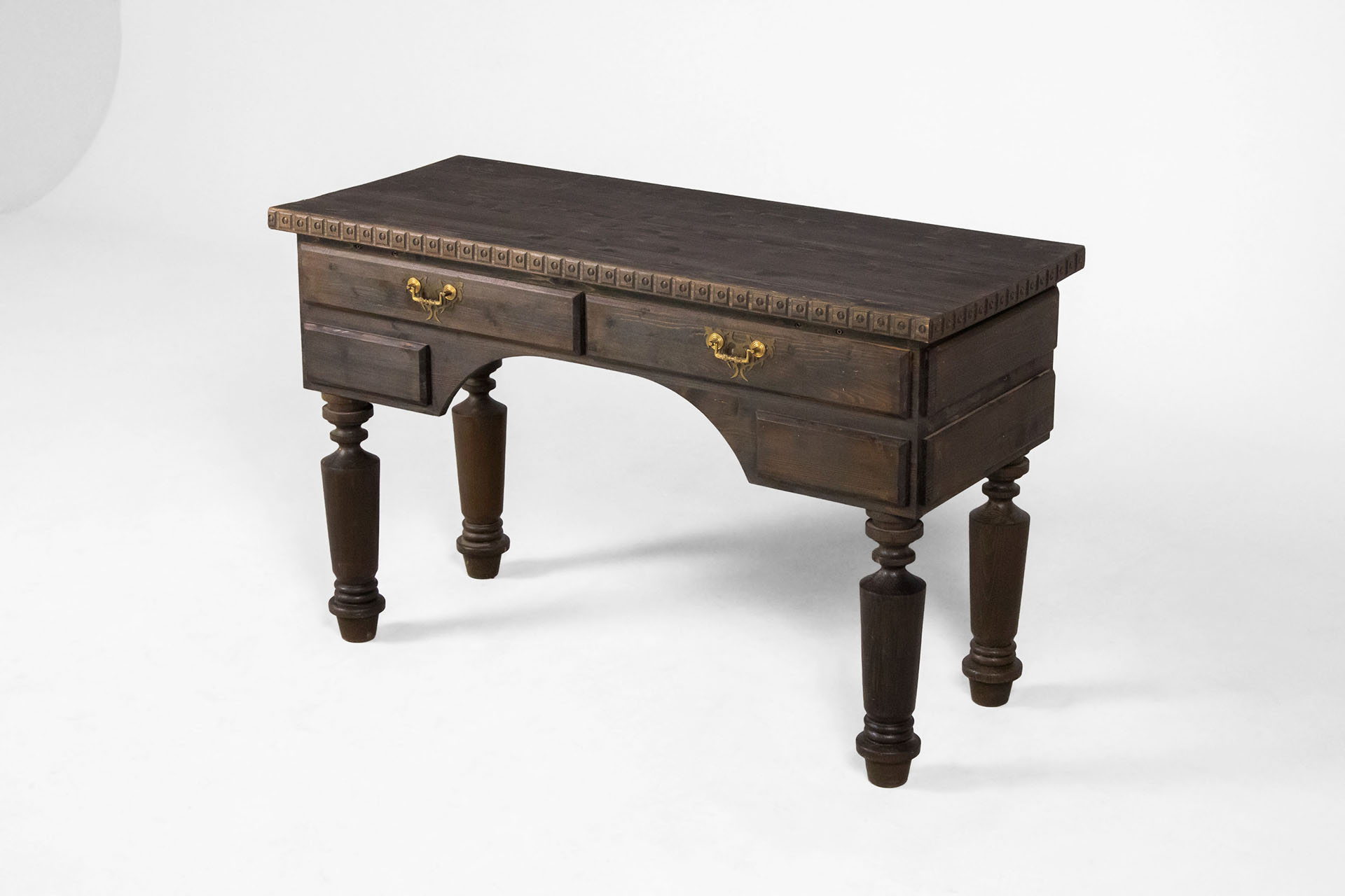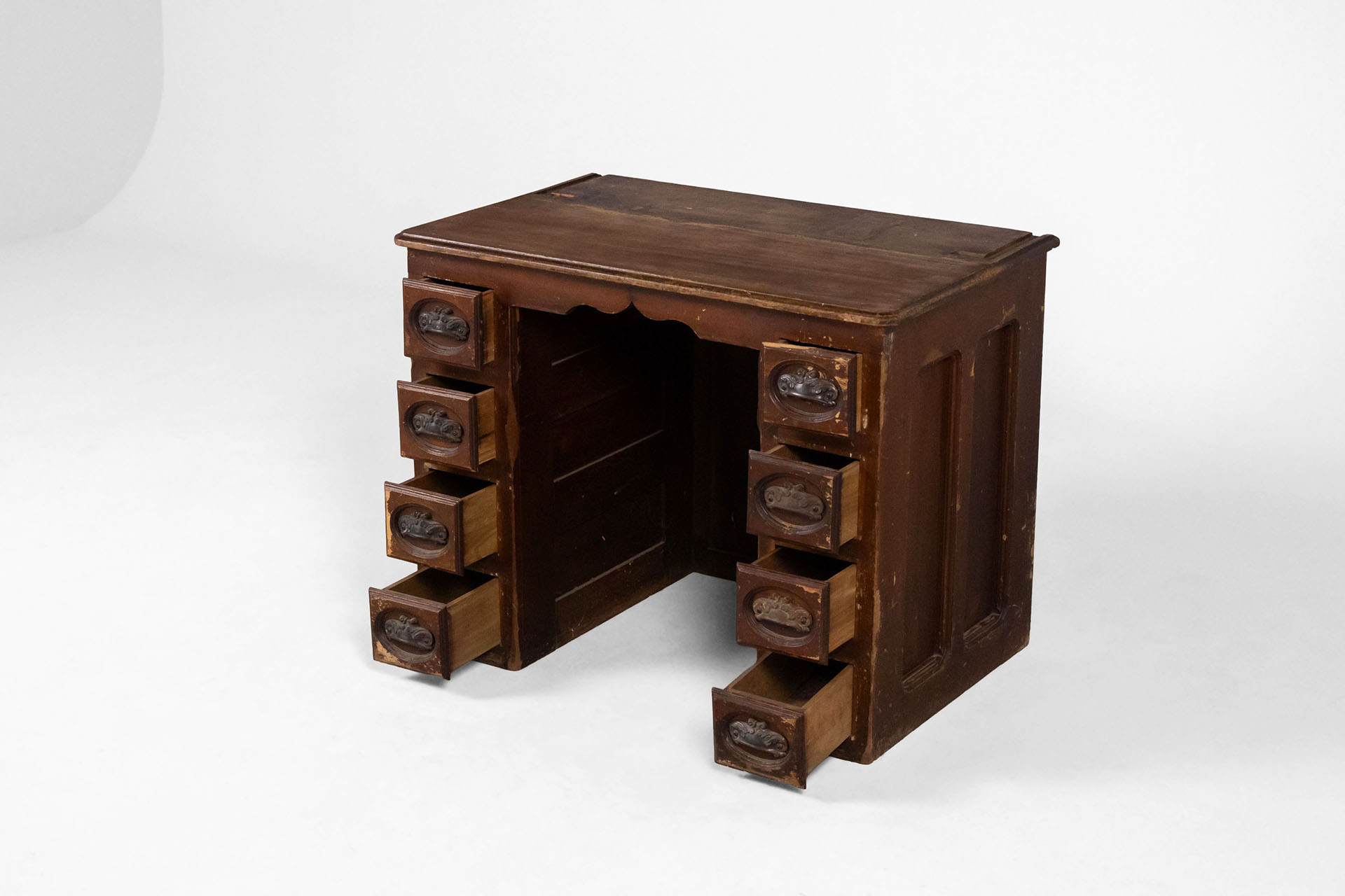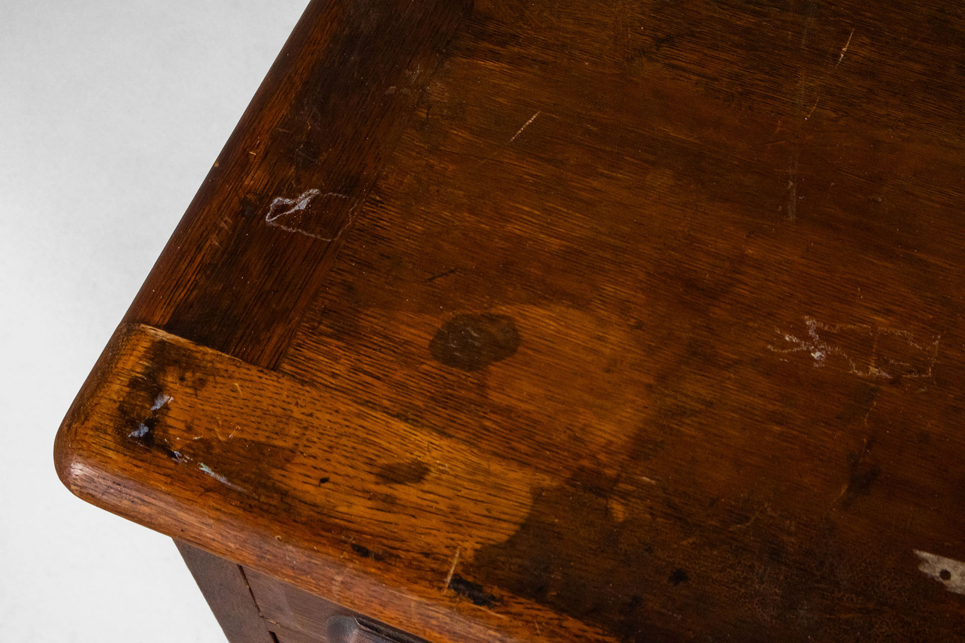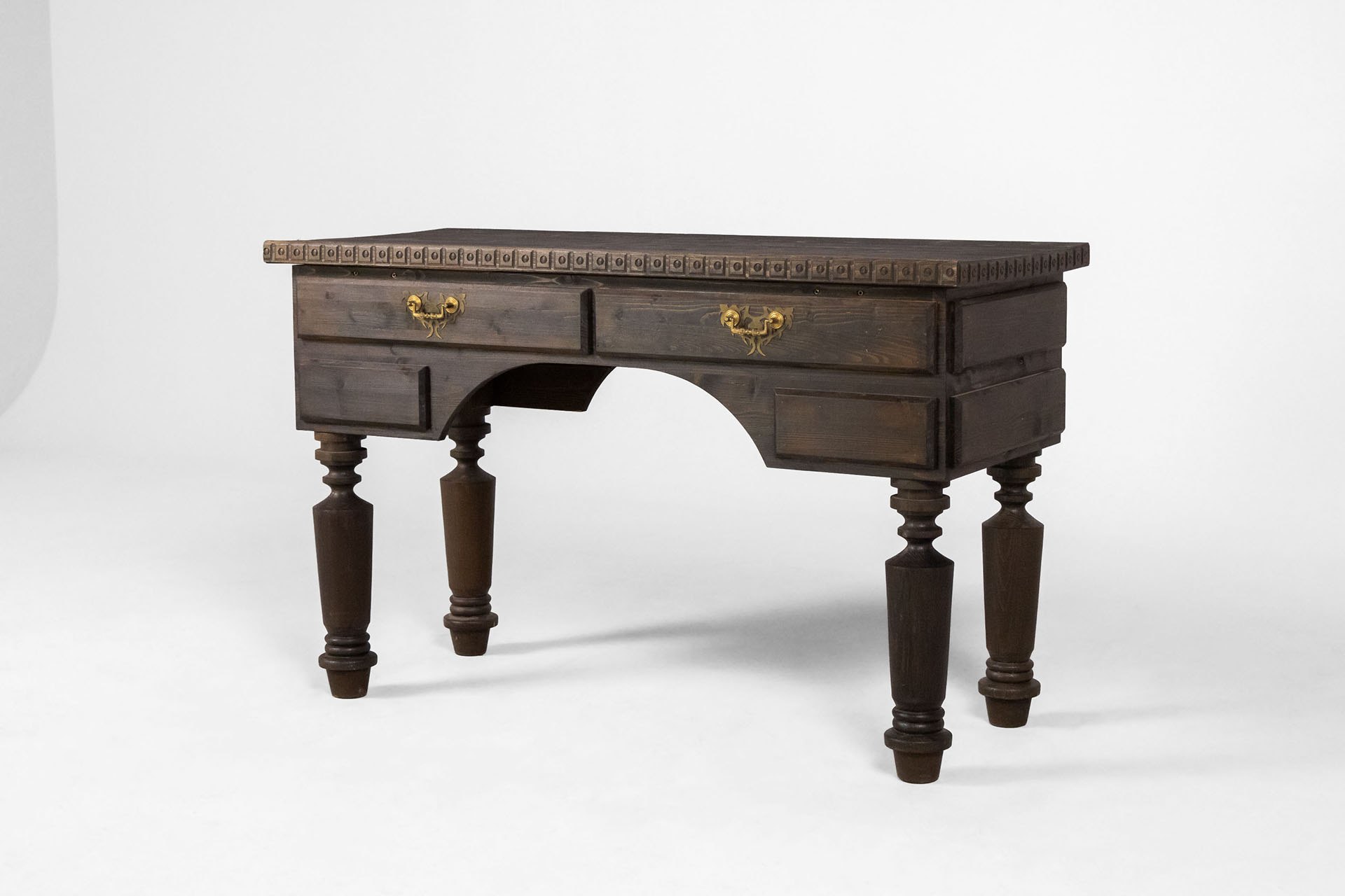 Antik íróasztal robusztus szerkezettel és praktikus tárolóhelyeikel és kopottas felülettel