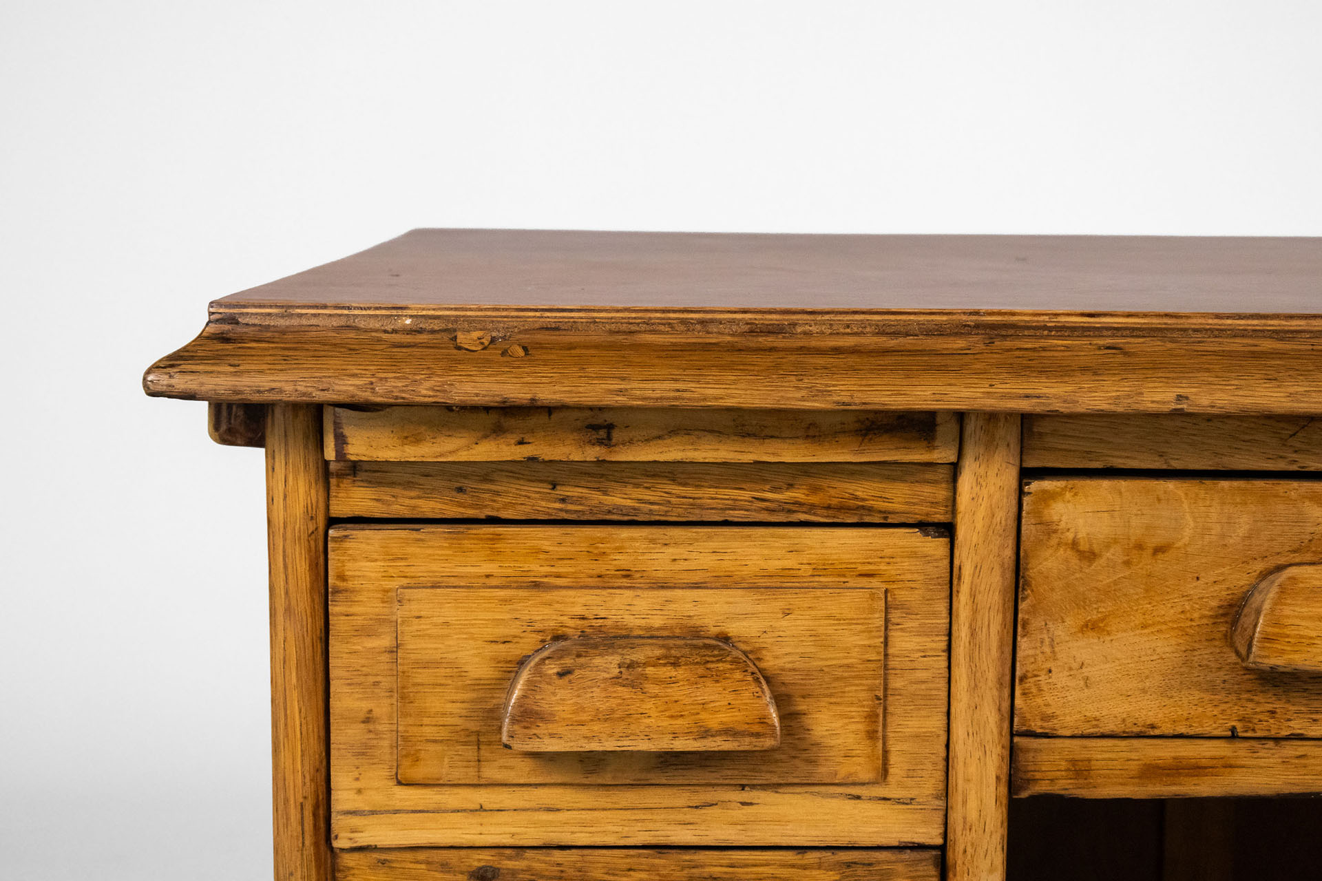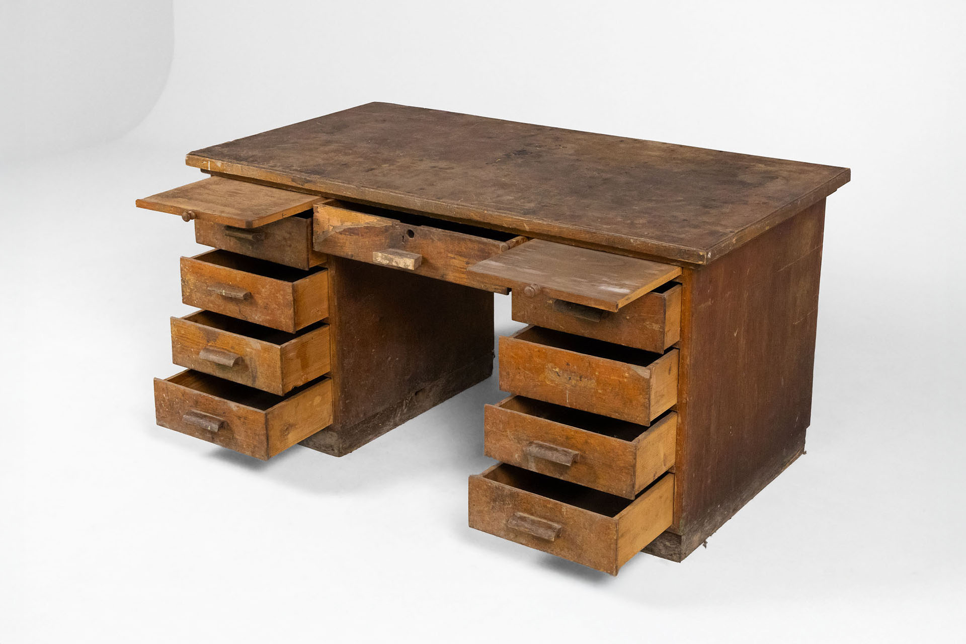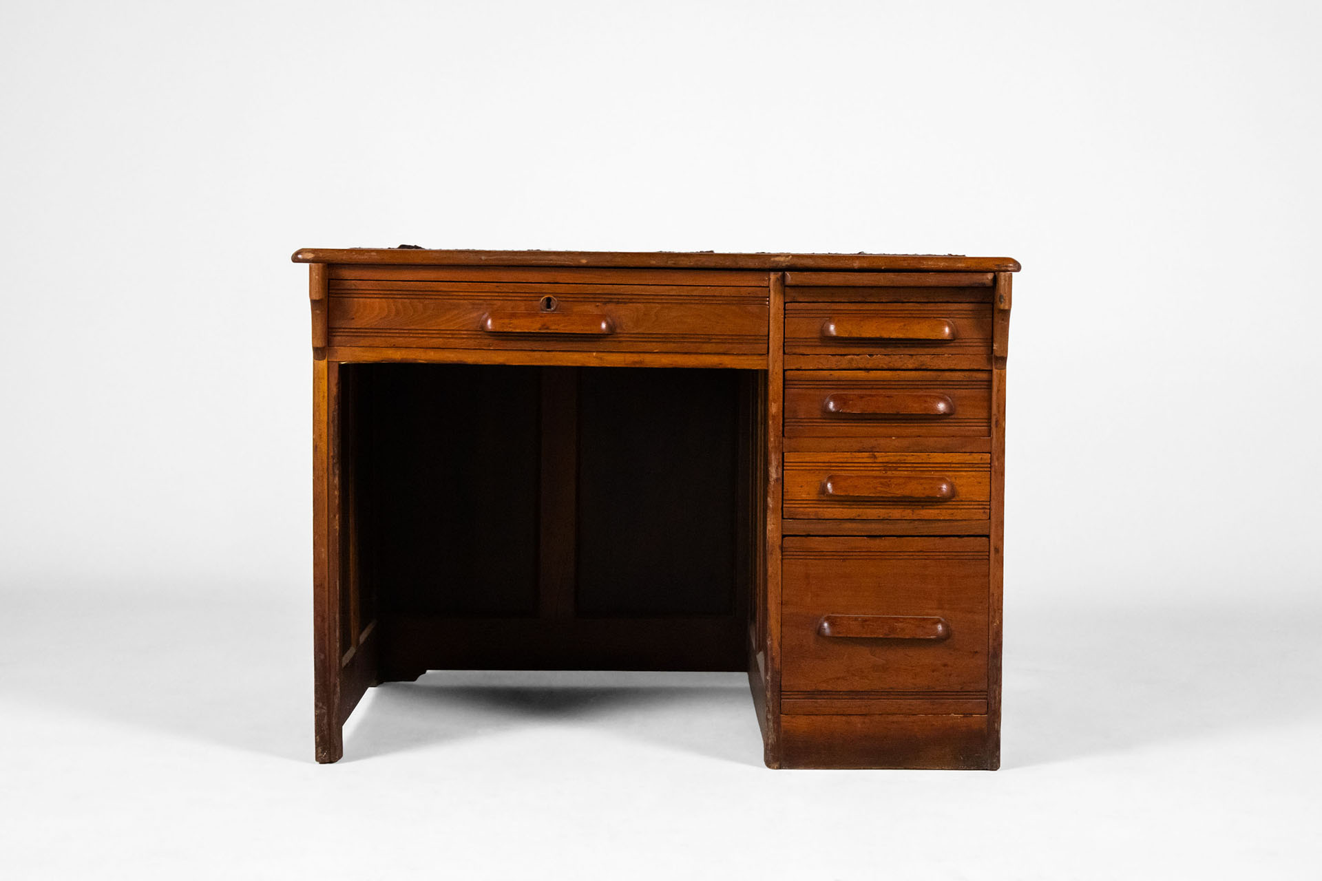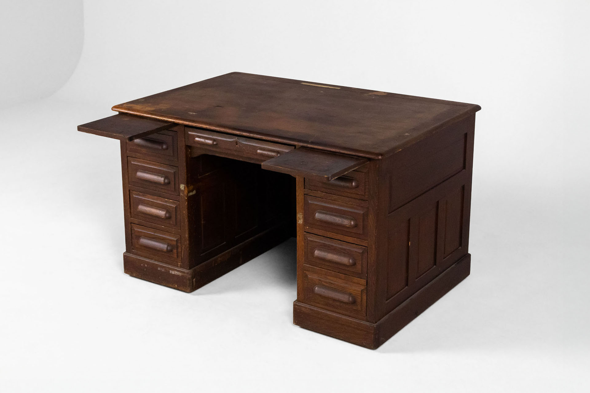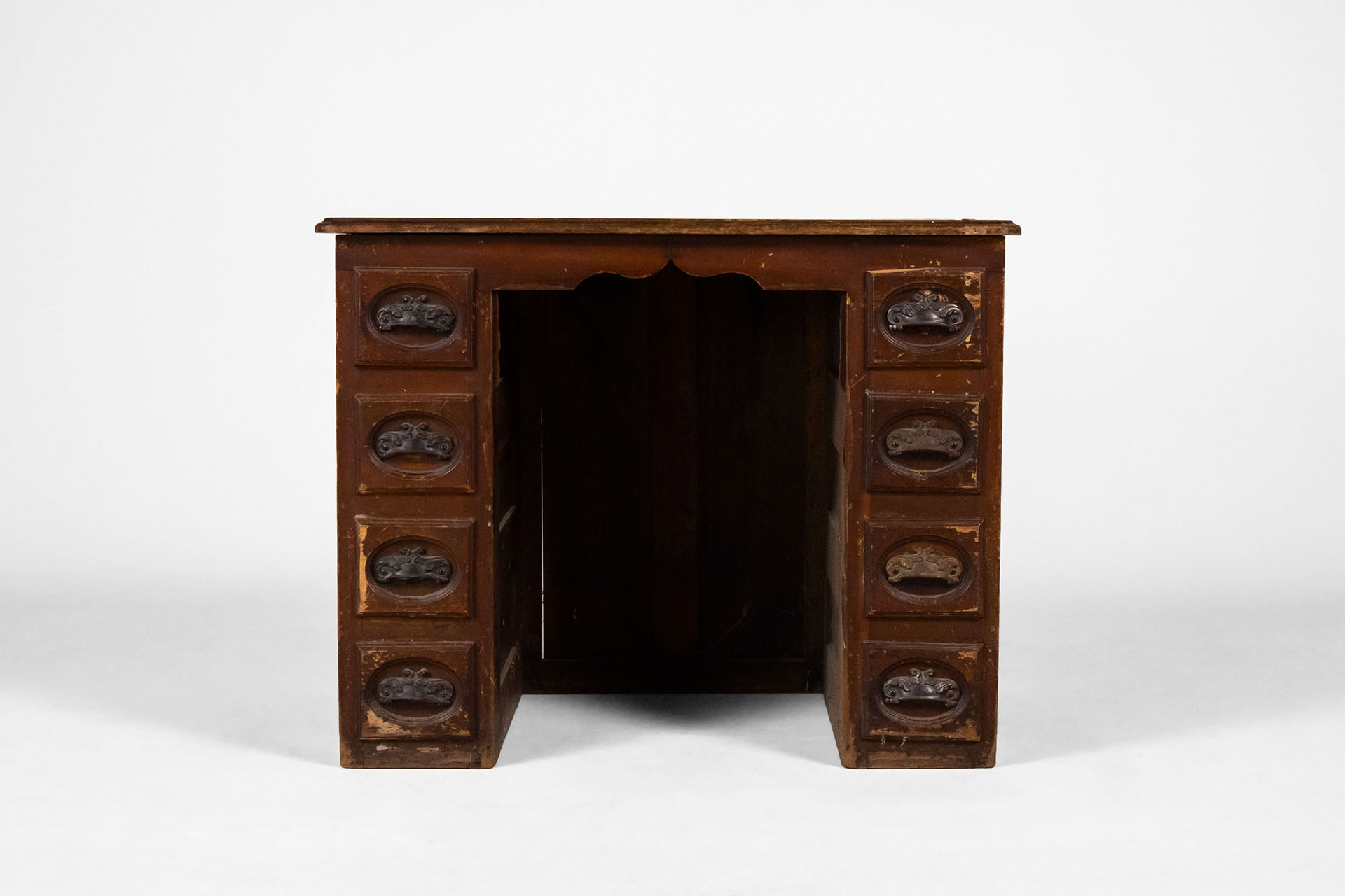 Antik íróasztal robusztus szerkezettel és praktikus tárolóhelyeikel és kopottas felülettel