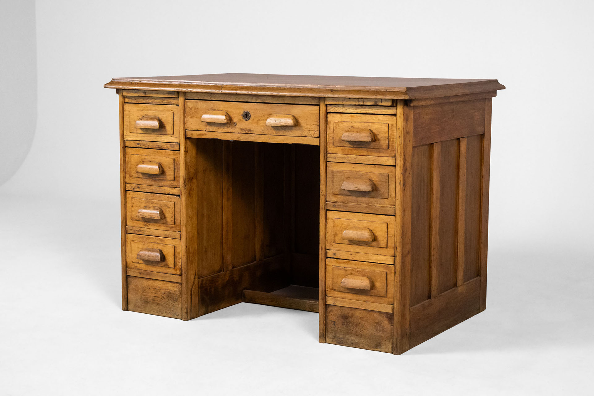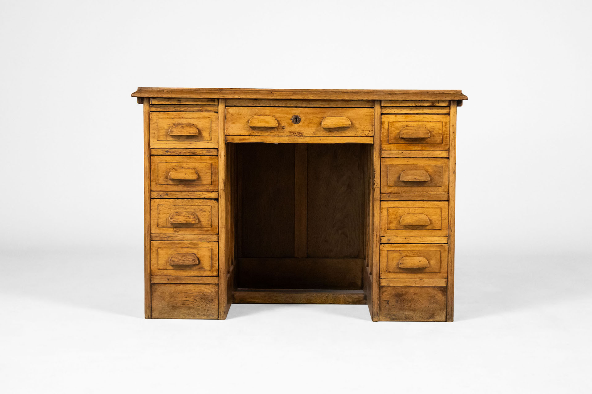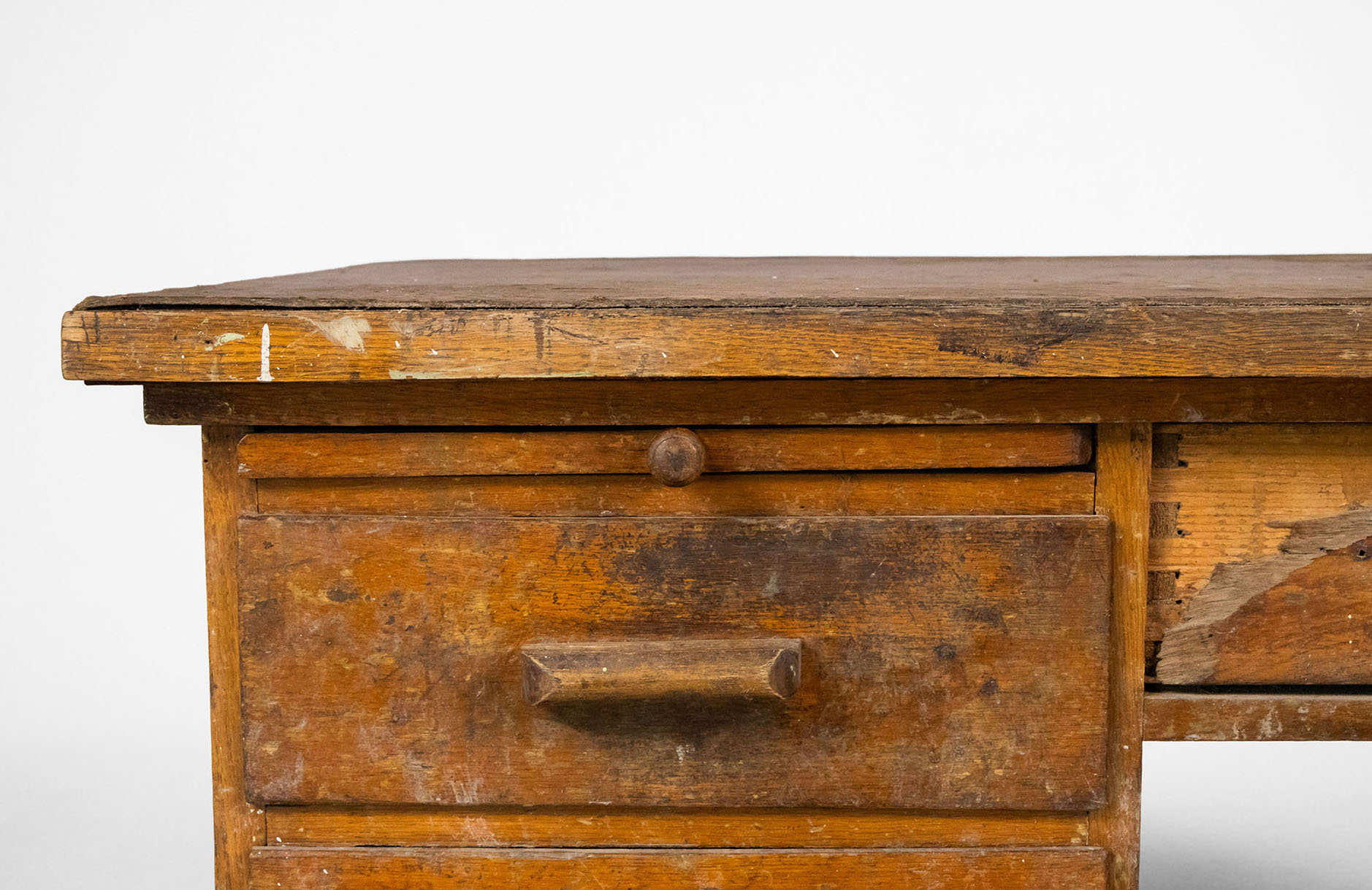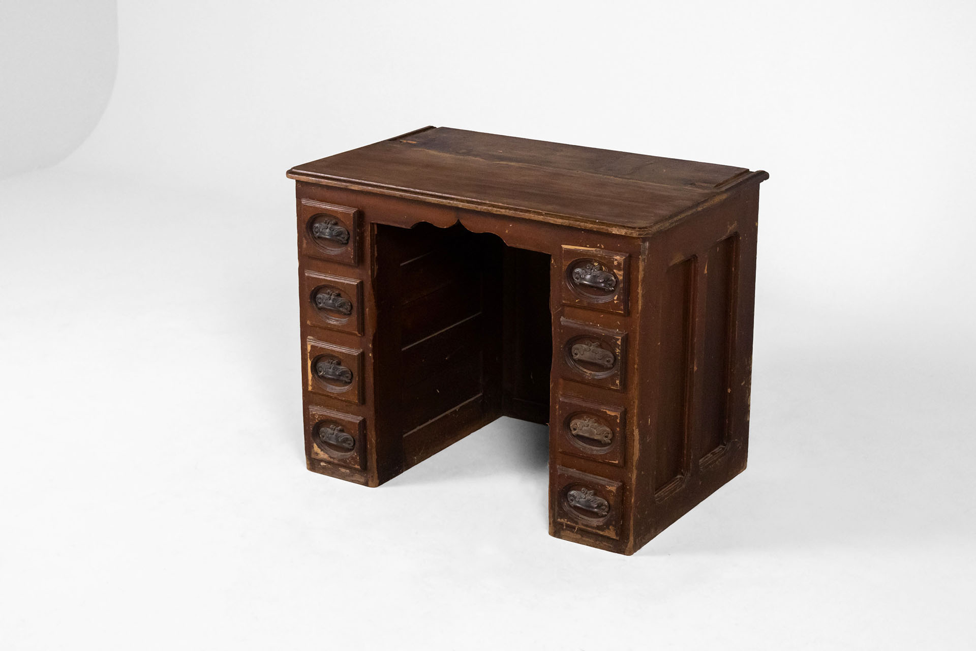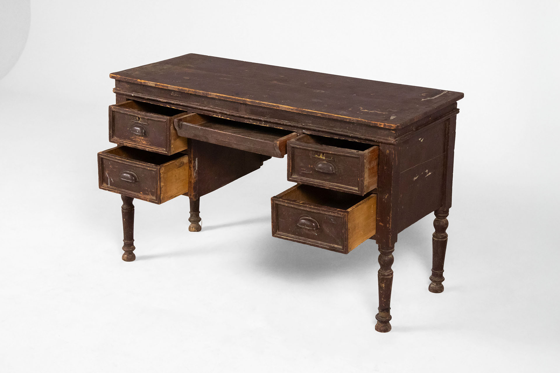 Antik íróasztal robusztus szerkezettel és praktikus tárolóhelyeikel és kopottas felülettel