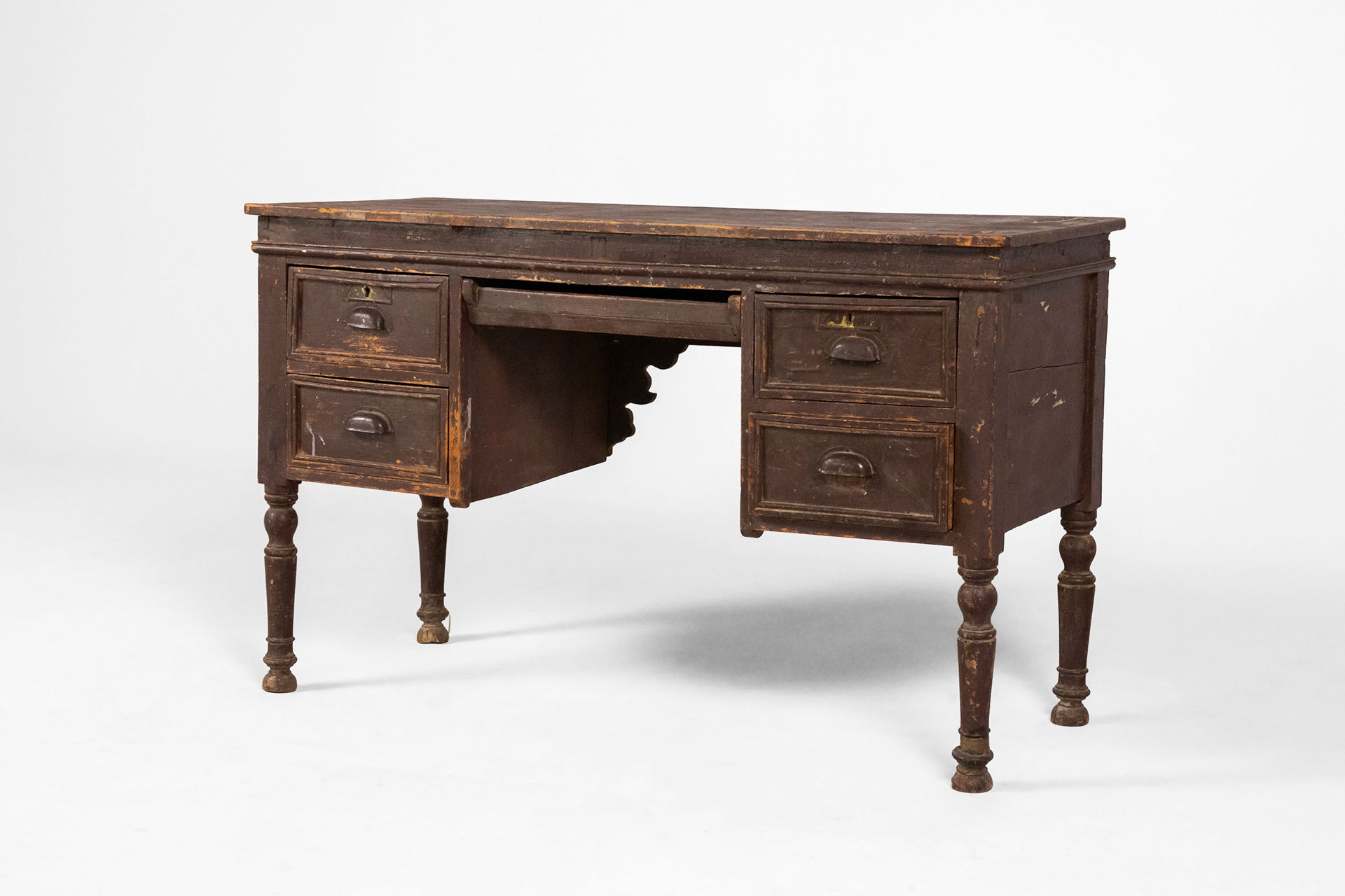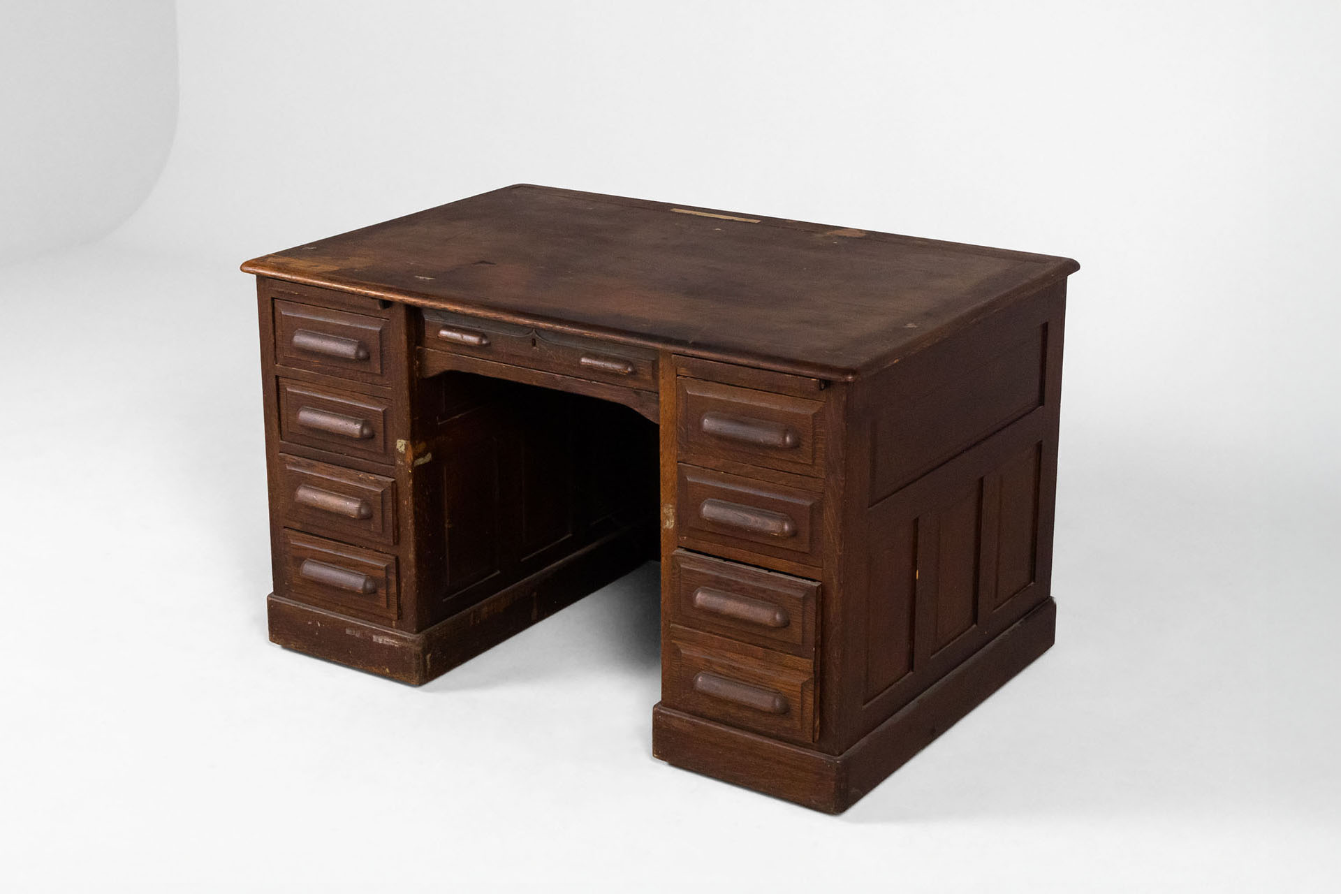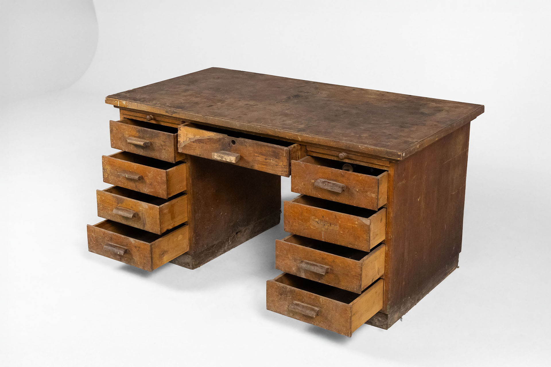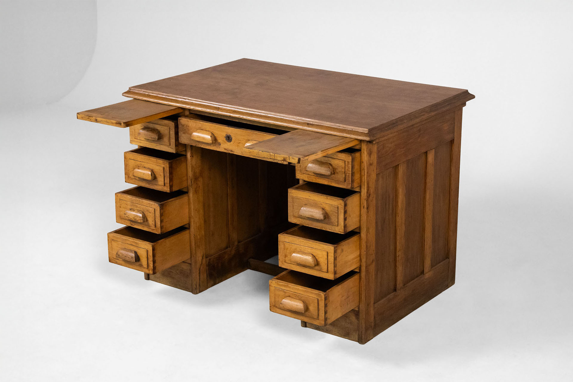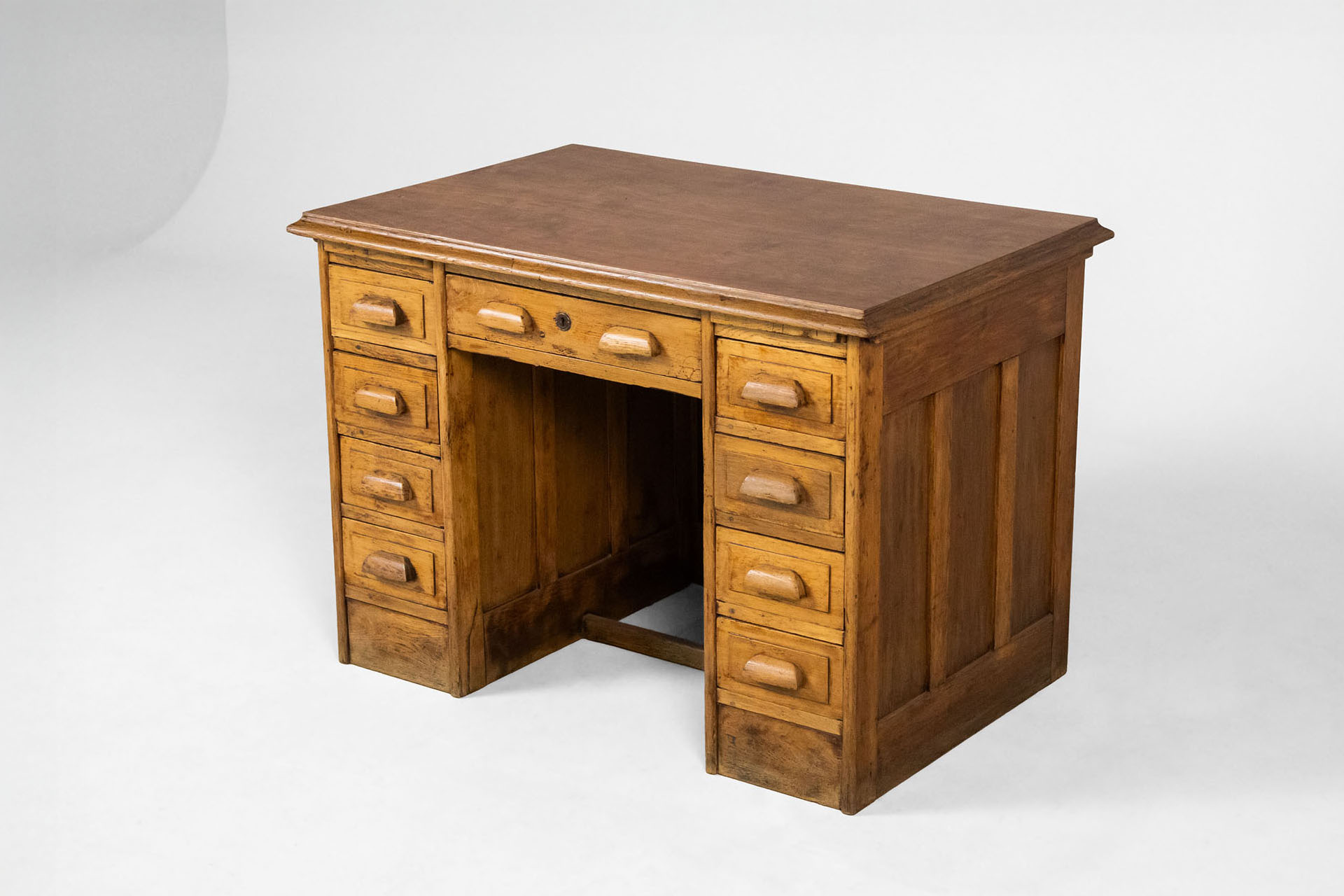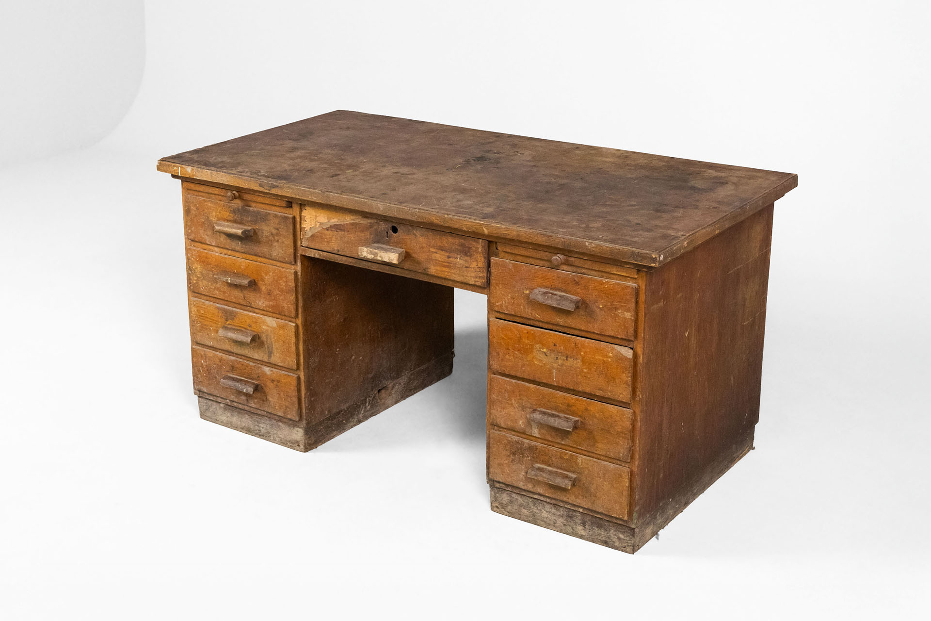 Antik íróasztal robusztus szerkezettel és praktikus tárolóhelyeikel és kopottas felülettel
