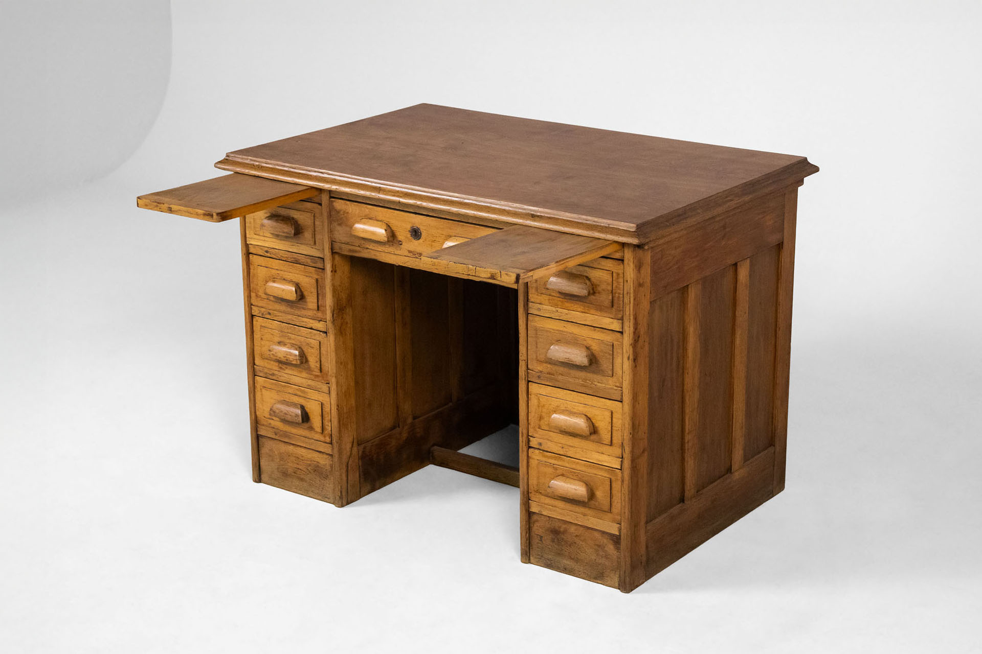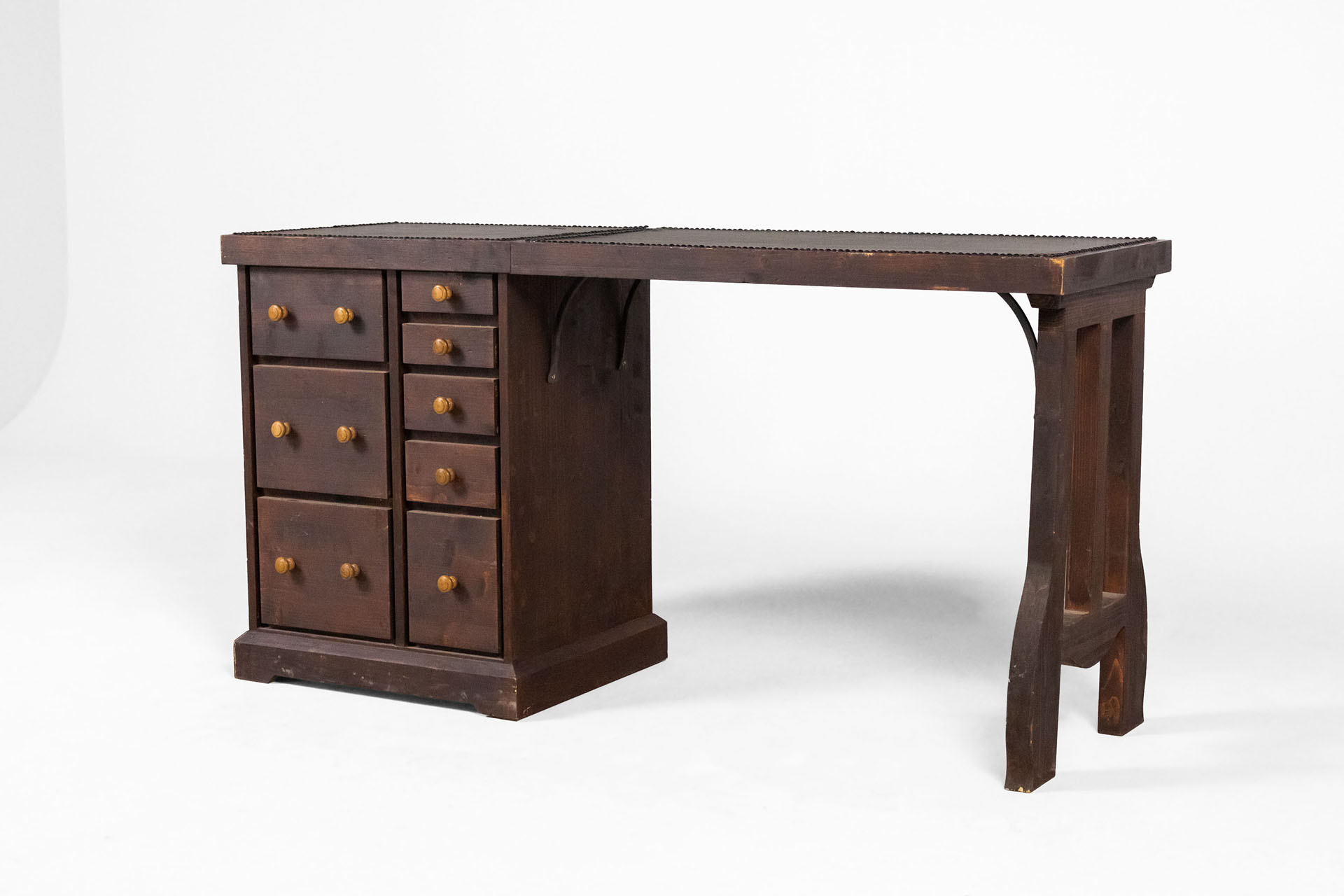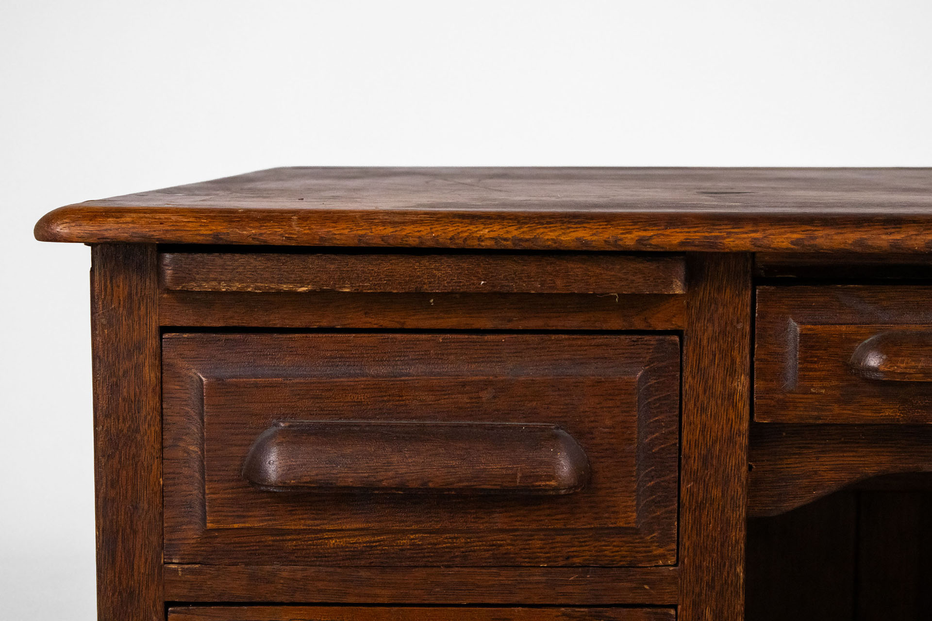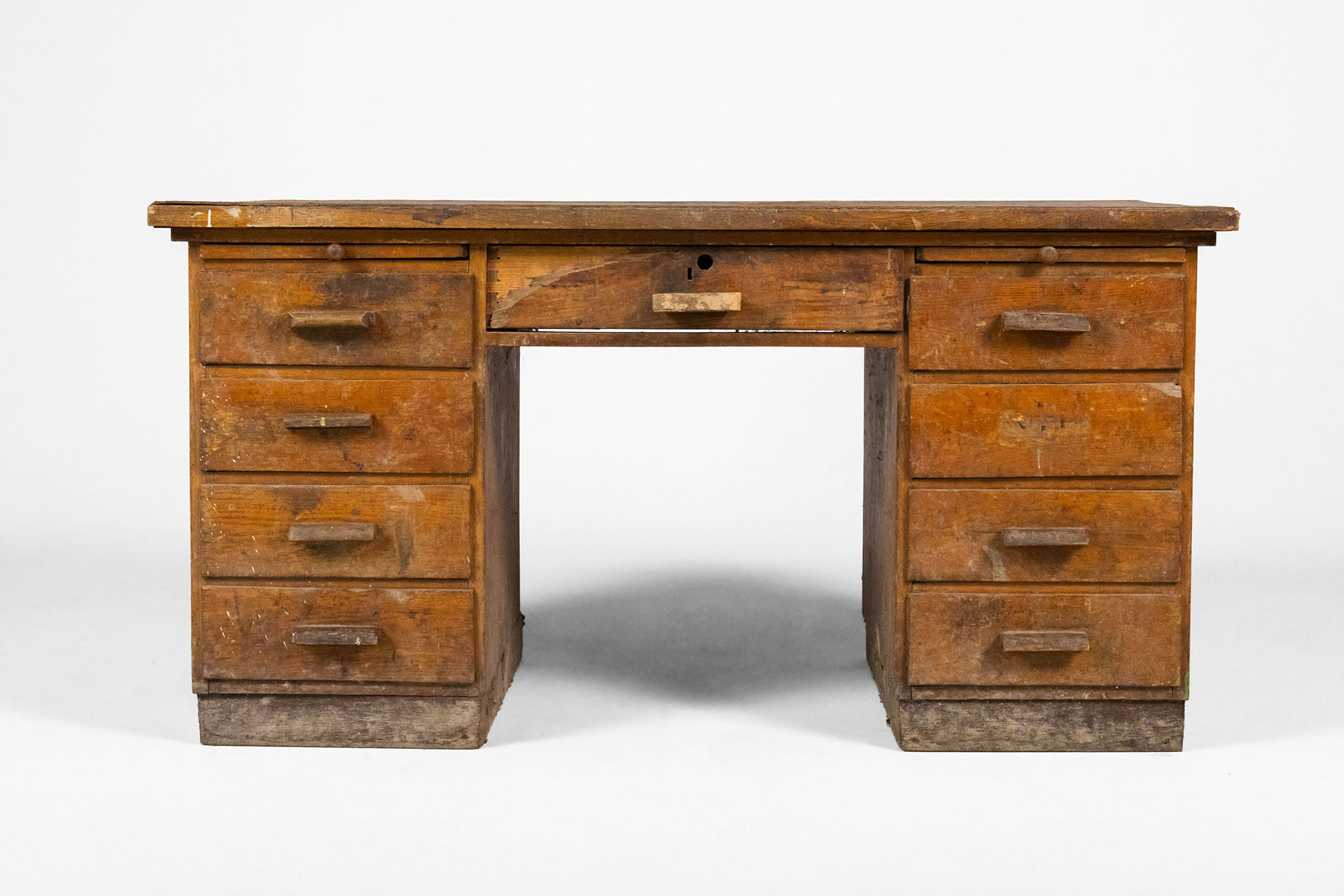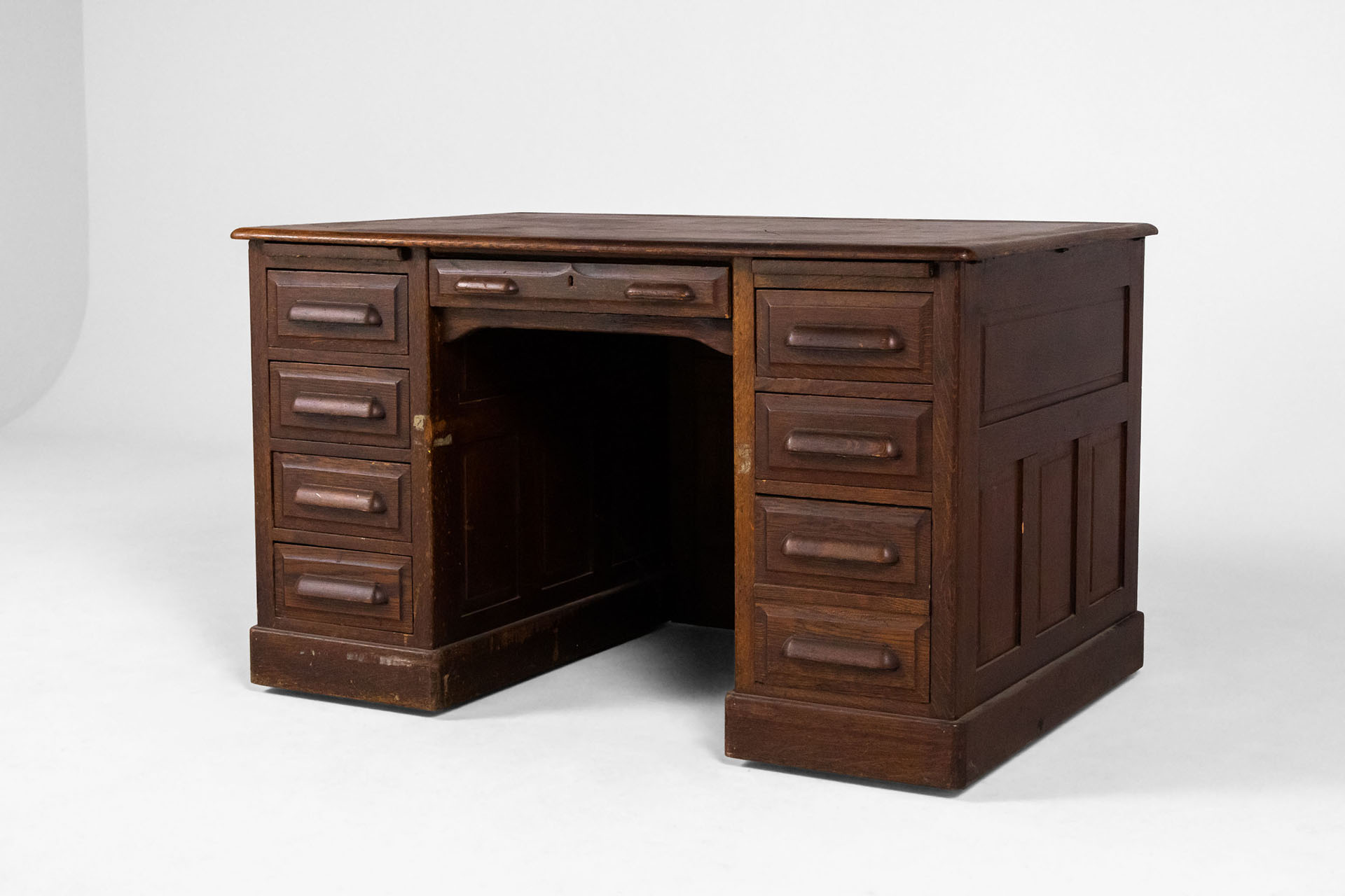 Antik íróasztal robusztus szerkezettel és praktikus tárolóhelyeikel és kopottas felülettel