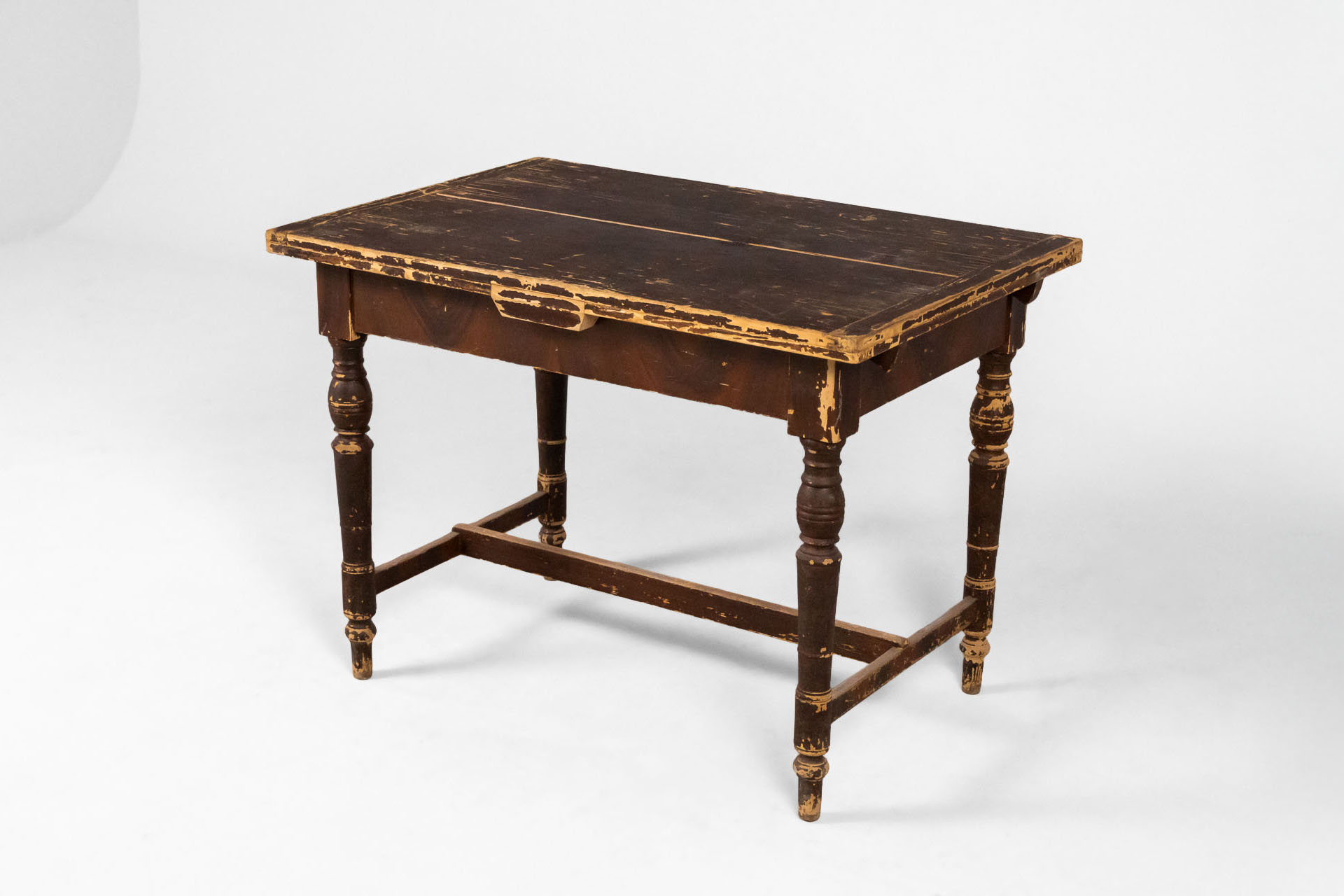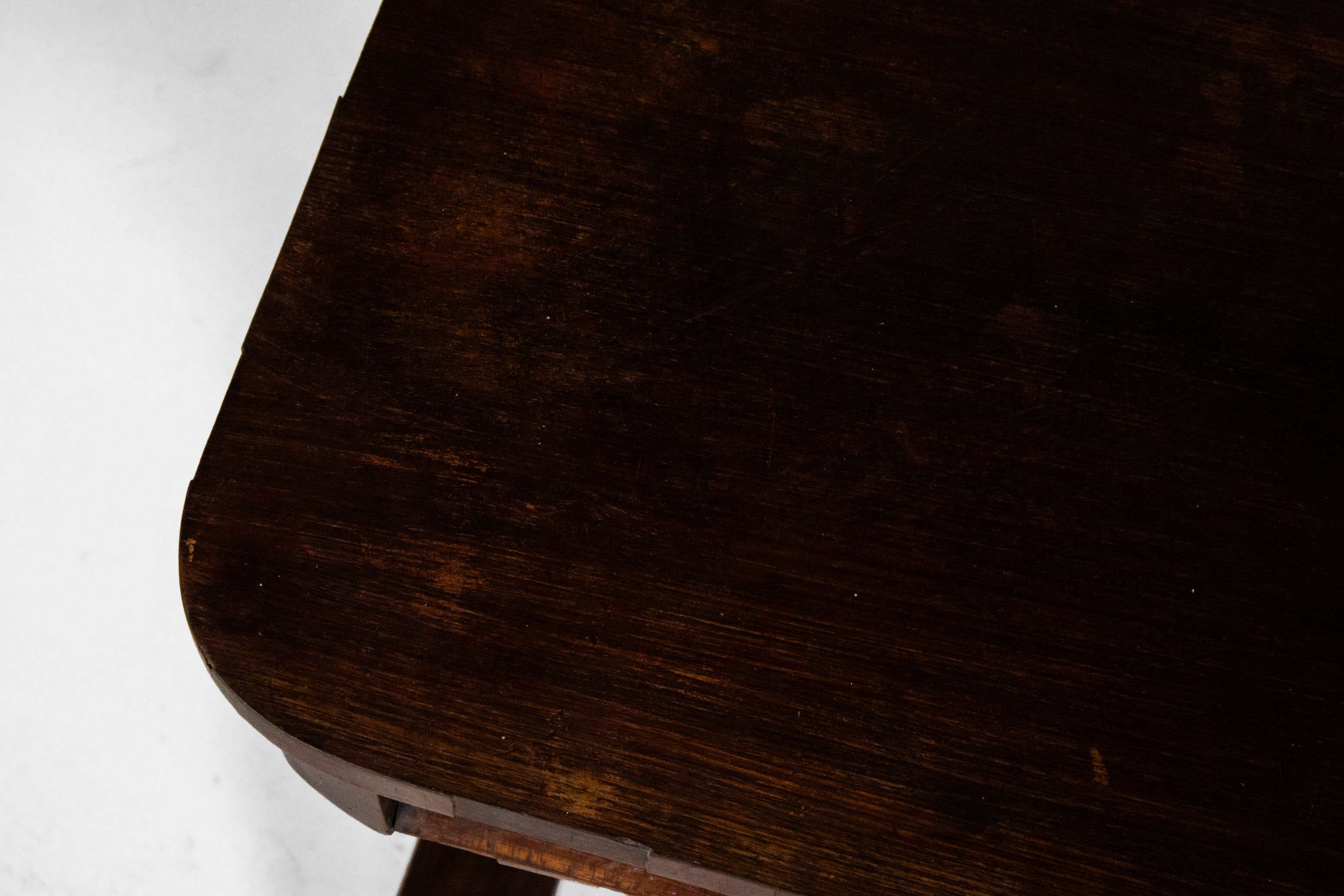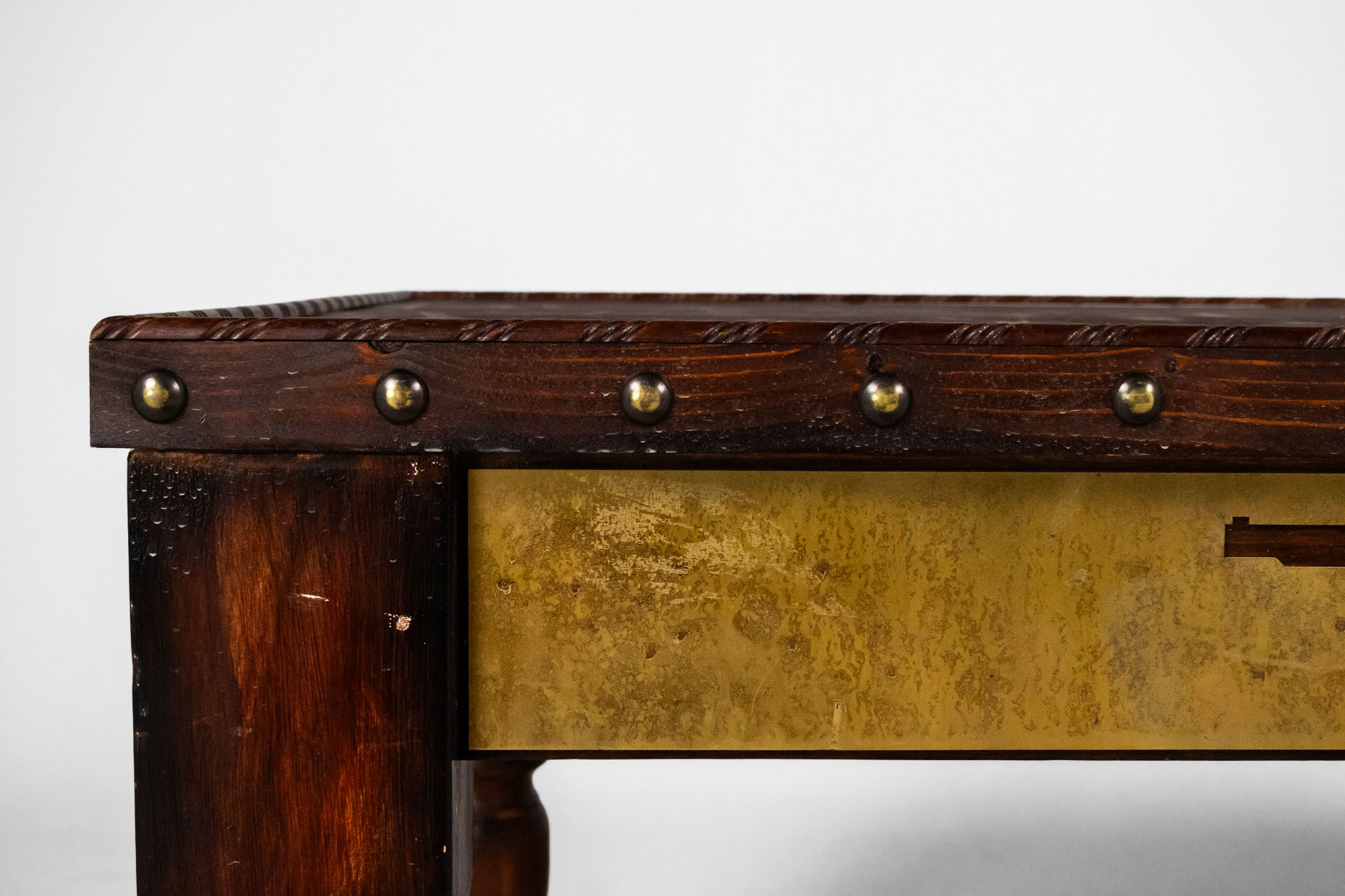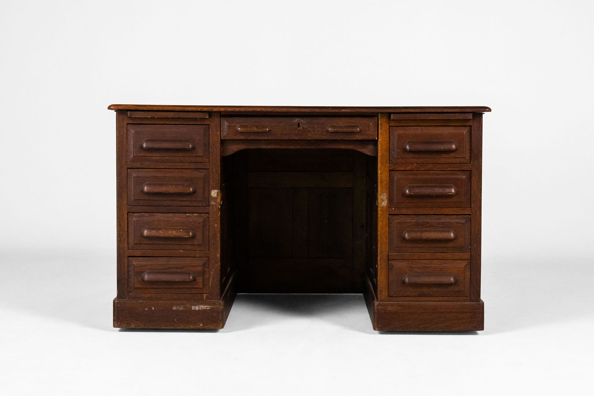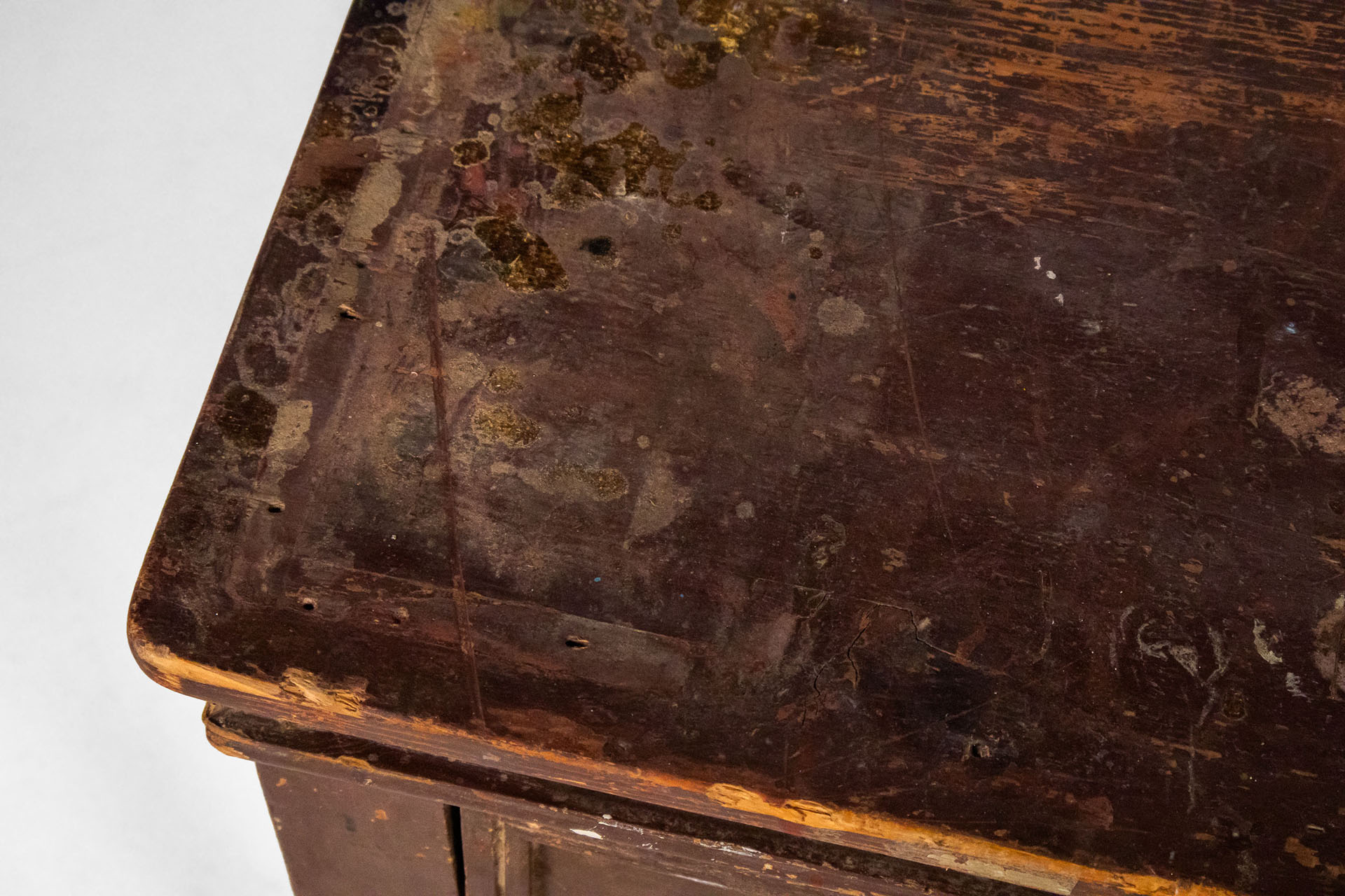 Antik íróasztal robusztus szerkezettel és praktikus tárolóhelyeikel és kopottas felülettel