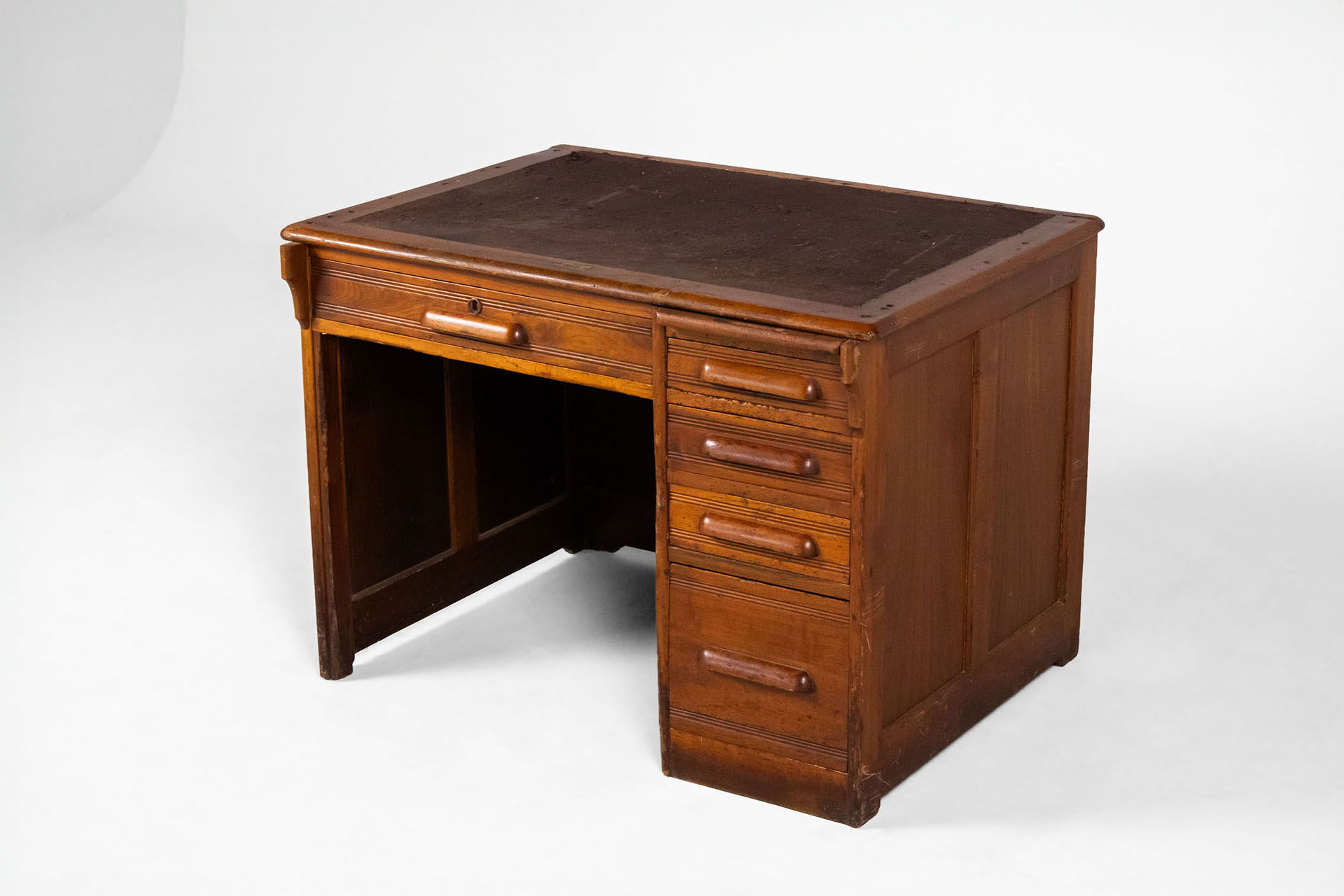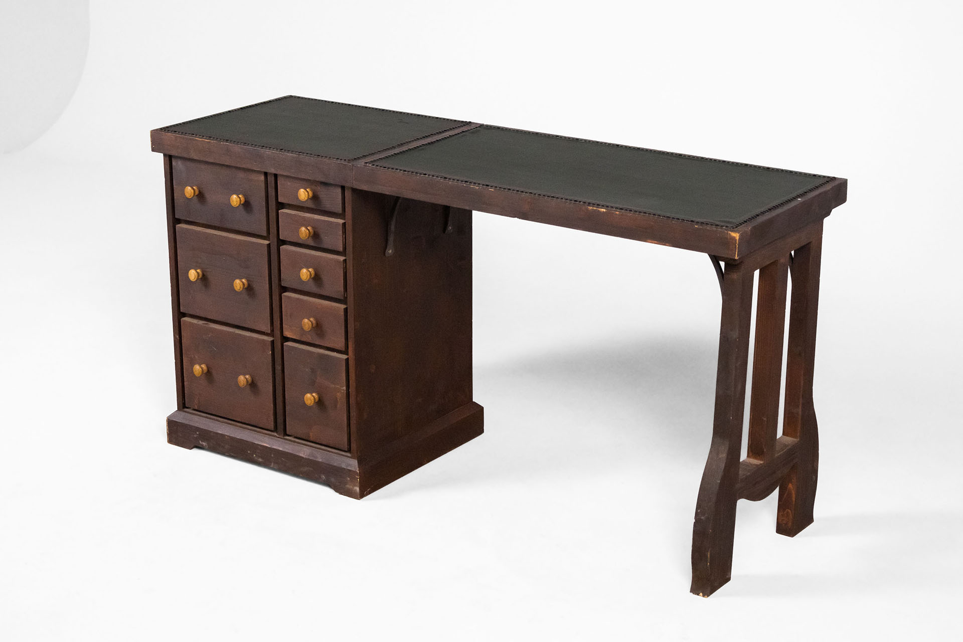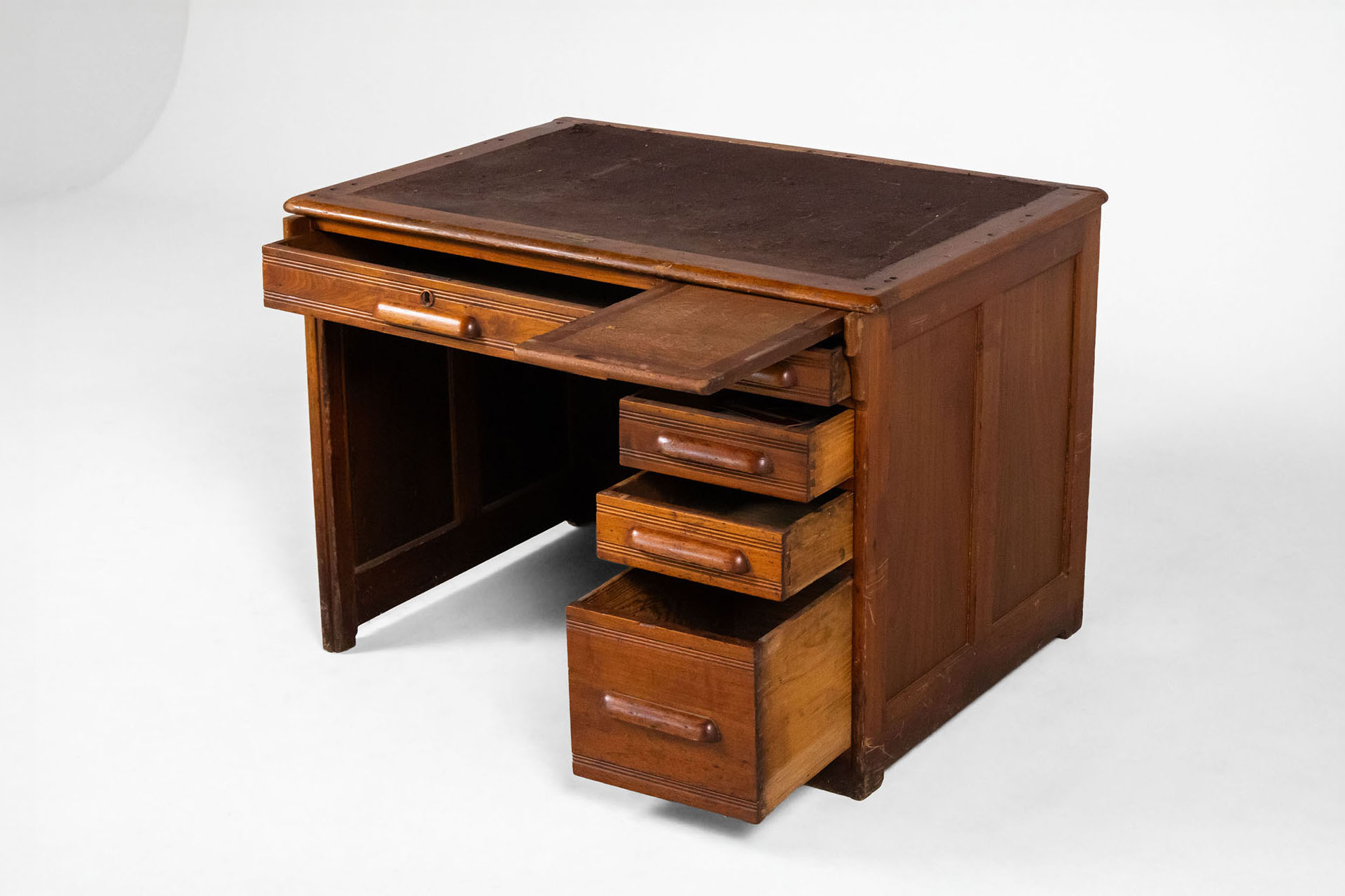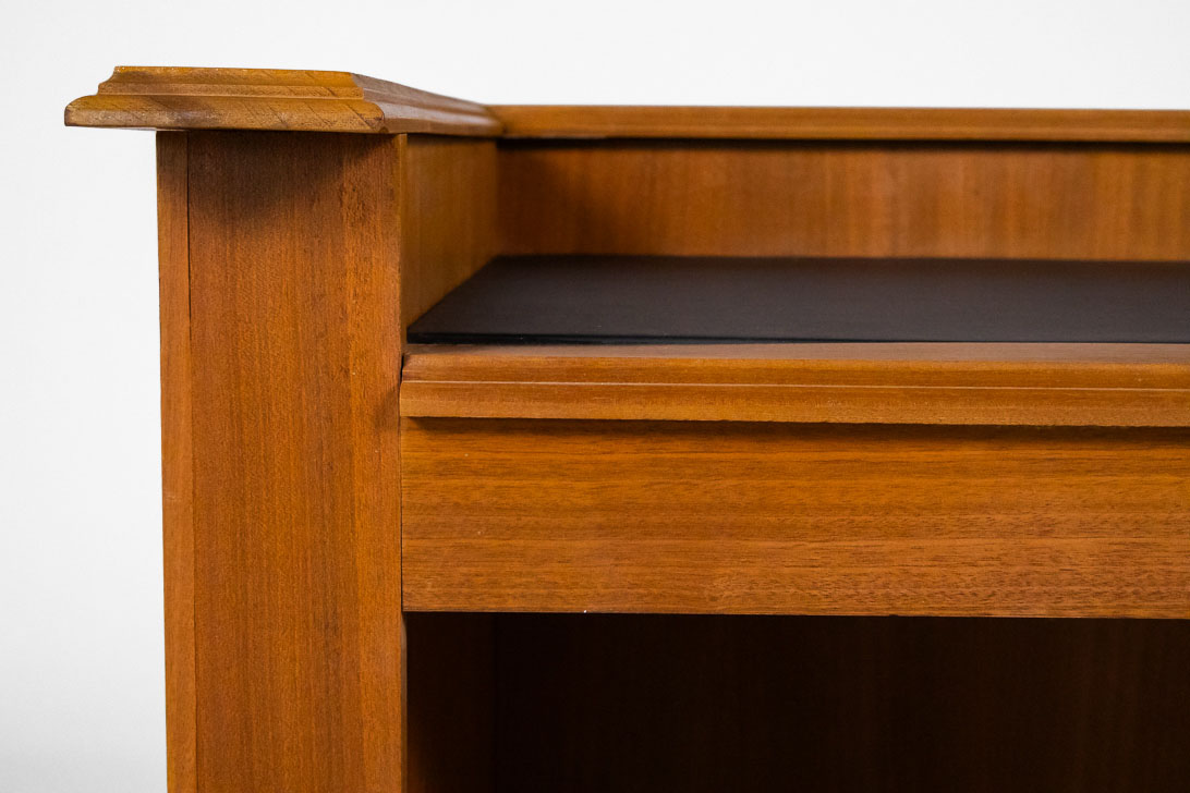 Vintage féloldalas íróasztal sötétbarna fából és sötétzöld bőr borítással