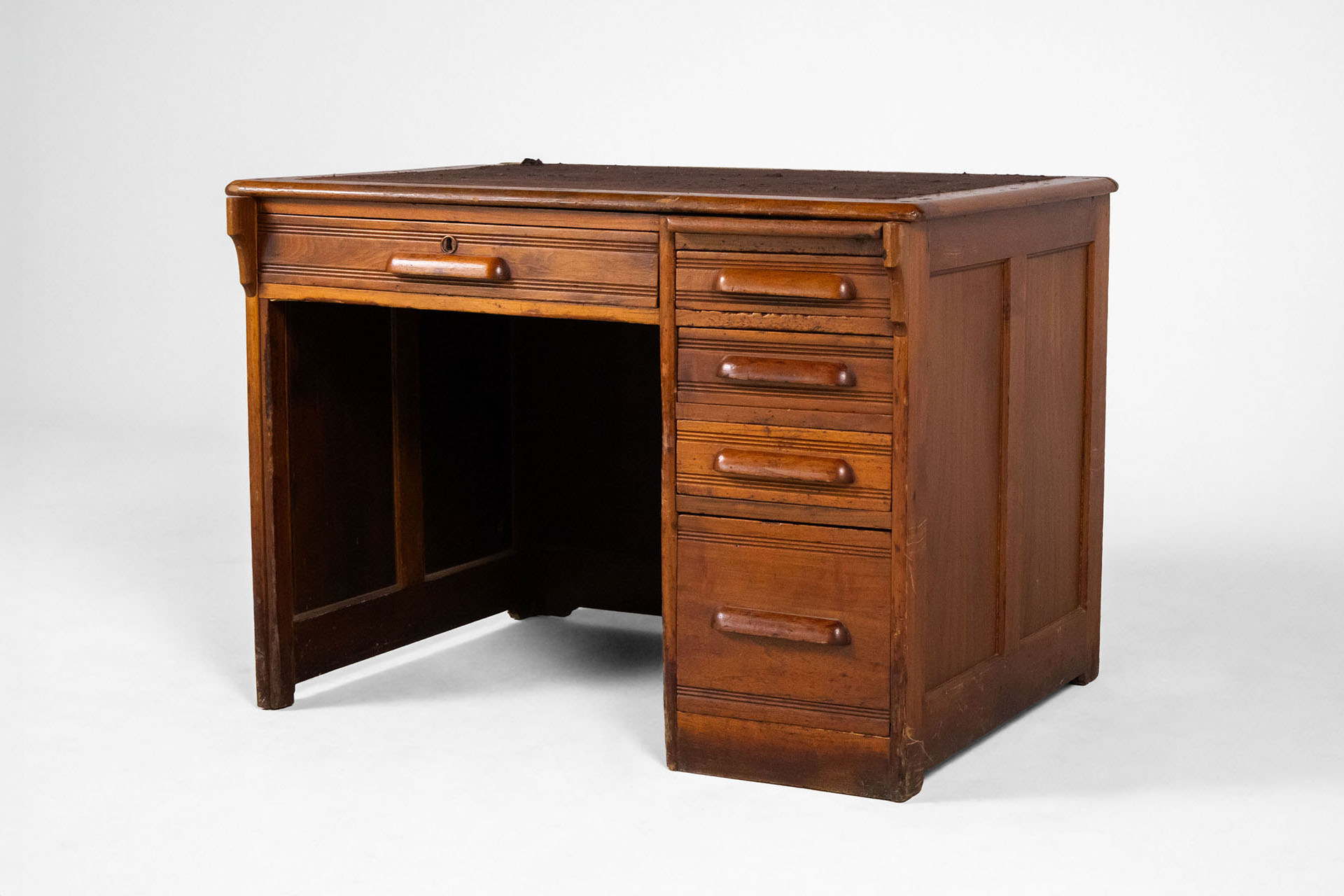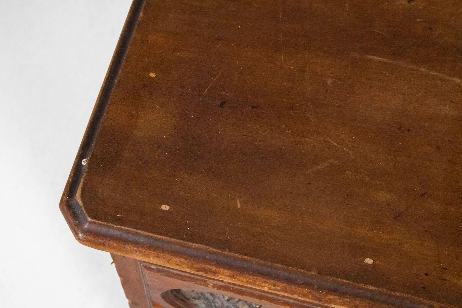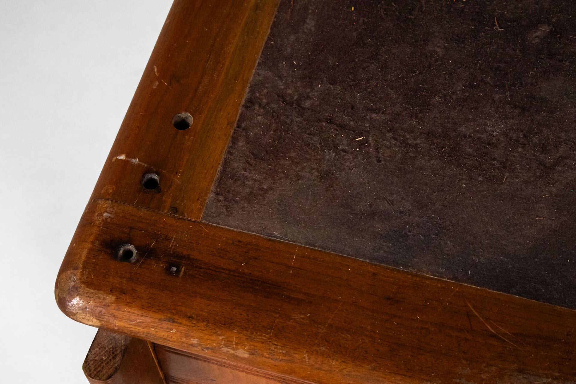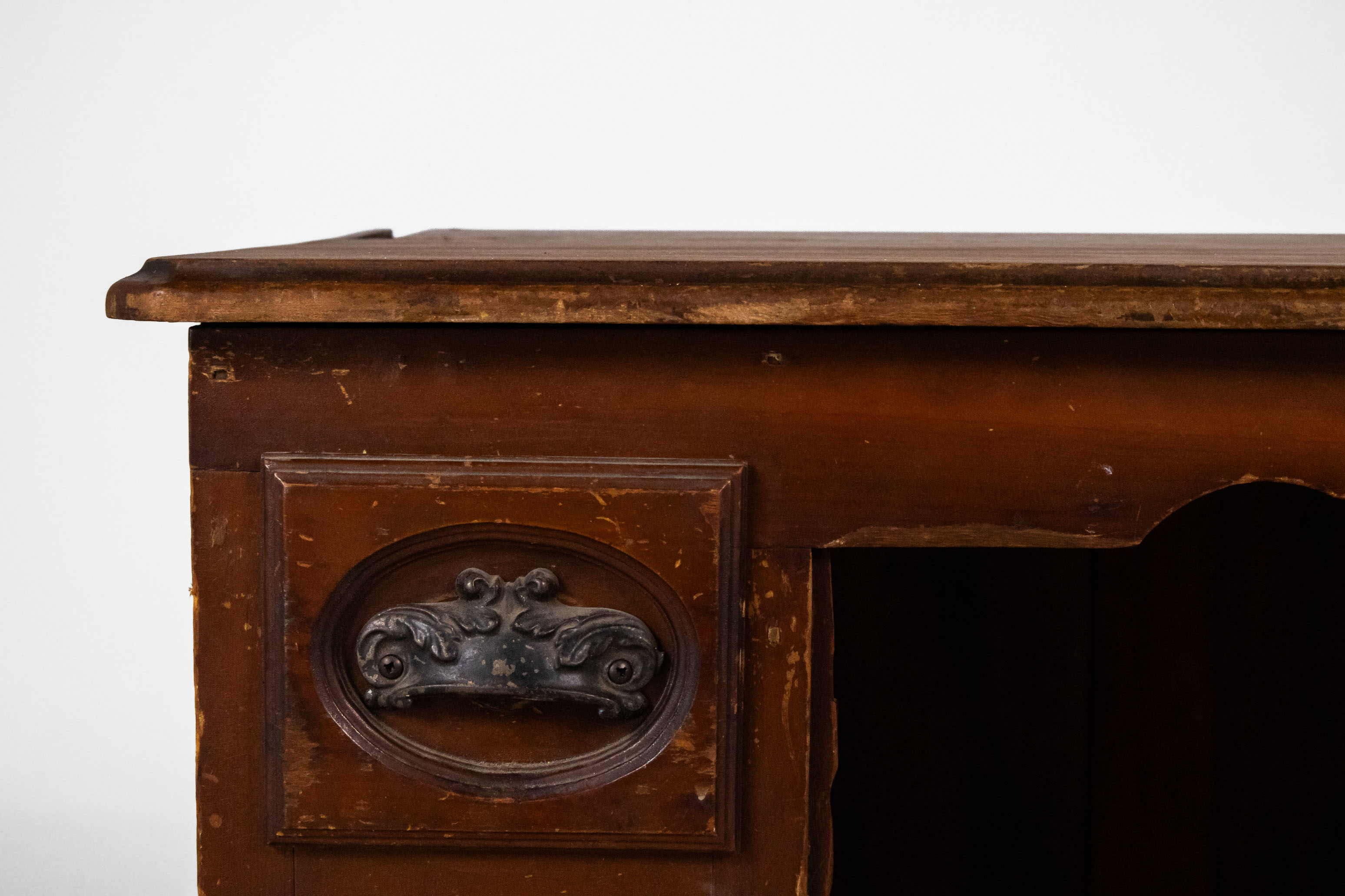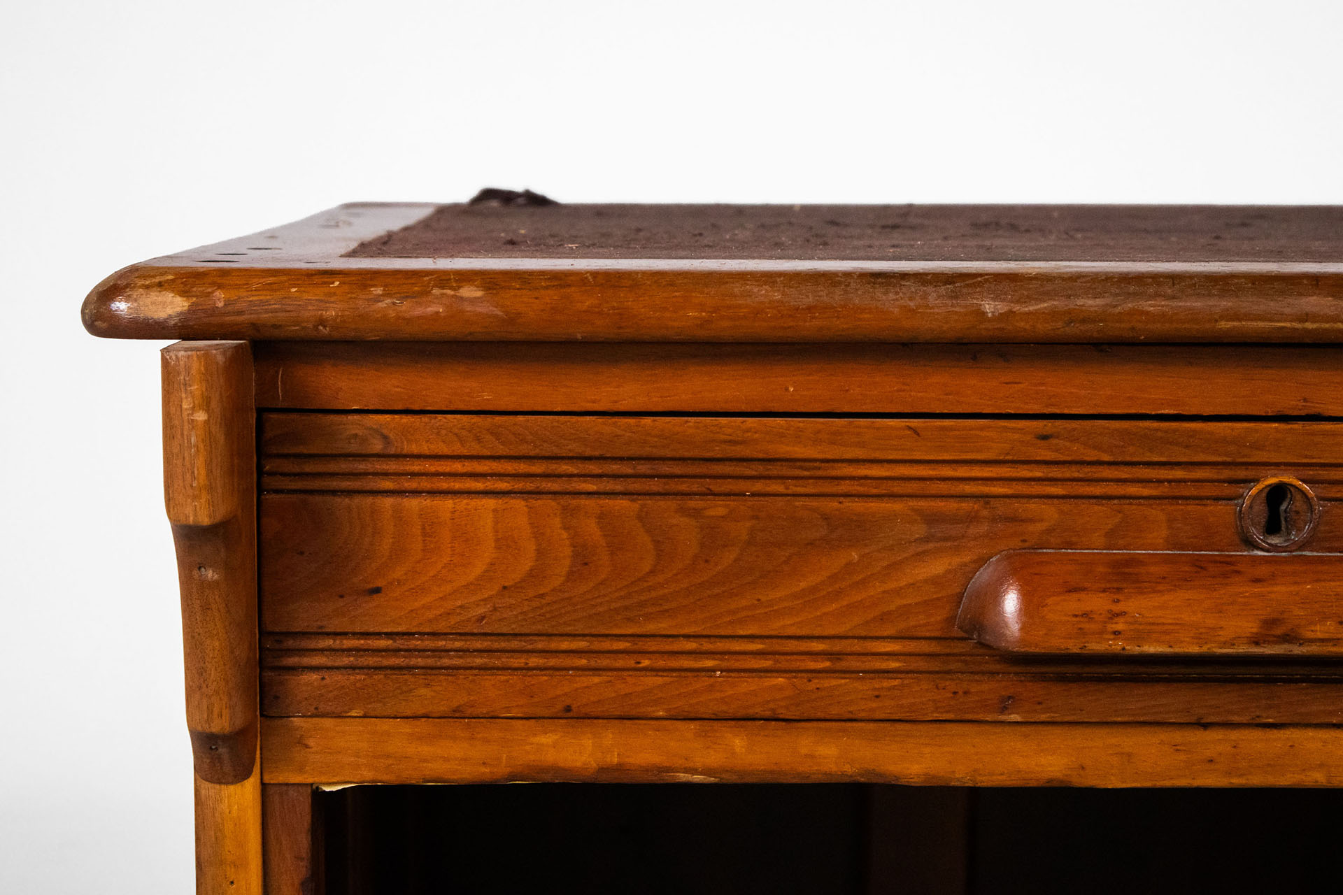 Elegáns antik íróasztal lekeekített élekkel, részletes fa mintázattal és díszes fém fogantyúkkal
