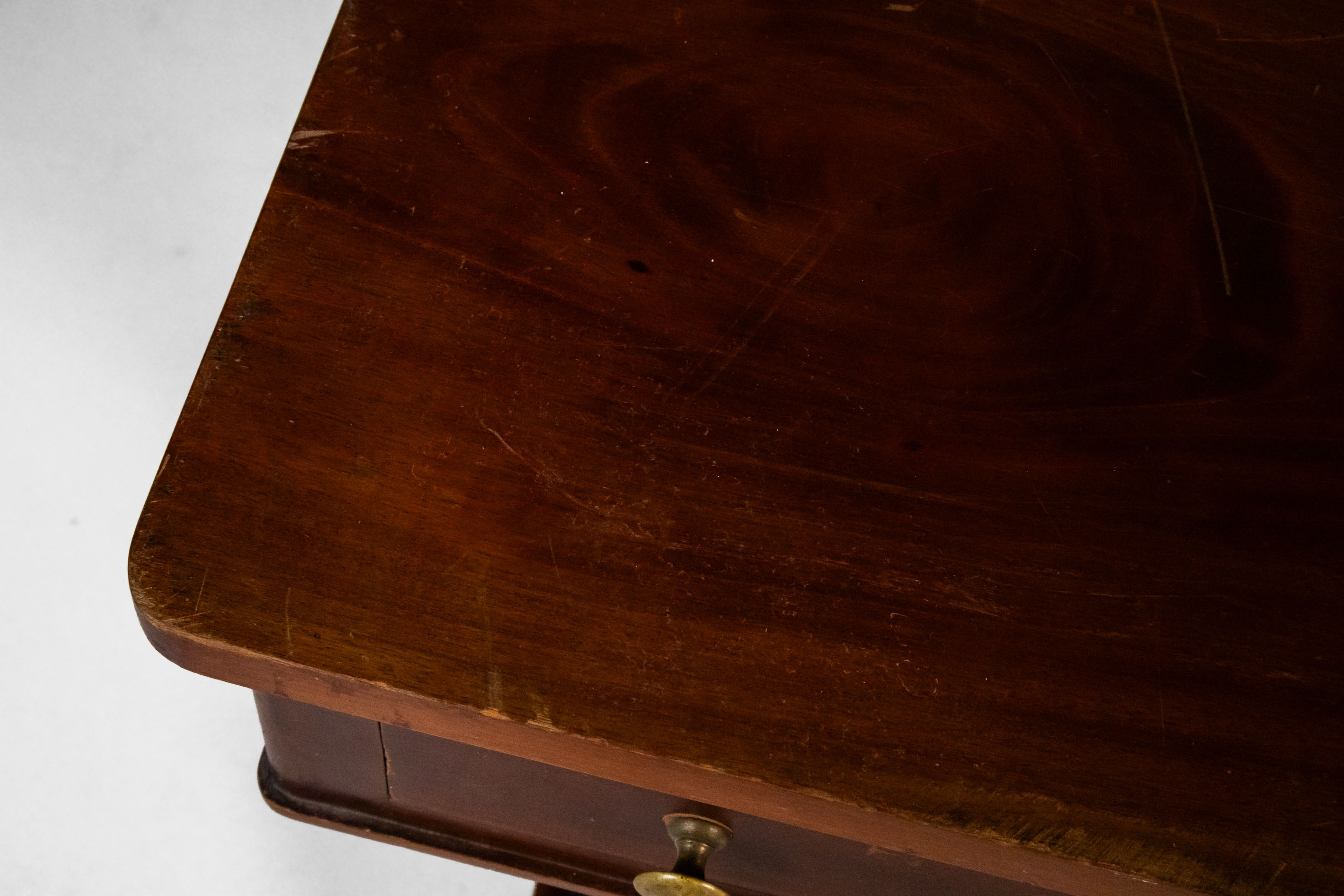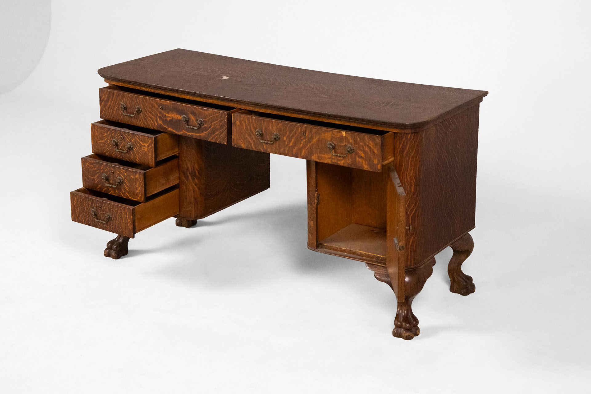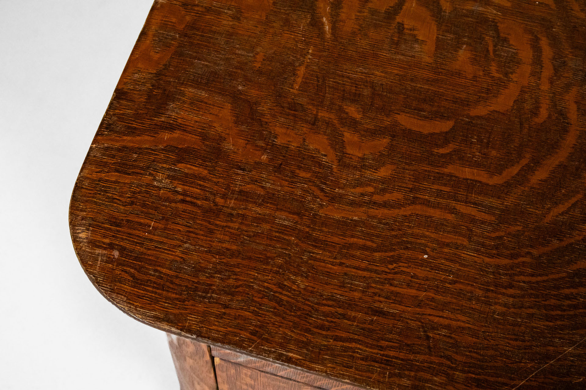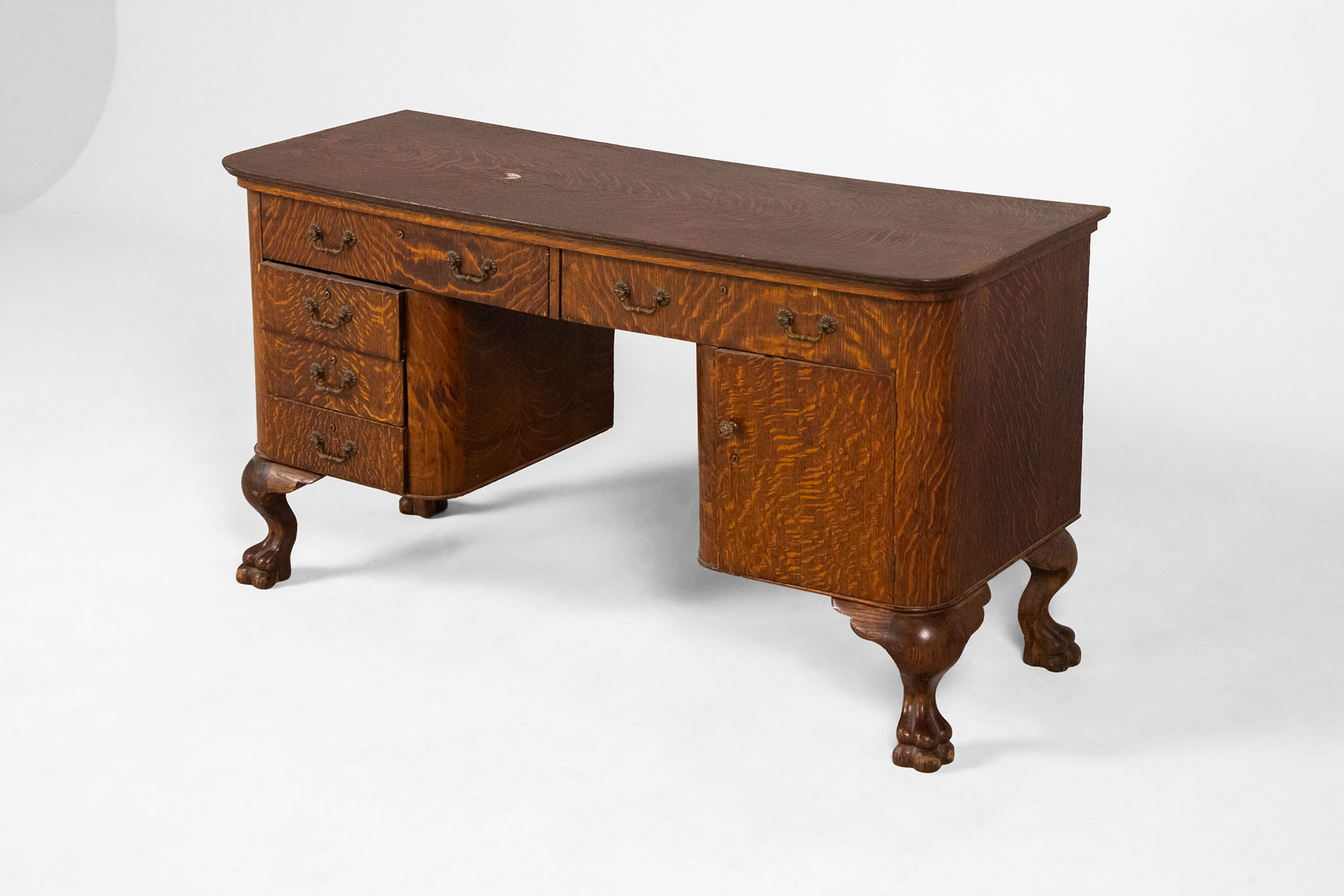Elegáns antik íróasztal lekeekített élekkel, részletes fa mintázattal és díszes fém fogantyúkkal