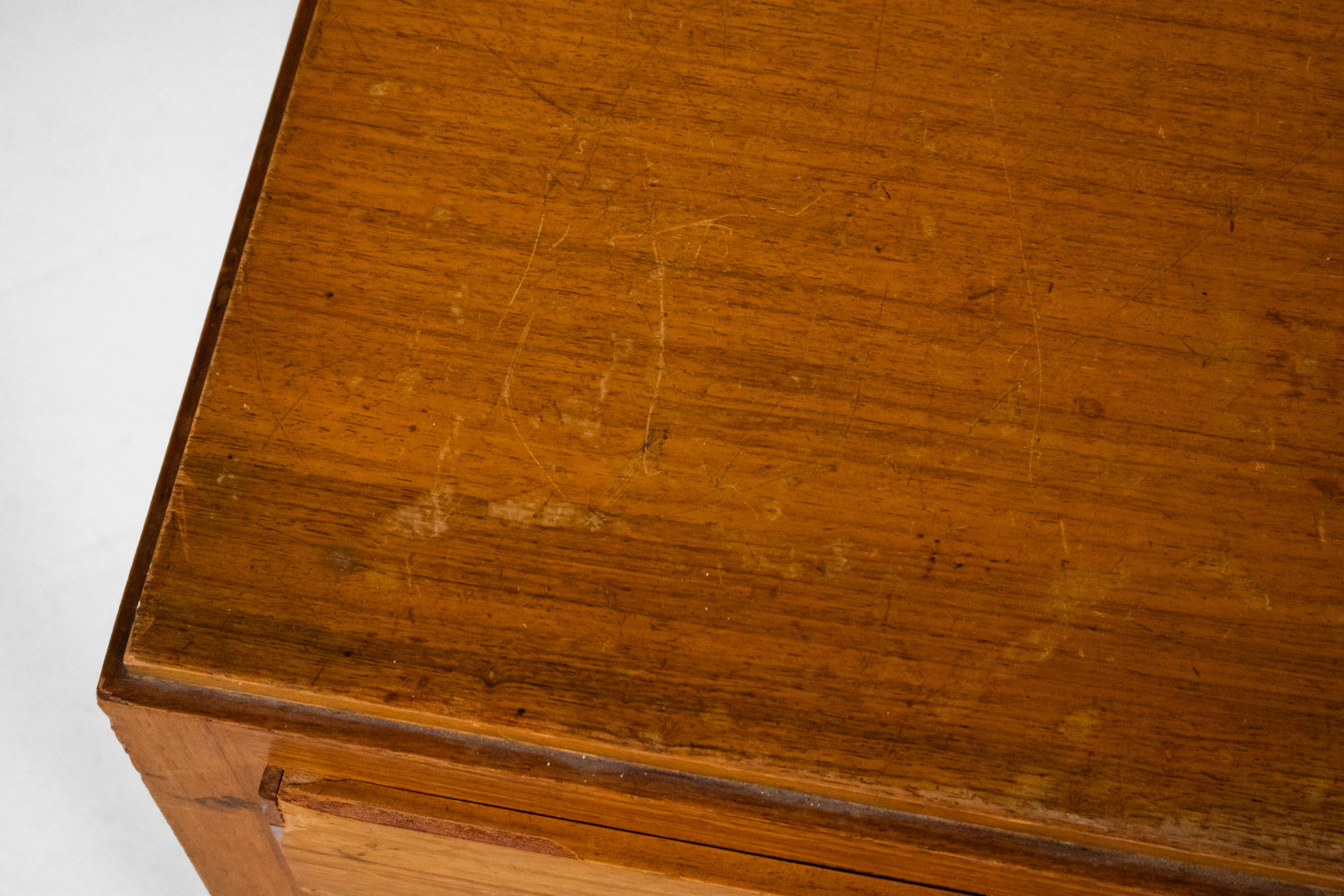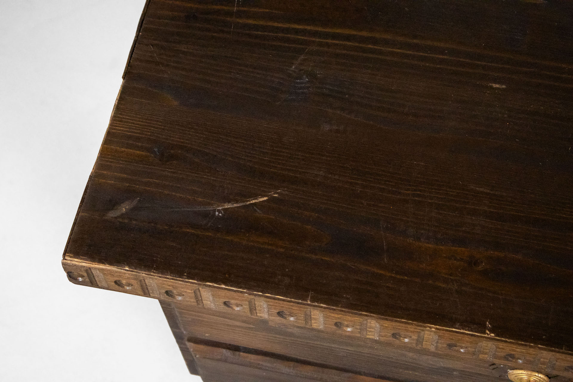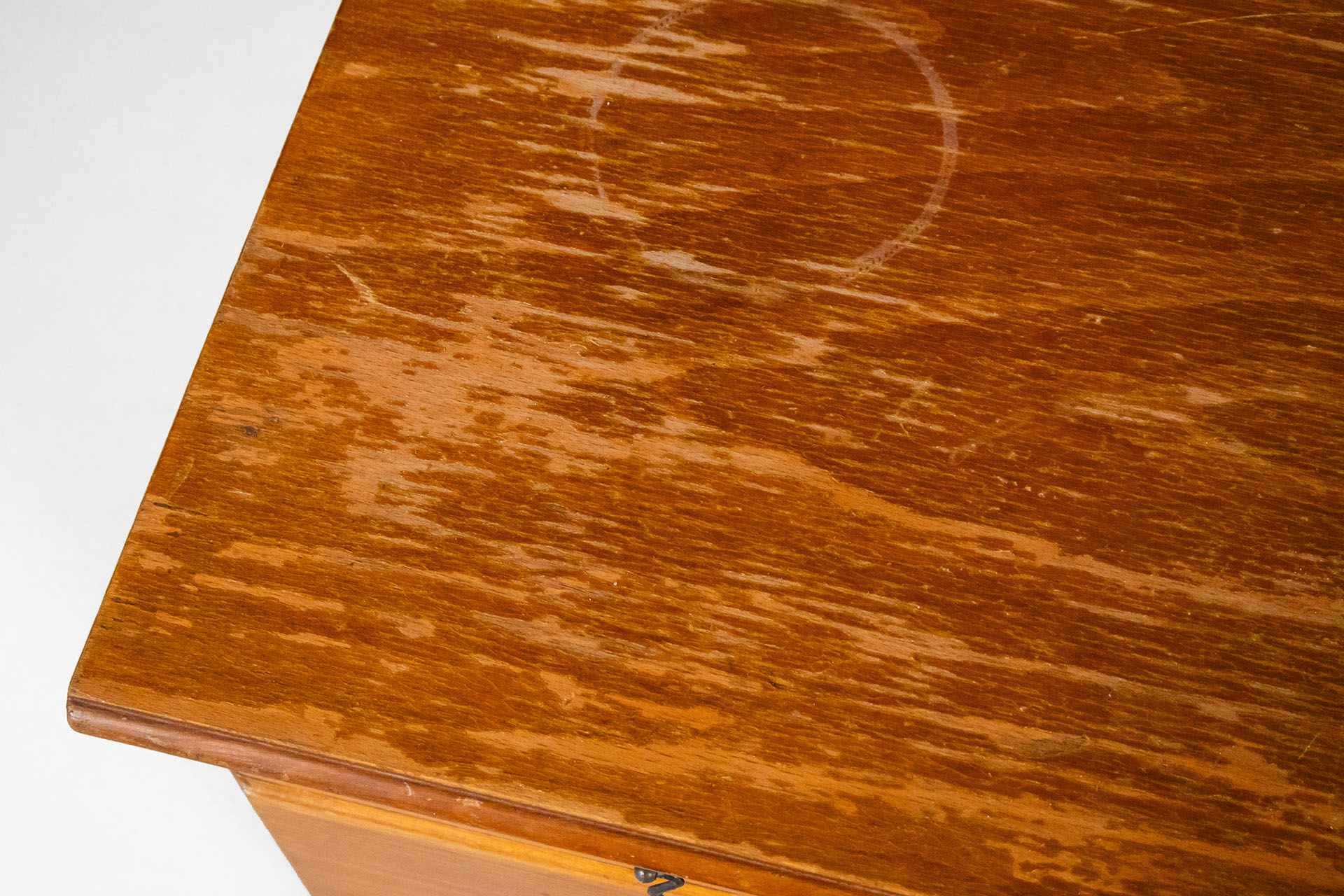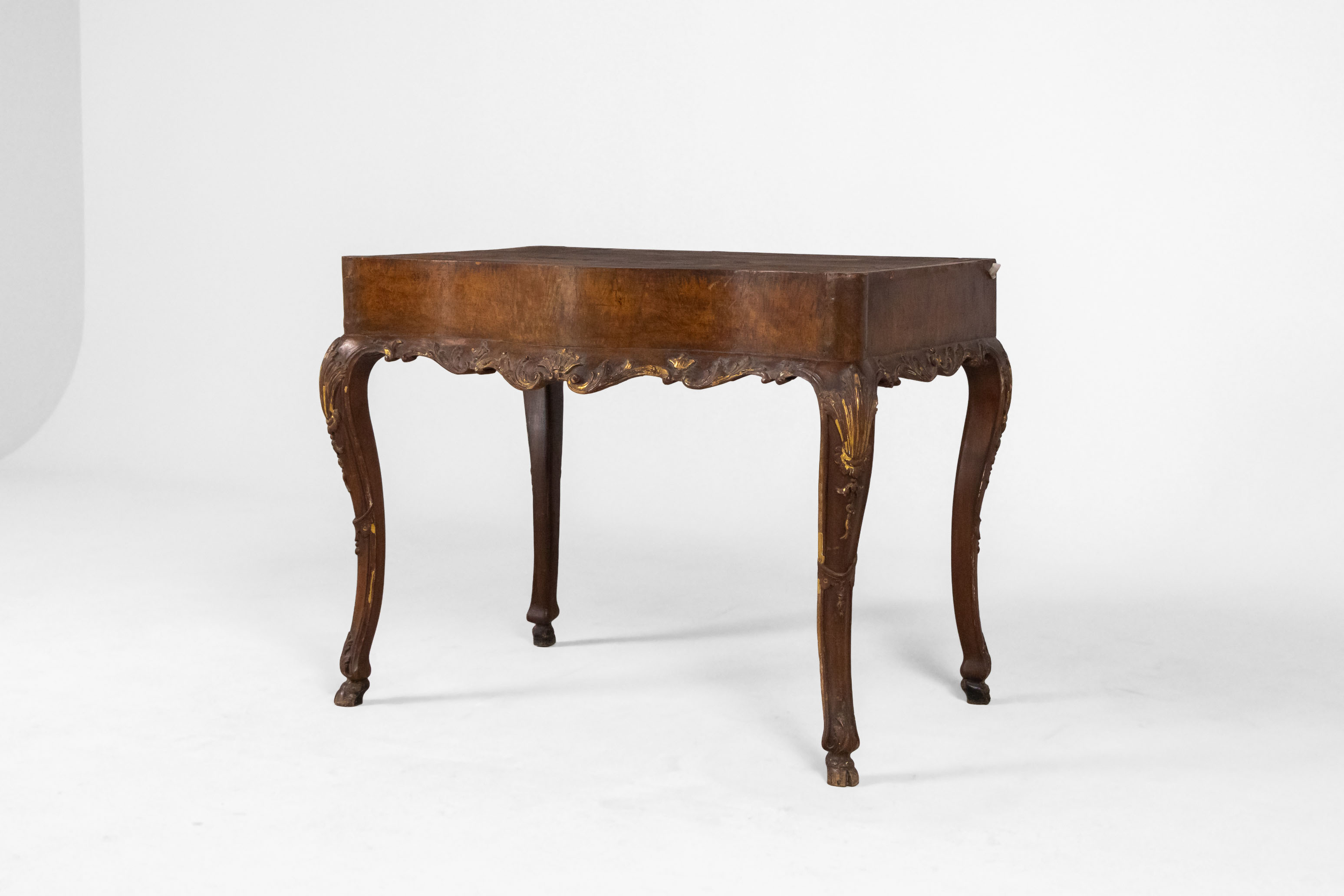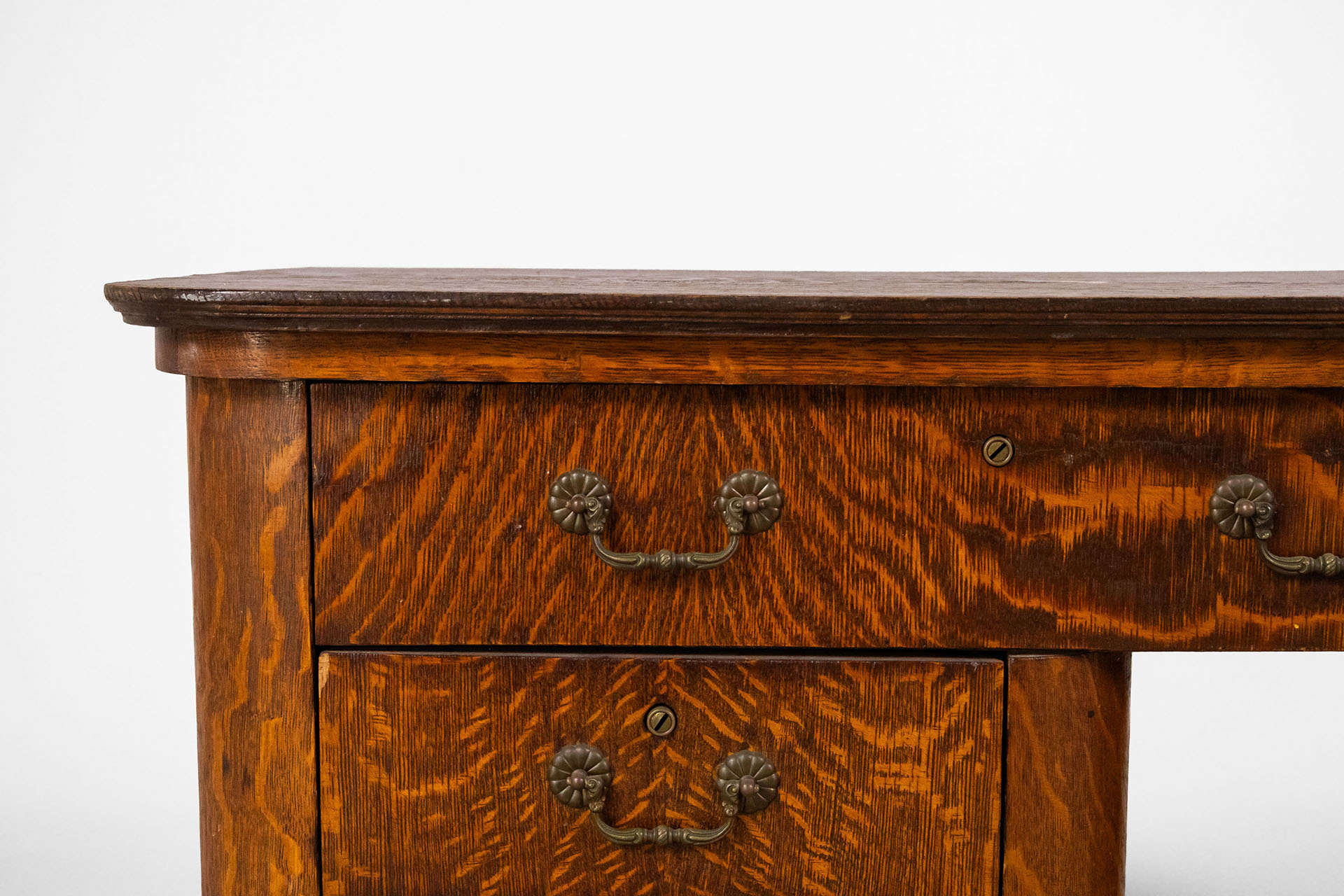 Elegáns antik íróasztal lekeekített élekkel, részletes fa mintázattal és díszes fém fogantyúkkal