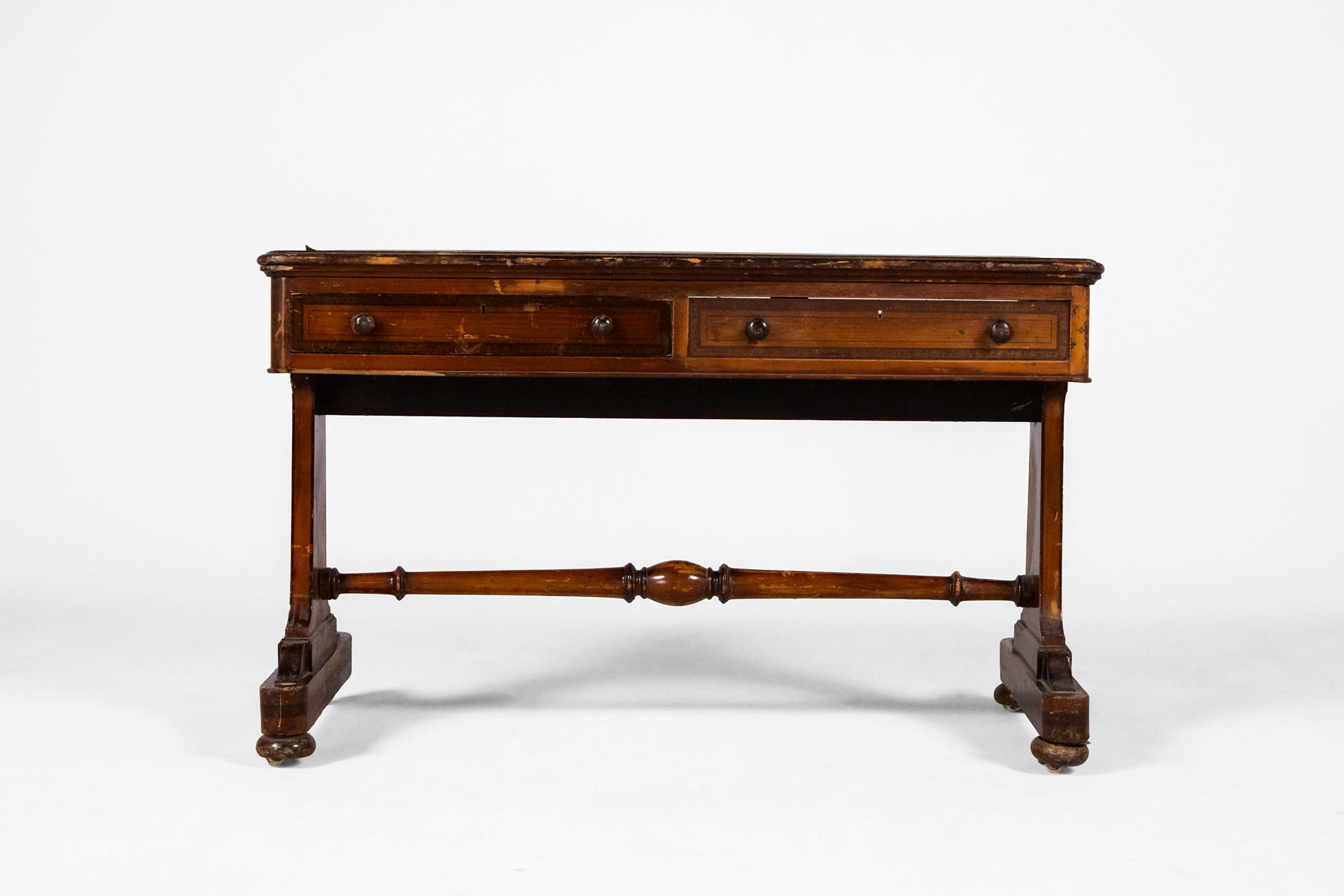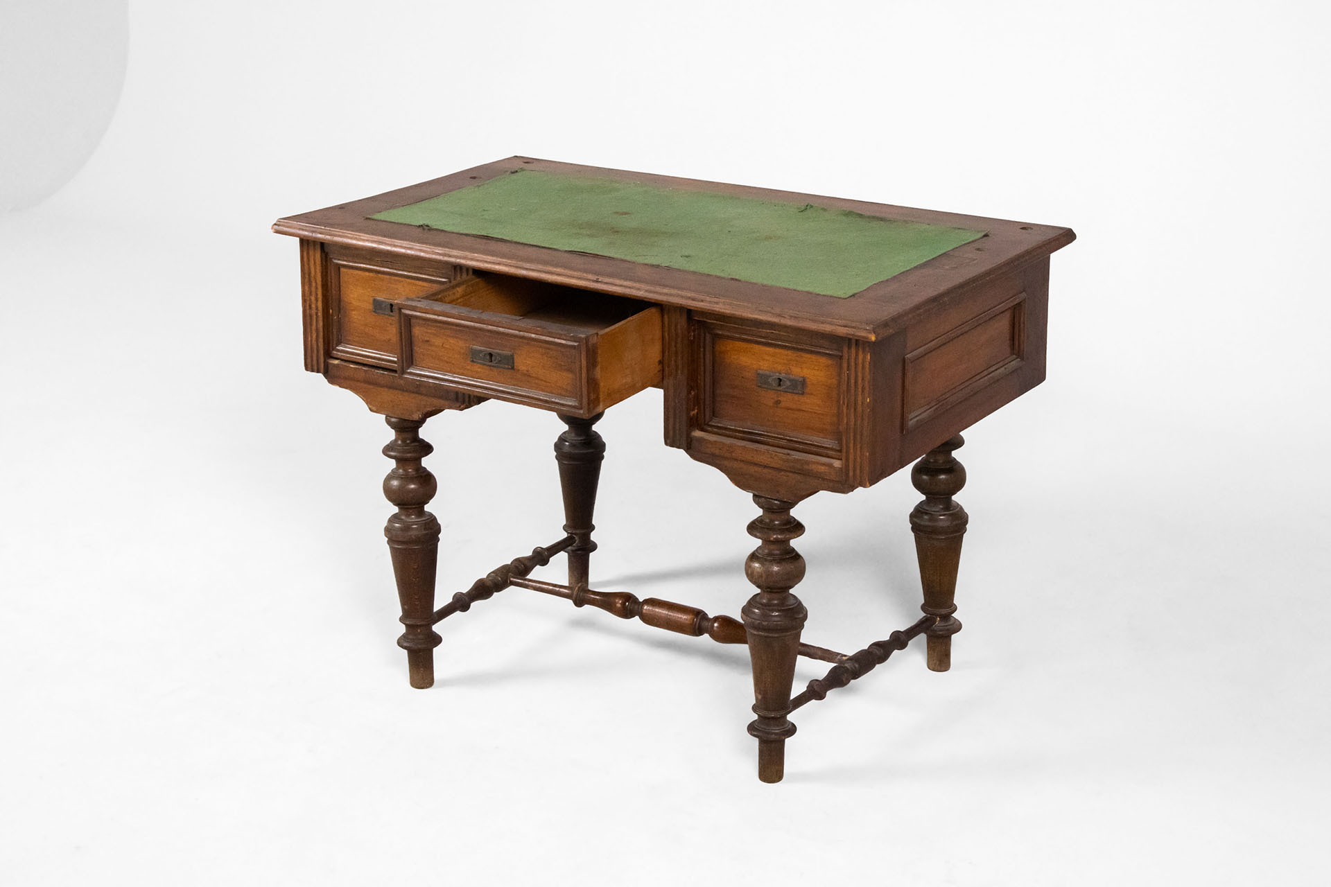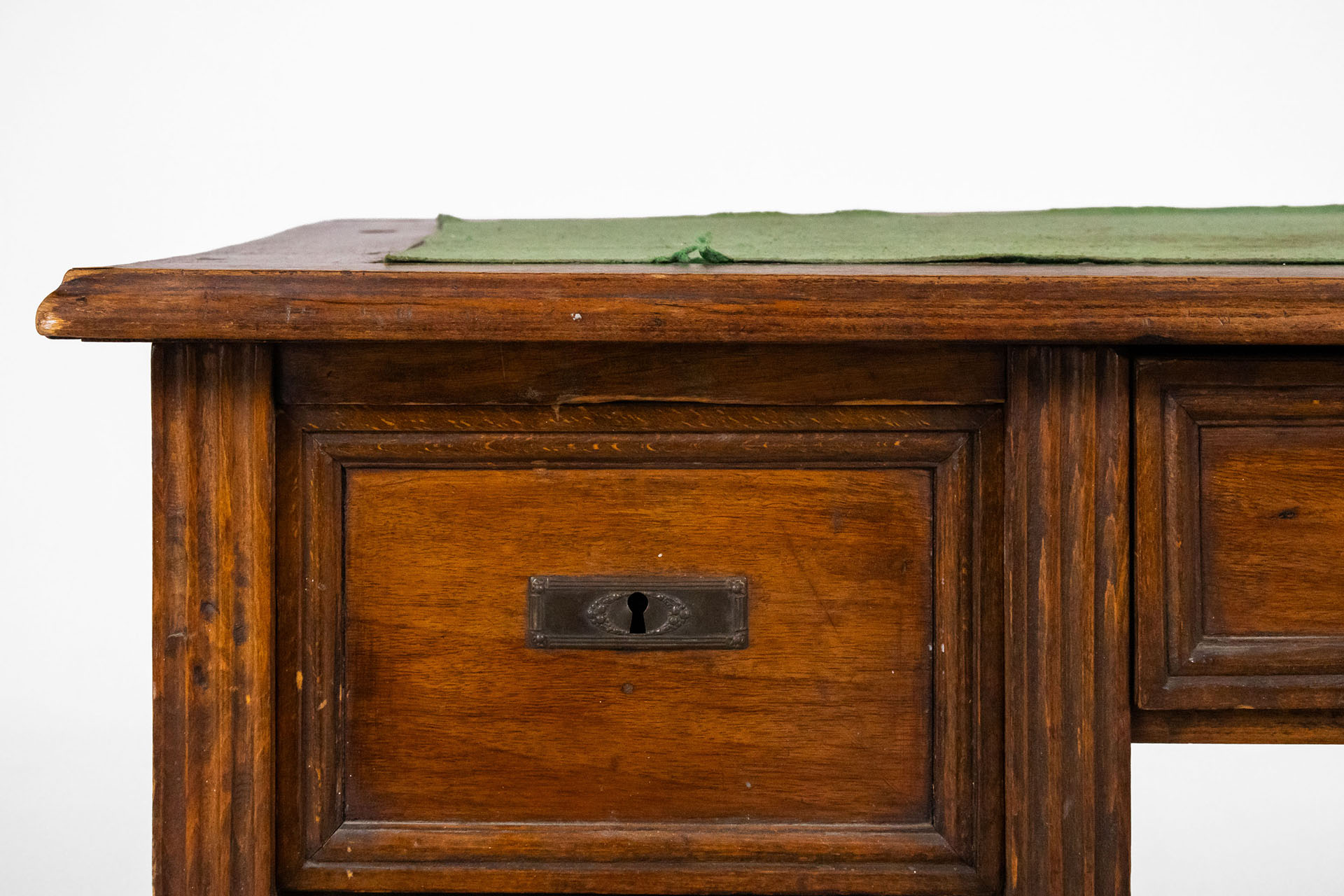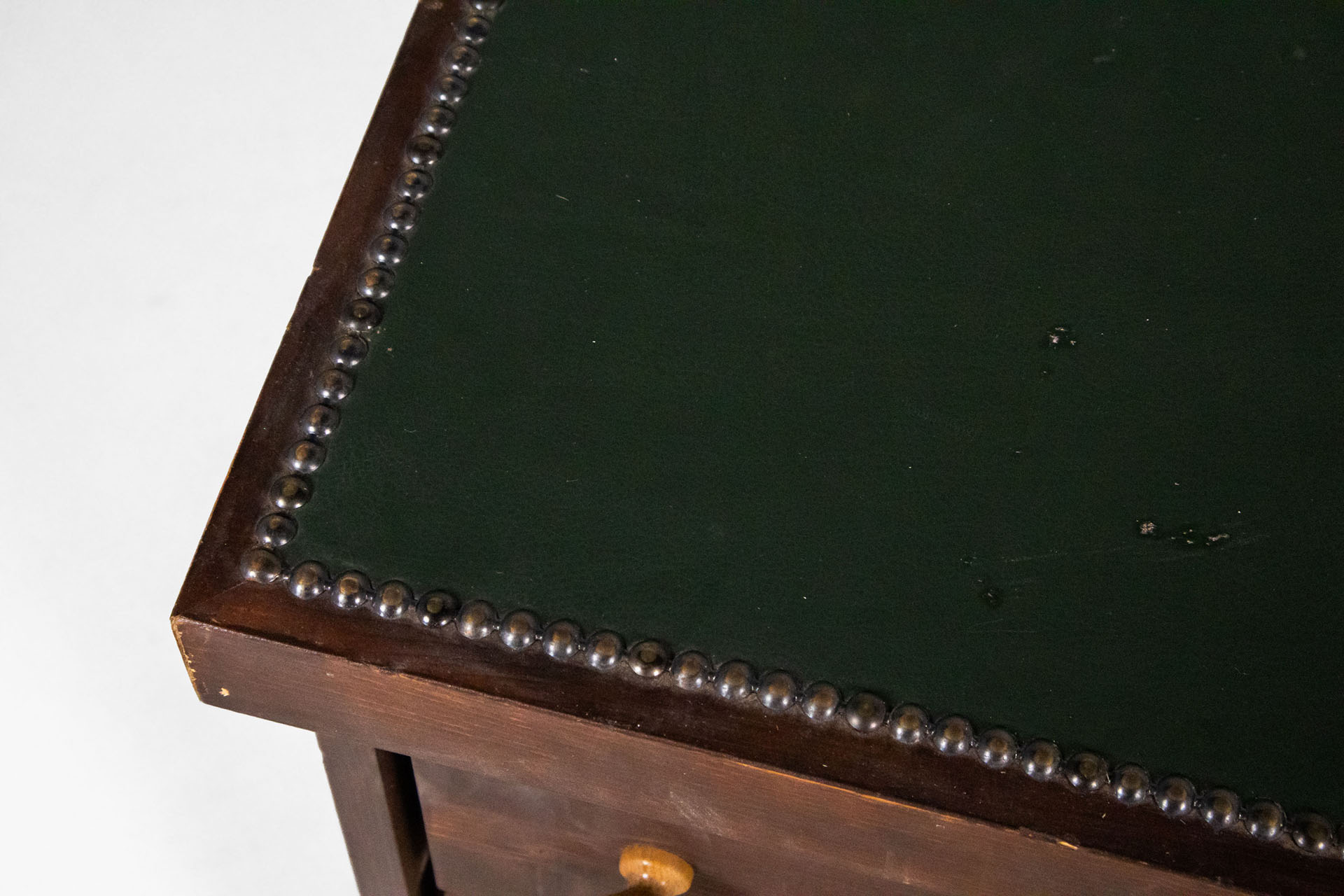 Klasszikus íróasztal fa szerkezettel, két fiókkal rendelkezik és zöld bőrözött asztallappal