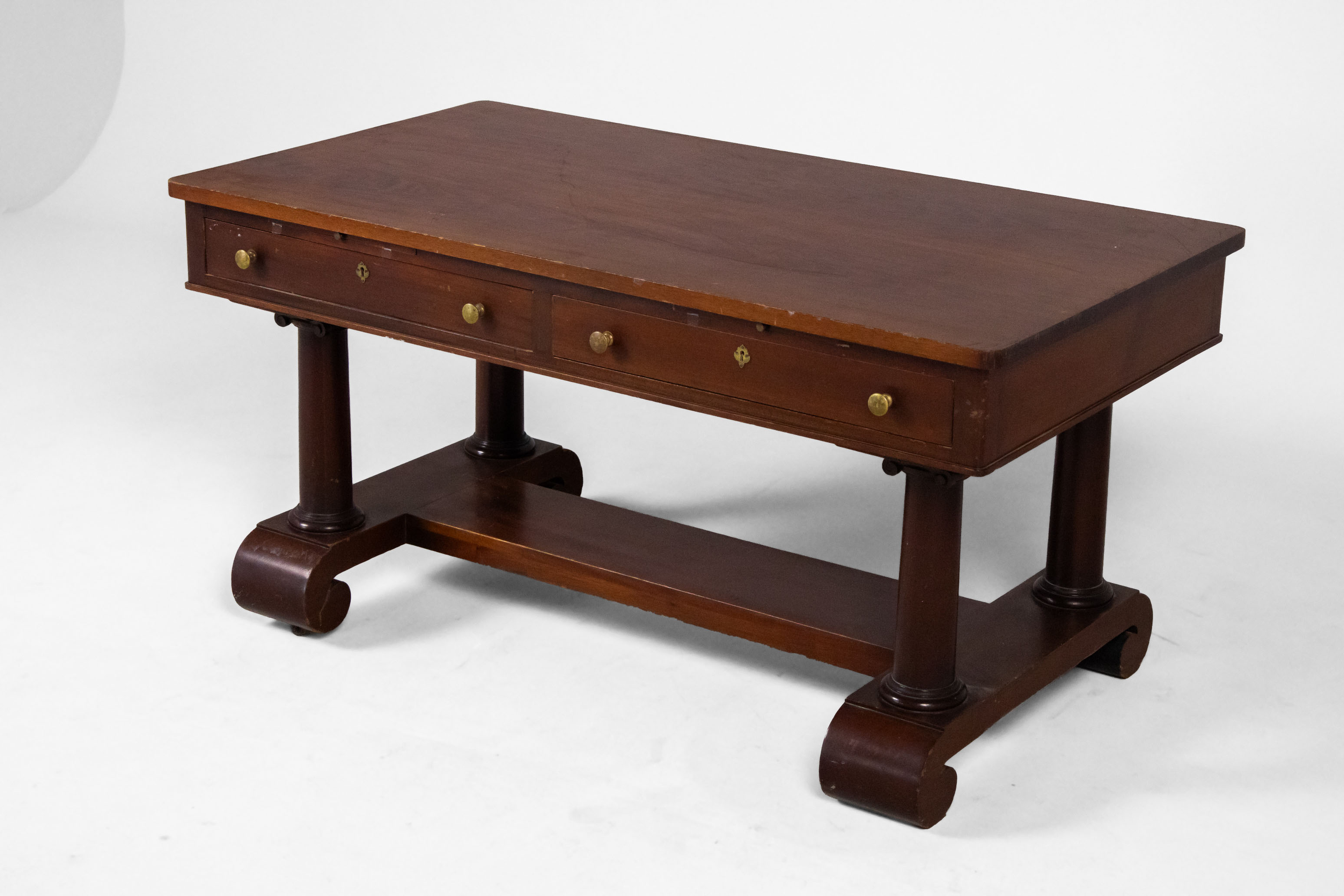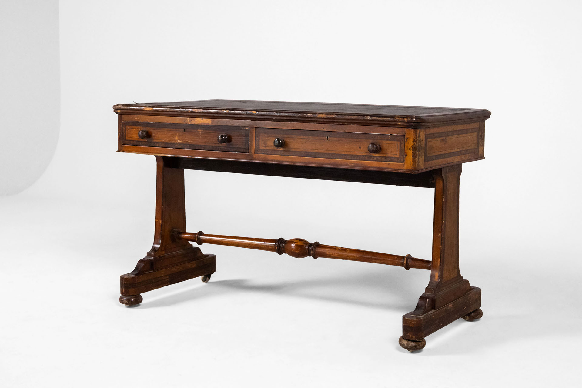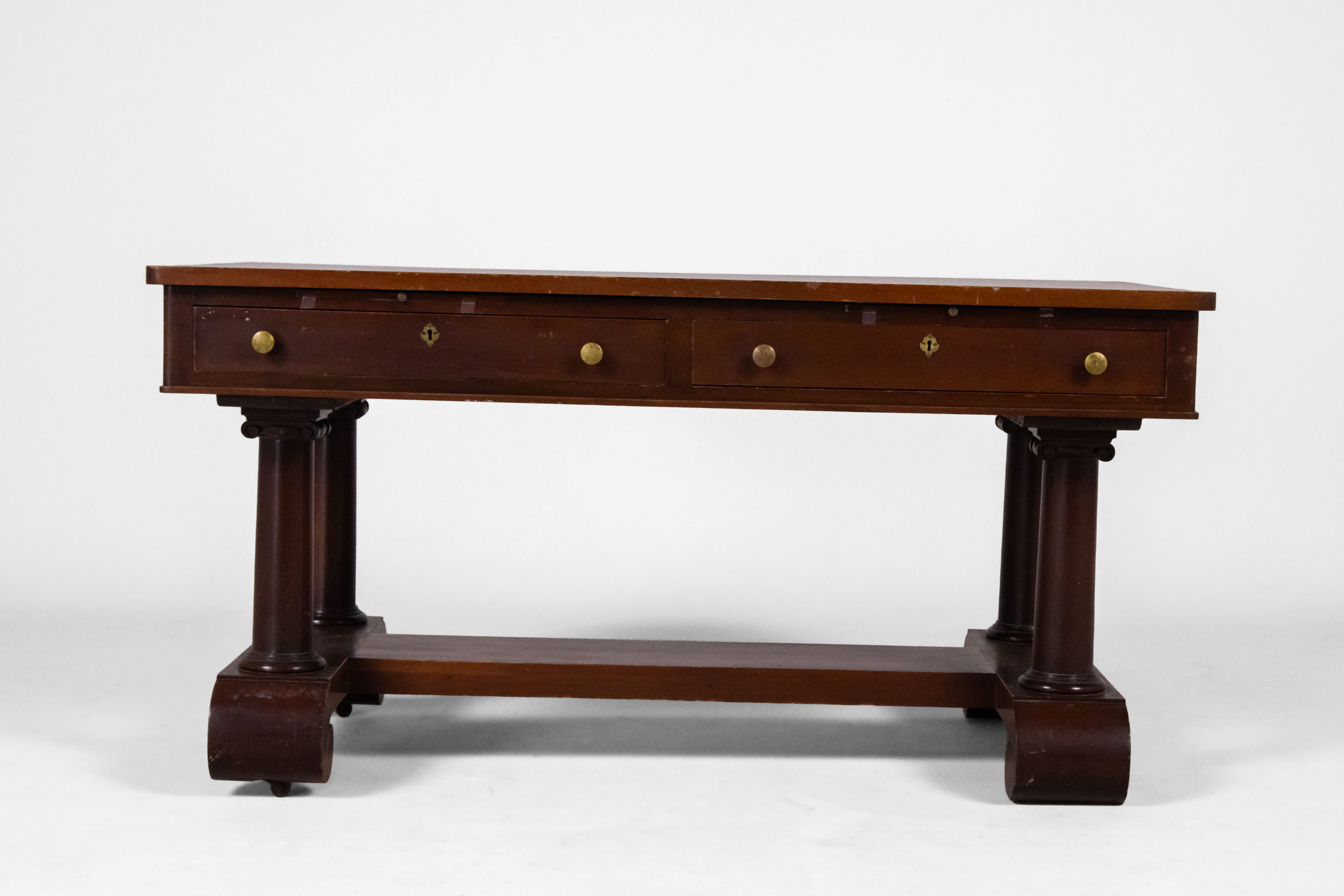 Klasszikus íróasztal fa szerkezettel, két fiókkal rendelkezik és zöld bőrözött asztallappal