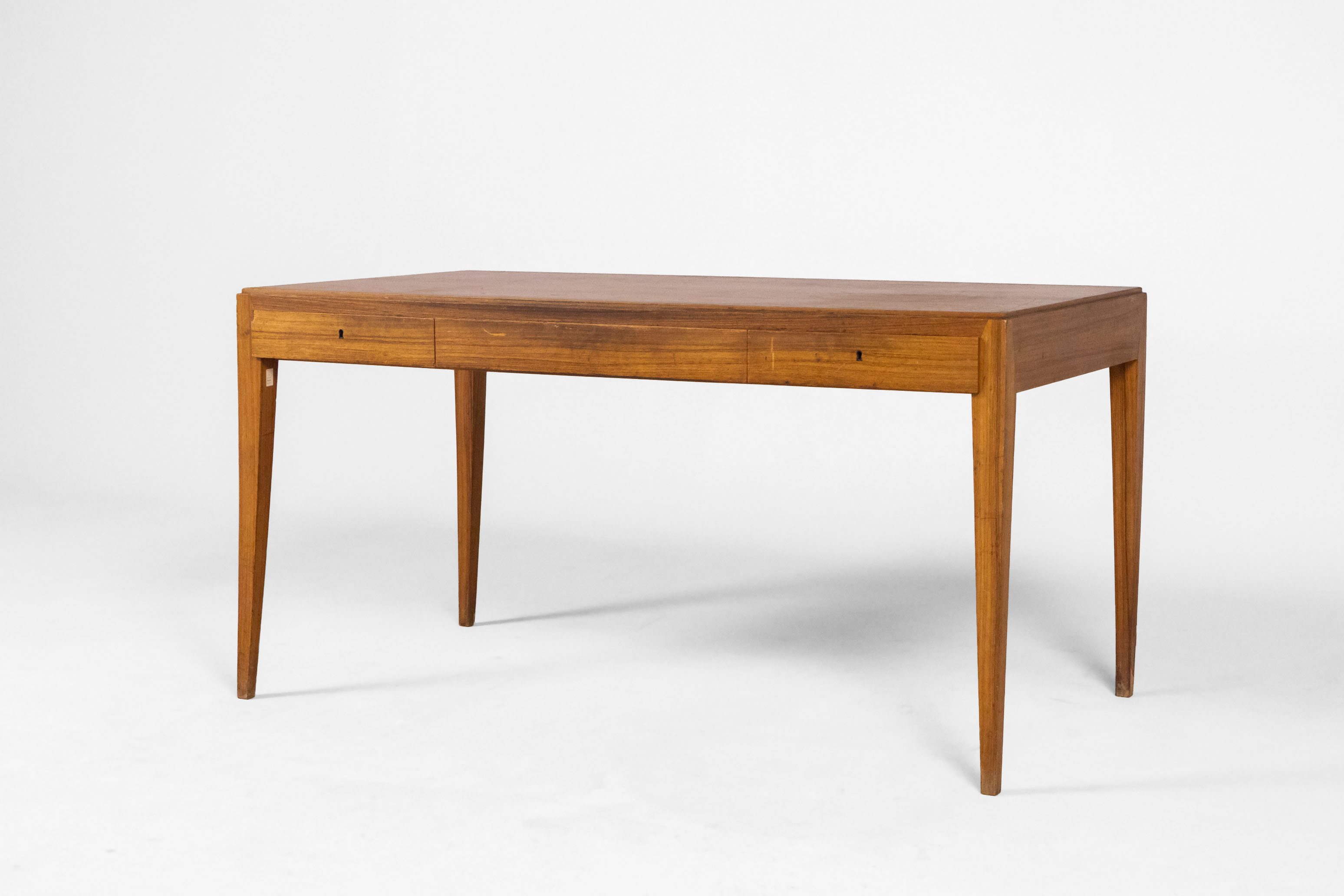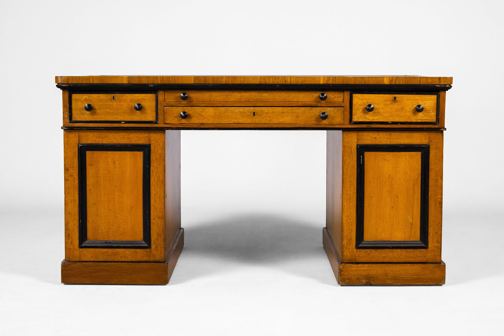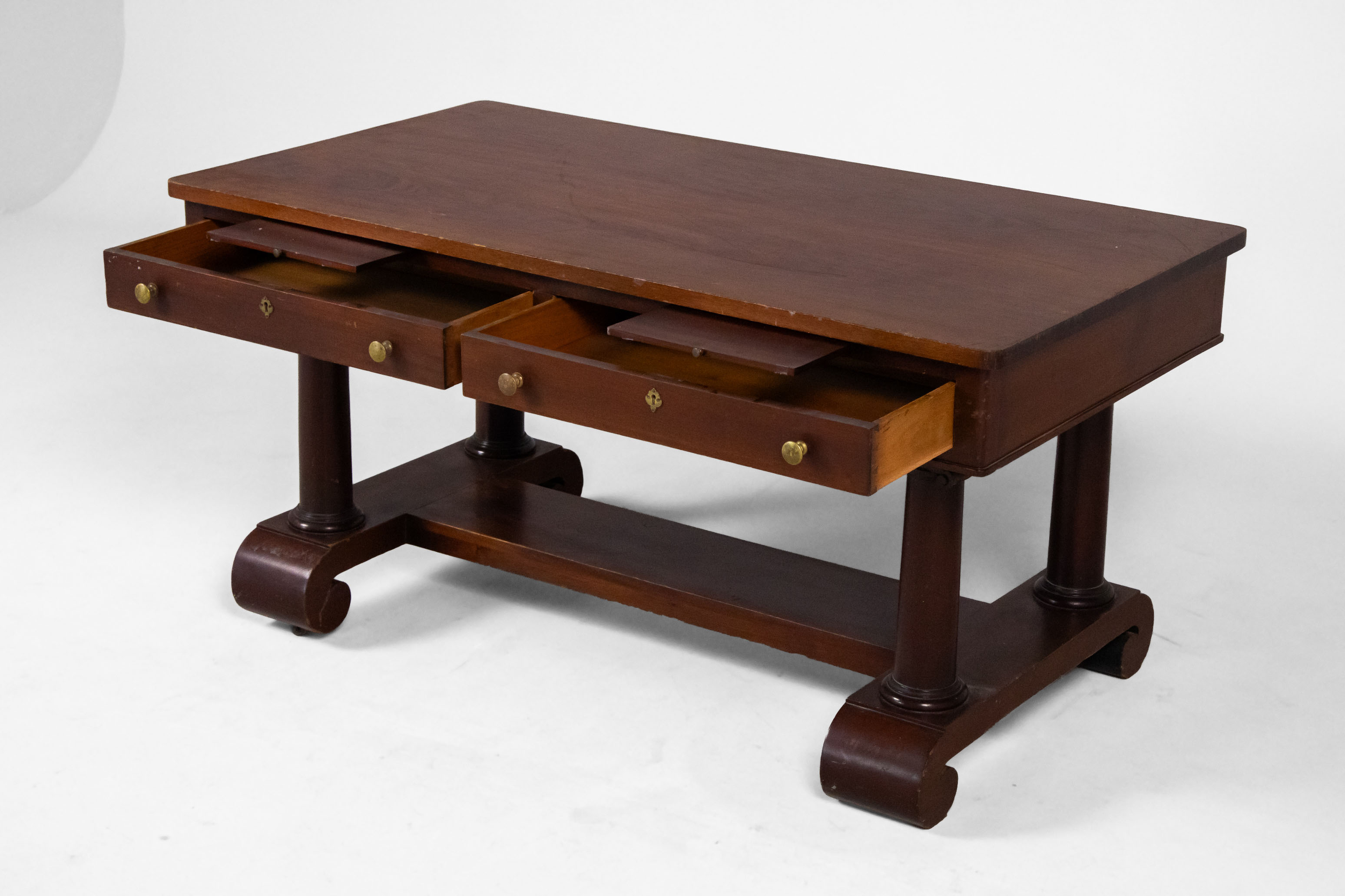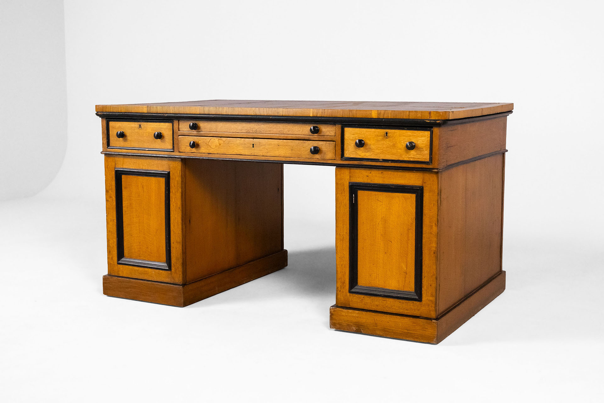 Klasszikus íróasztal fa szerkezettel, két fiókkal rendelkezik és zöld bőrözött asztallappal