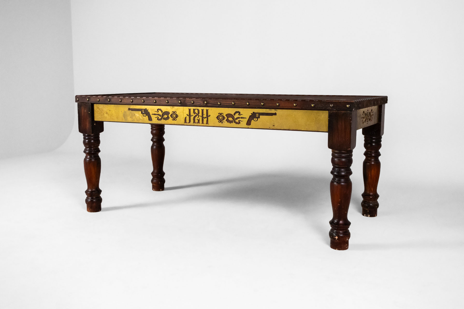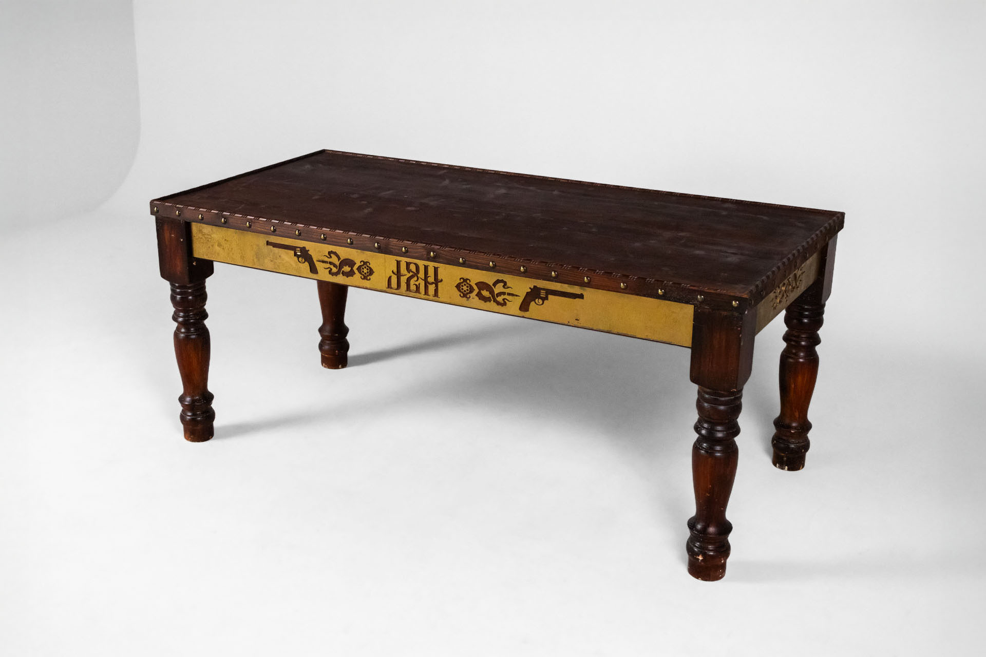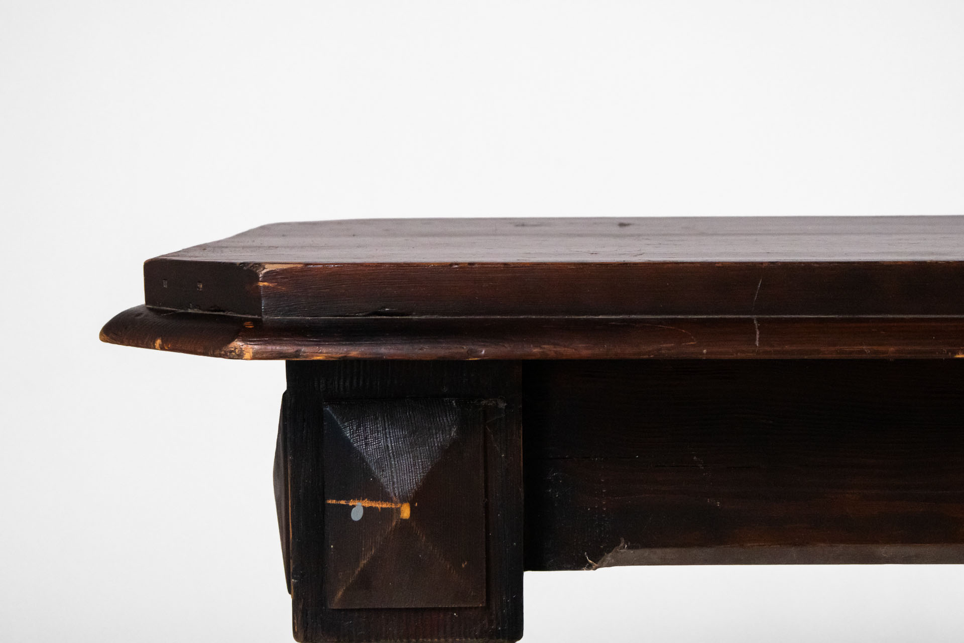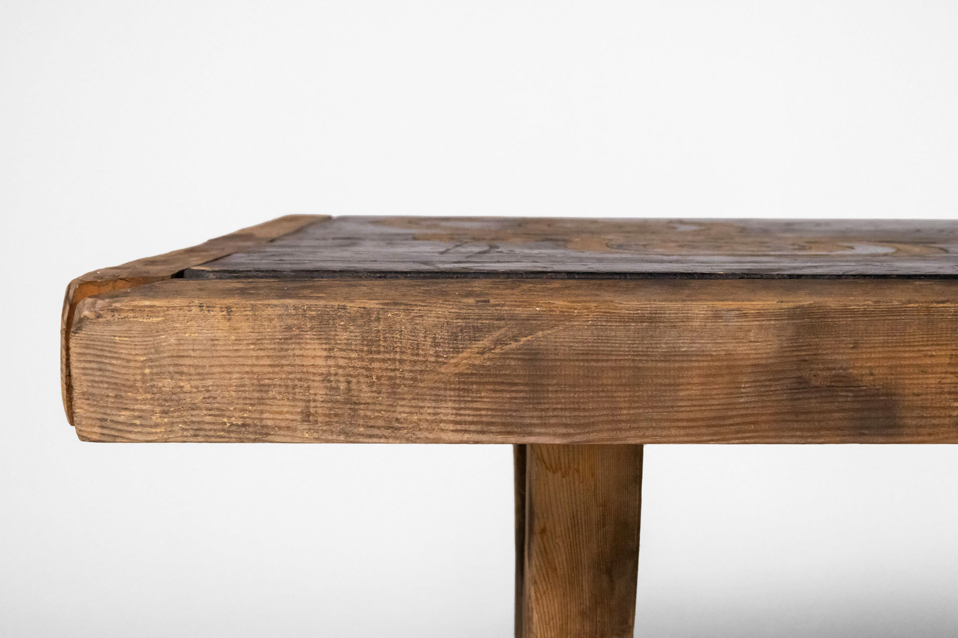 Masszív, rusztikus stílusú fa asztal, téglalap alakú, vastag asztallappal és erős, ívelt lábakkal. Az asztal felületén kézi faragás látható, ami egyedi karaktert kölcsönöz neki