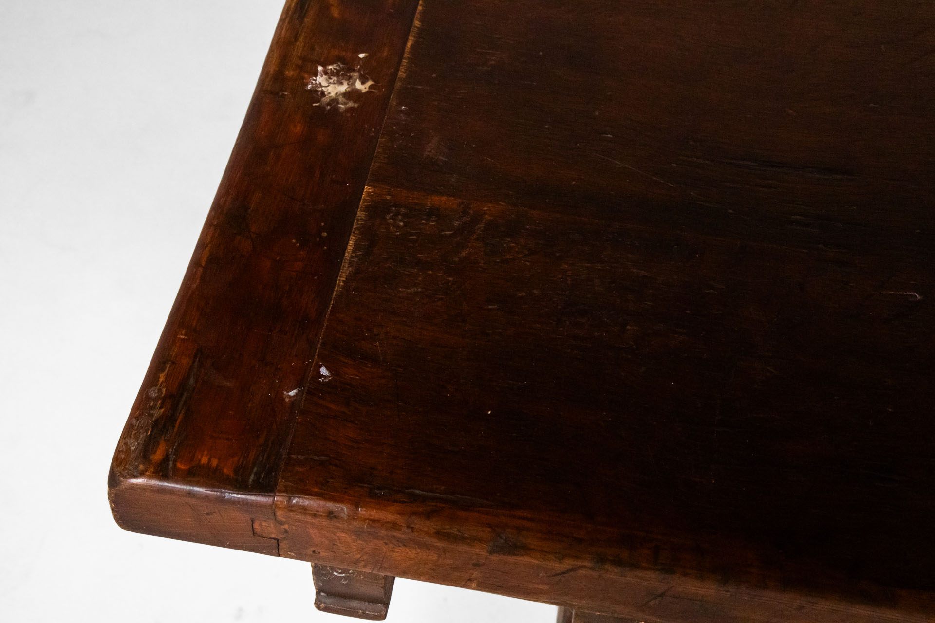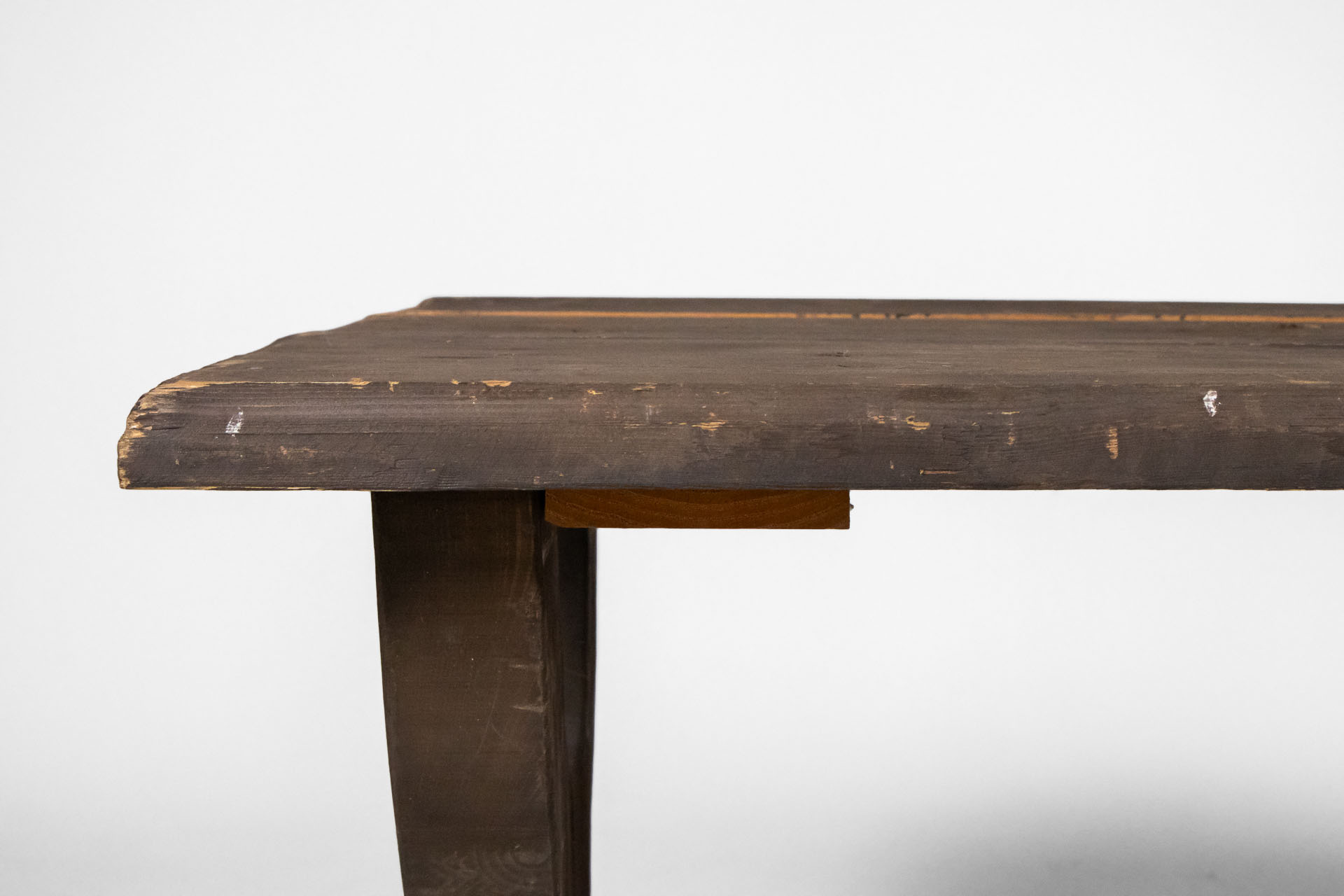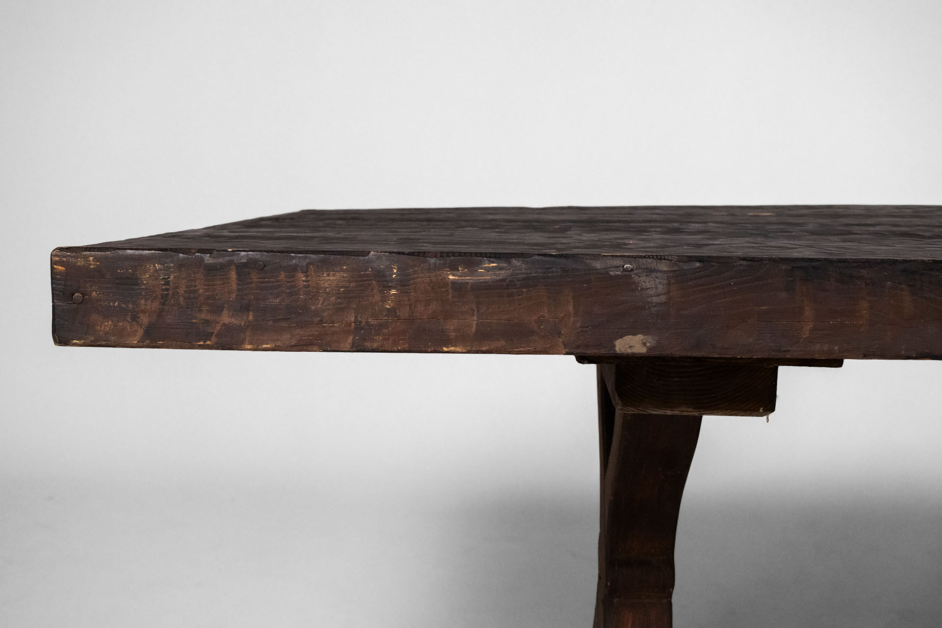 Masszív, rusztikus stílusú fa asztal, téglalap alakú, vastag asztallappal és erős, ívelt lábakkal. Az asztal felületén kézi faragás látható, ami egyedi karaktert kölcsönöz neki