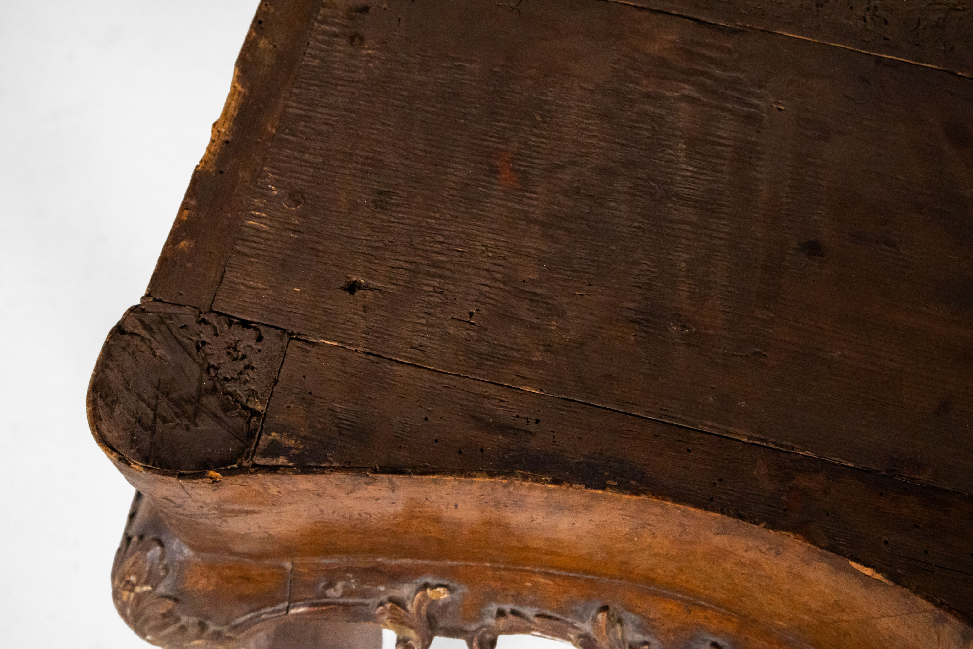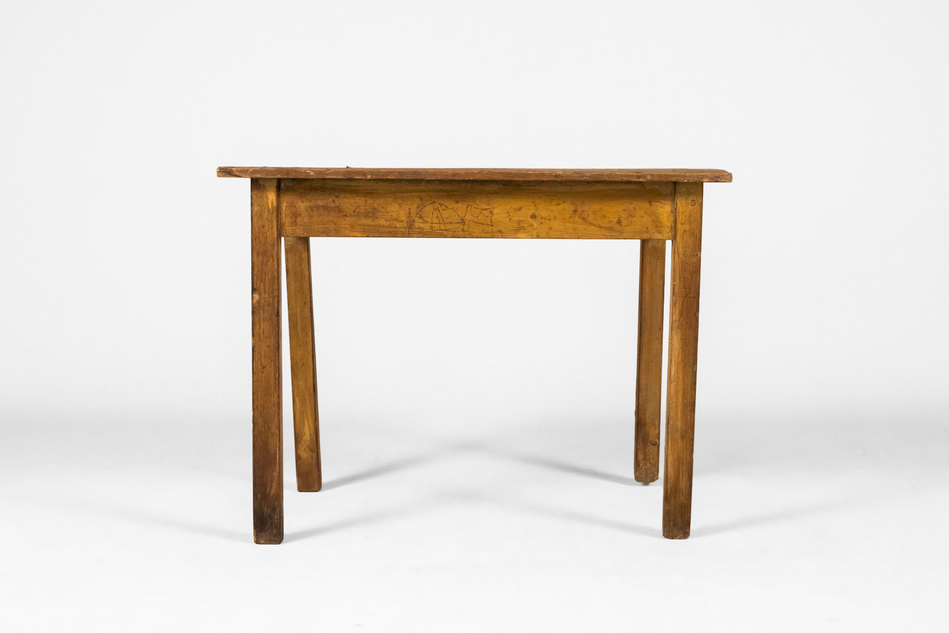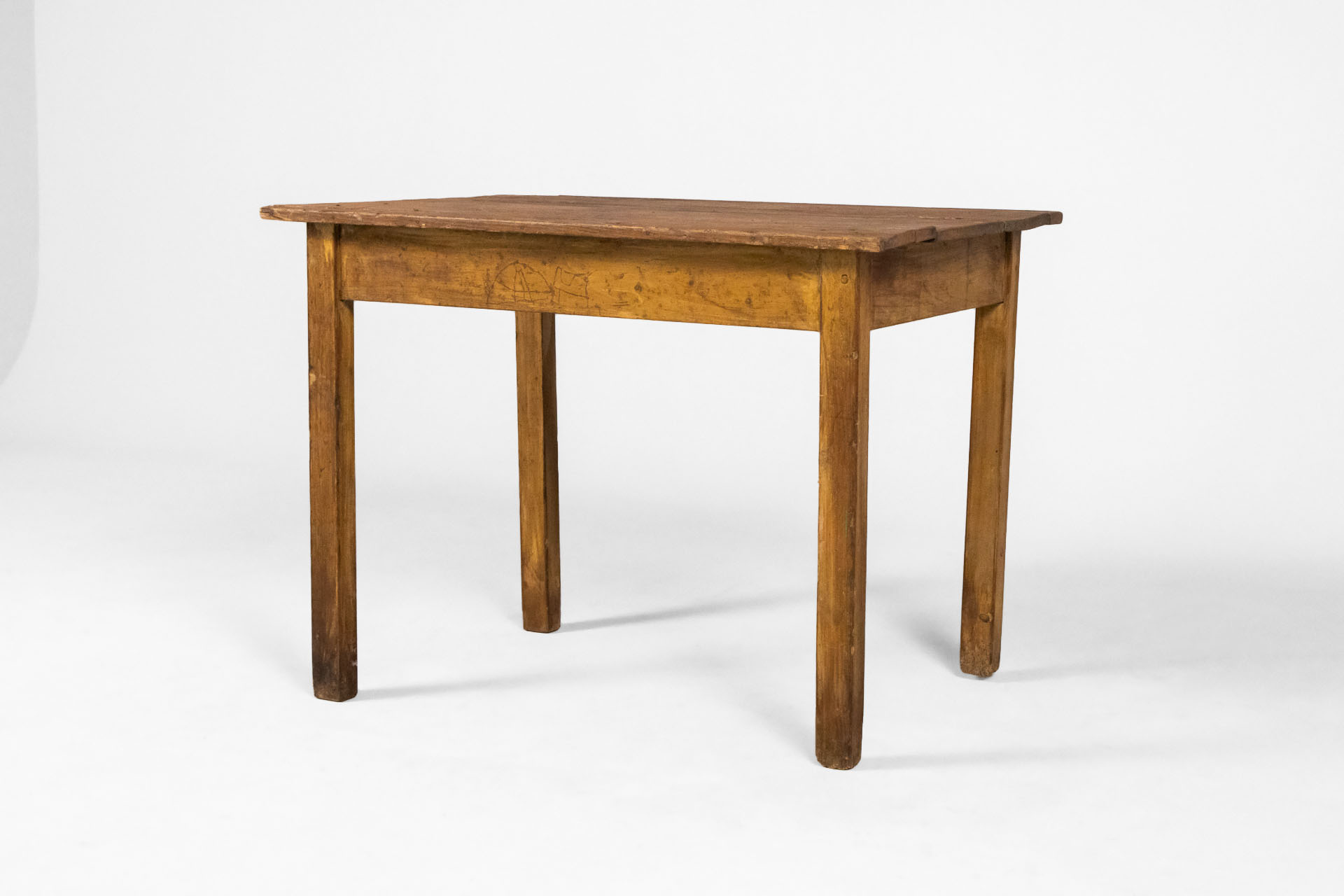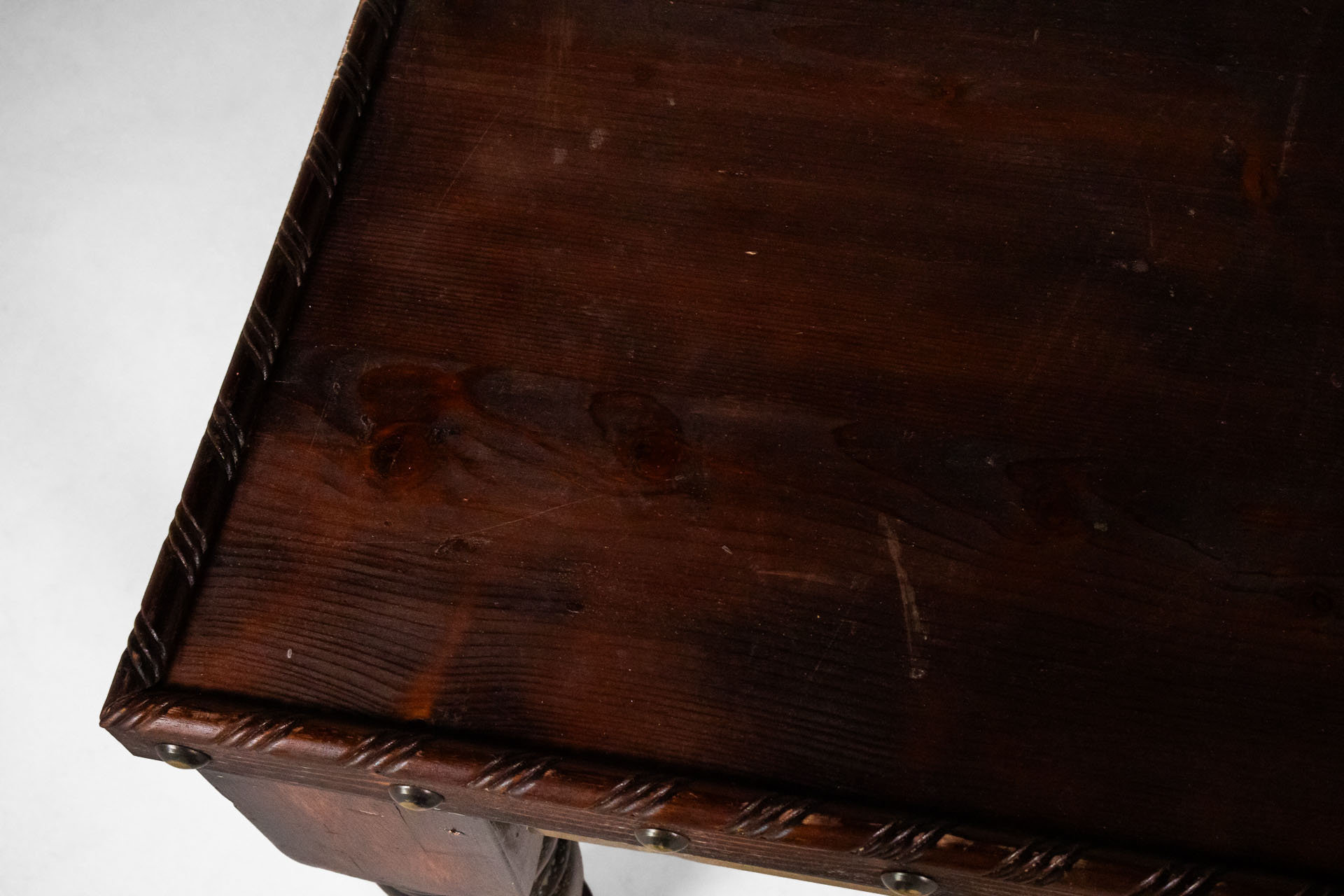 Masszív, rusztikus stílusú fa asztal, téglalap alakú, vastag asztallappal és erős, ívelt lábakkal. Az asztal felületén kézi faragás látható, ami egyedi karaktert kölcsönöz neki