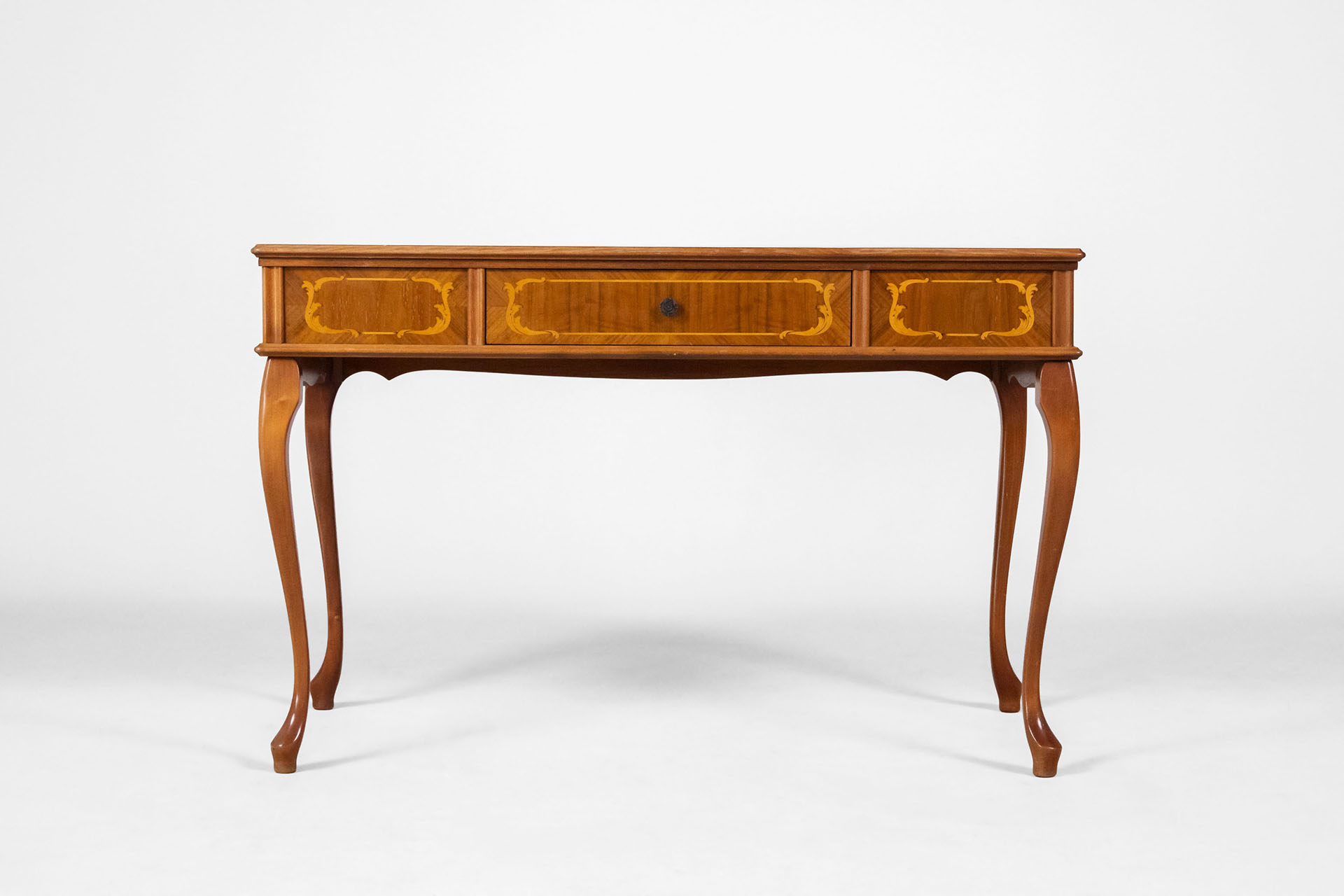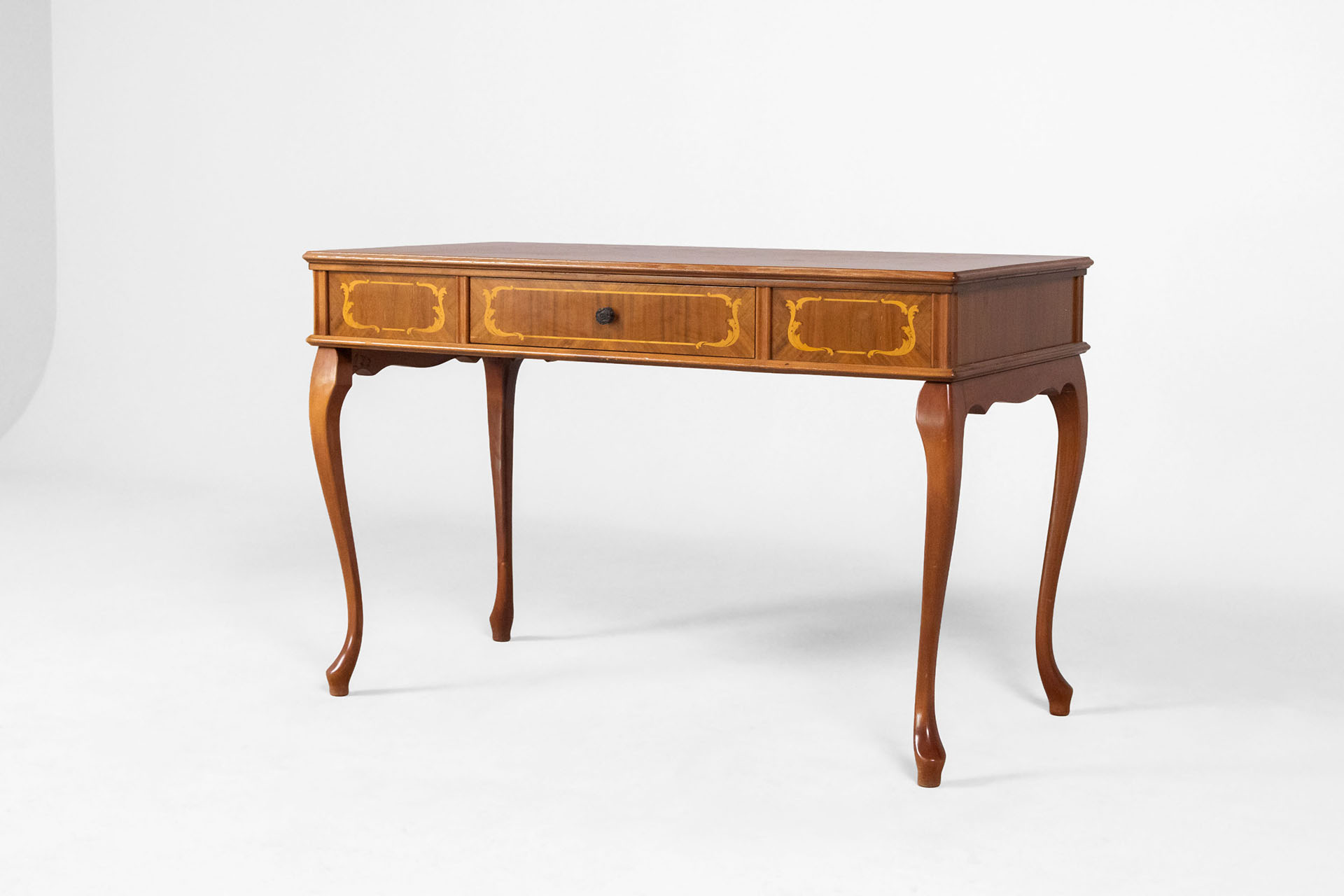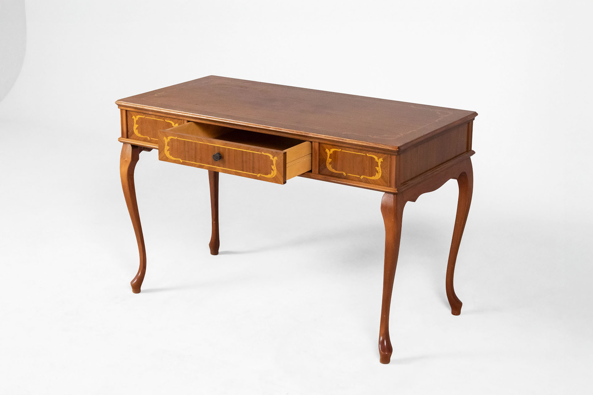 Klasszikus világosbarna íróasztal intarziás díszítéssel és ívelt lábakkal