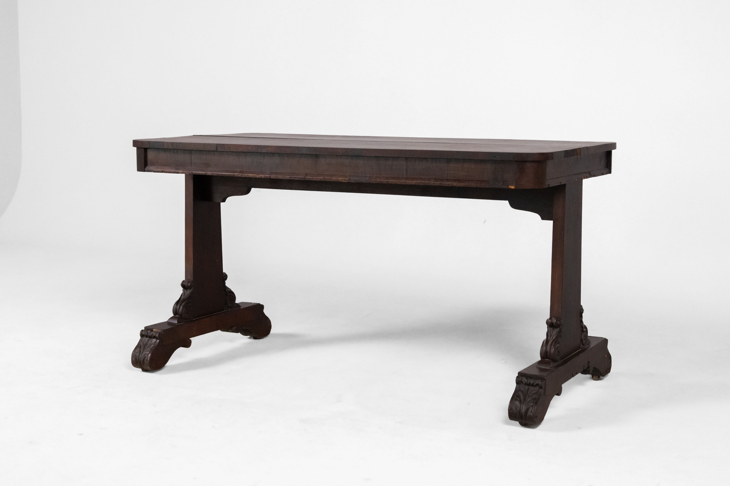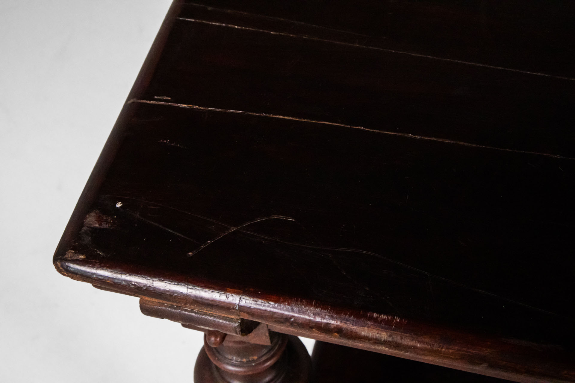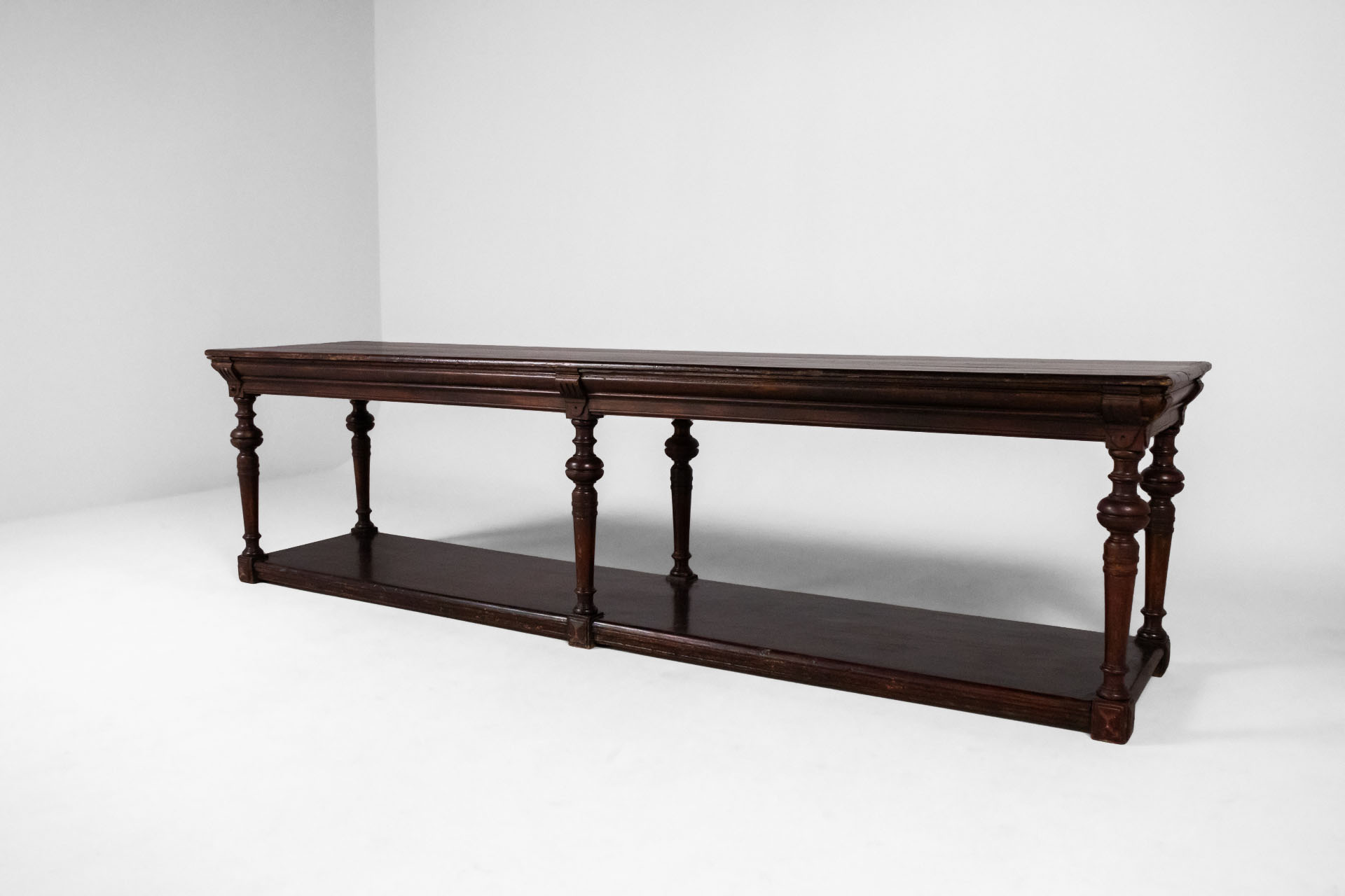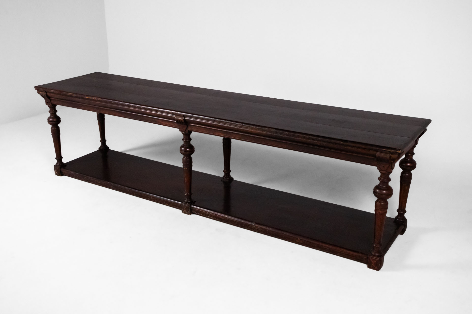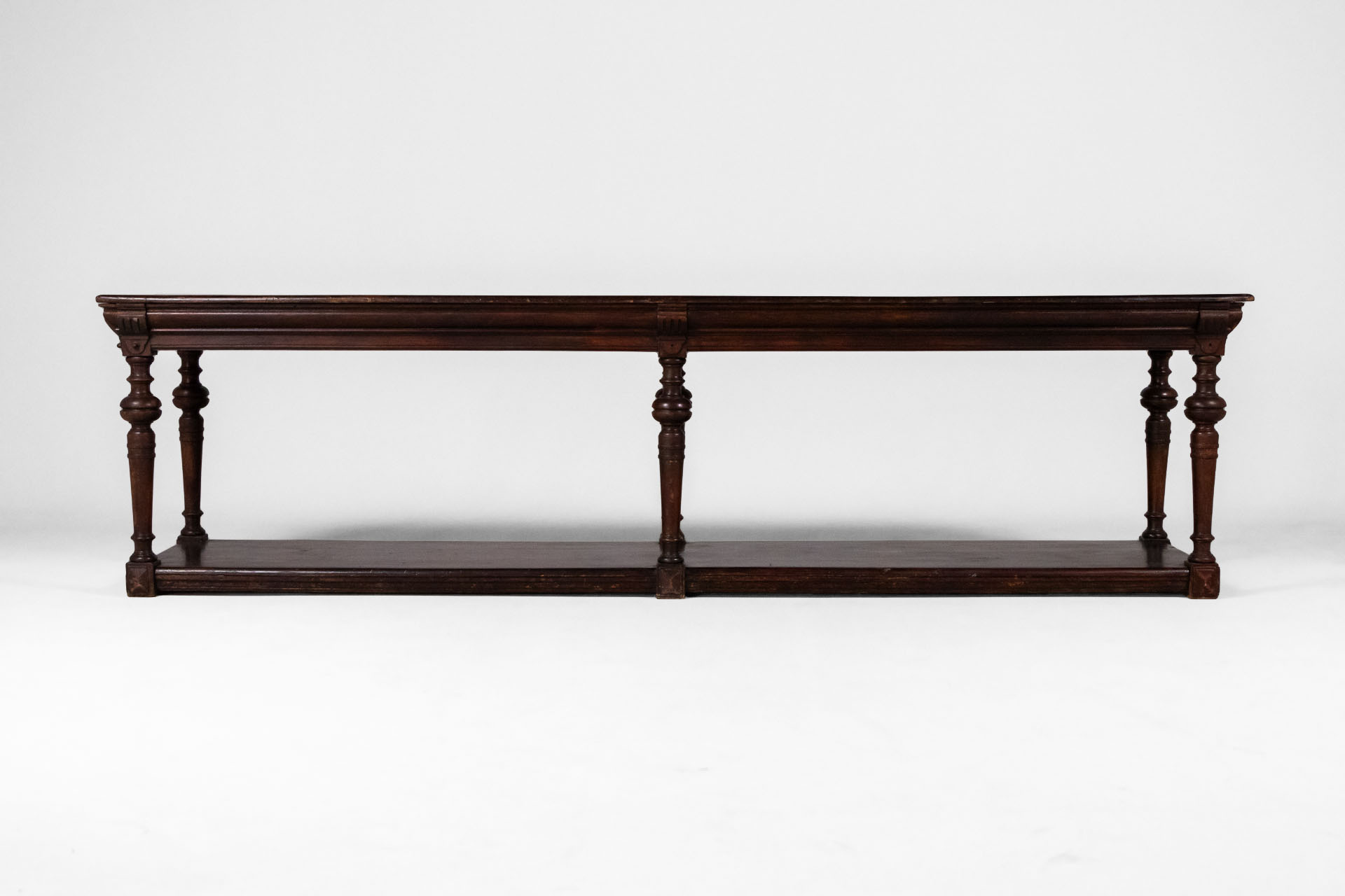 Elegáns, hosszú formájú konzolasztal, masszív, sötétbarna fából készült, díszes lábakkal és alsó polccal a praktikus tárolás érdekében