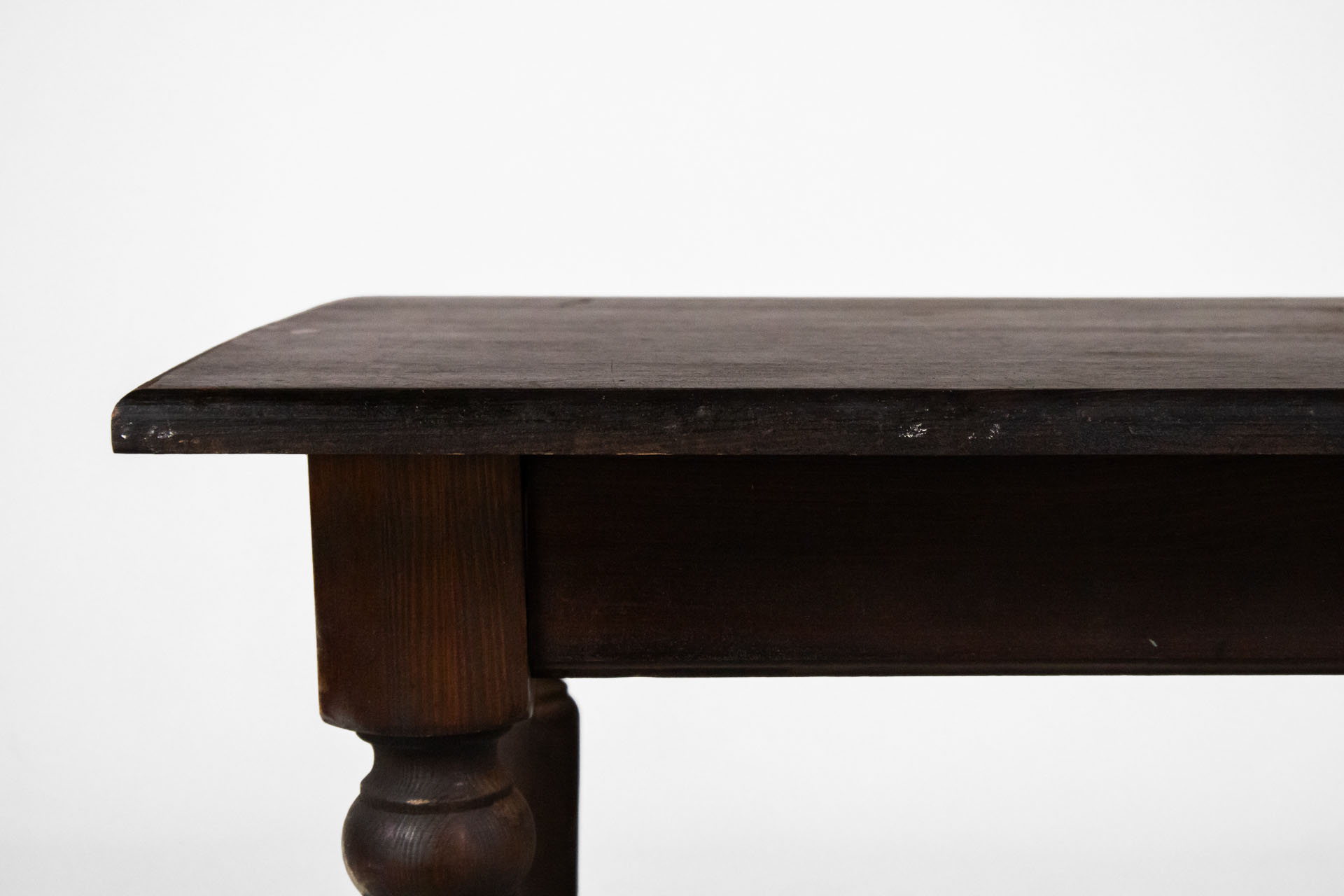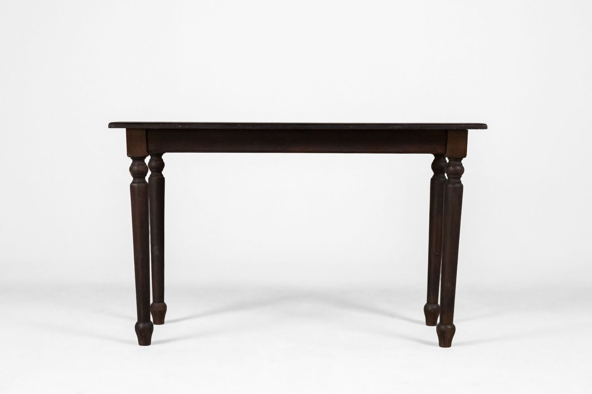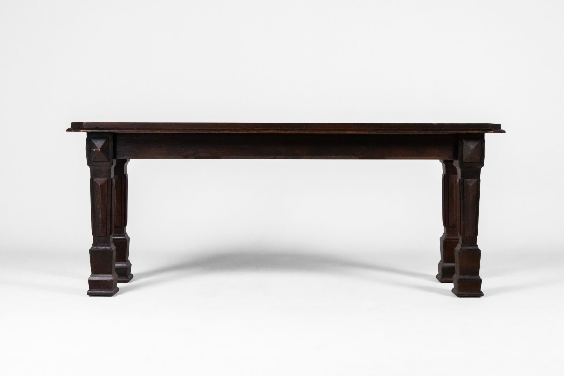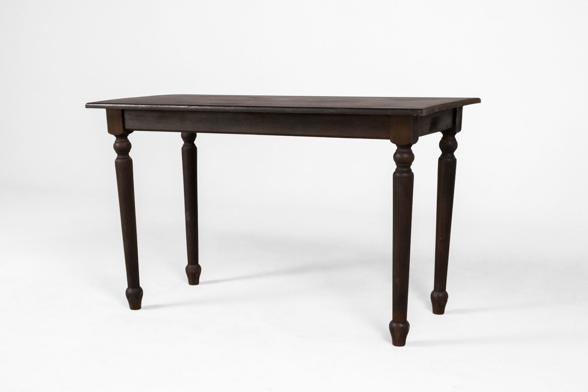 Masszív, klasszikus stílusú étkezőasztal, téglalap alakú asztallappal és erős, négyzetes lábakkal, melyek díszített sarkokkal rendelkeznek. Az asztal sötétbarna színű, amely időtlen eleganciát sugároz