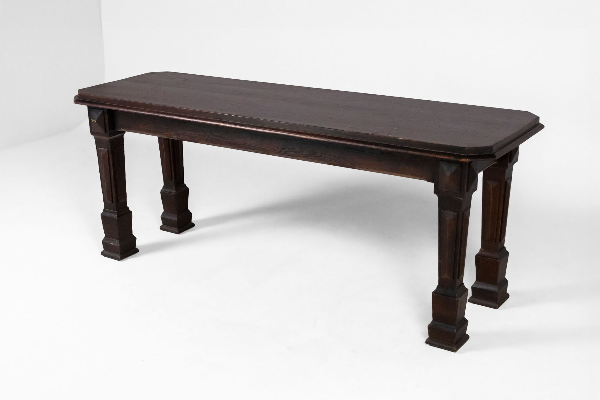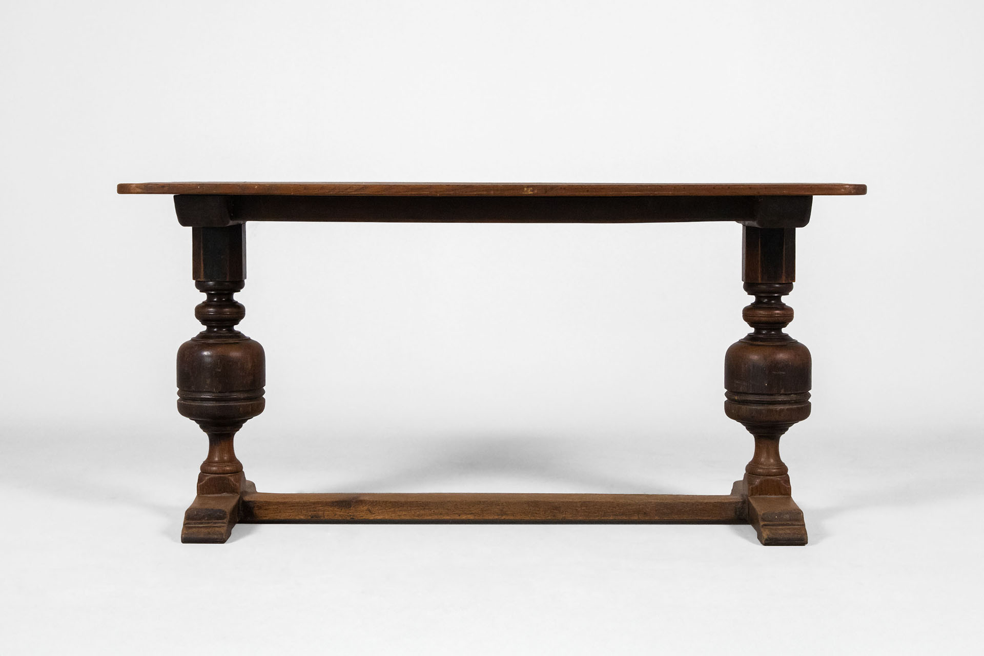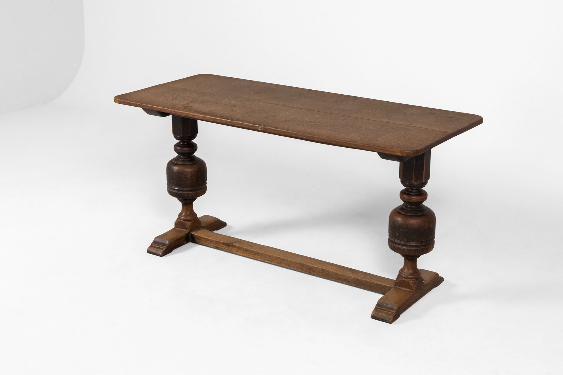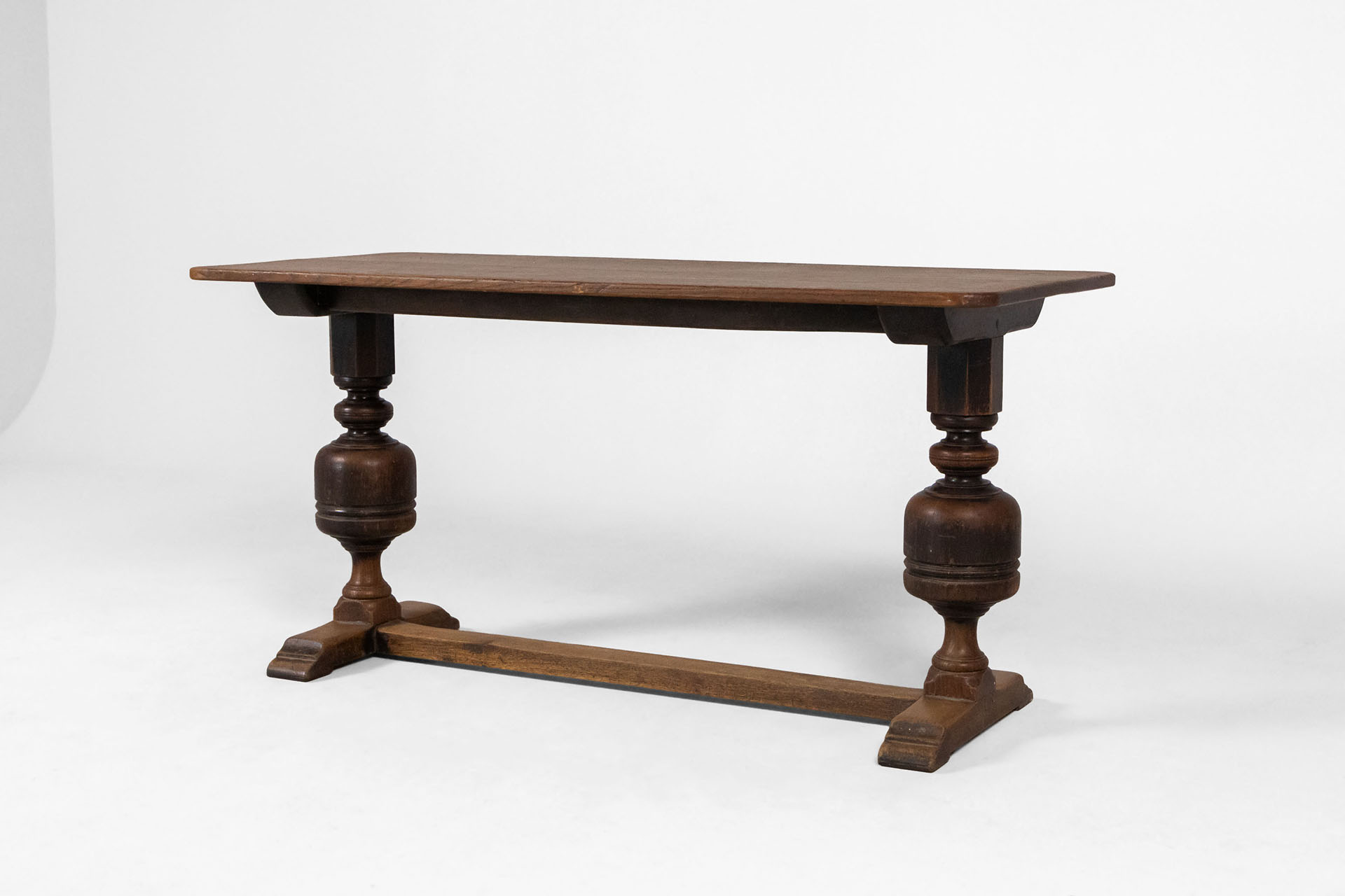 Masszív, klasszikus stílusú étkezőasztal, téglalap alakú asztallappal és erős, négyzetes lábakkal, melyek díszített sarkokkal rendelkeznek. Az asztal sötétbarna színű, amely időtlen eleganciát sugároz