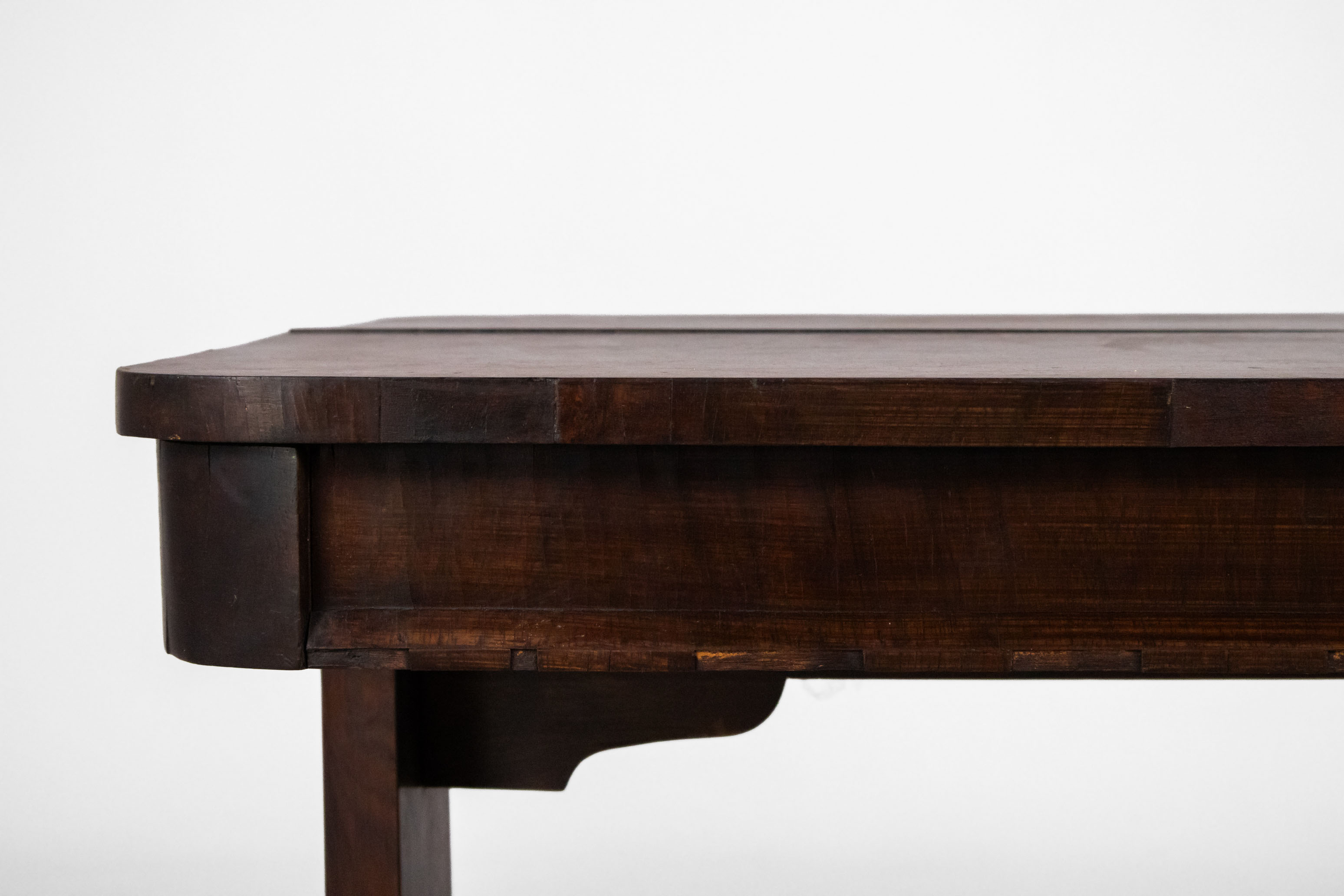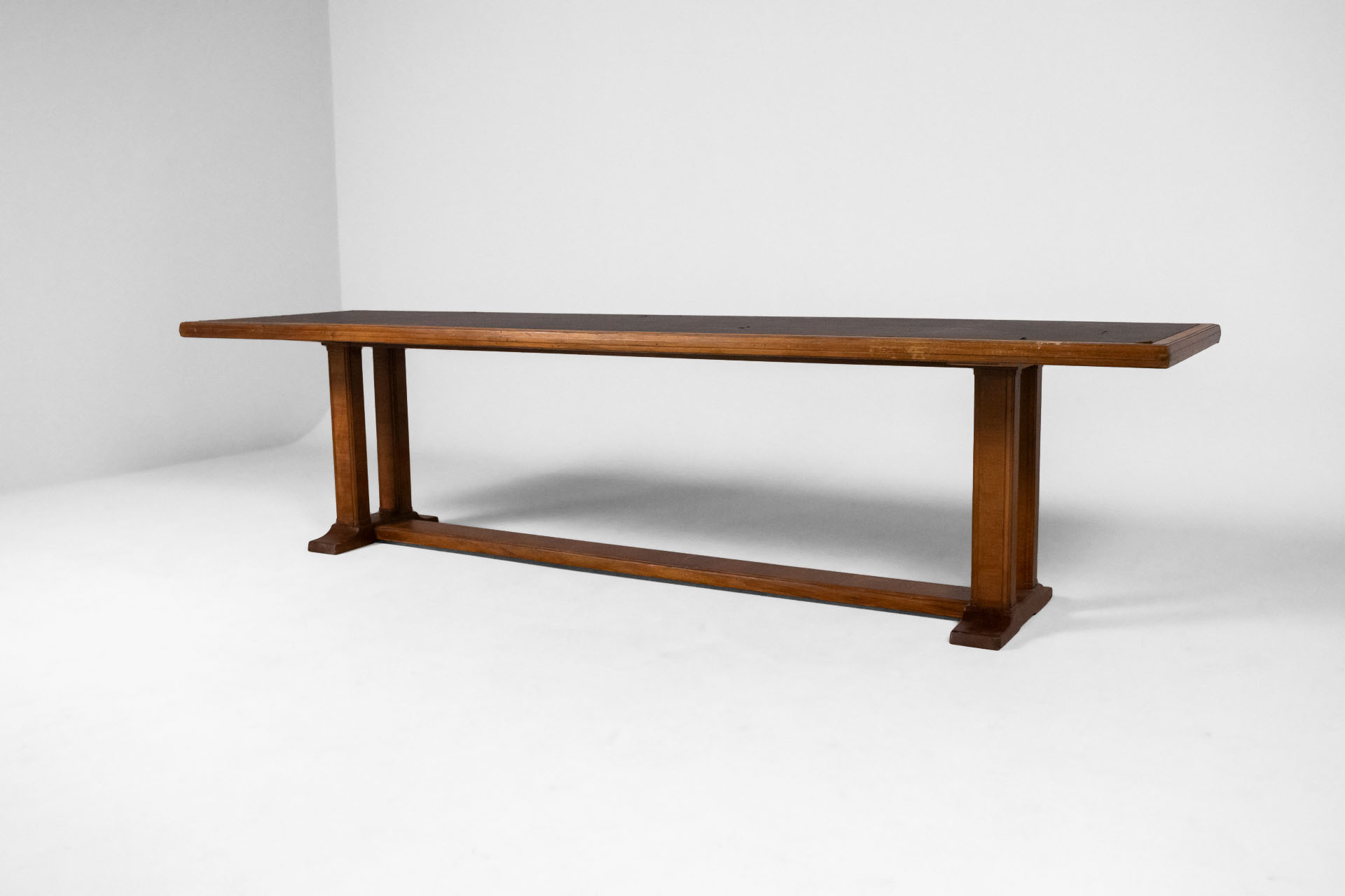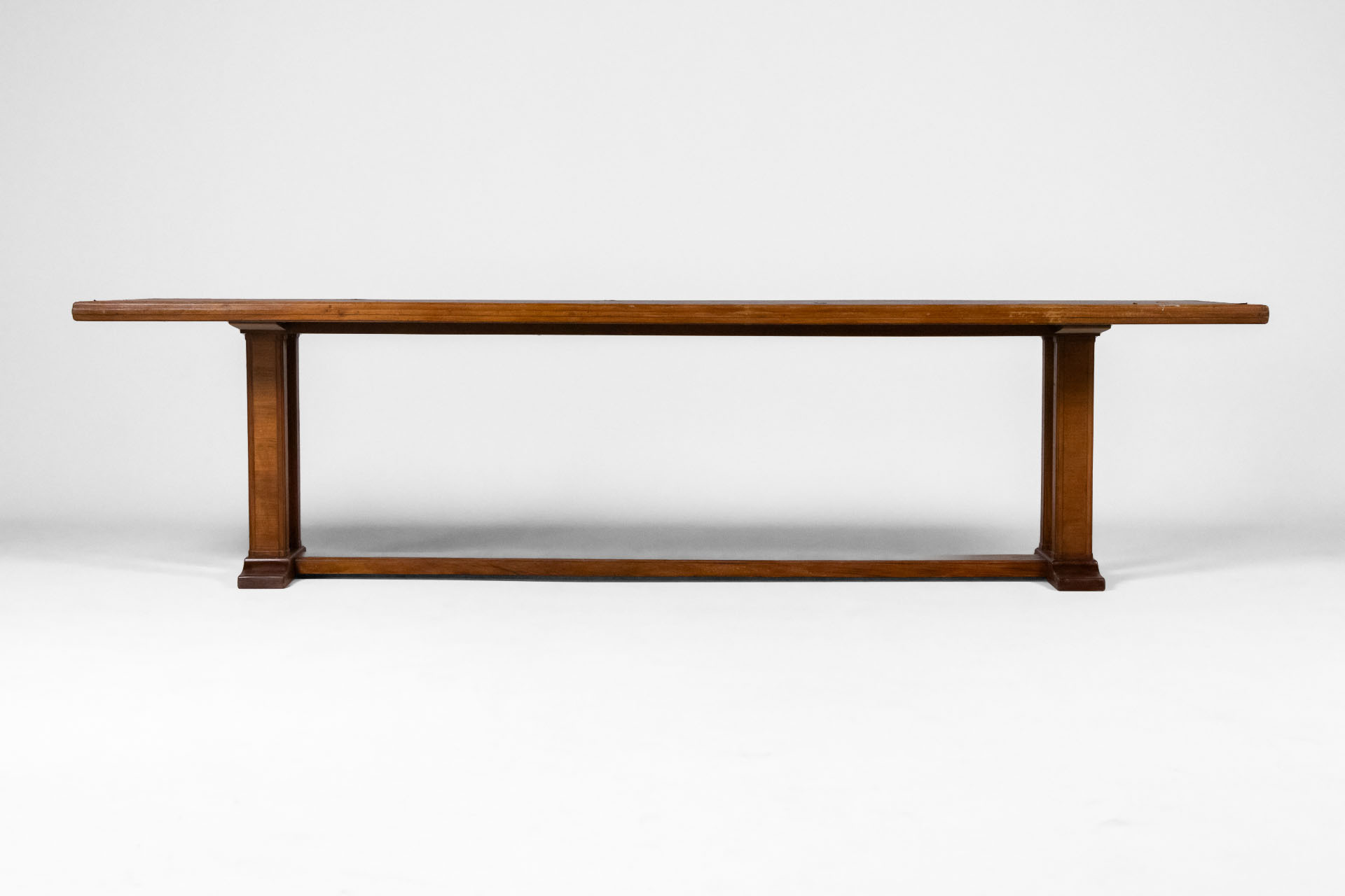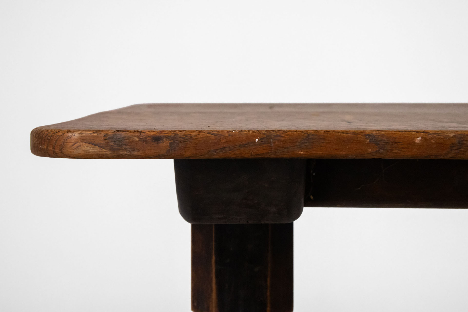 Masszív, klasszikus stílusú étkezőasztal, téglalap alakú asztallappal és erős, négyzetes lábakkal, melyek díszített sarkokkal rendelkeznek. Az asztal sötétbarna színű, amely időtlen eleganciát sugároz