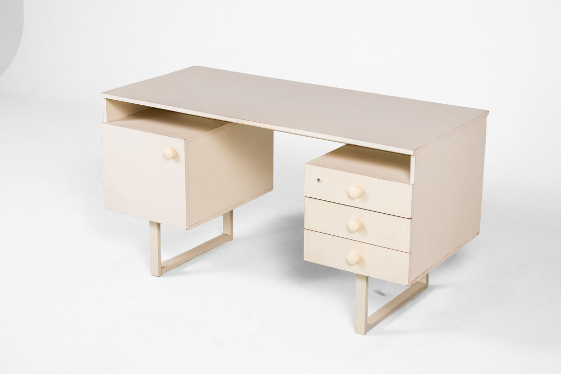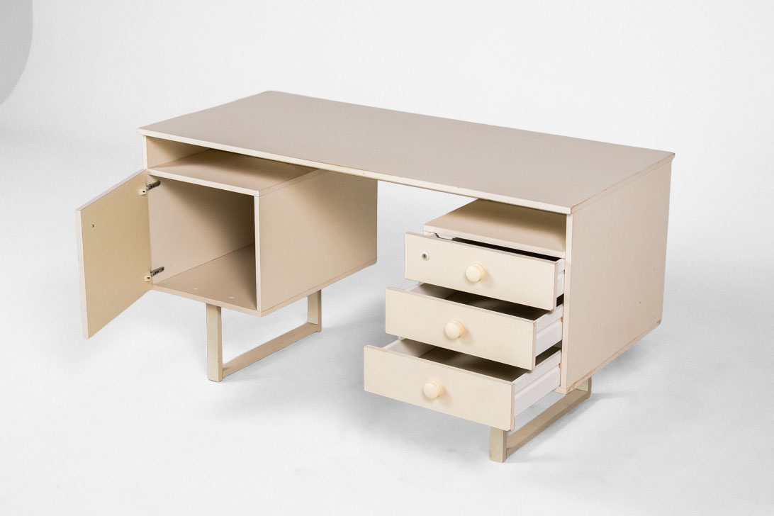 Egyszerű, letisztult formájú íróasztal, világos bézs színben, amely modern és funkcionális kialakítással rendelkezik. Az asztal bal oldalán egy ajtós tároló, míg a jobb oldalon három fiók található, mindegyik...