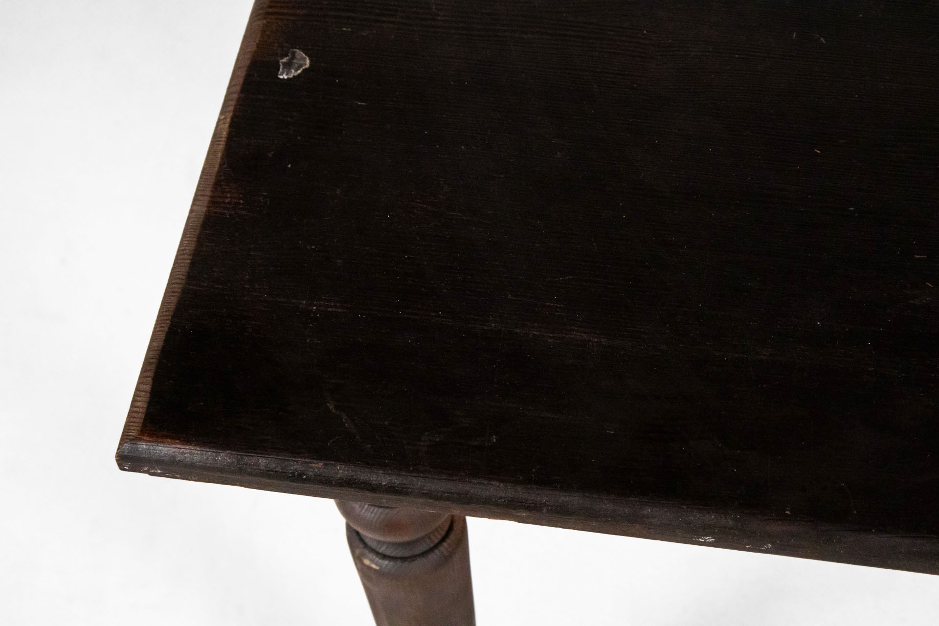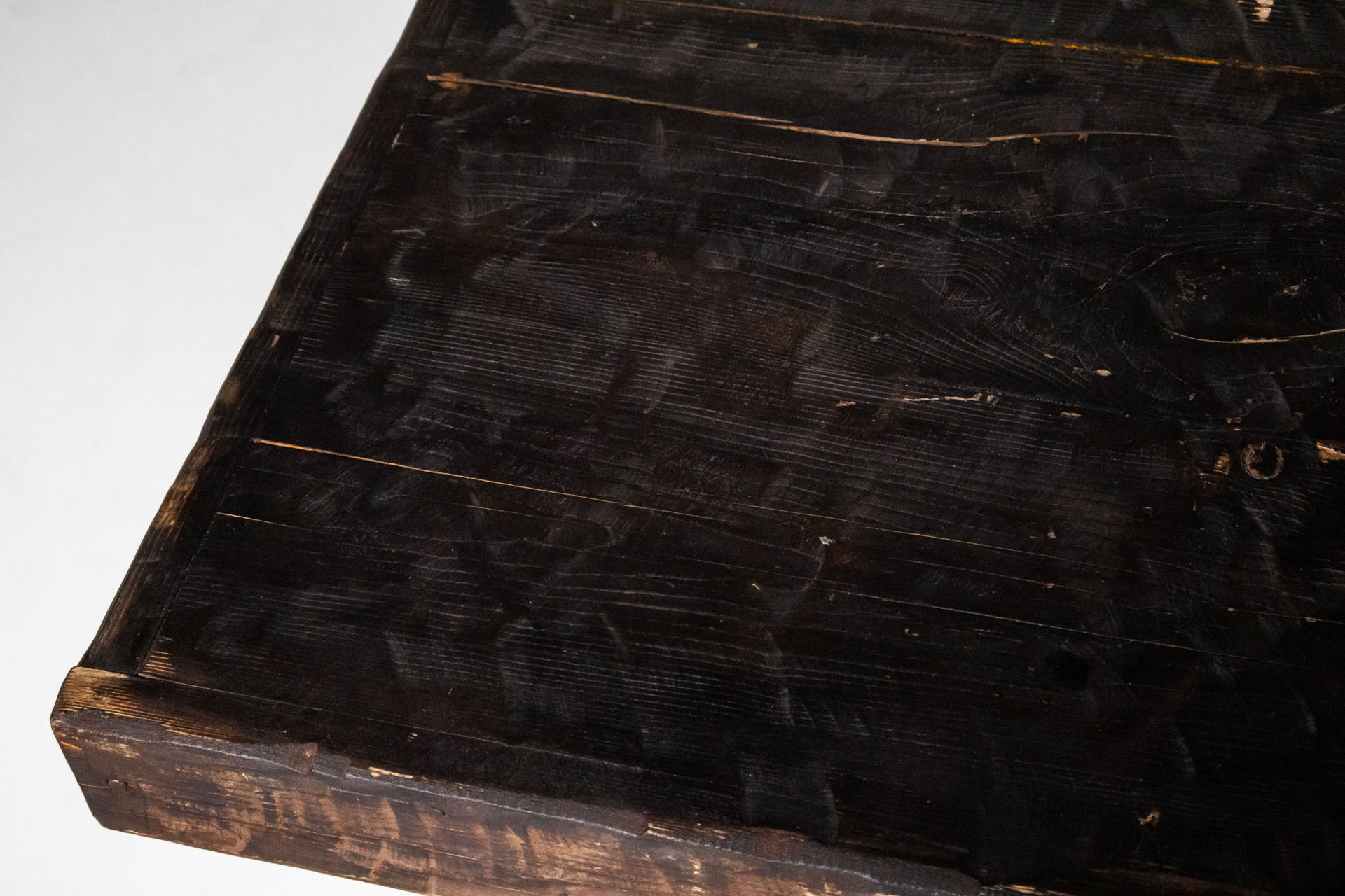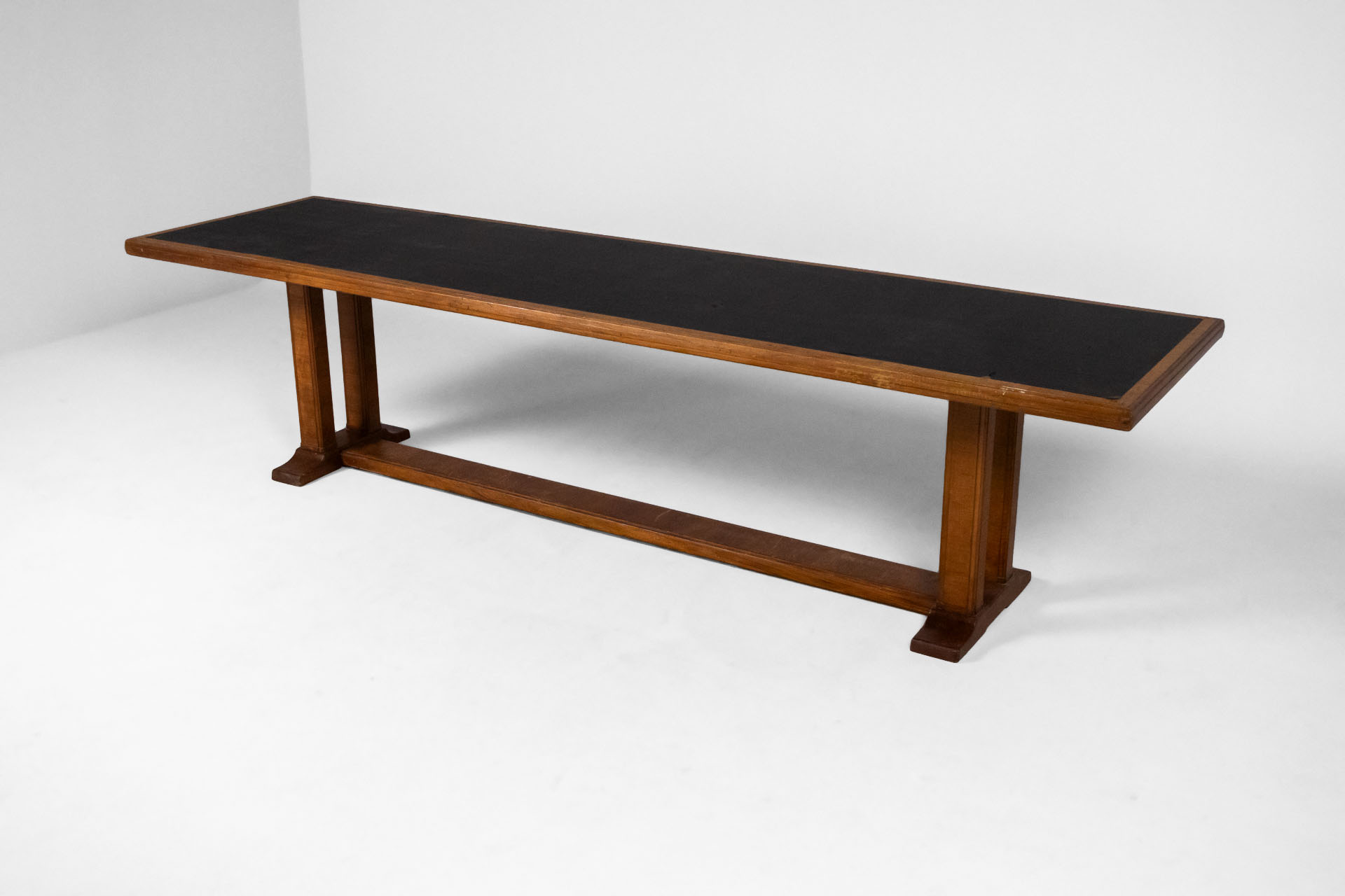 Modern stílusú, hosszú, téglalap alakú asztal, sima fekete felülettel és masszív, fa lábazattal. Az asztal elegáns megjelenése és stabil szerkezete ideálissá teszi különböző filmes díszletekhez