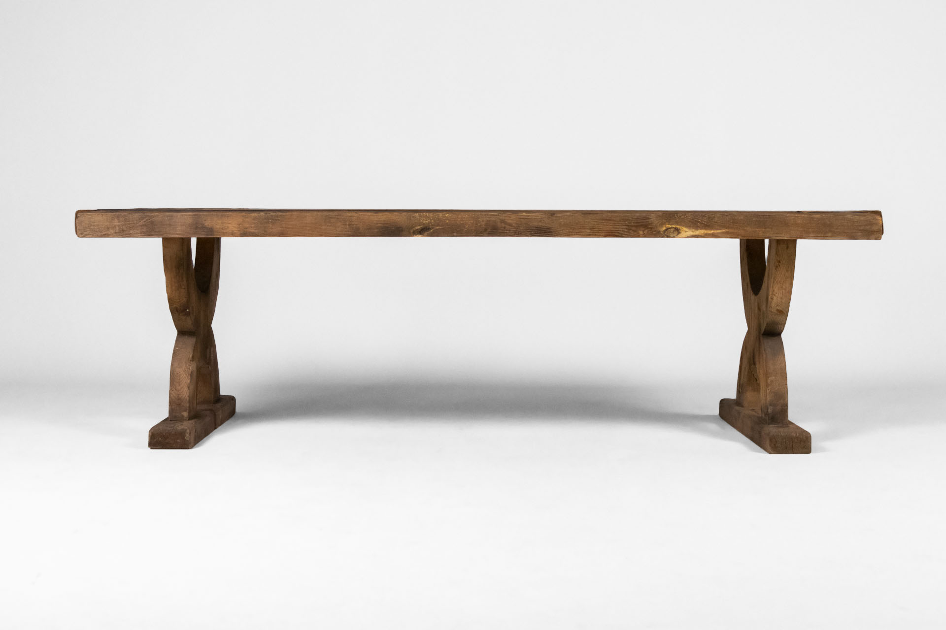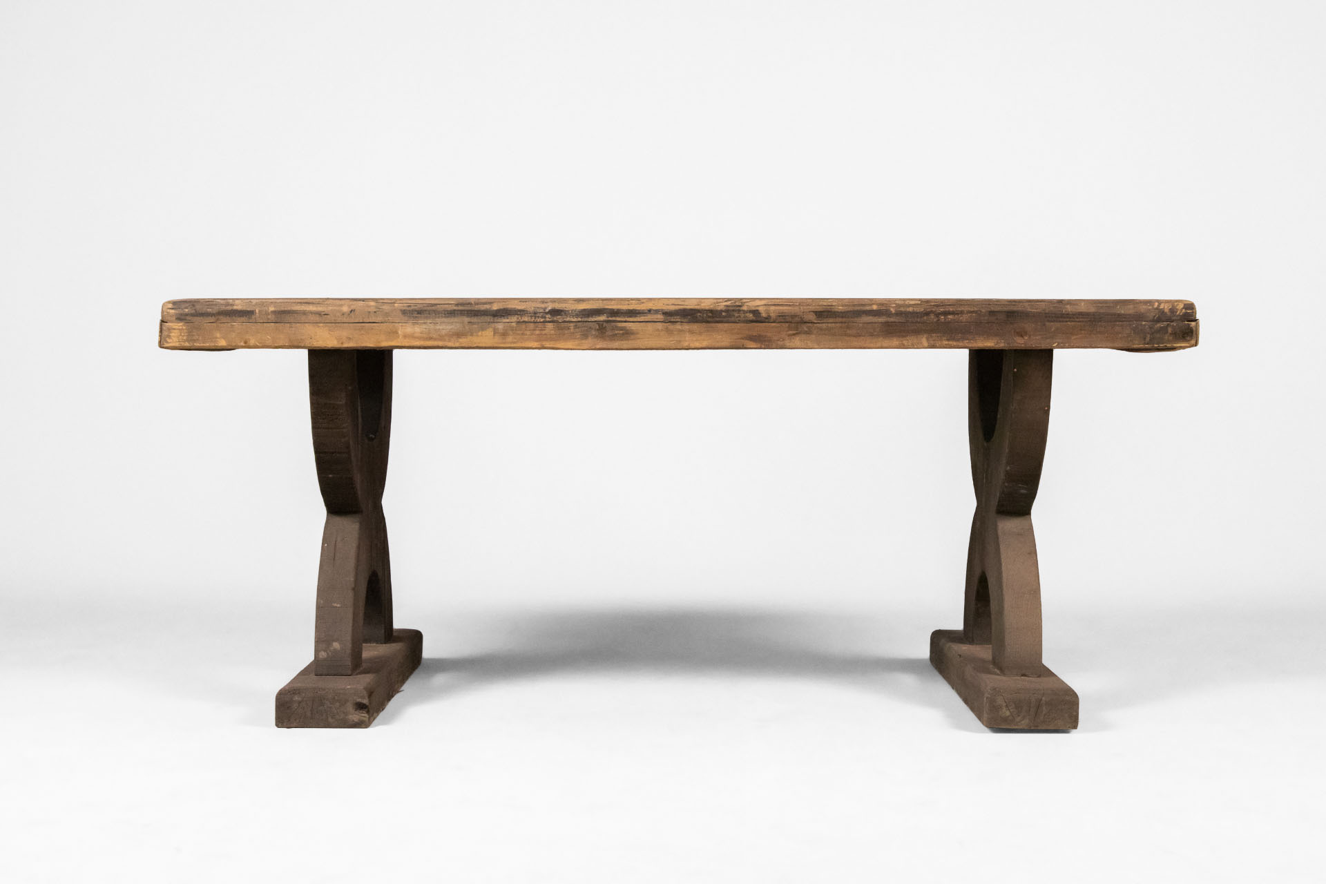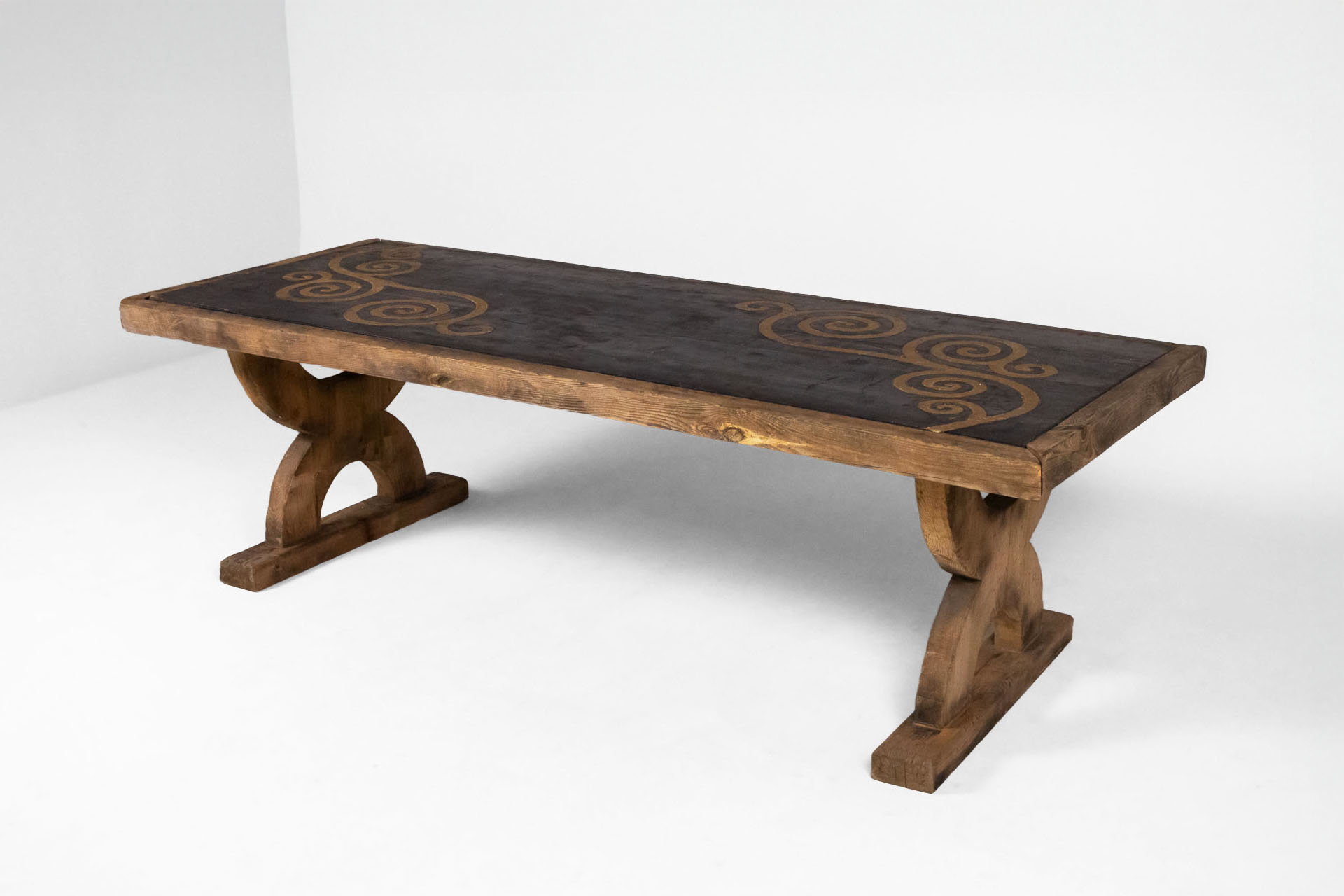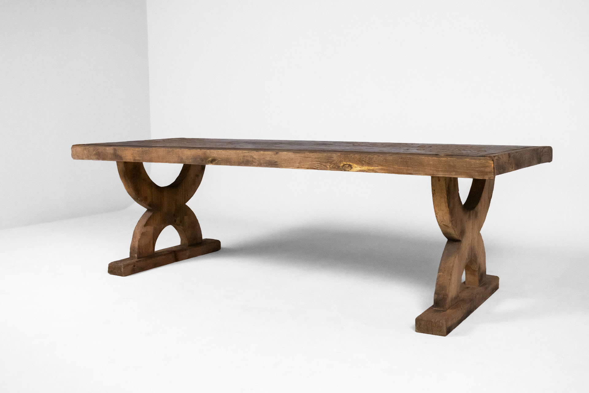 Masszív rusztikus hosszú étkezőasztal díszes spirális mintázattal és jellegzetes X lábakkal