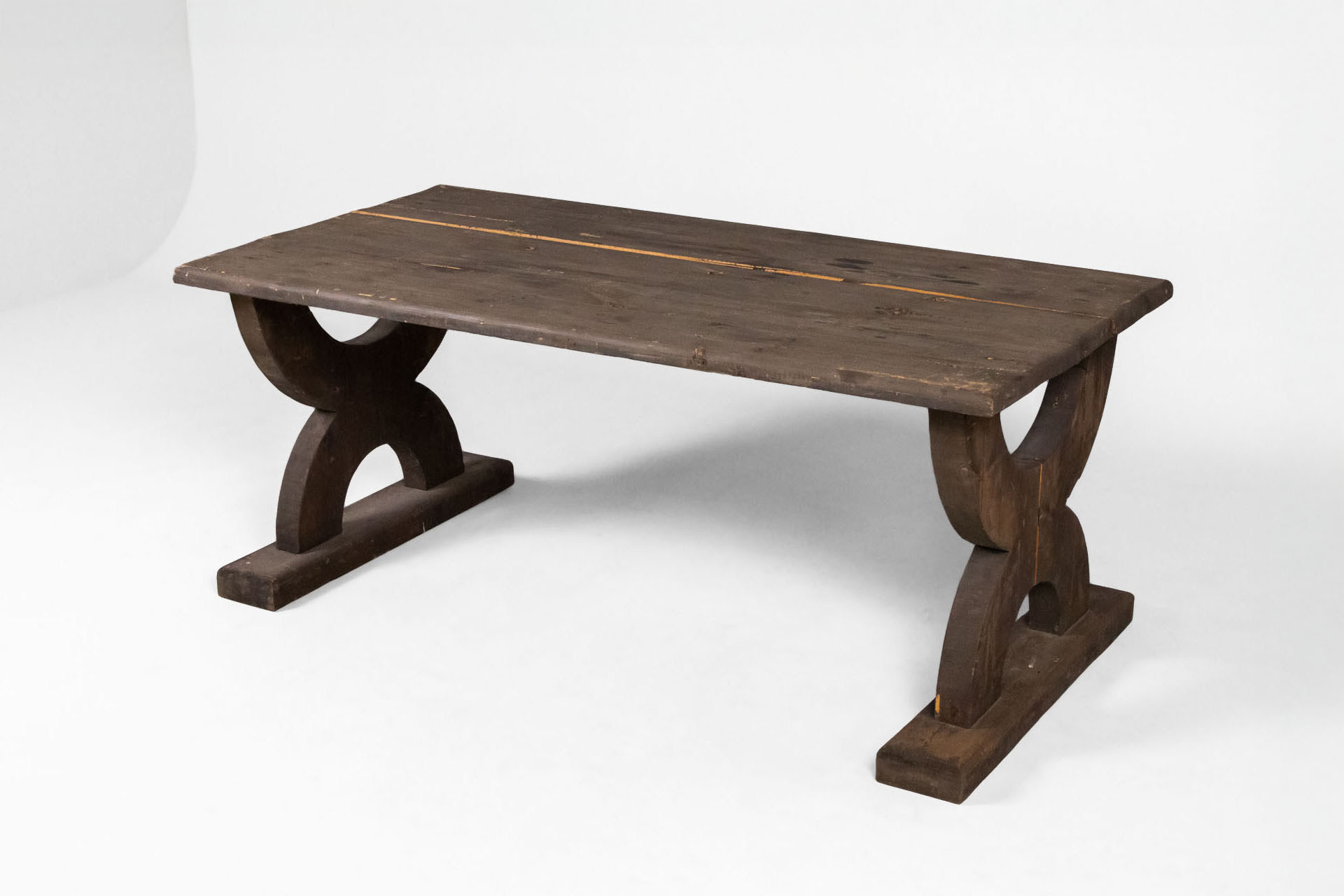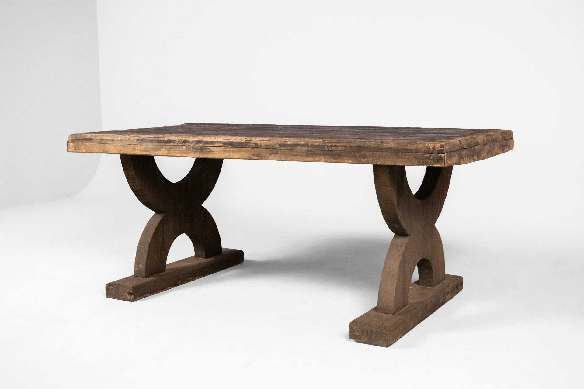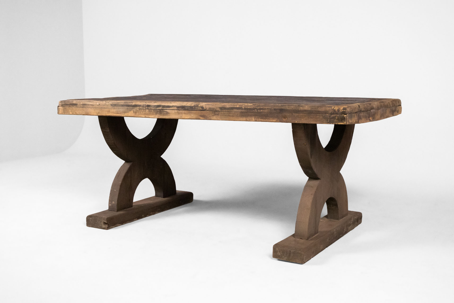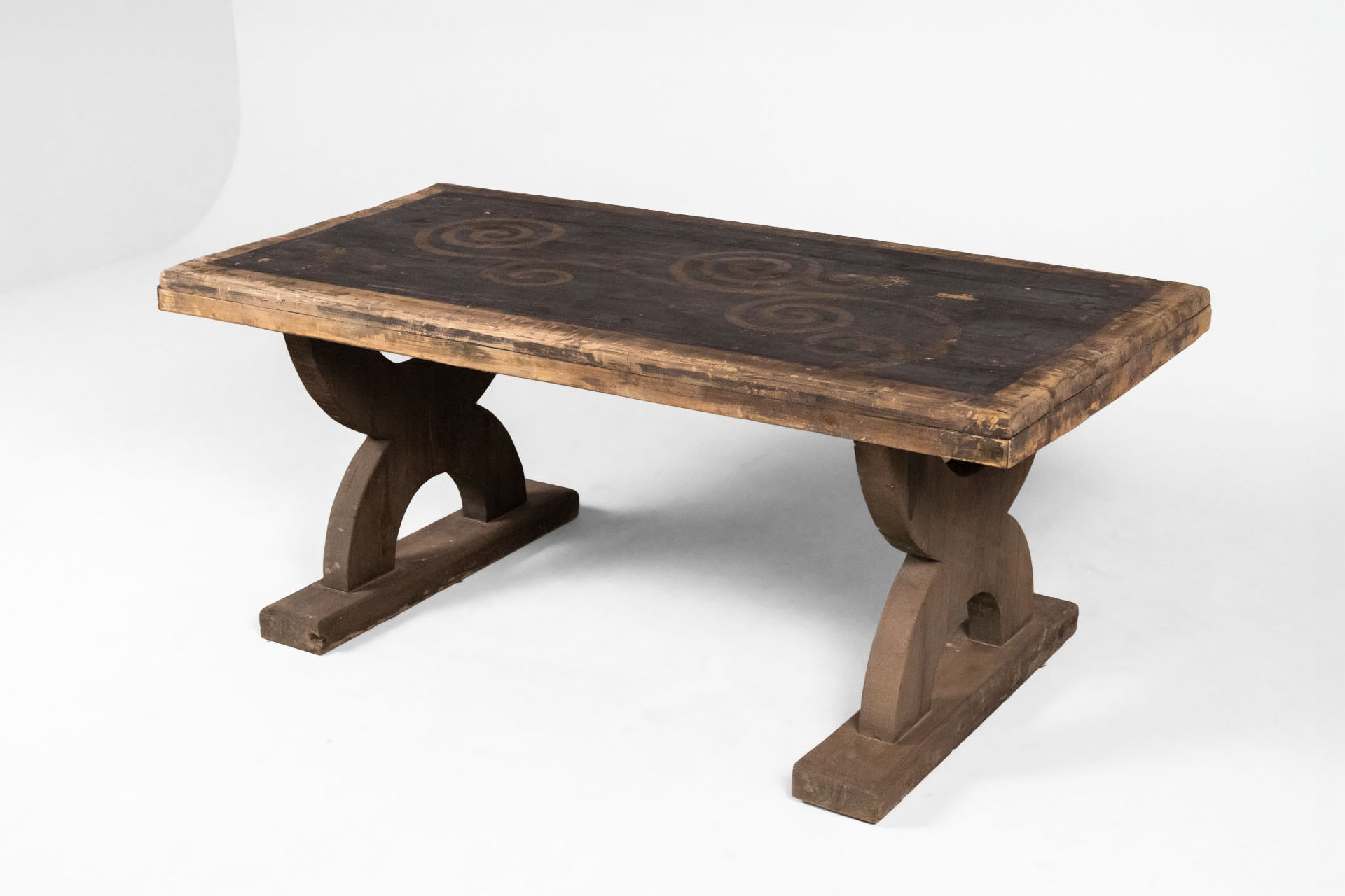 Masszív rusztikus hosszú étkezőasztal díszes spirális mintázattal és jellegzetes X lábakkal