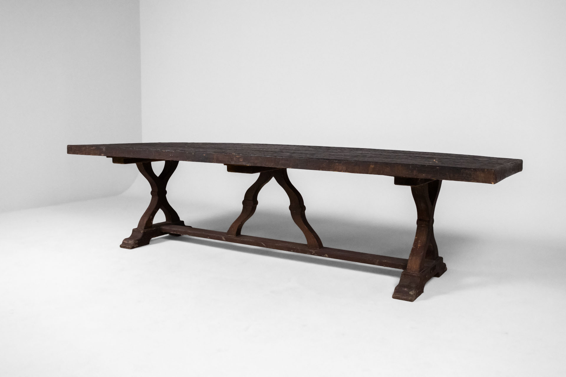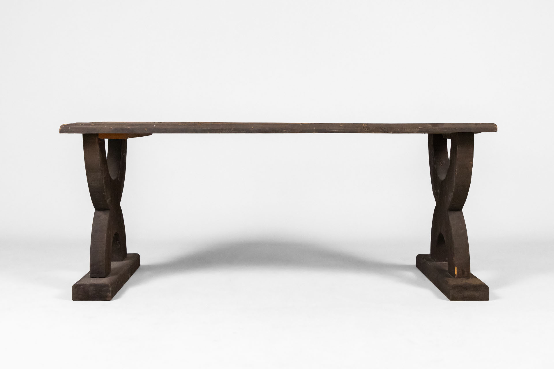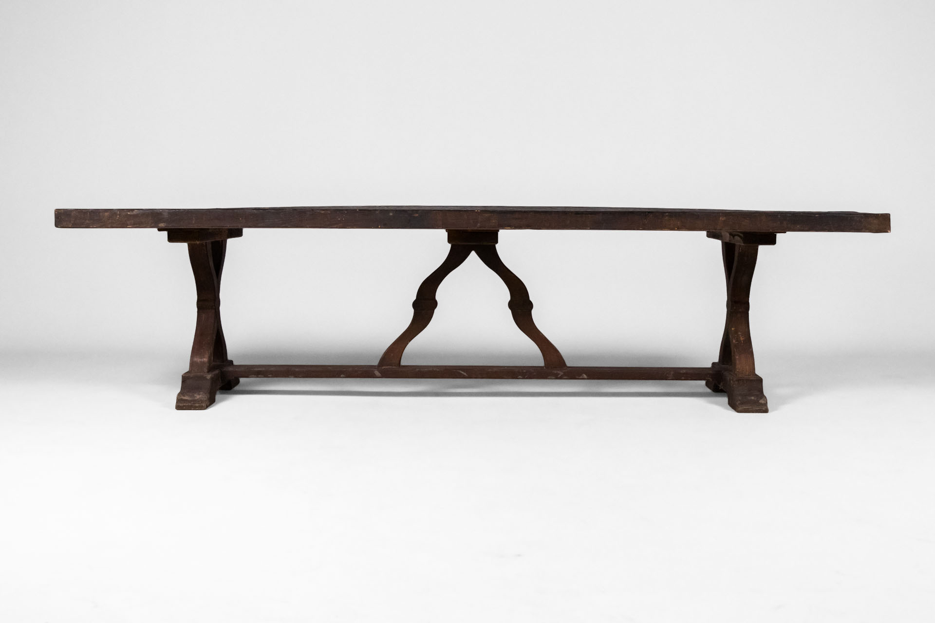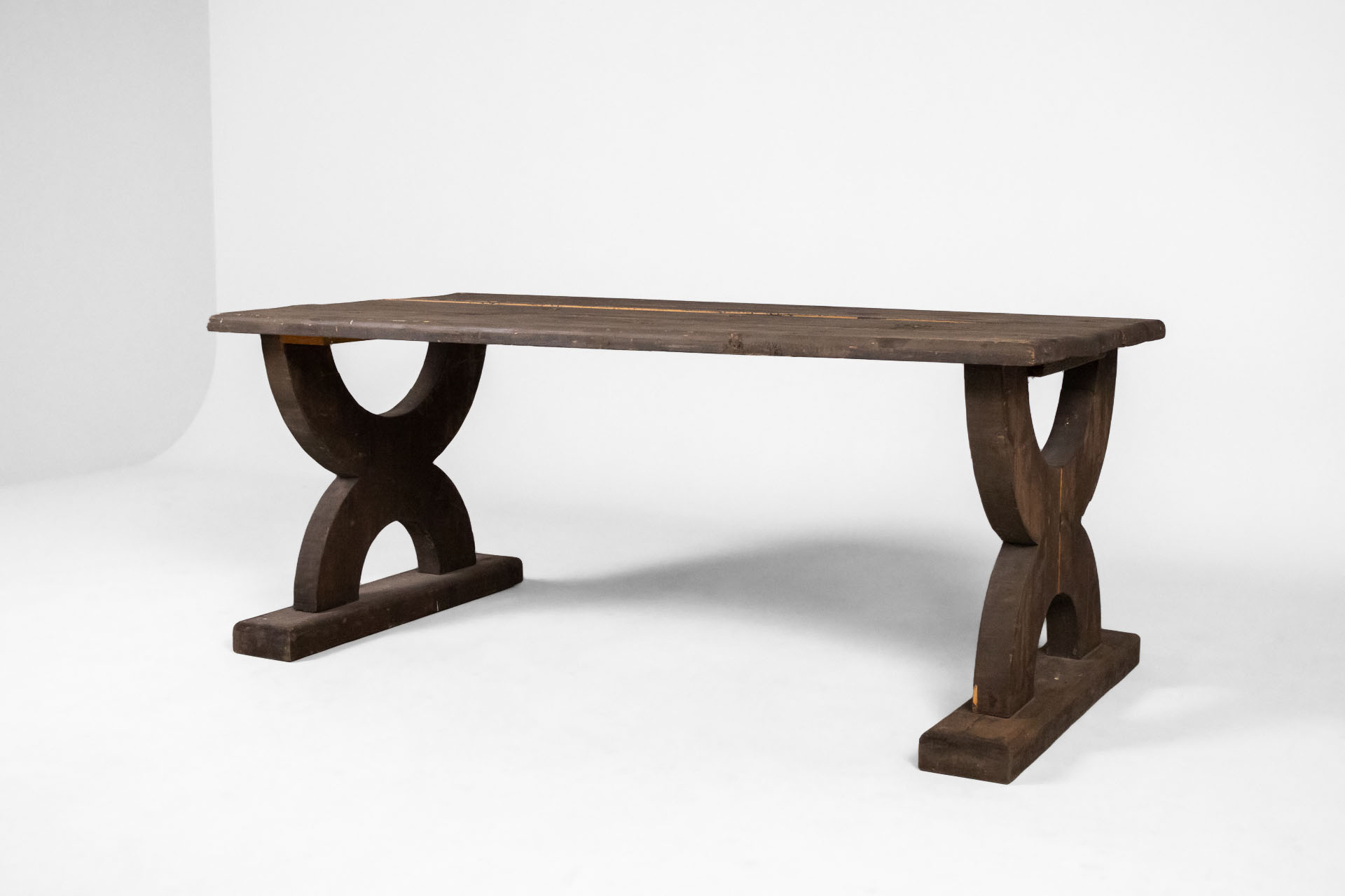 Masszív rusztikus hosszú étkezőasztal díszes spirális mintázattal és jellegzetes X lábakkal