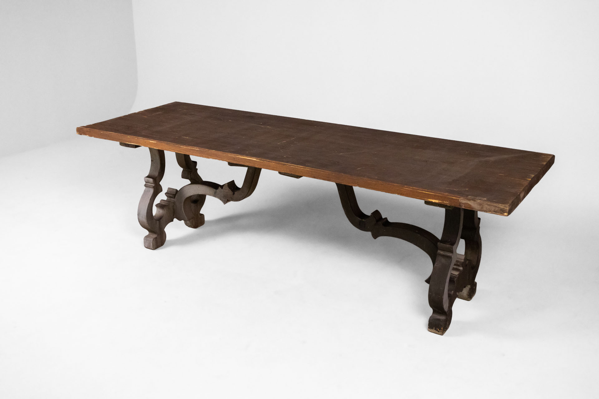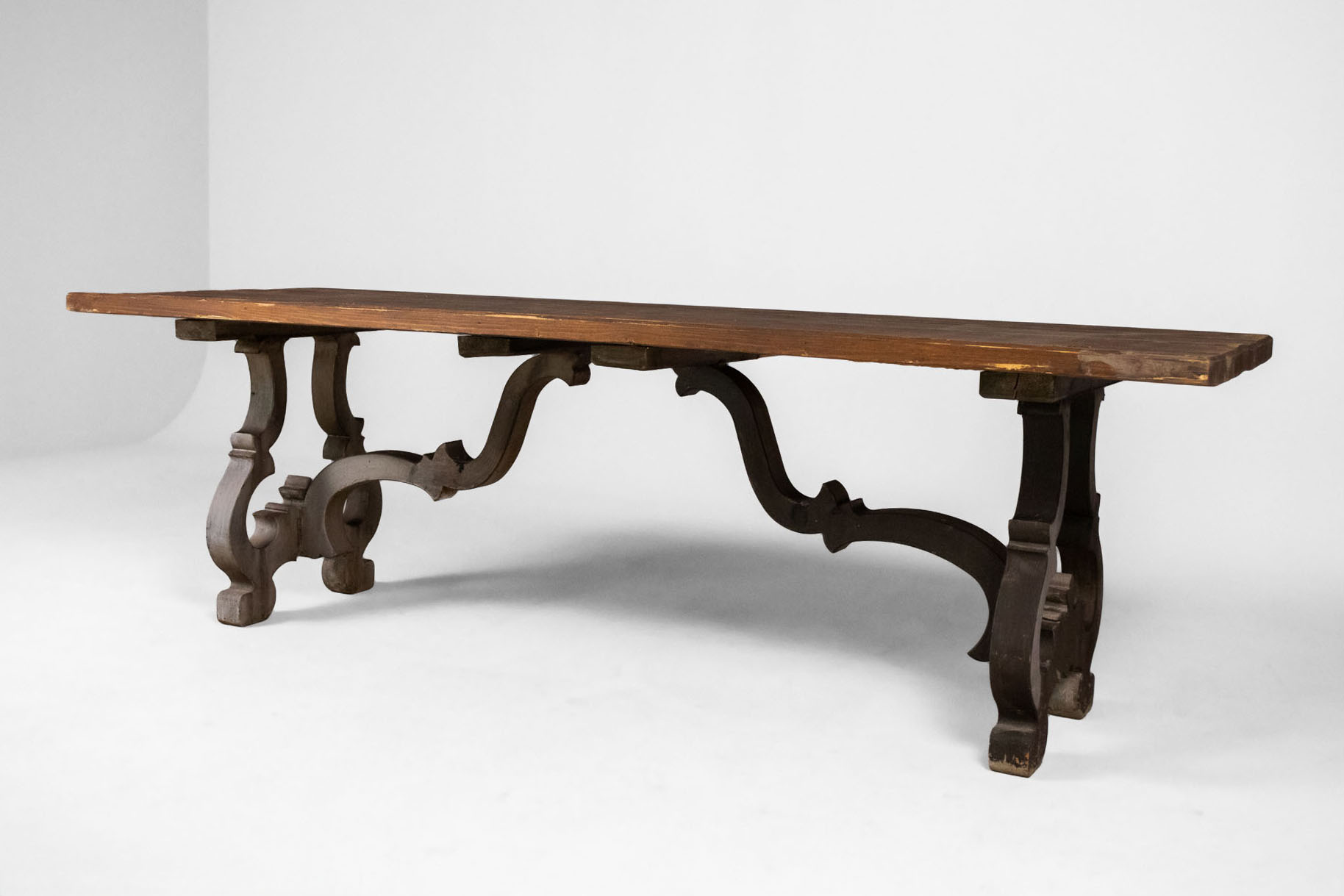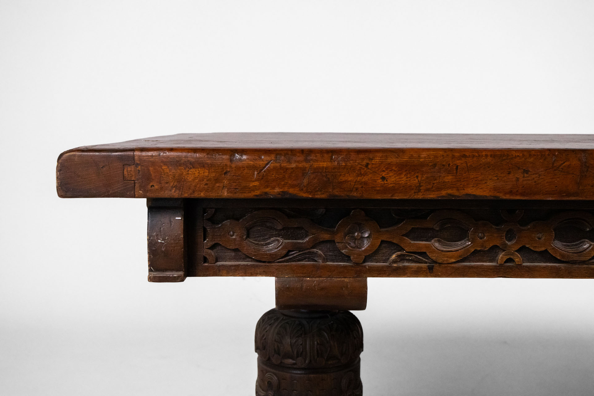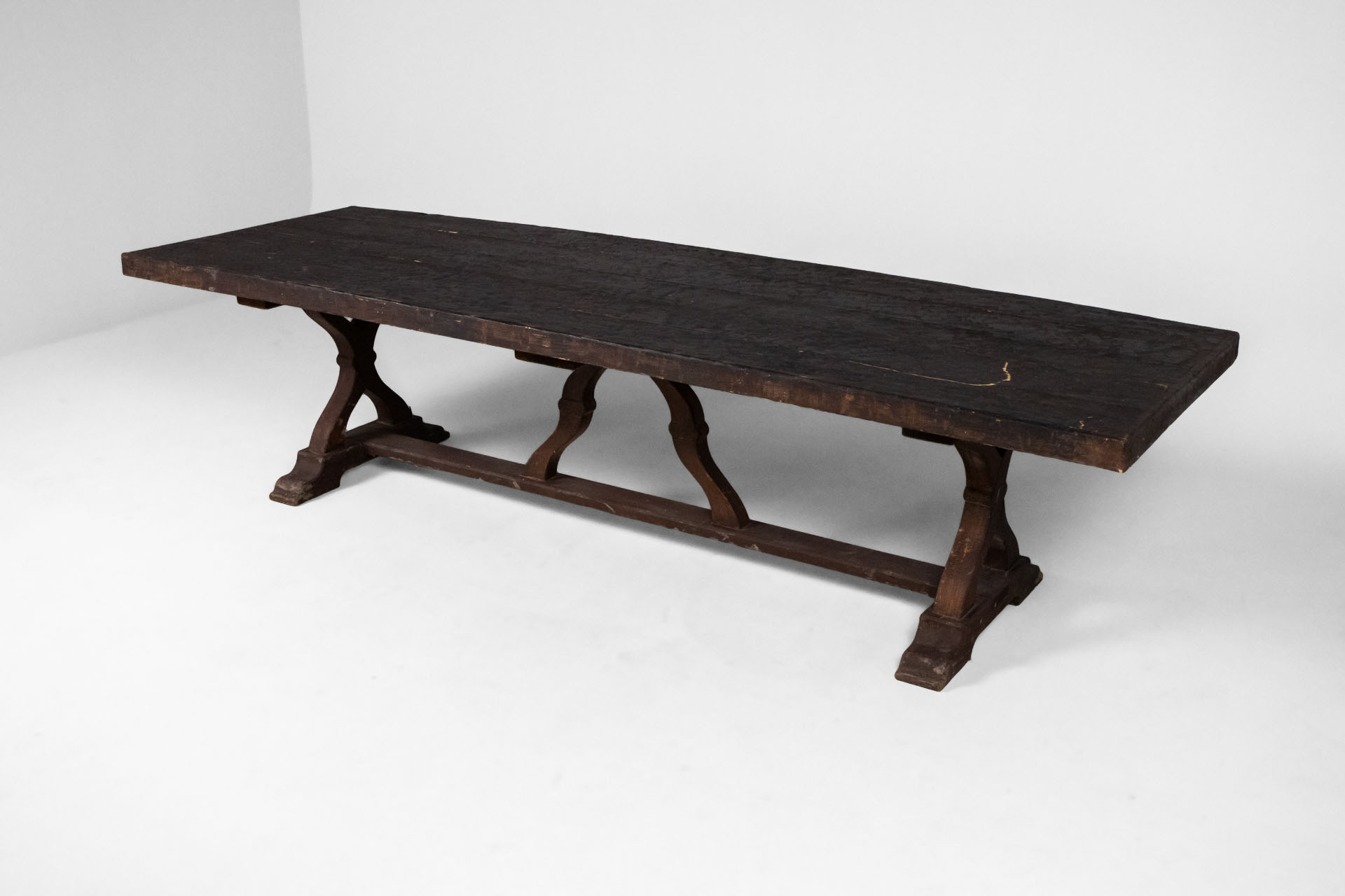 Masszív rusztikus hosszú étkezőasztal díszes spirális mintázattal és jellegzetes X lábakkal