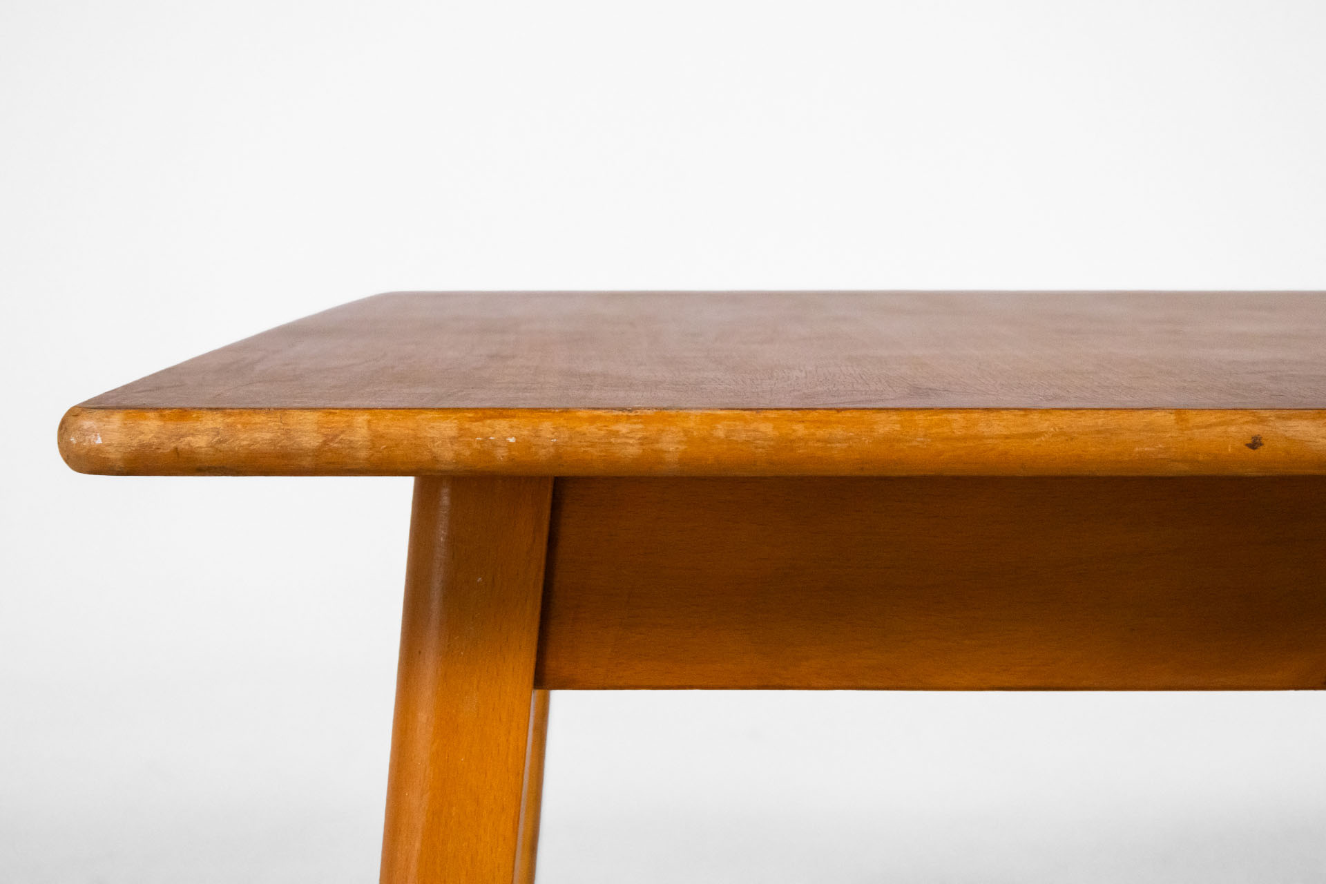 Letisztult, modern stílusú, téglalap alakú tölgyfa asztal, elegáns, vékony lábakkal és praktikus fiókkal, amely ideális választás étkezőkbe vagy munkaterületekre, biztosítva a funkcionalitást és a stílust