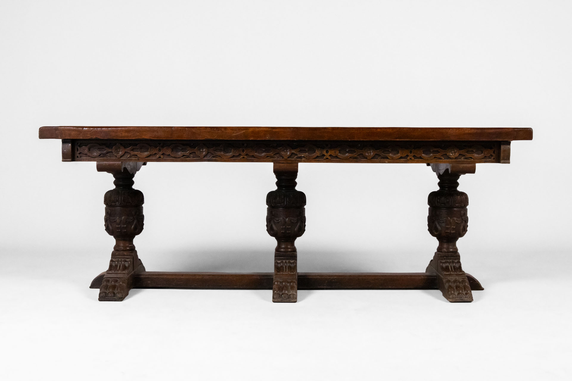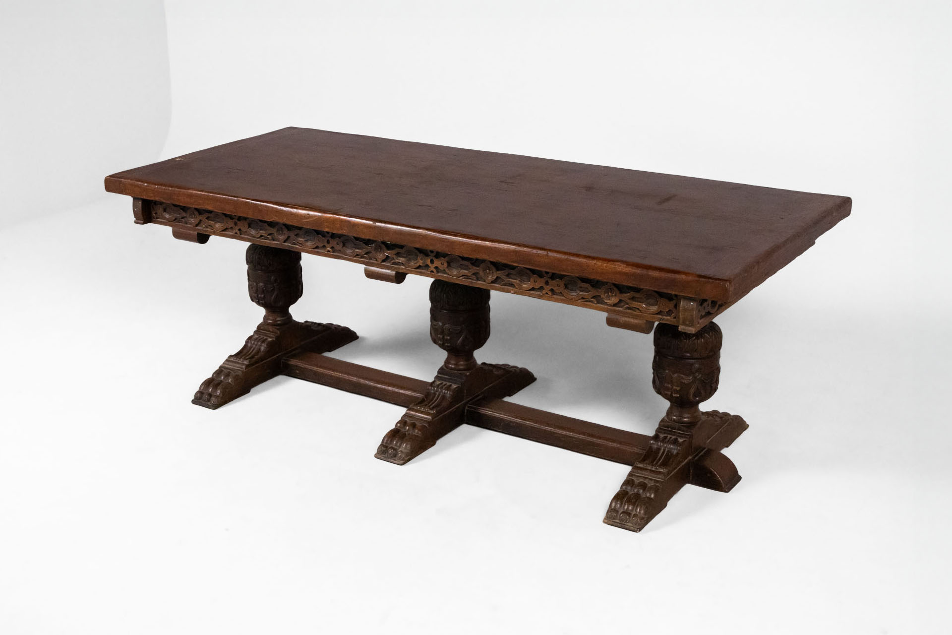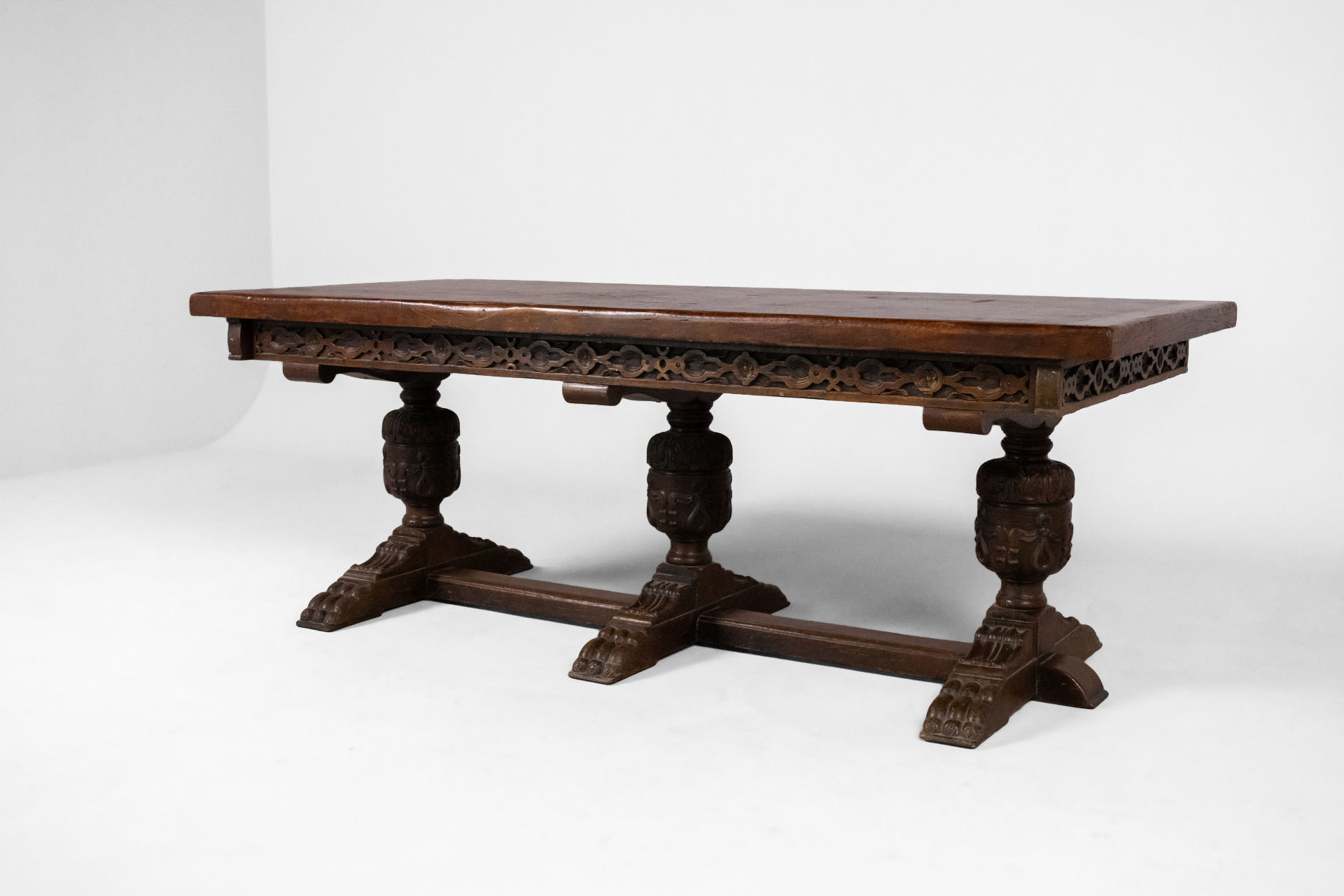 Masszív, faragott fa étkezőasztal, amely klasszikus stílusával és részletes díszítéseivel kiemelkedik. Az asztallap széles és sík, míg a lábak erőteljes, stabil szerkezetet biztosítanak. Az asztal alsó részén...