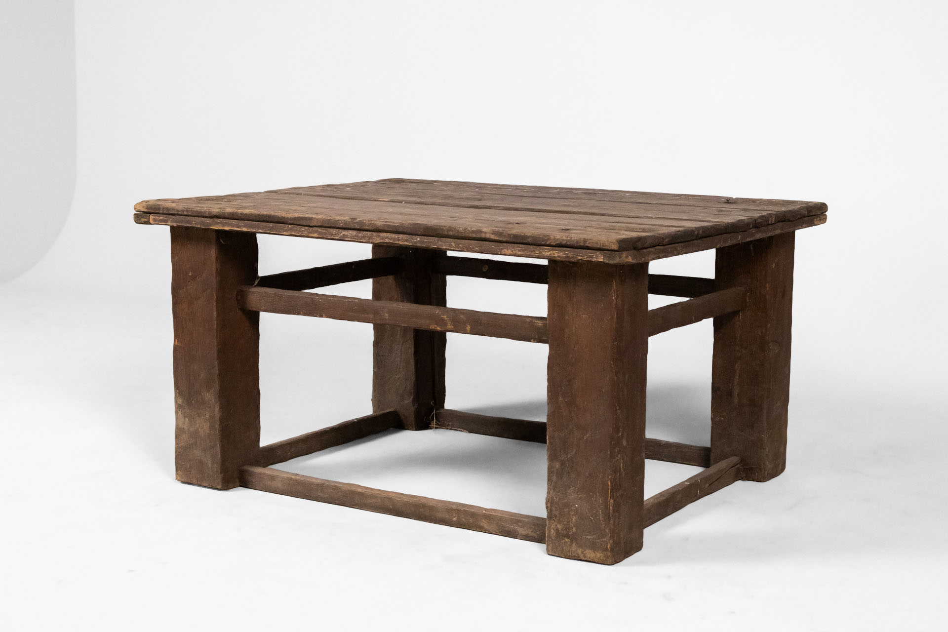 Rusztikus stílusú, négyzet alakú dohányzóasztal, masszív, durva felületű fából készült, erős lábazattal és egyszerű, de robusztus kialakítással