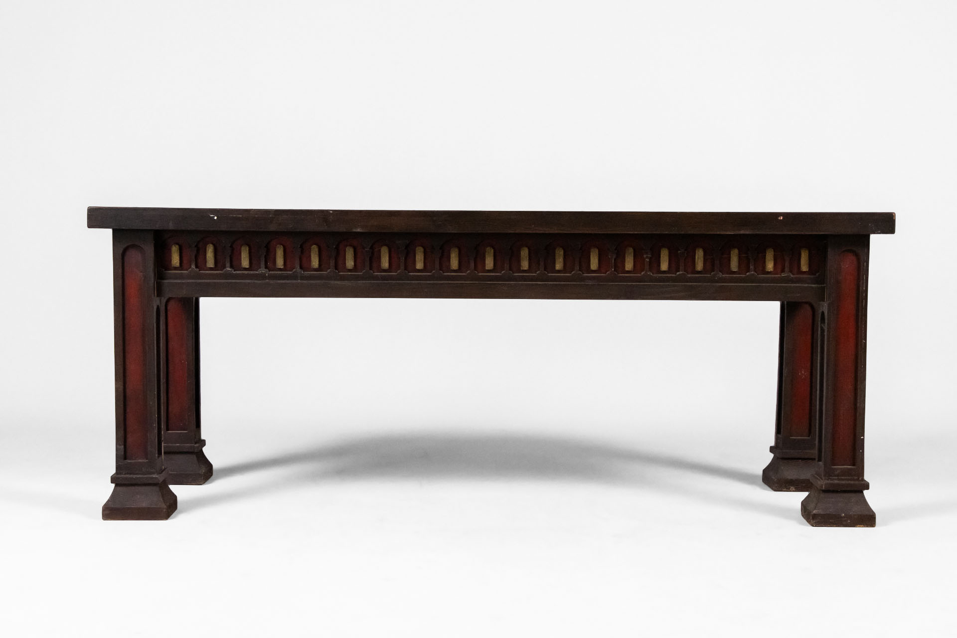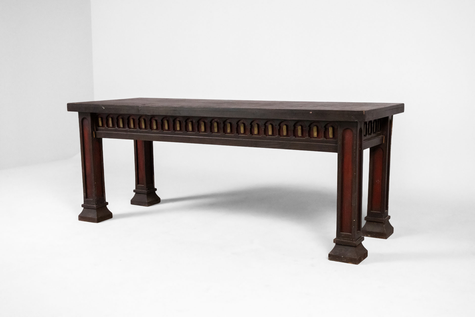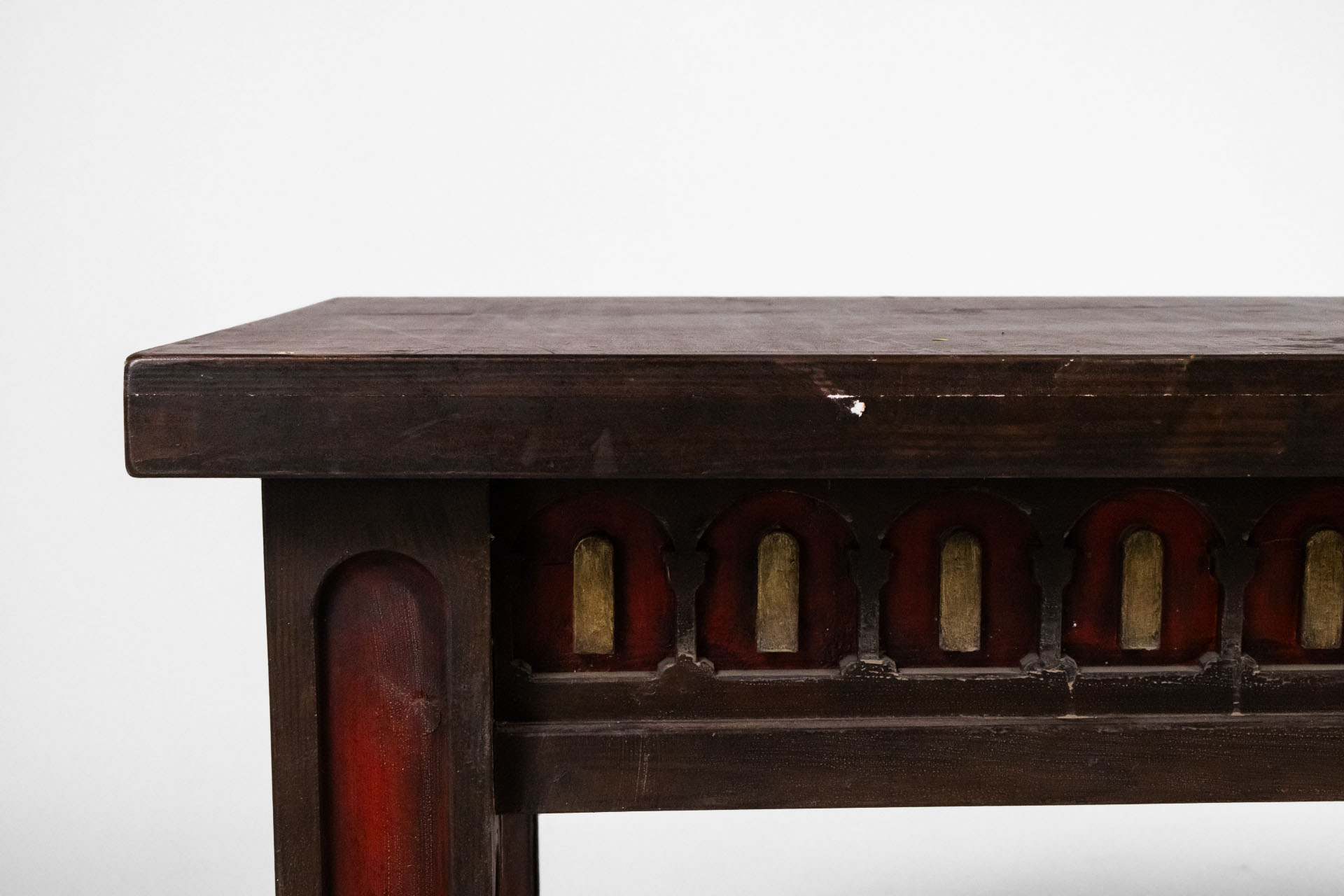 Masszív, téglalap alakú étkezőasztal, gazdag sötétbarna színben, díszített lábakkal és középen faragott részletekkel. Aranyszínű és piros festéssel
