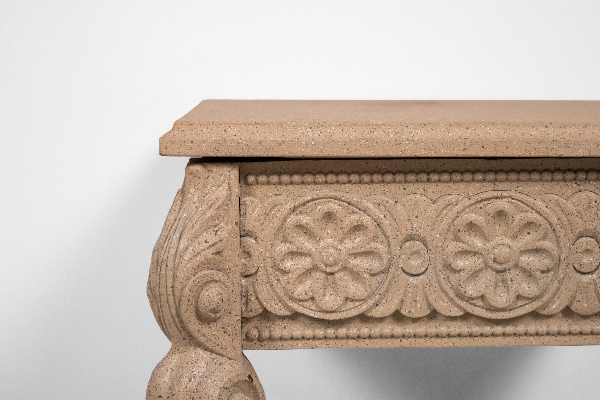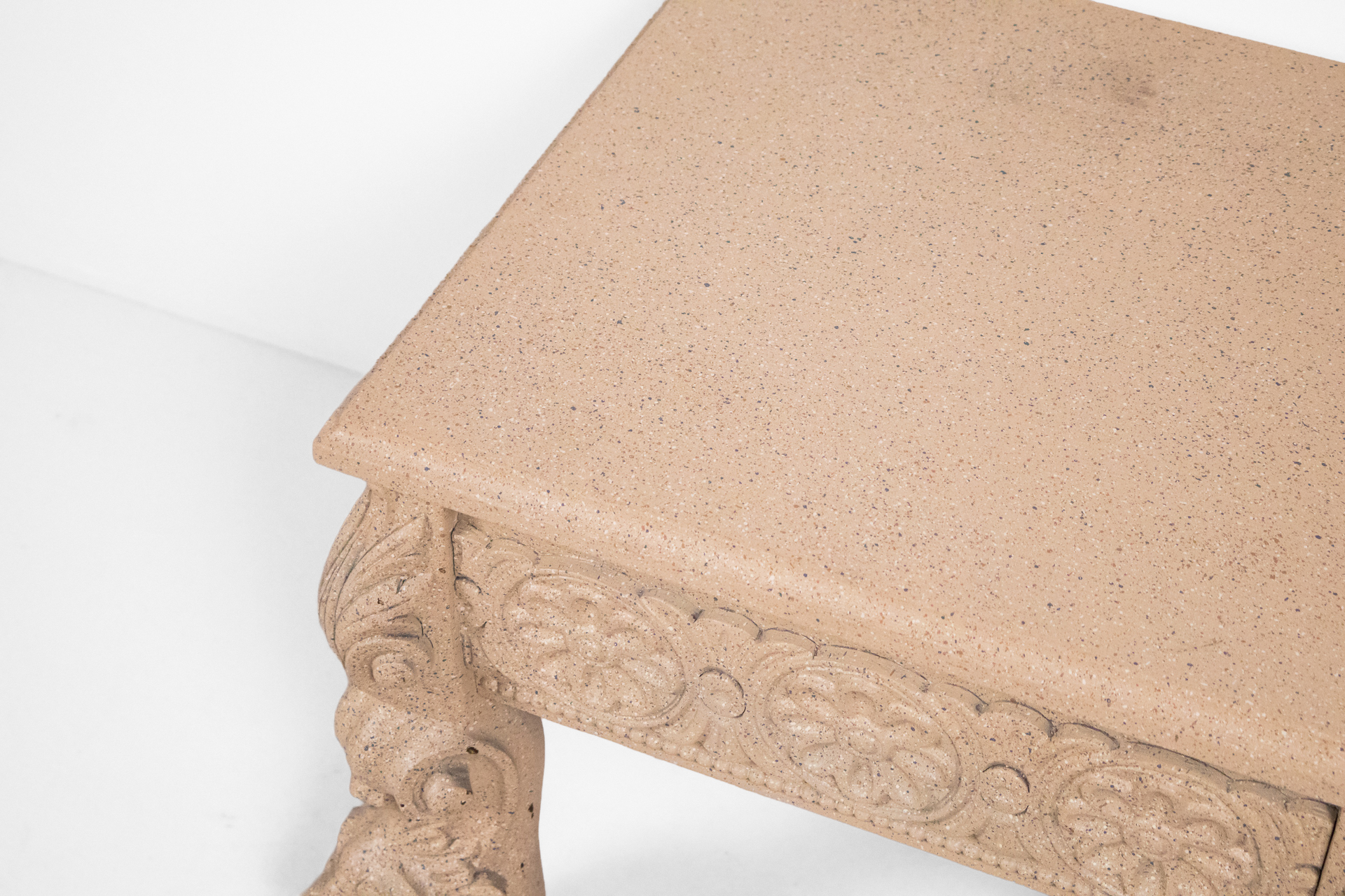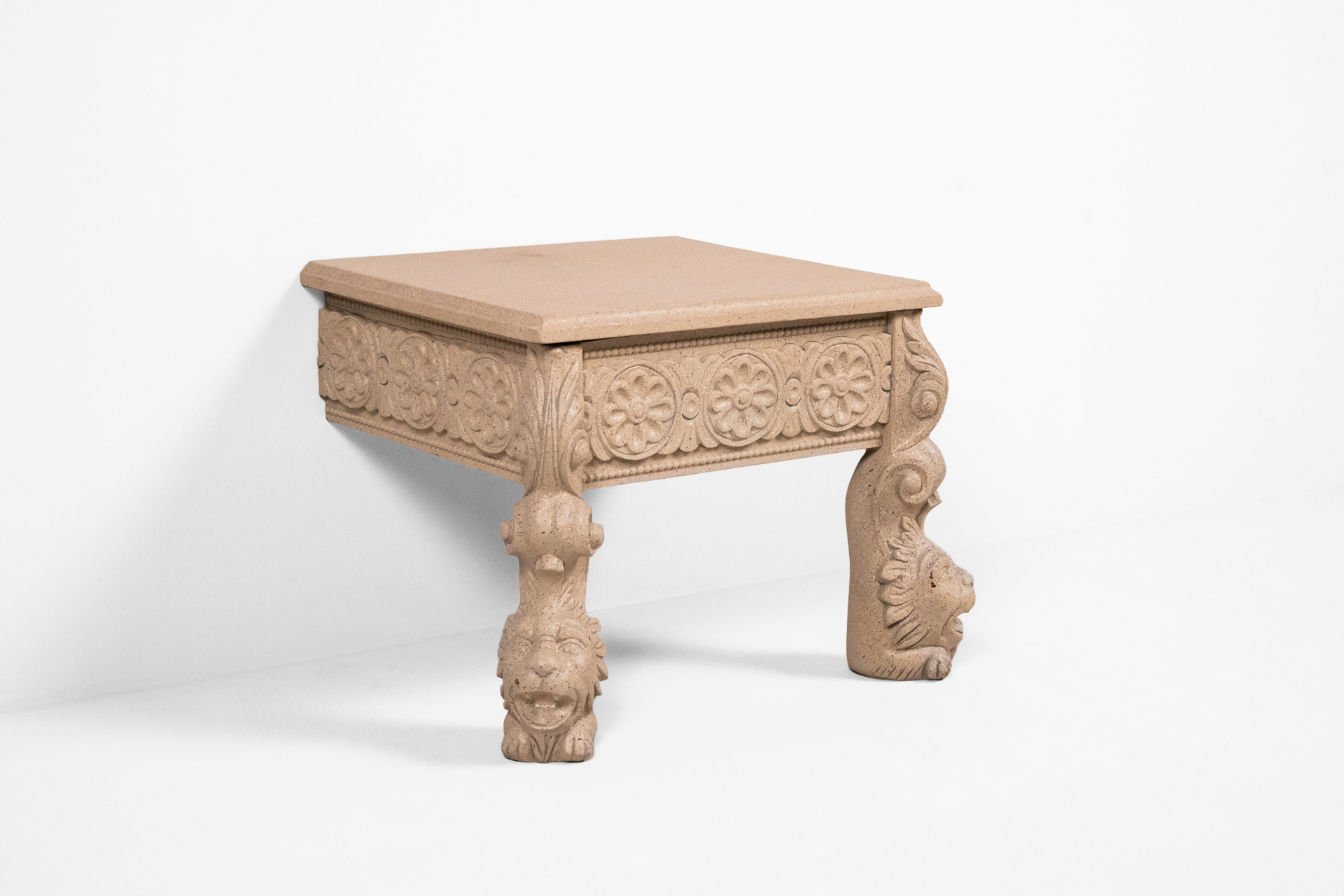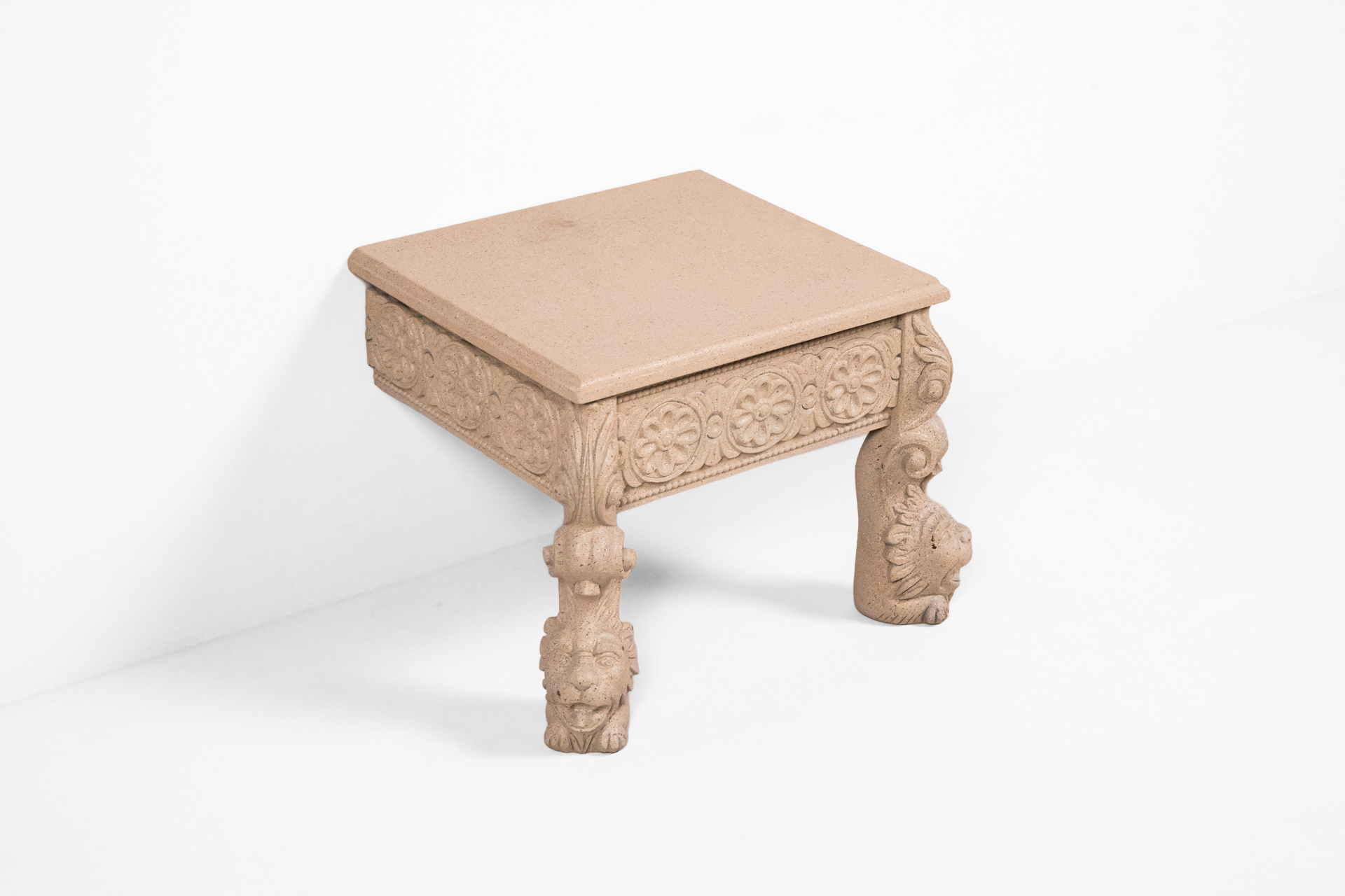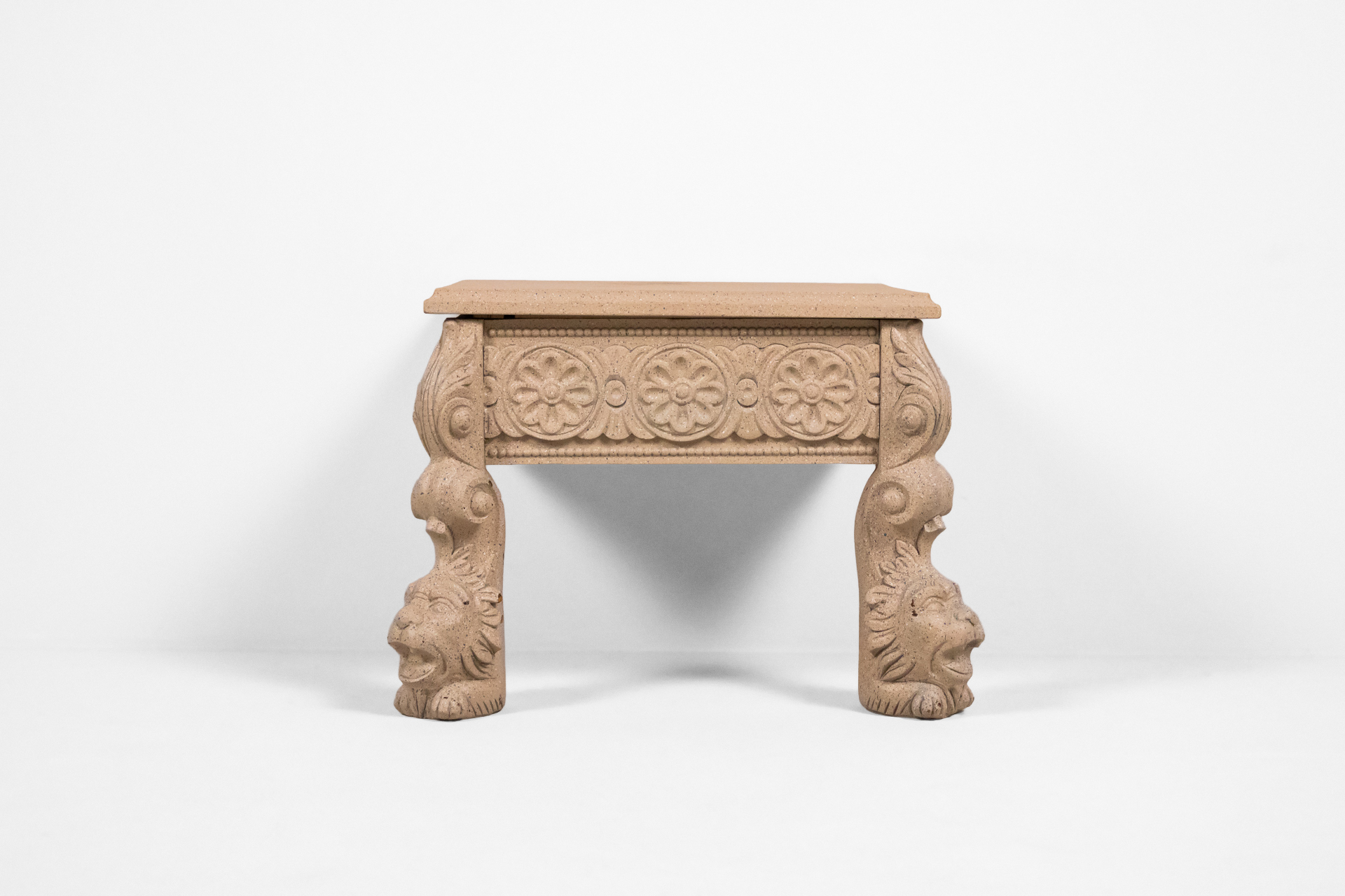 Faragott stílusú oldalsó asztal 002 — 567 Homokkőből készült alacsony asztal faragott oroszlánlábakkal és virágmintás oldalrésszel Méret: 60.0×48.0×42.0 Mennyiség: Összesen 1 db • Elérhető 1 db ♡ 🛒 Kosárba 📄 Adatlap