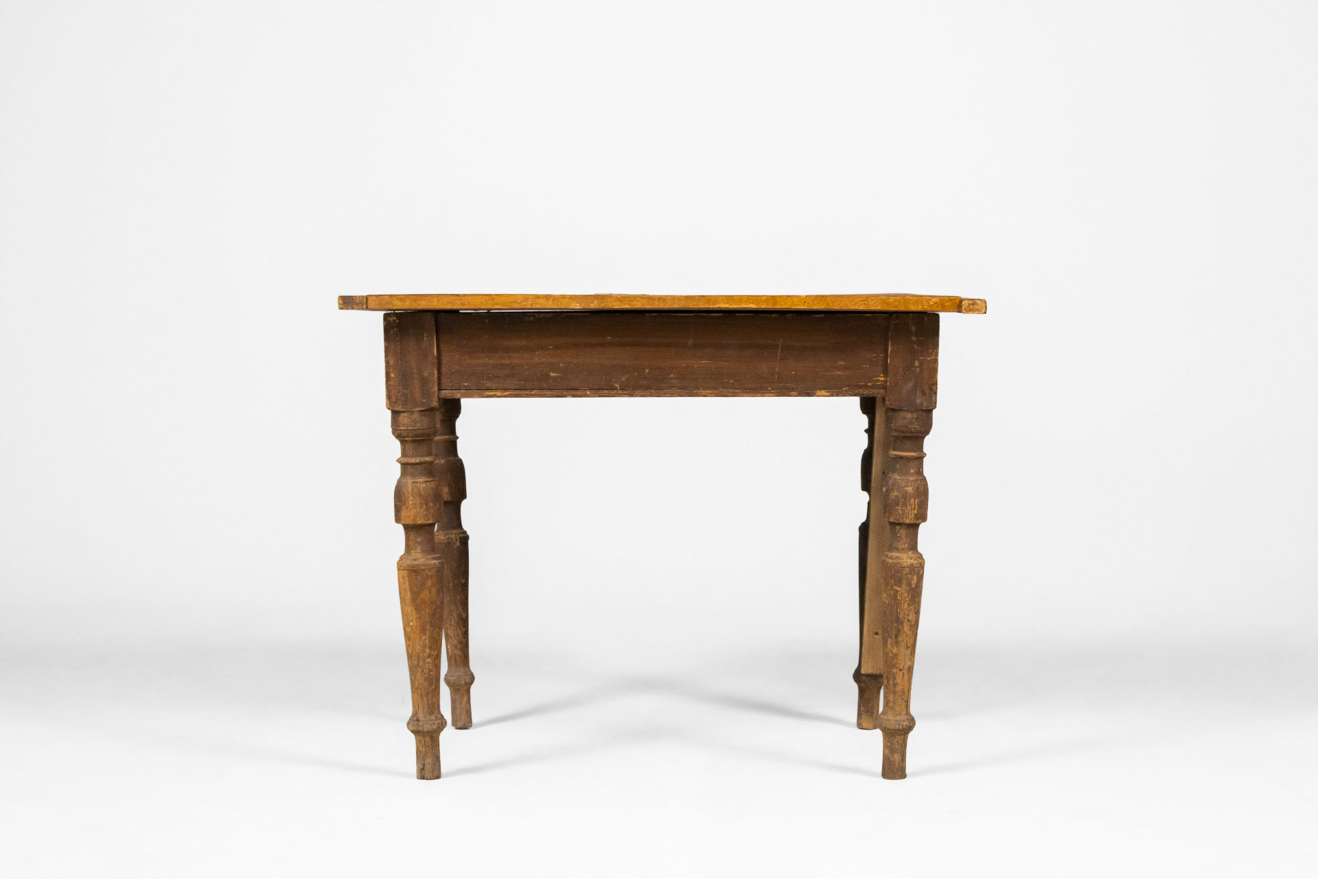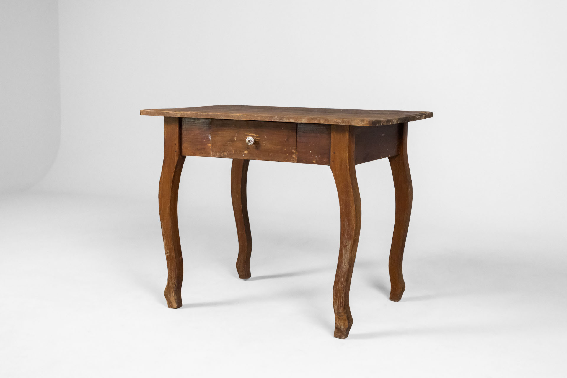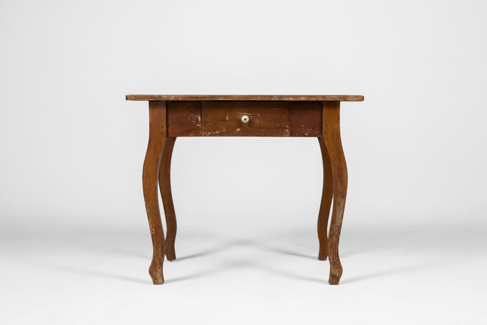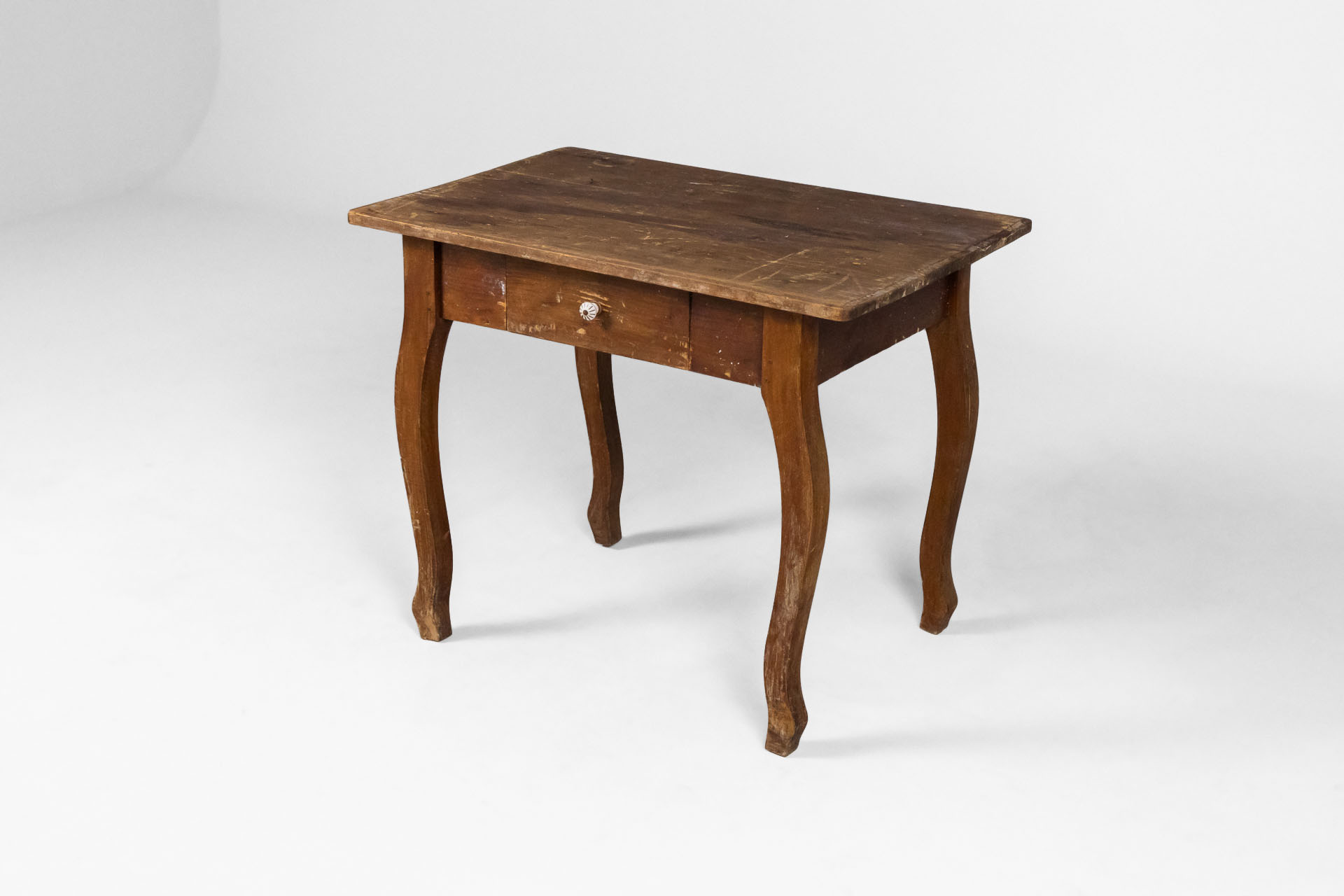 Klasszikus, antik stílusú fiókos asztal, amely elegáns ívelt lábakkal és egyszerű, de karakteres formával rendelkezik. A fiók praktikus tárolási lehetőséget kínál, míg a rusztikus megjelenés időtlen bájt kölcsönöz a térnek