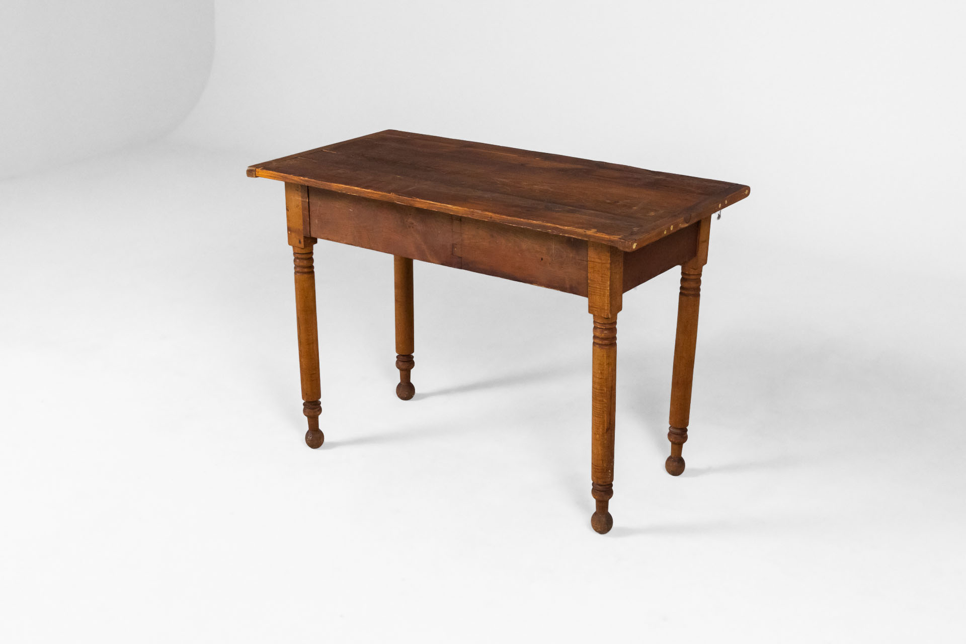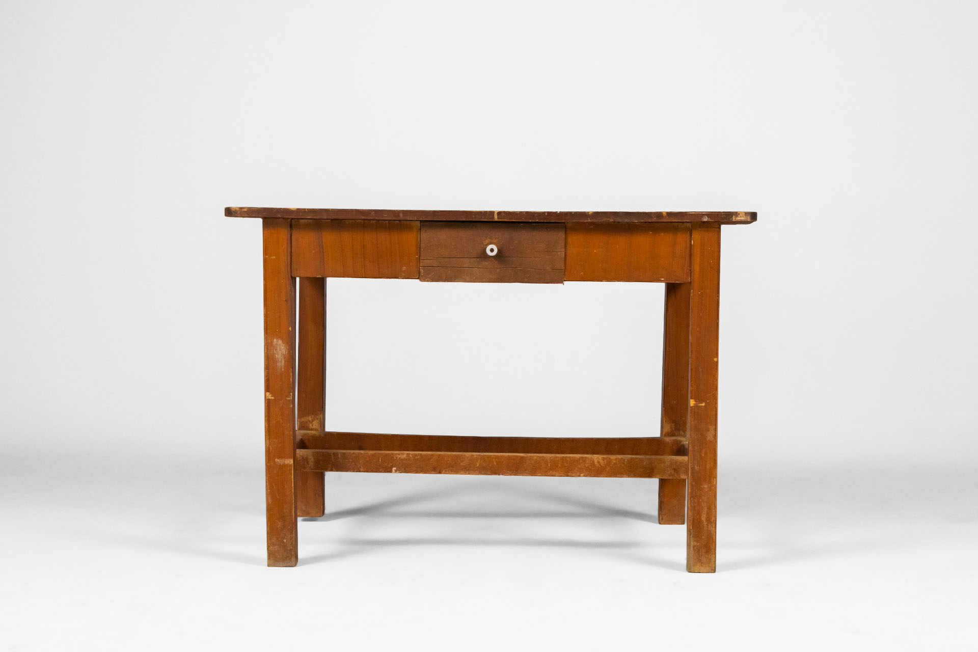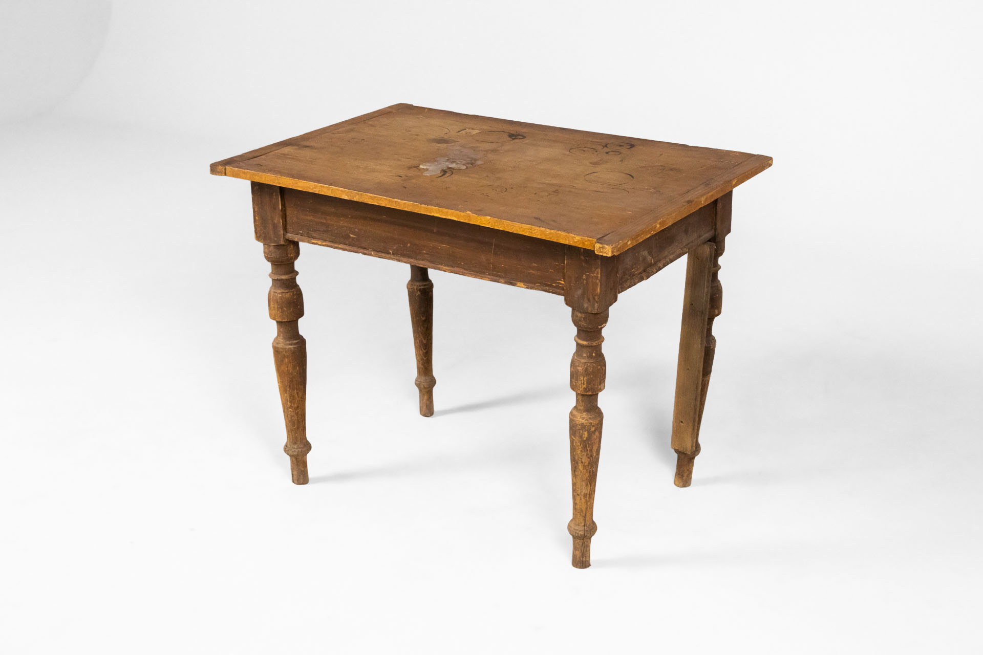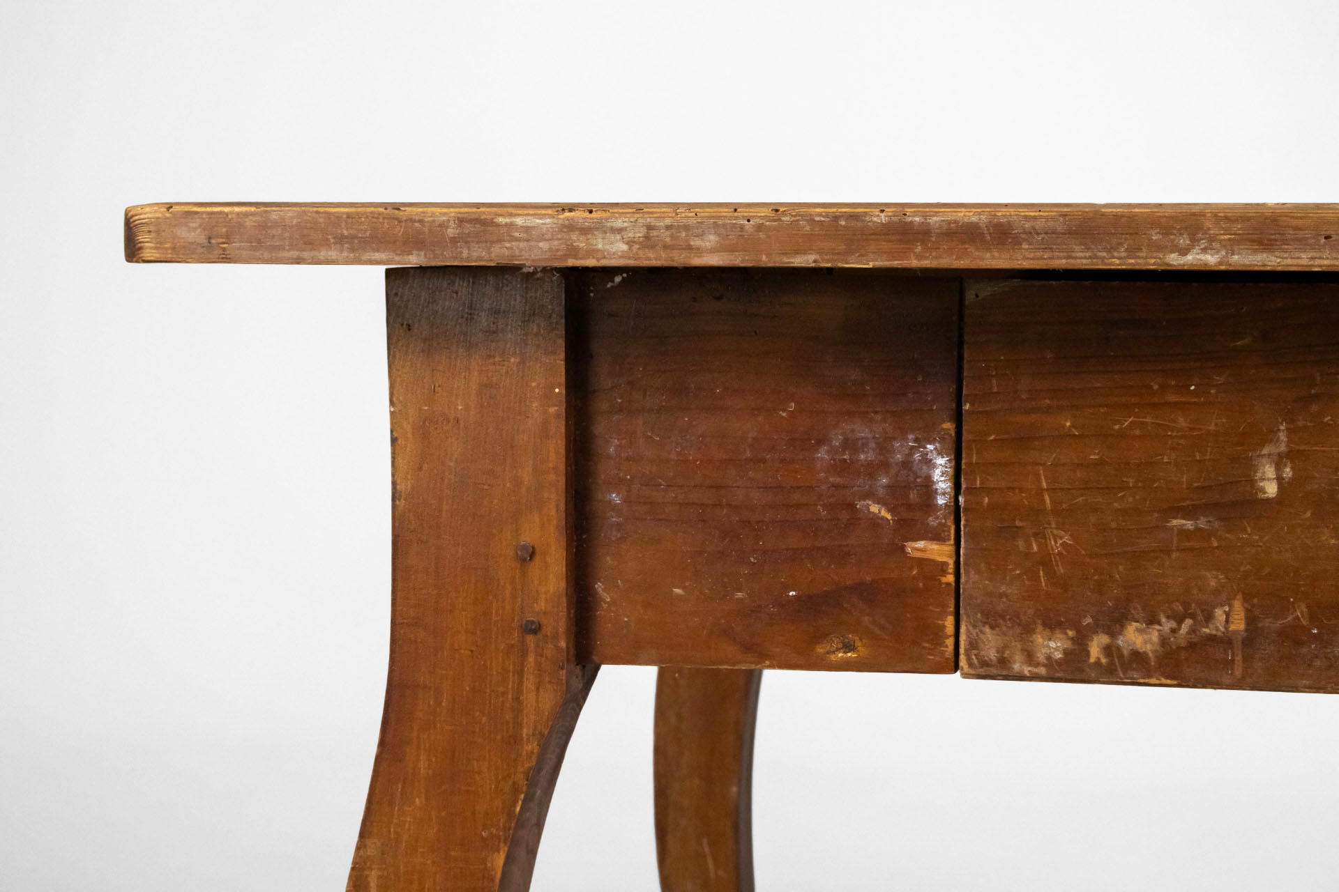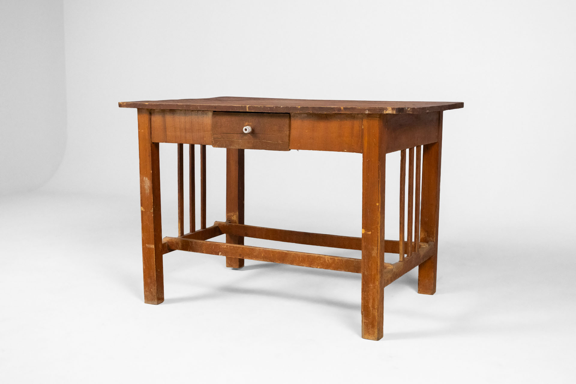 Klasszikus, antik stílusú fiókos asztal, amely elegáns ívelt lábakkal és egyszerű, de karakteres formával rendelkezik. A fiók praktikus tárolási lehetőséget kínál, míg a rusztikus megjelenés időtlen bájt kölcsönöz a térnek
