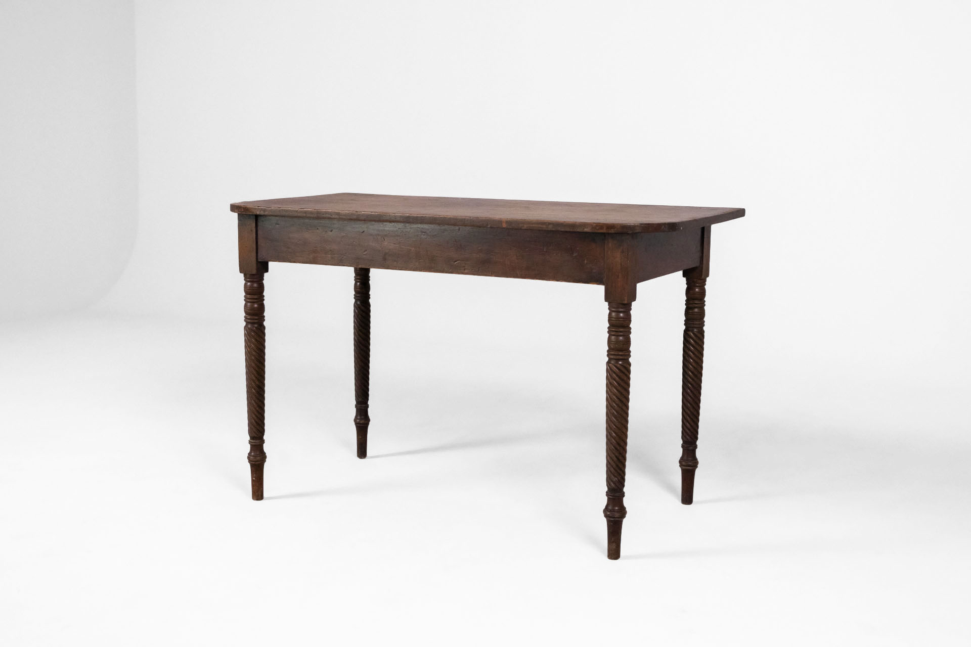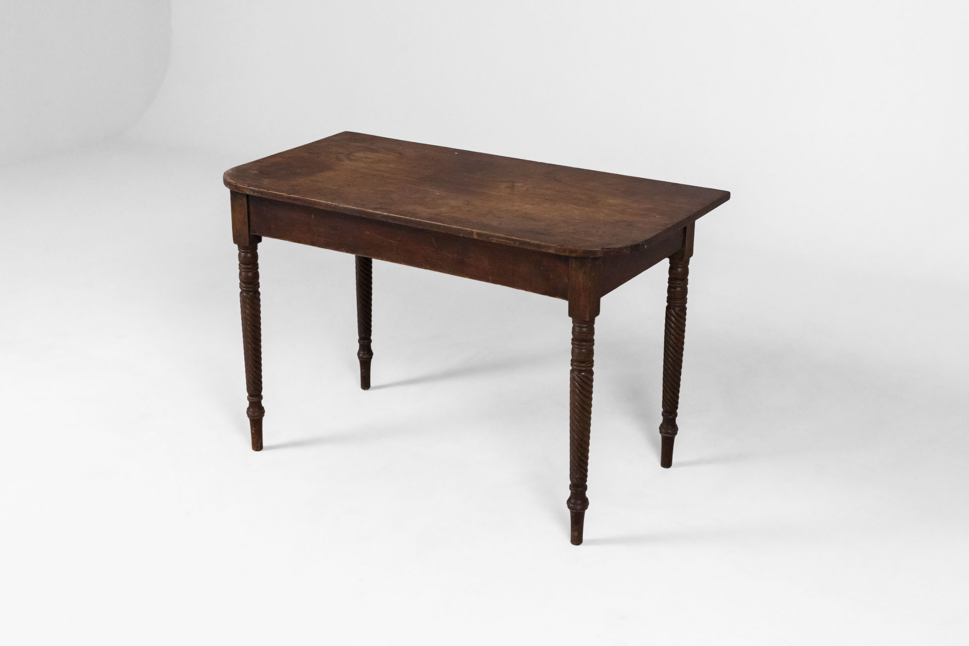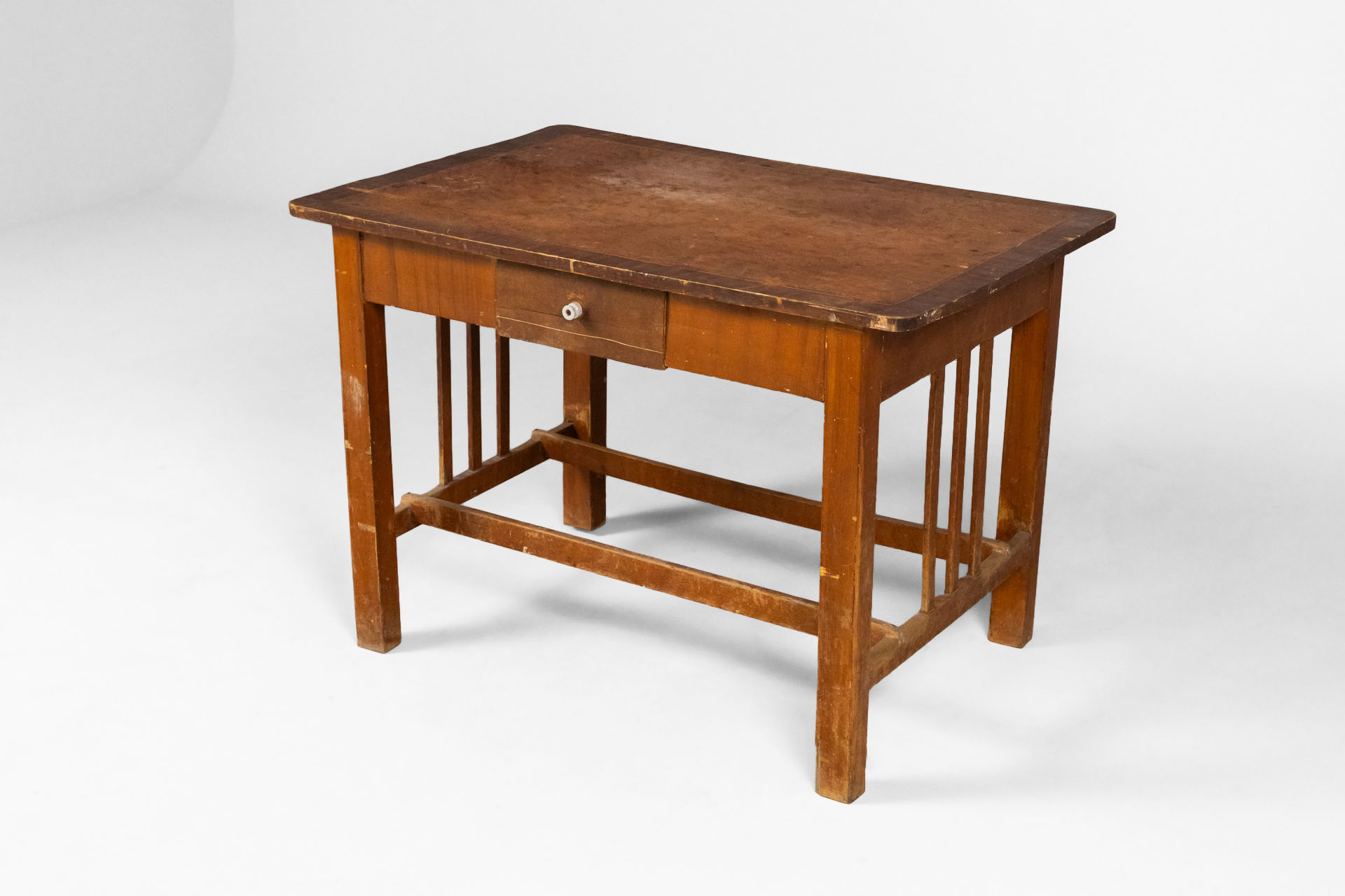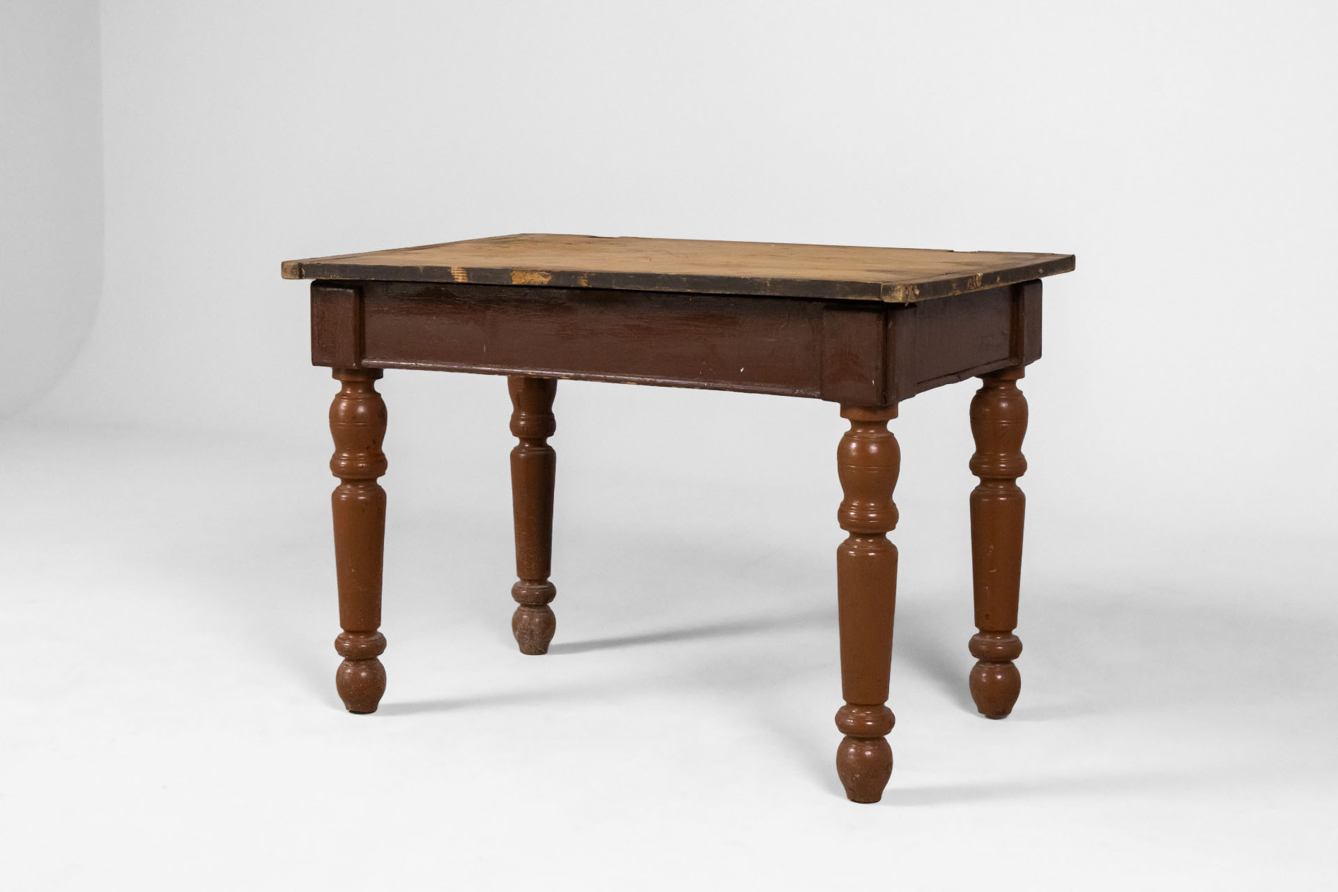 Klasszikus, antik stílusú fiókos asztal, amely elegáns ívelt lábakkal és egyszerű, de karakteres formával rendelkezik. A fiók praktikus tárolási lehetőséget kínál, míg a rusztikus megjelenés időtlen bájt kölcsönöz a térnek
