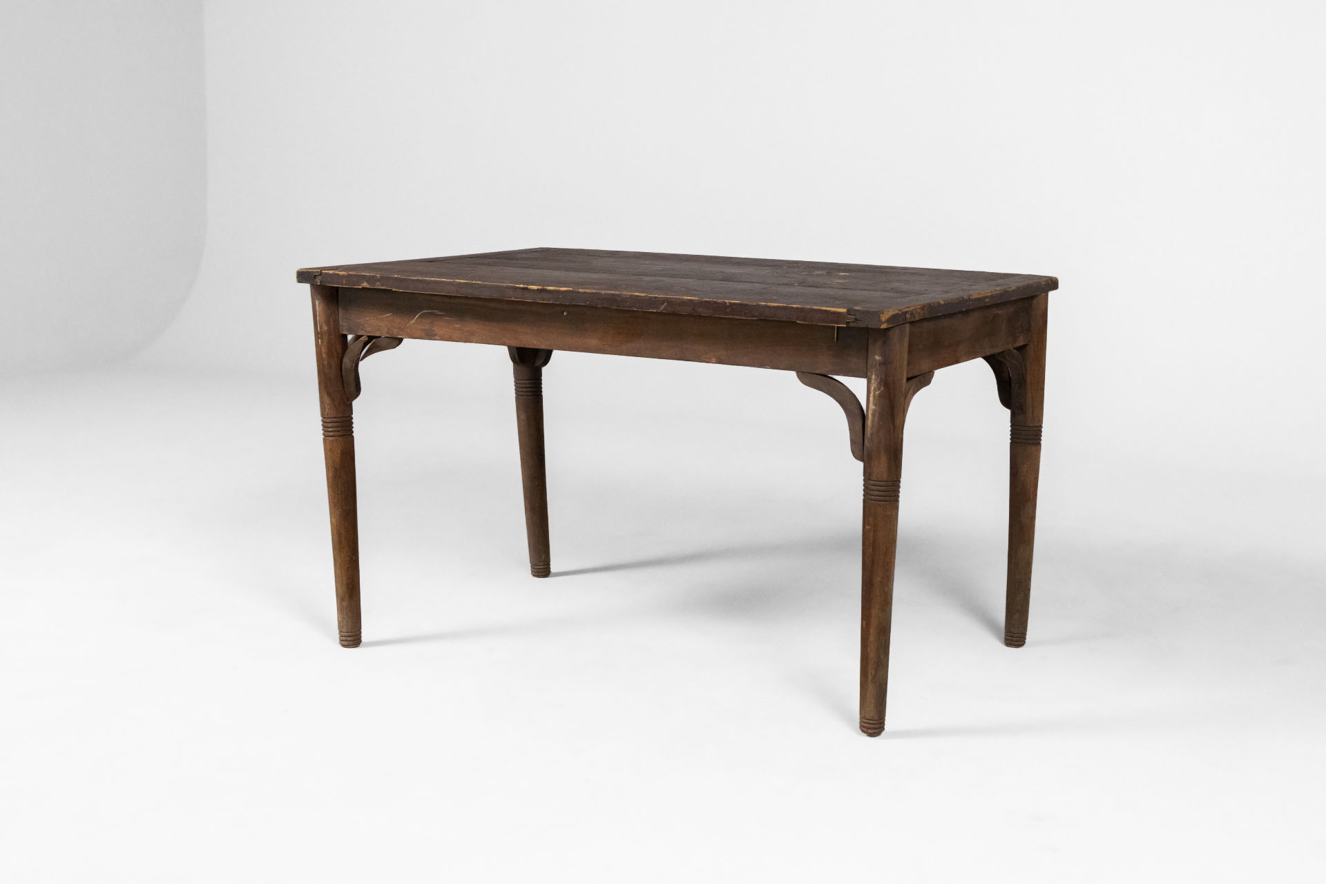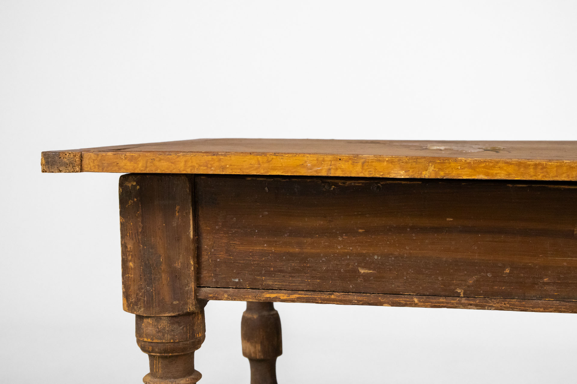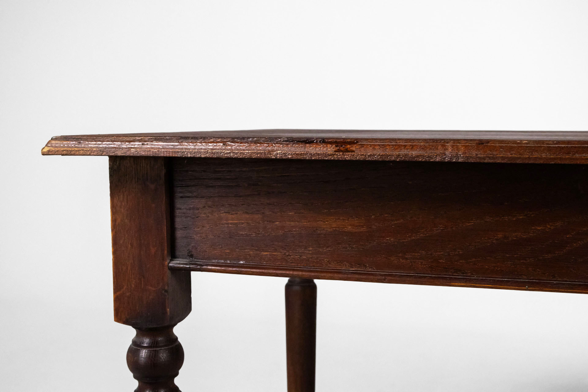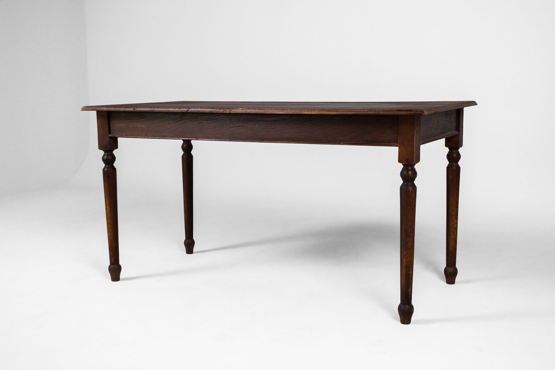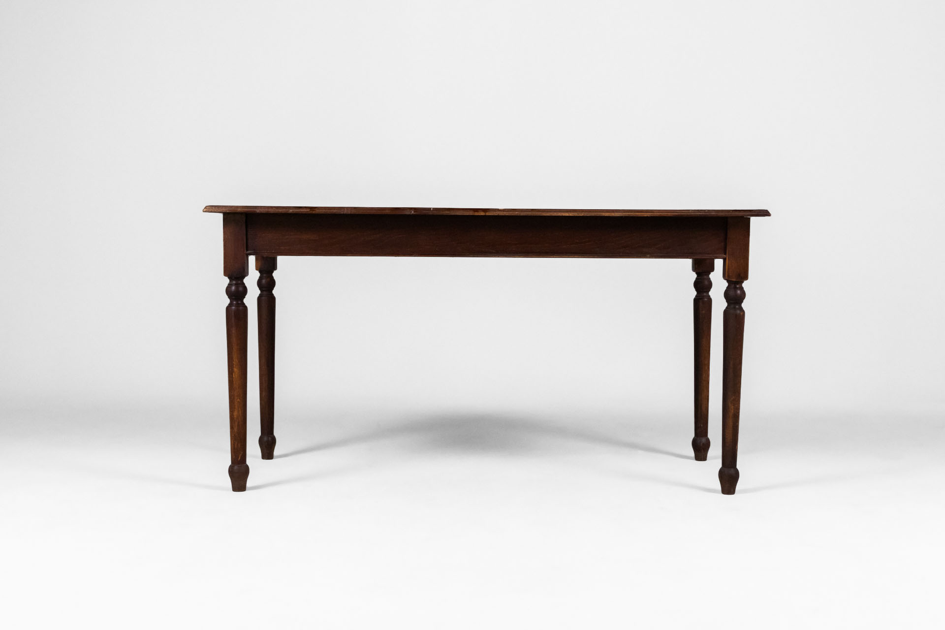 Masszív, vintage stílusú, téglalap alakú asztal rusztikus megjelenéssel. Az asztal felülete enyhén kopott, ami a használat nyomait tükrözi
