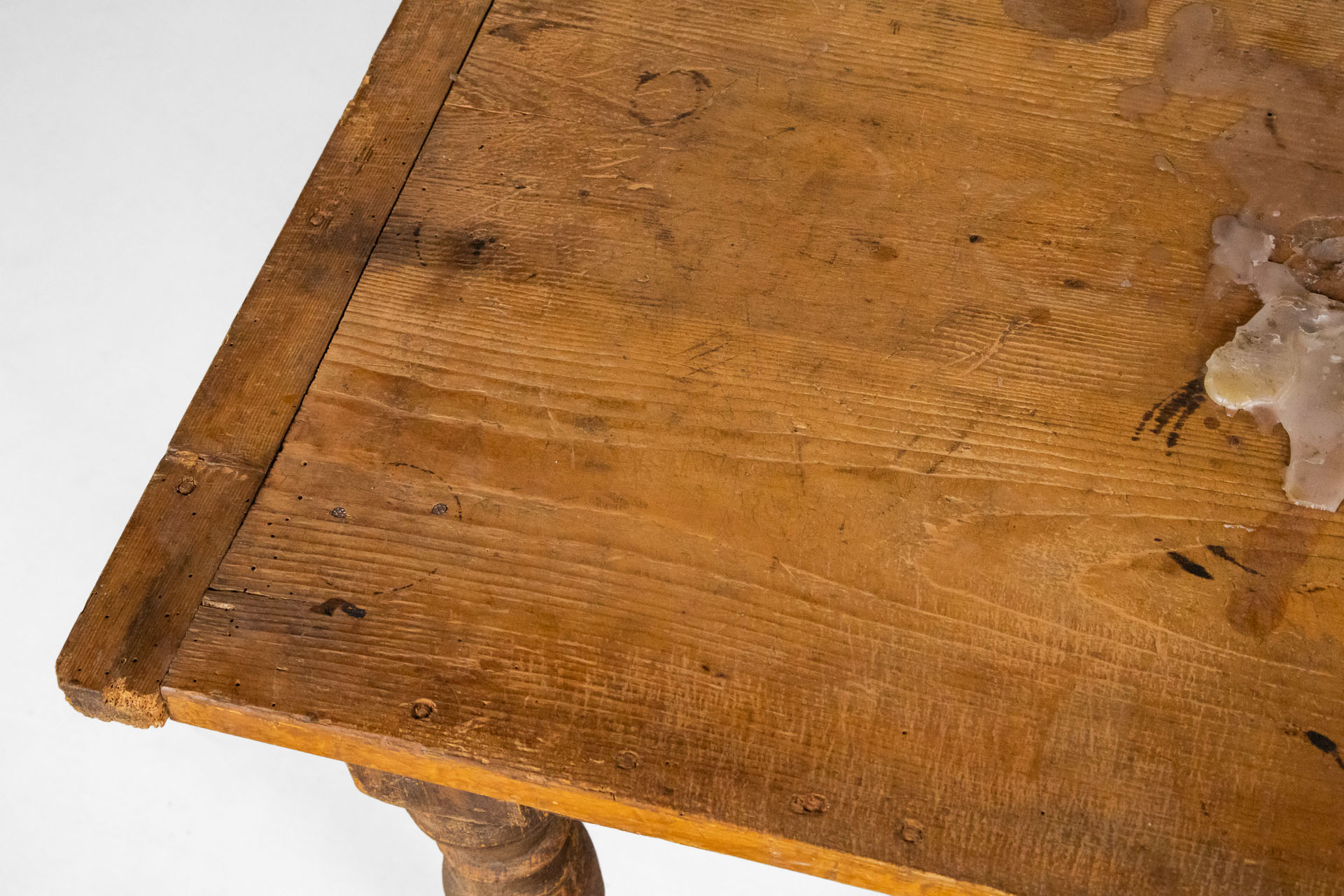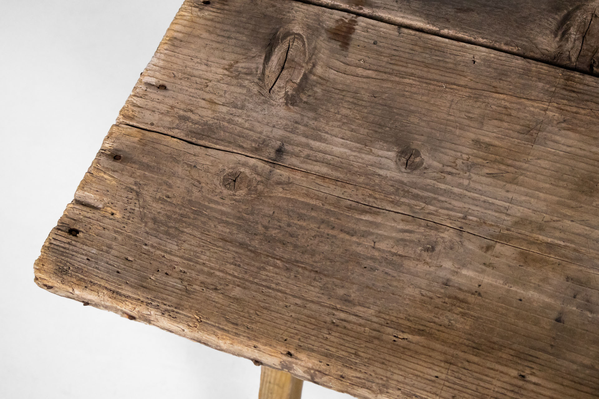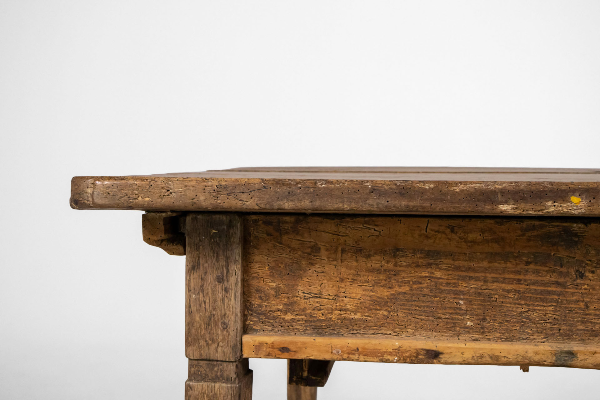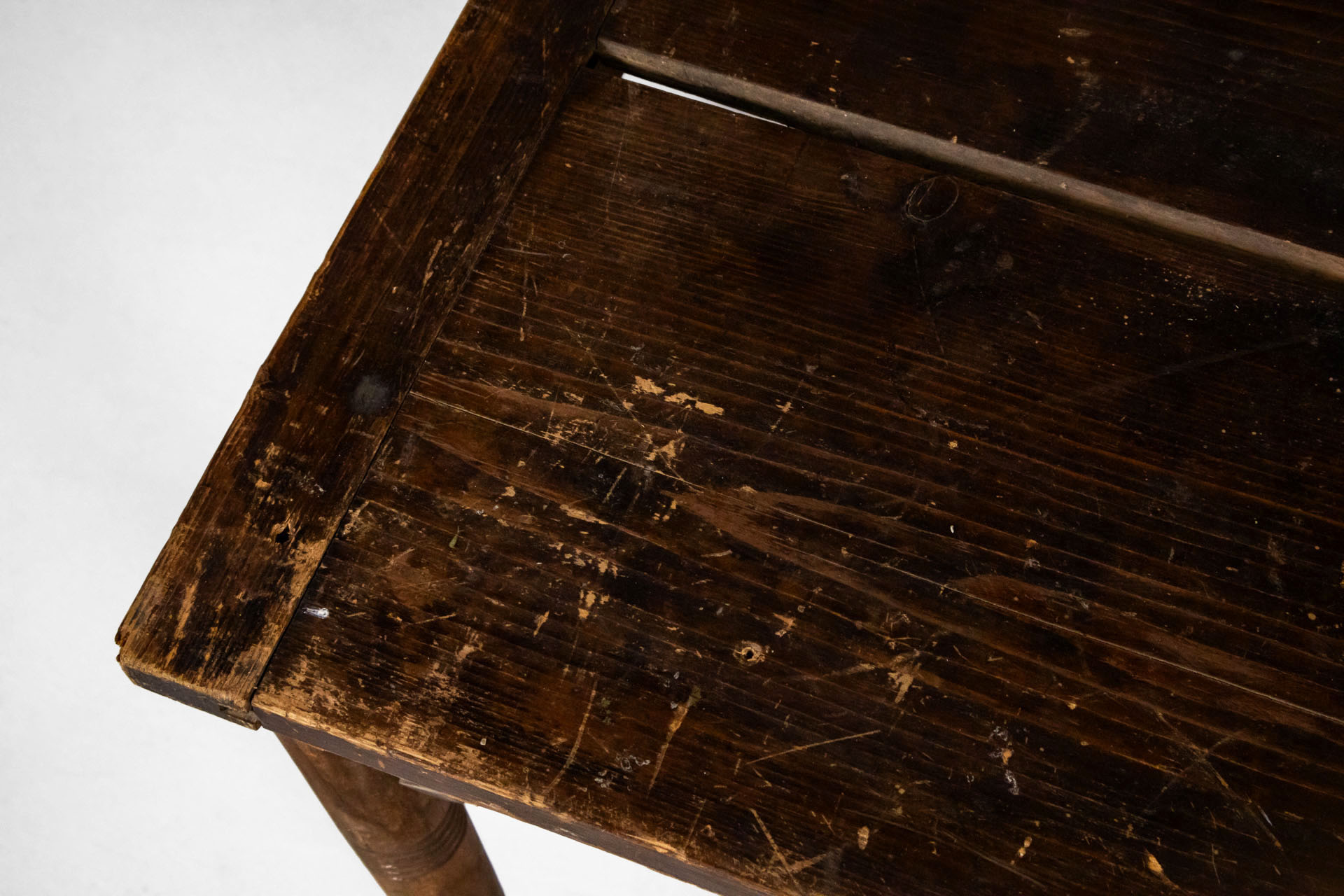 Masszív, vintage stílusú, téglalap alakú asztal rusztikus megjelenéssel. Az asztal felülete enyhén kopott, ami a használat nyomait tükrözi