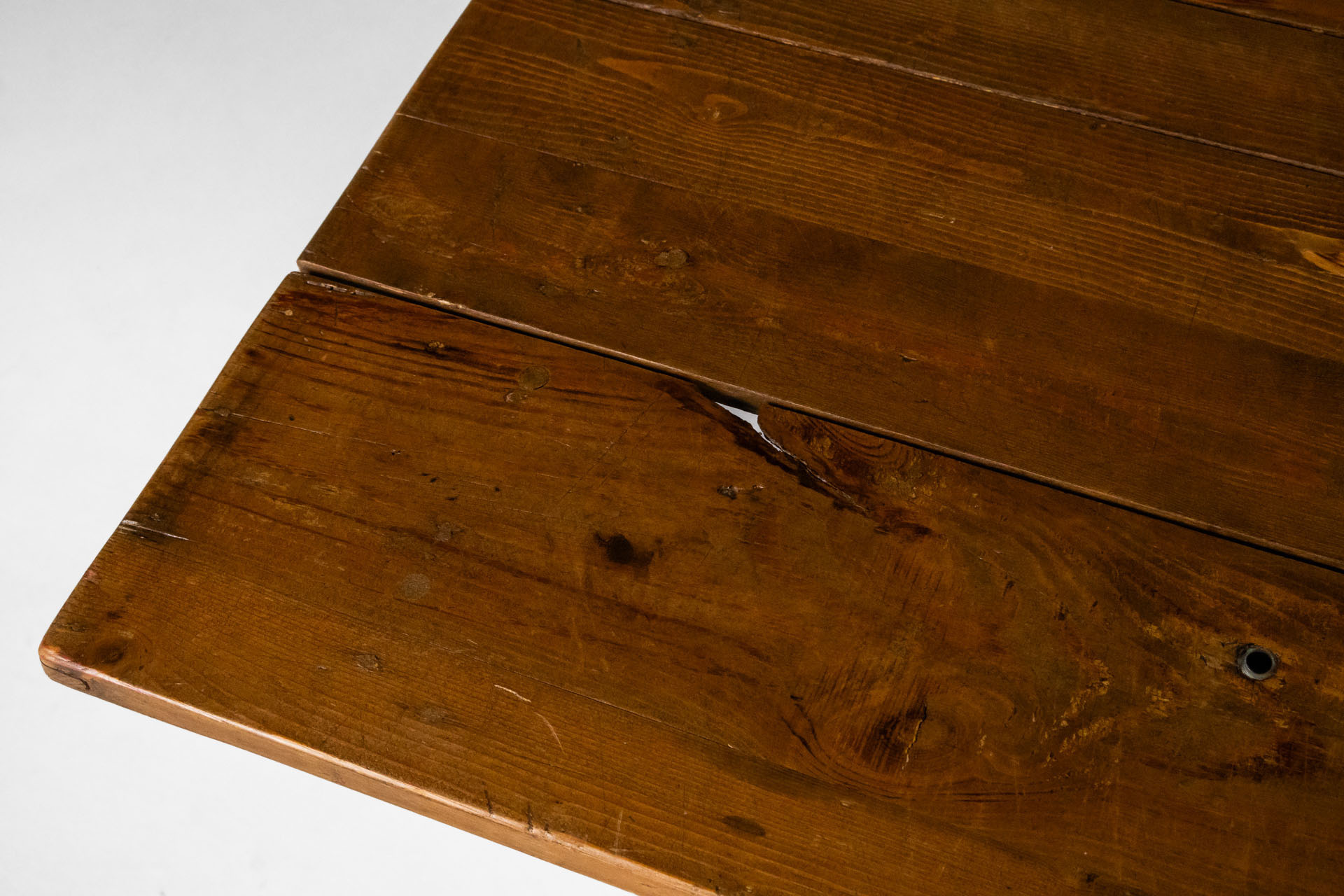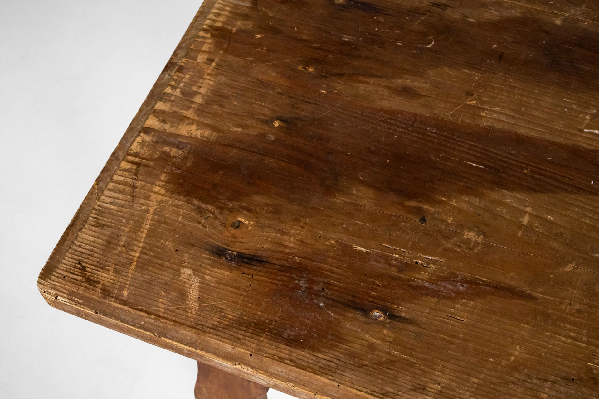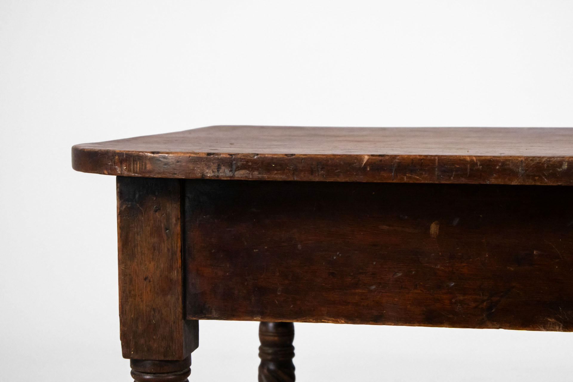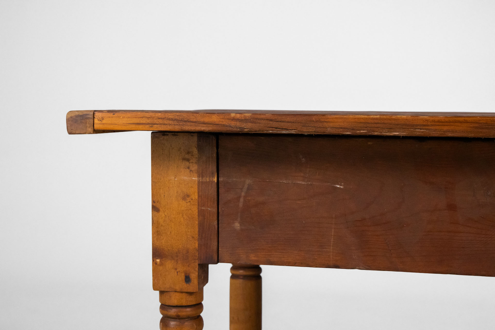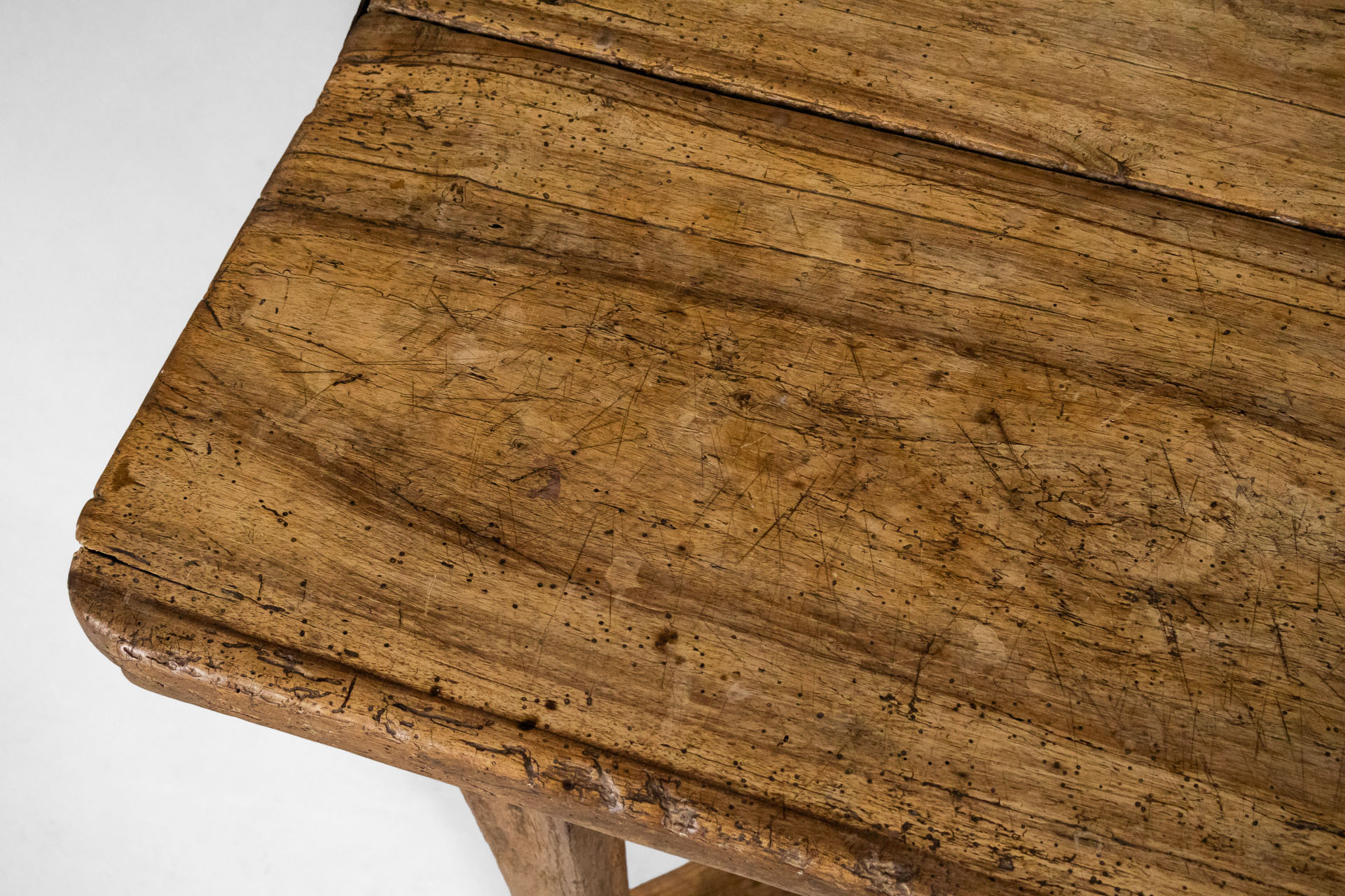 Masszív, vintage stílusú, téglalap alakú asztal rusztikus megjelenéssel. Az asztal felülete enyhén kopott, ami a használat nyomait tükrözi