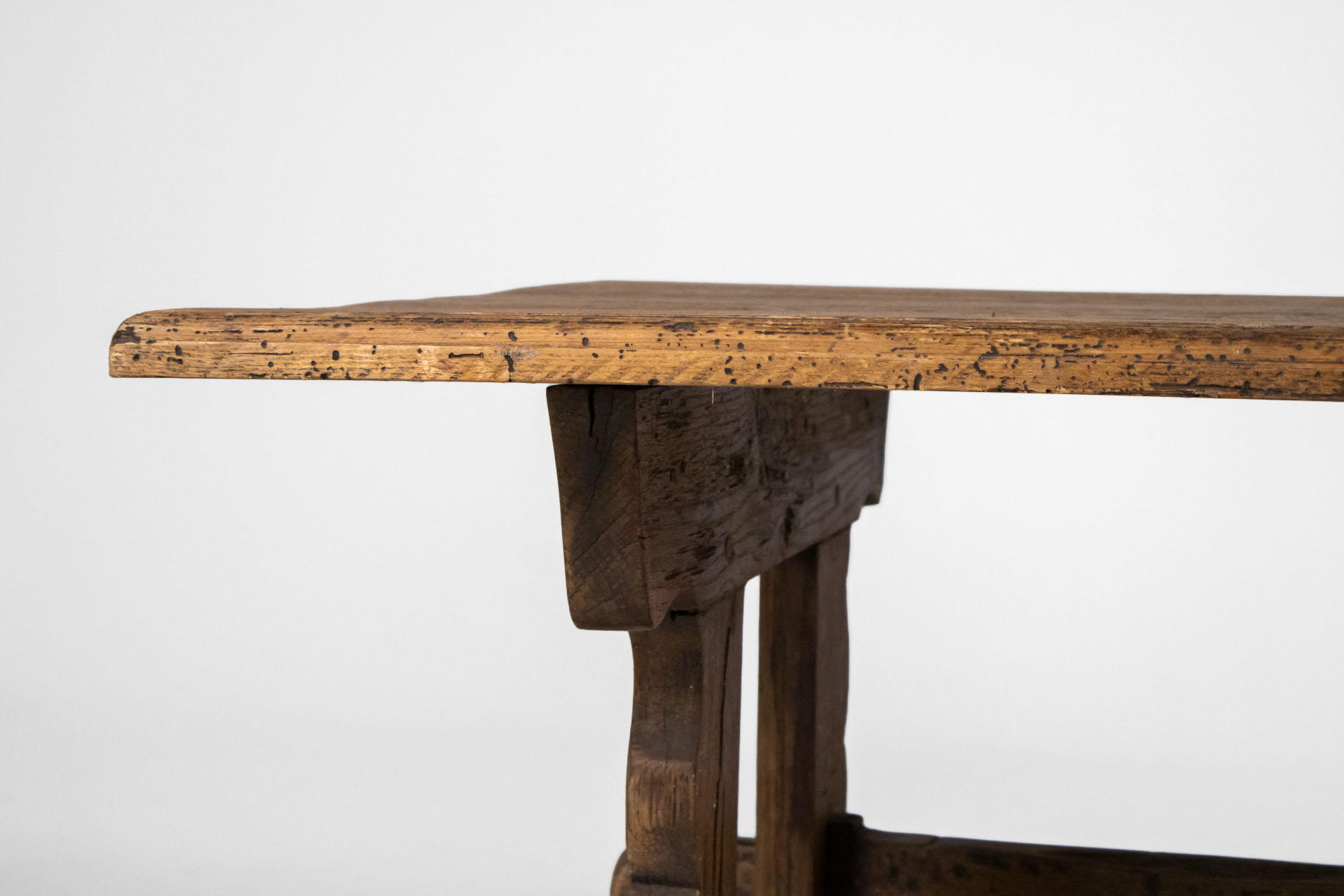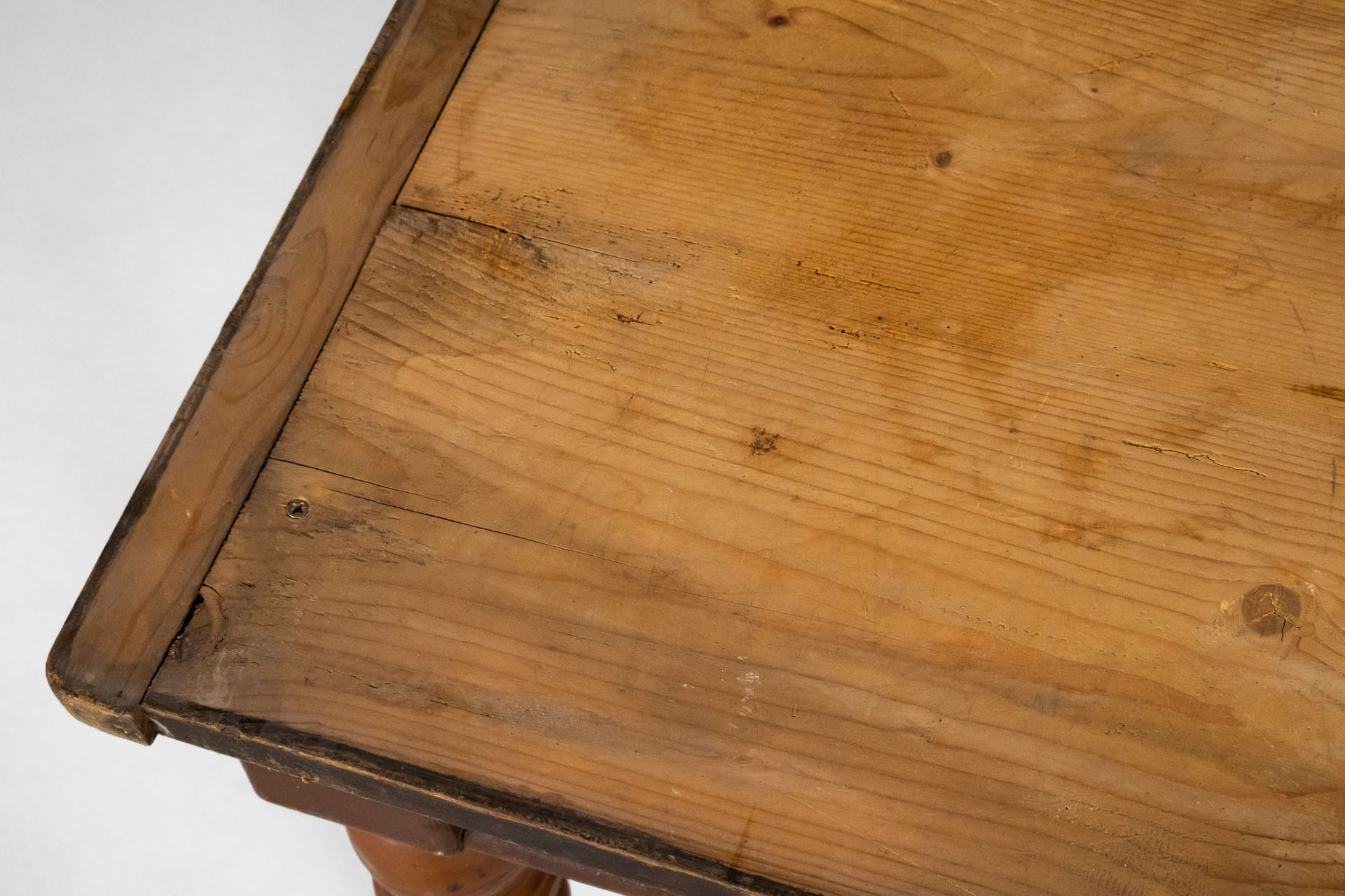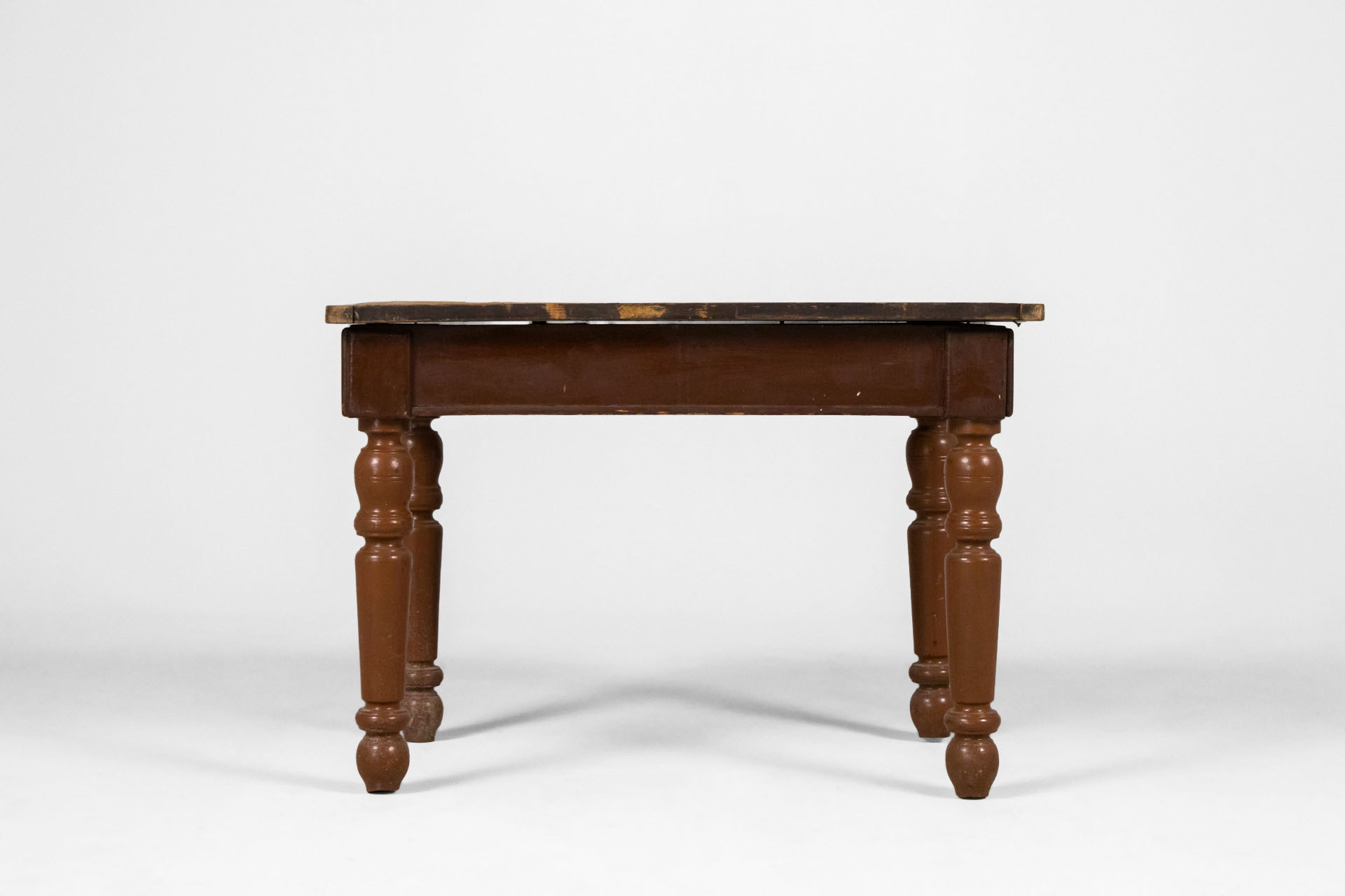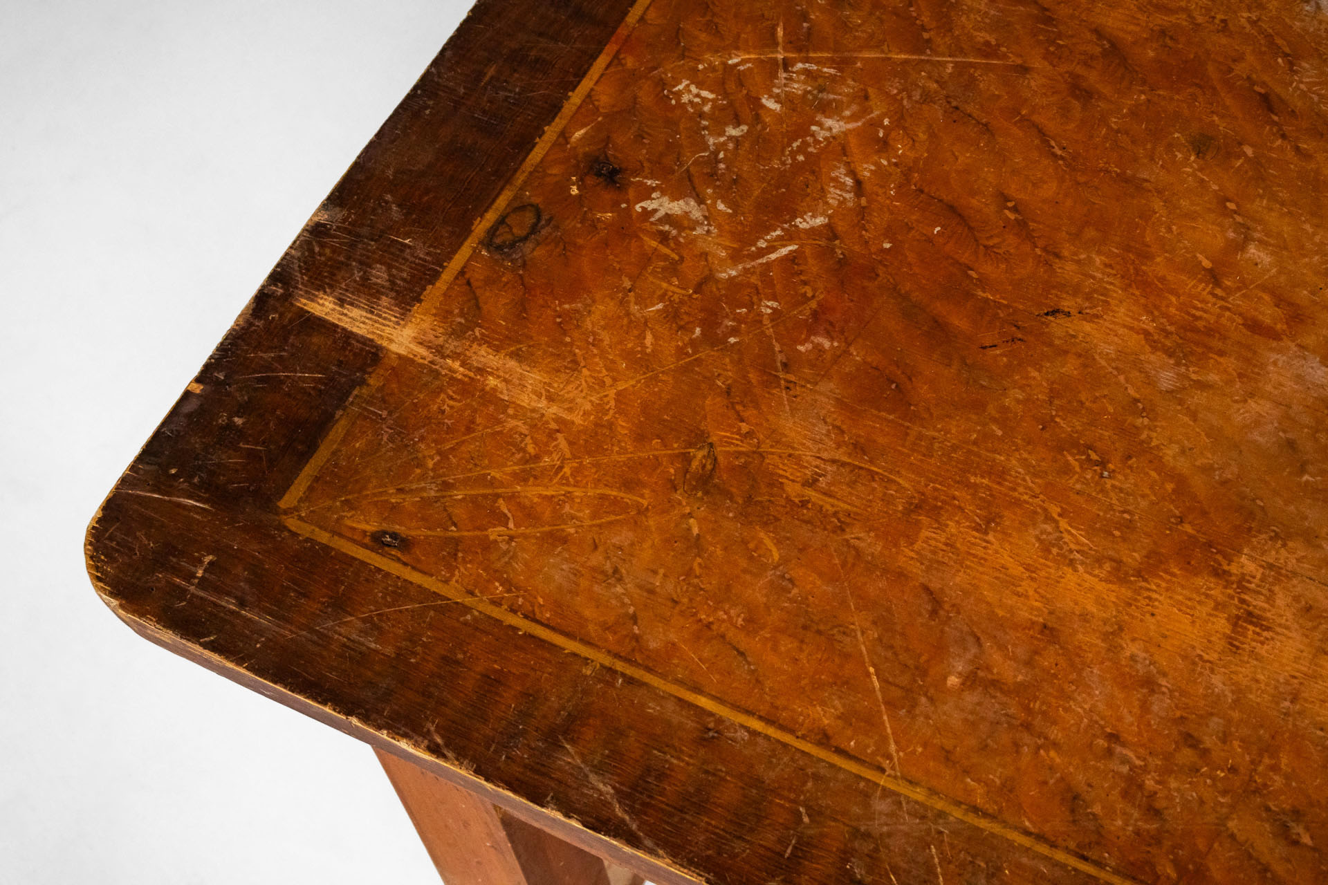 Masszív, vintage stílusú, téglalap alakú asztal rusztikus megjelenéssel. Az asztal felülete enyhén kopott, ami a használat nyomait tükrözi