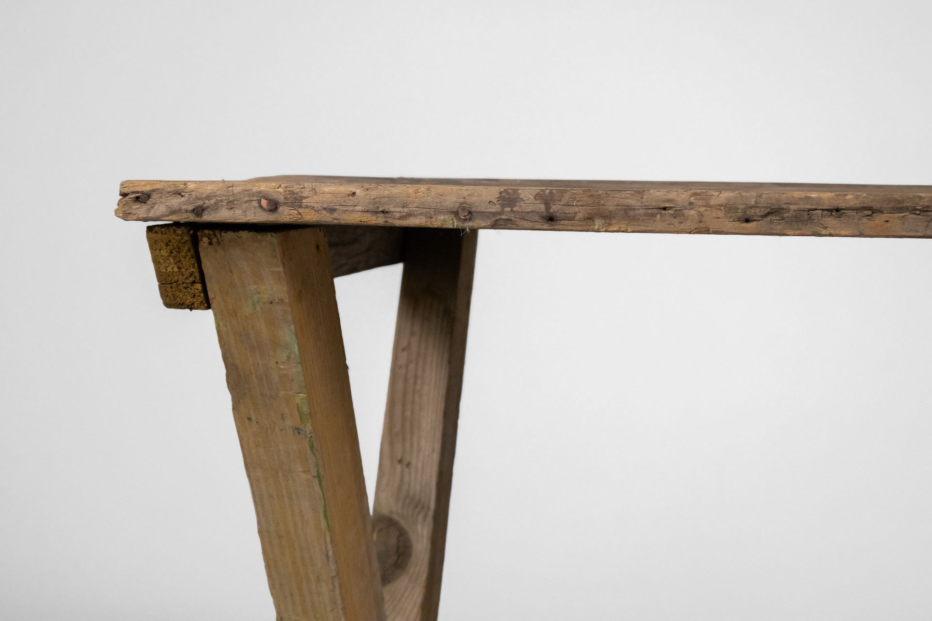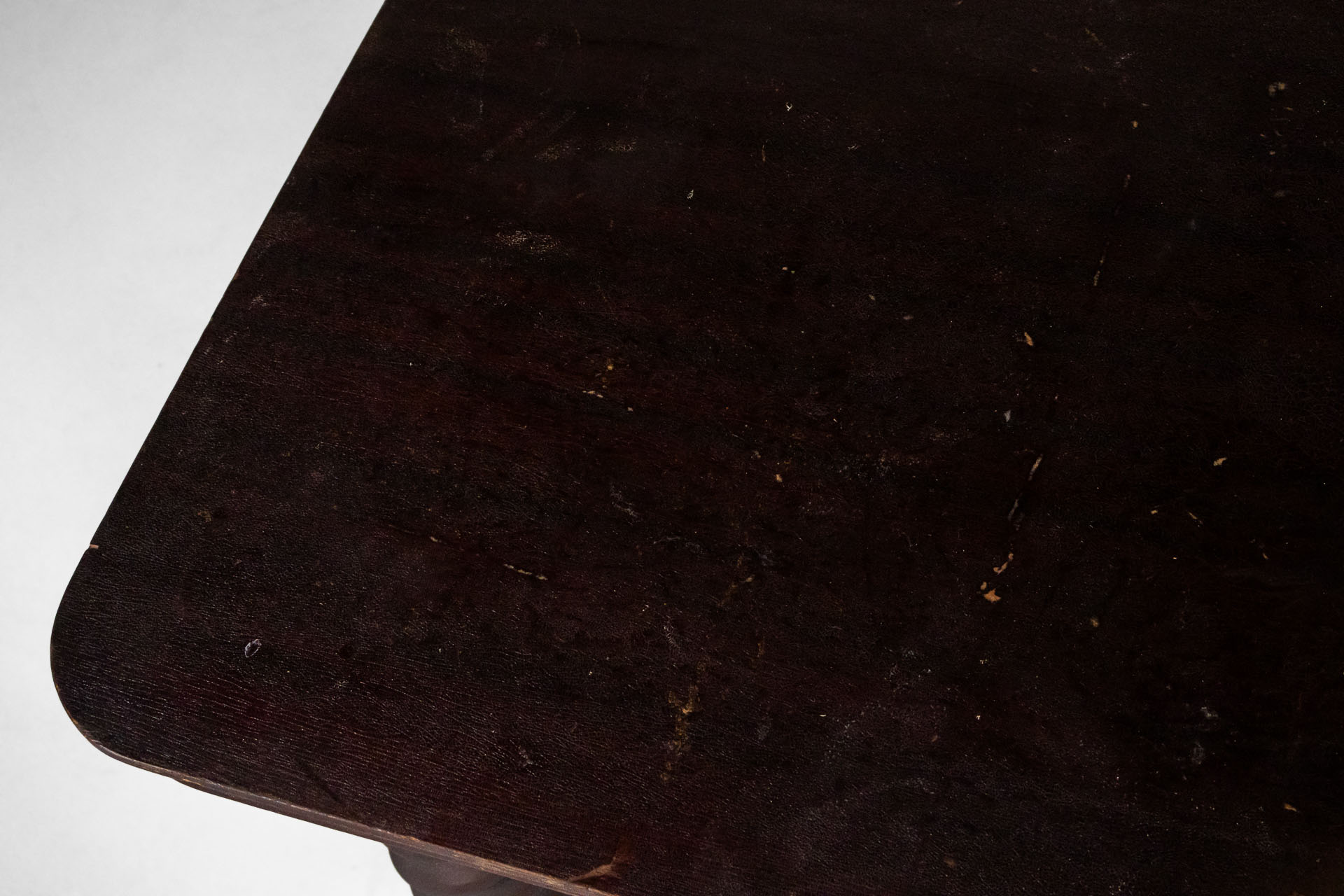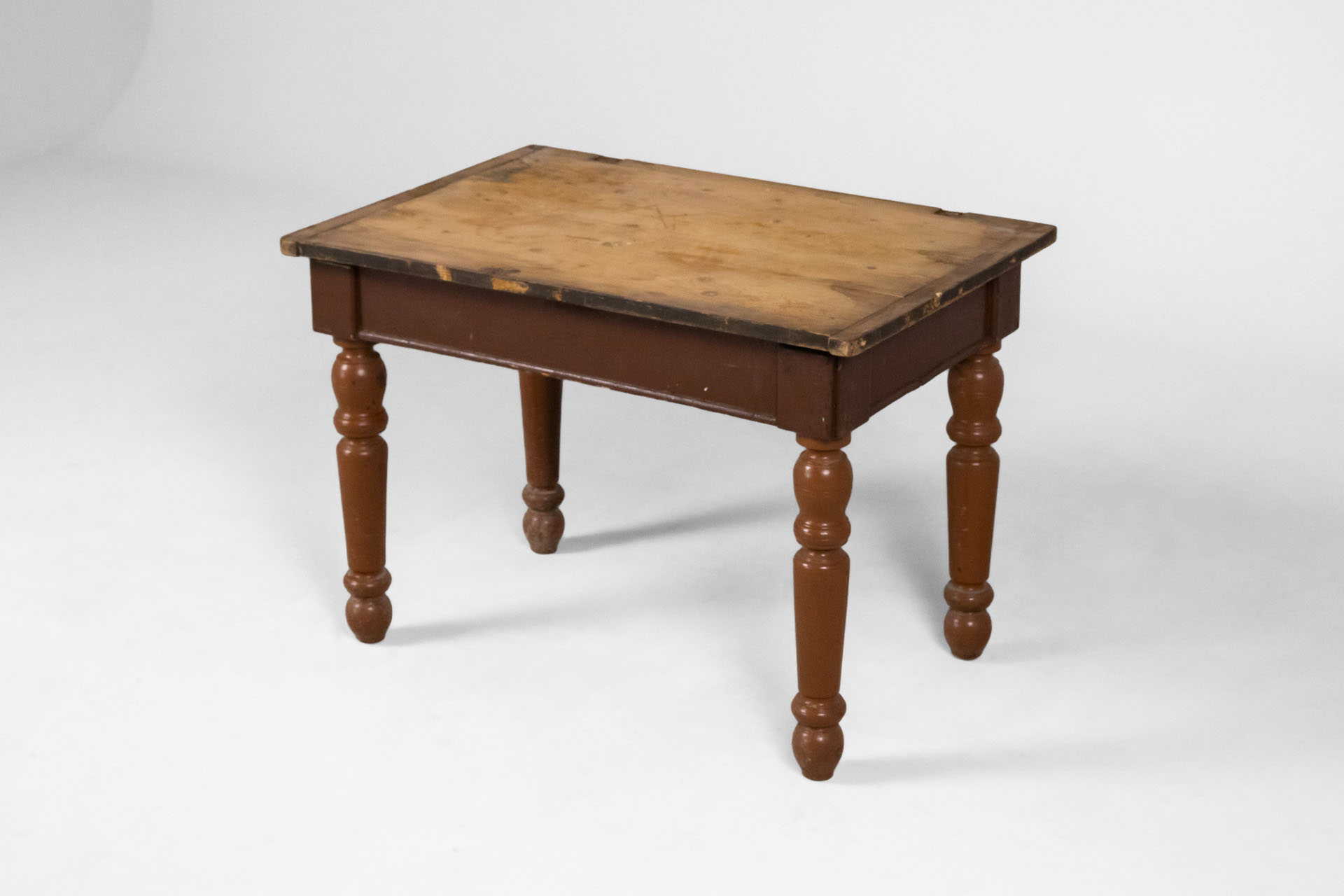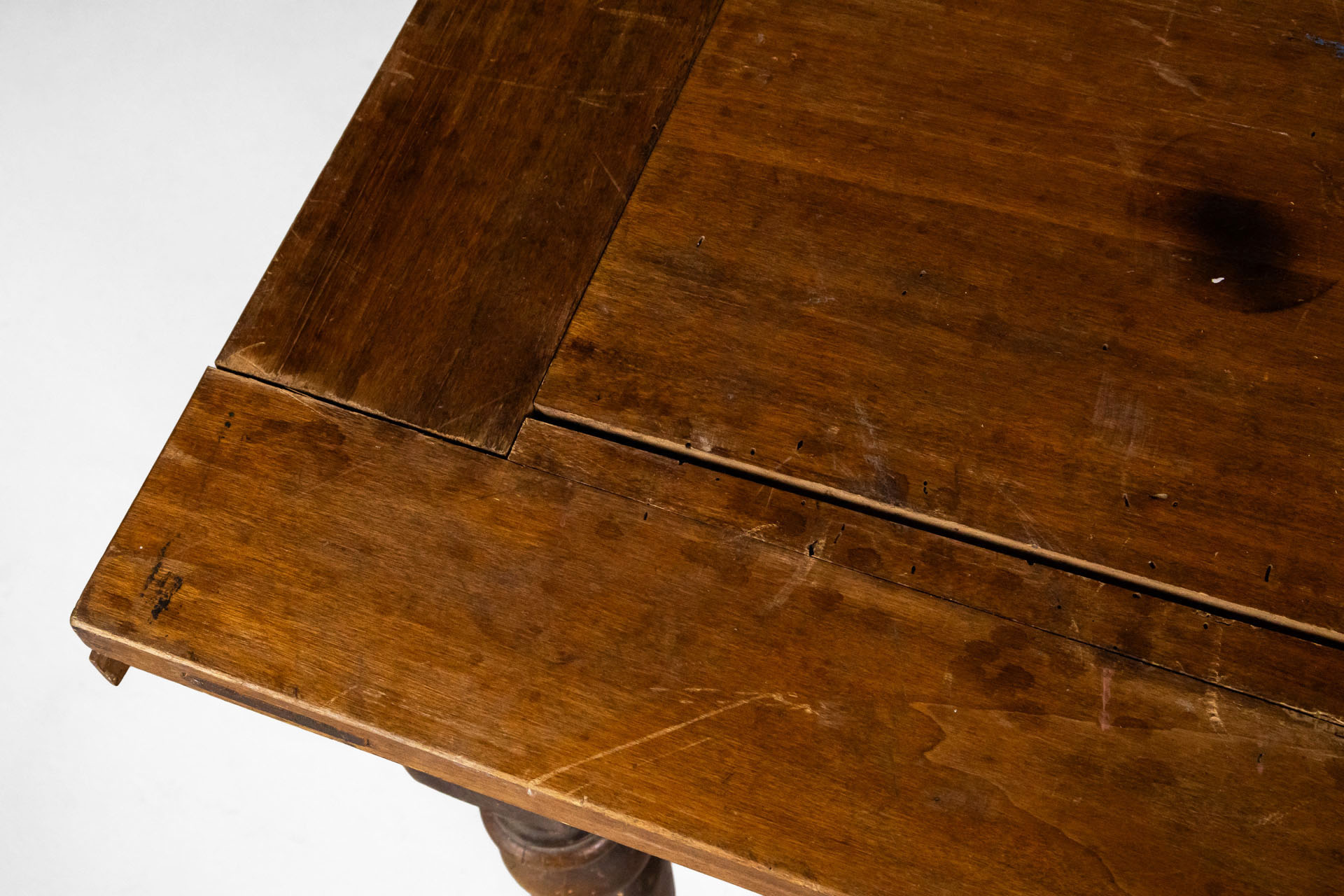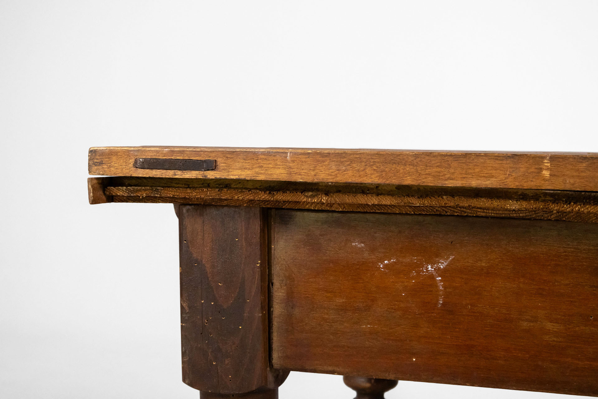 Masszív, vintage stílusú, téglalap alakú asztal rusztikus megjelenéssel. Az asztal felülete enyhén kopott, ami a használat nyomait tükrözi