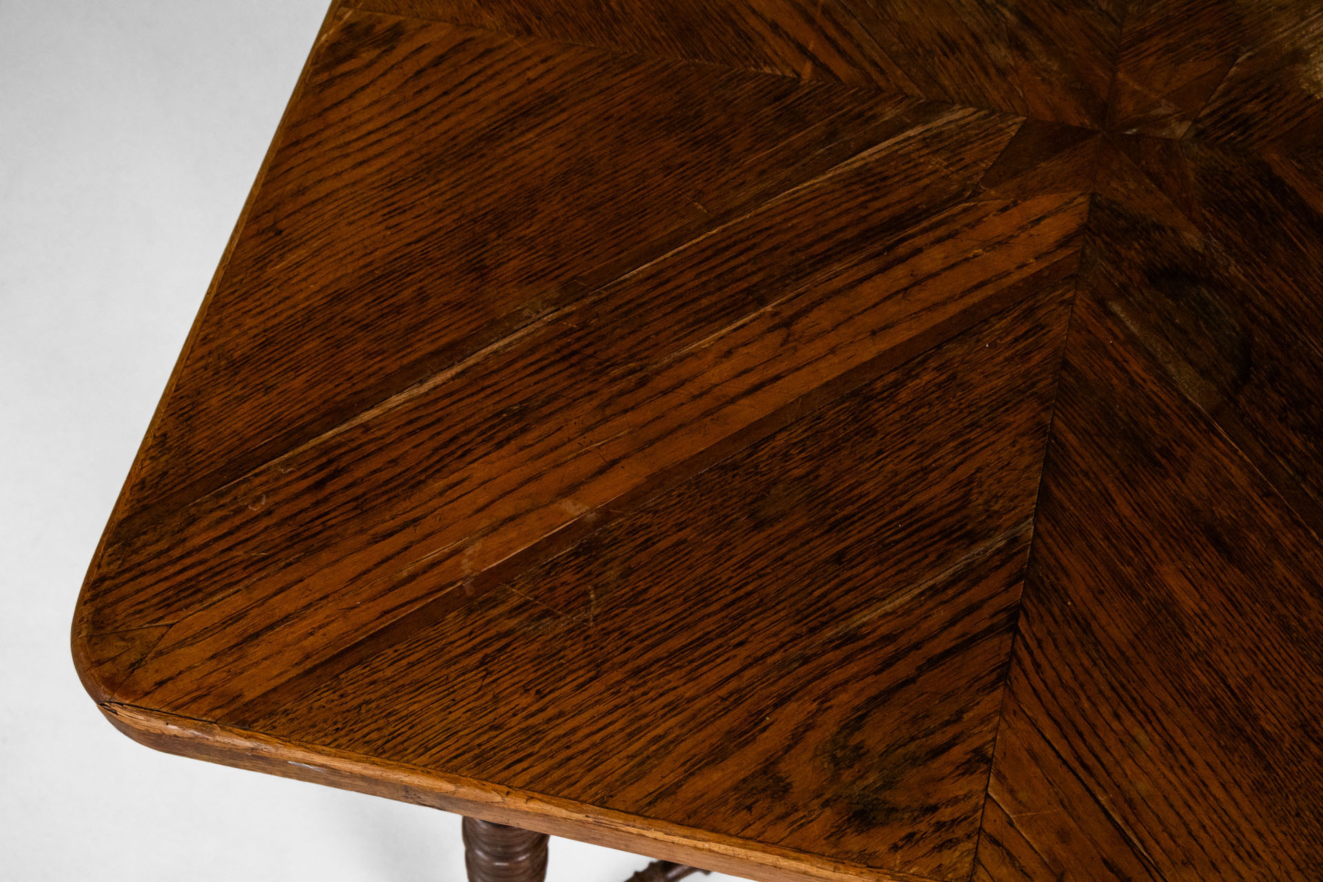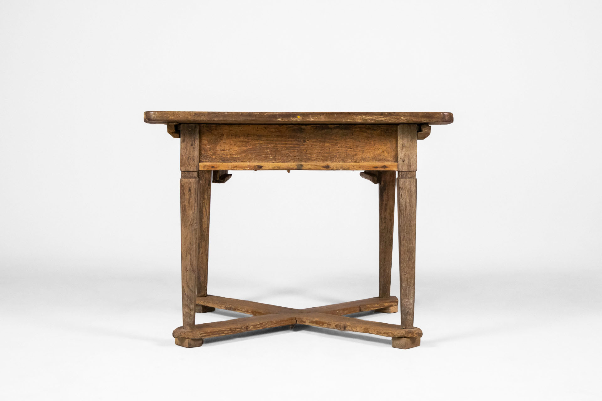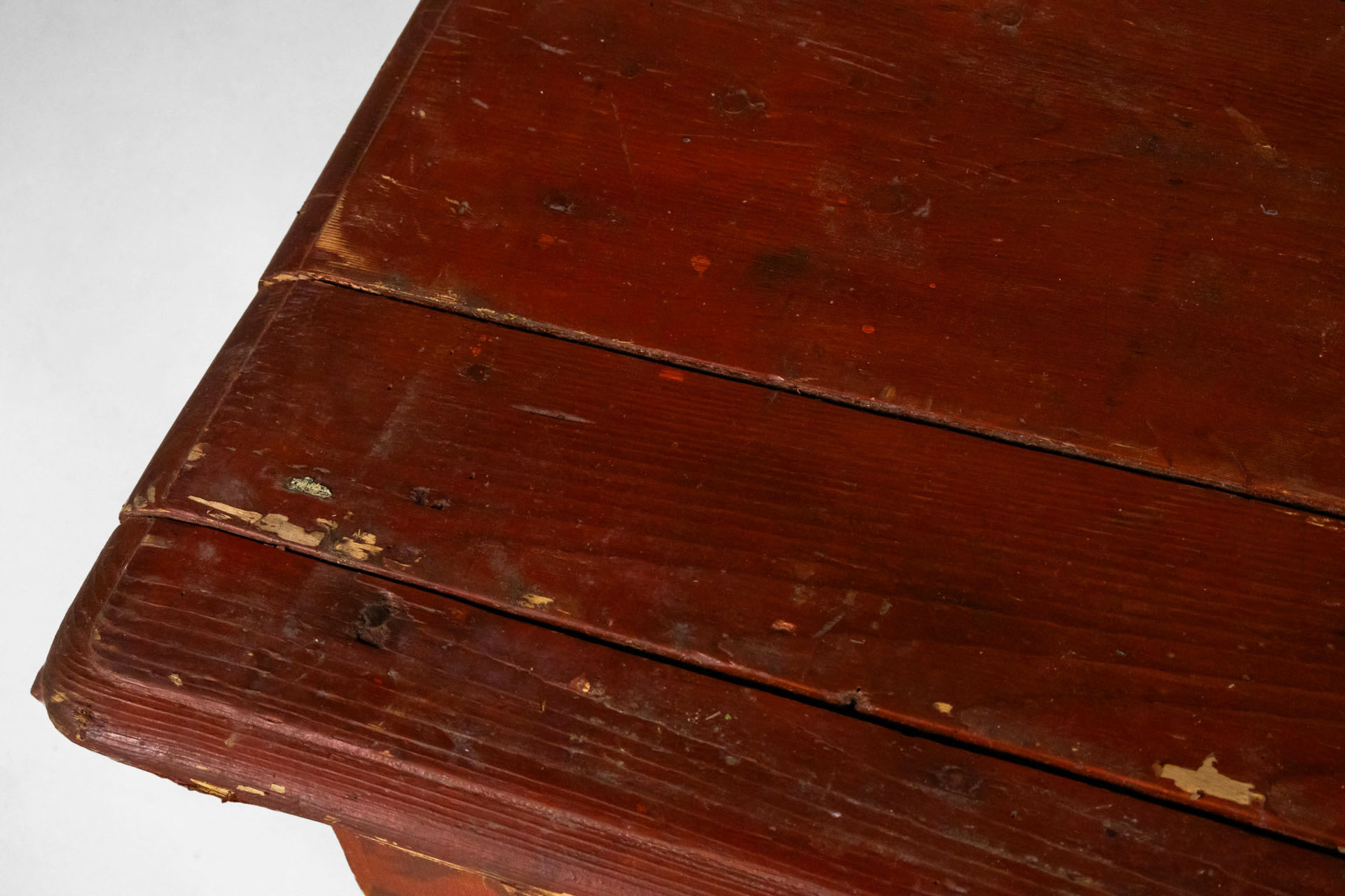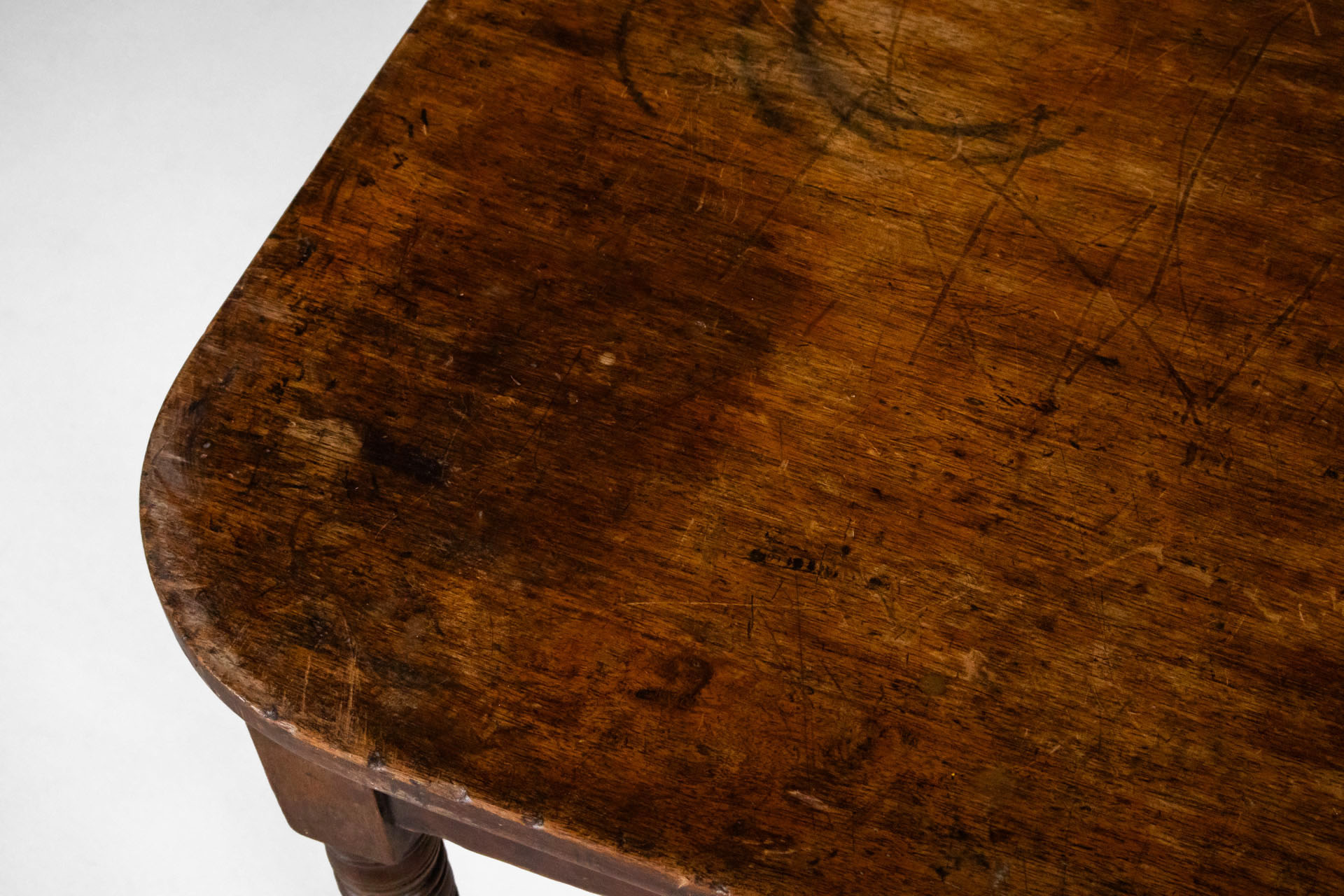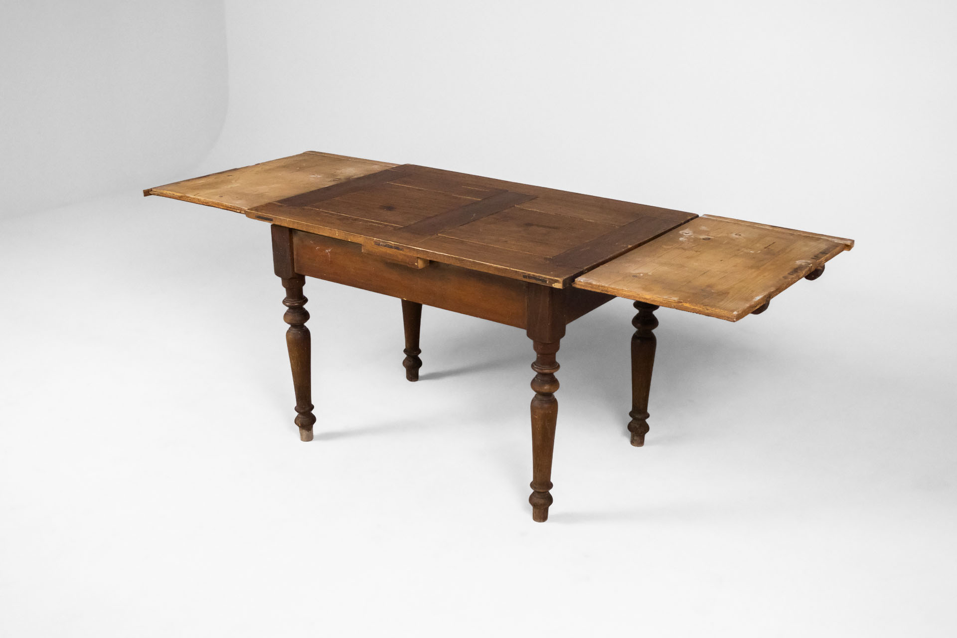 Masszív, vintage stílusú, téglalap alakú asztal rusztikus megjelenéssel. Az asztal felülete enyhén kopott, ami a használat nyomait tükrözi