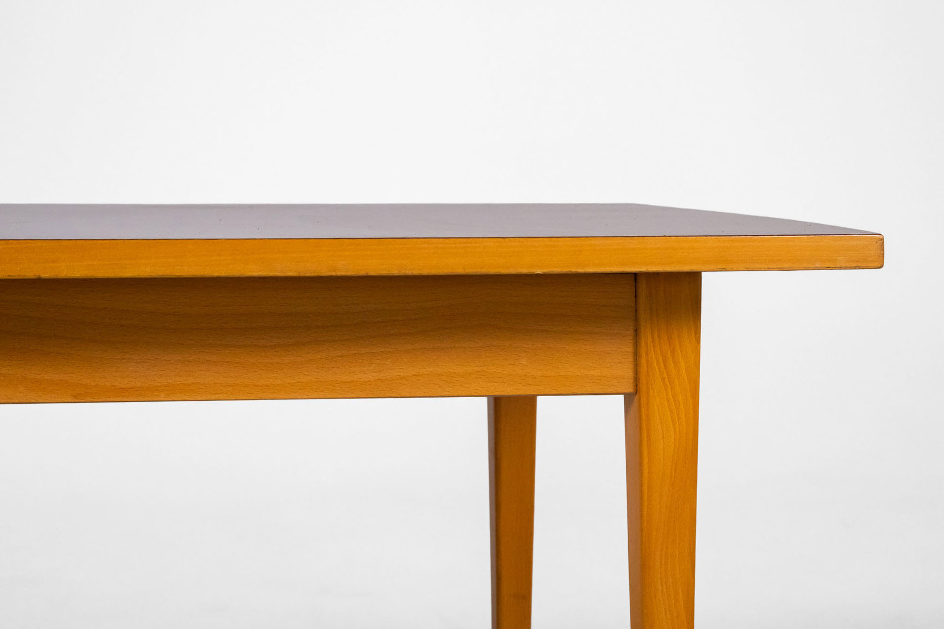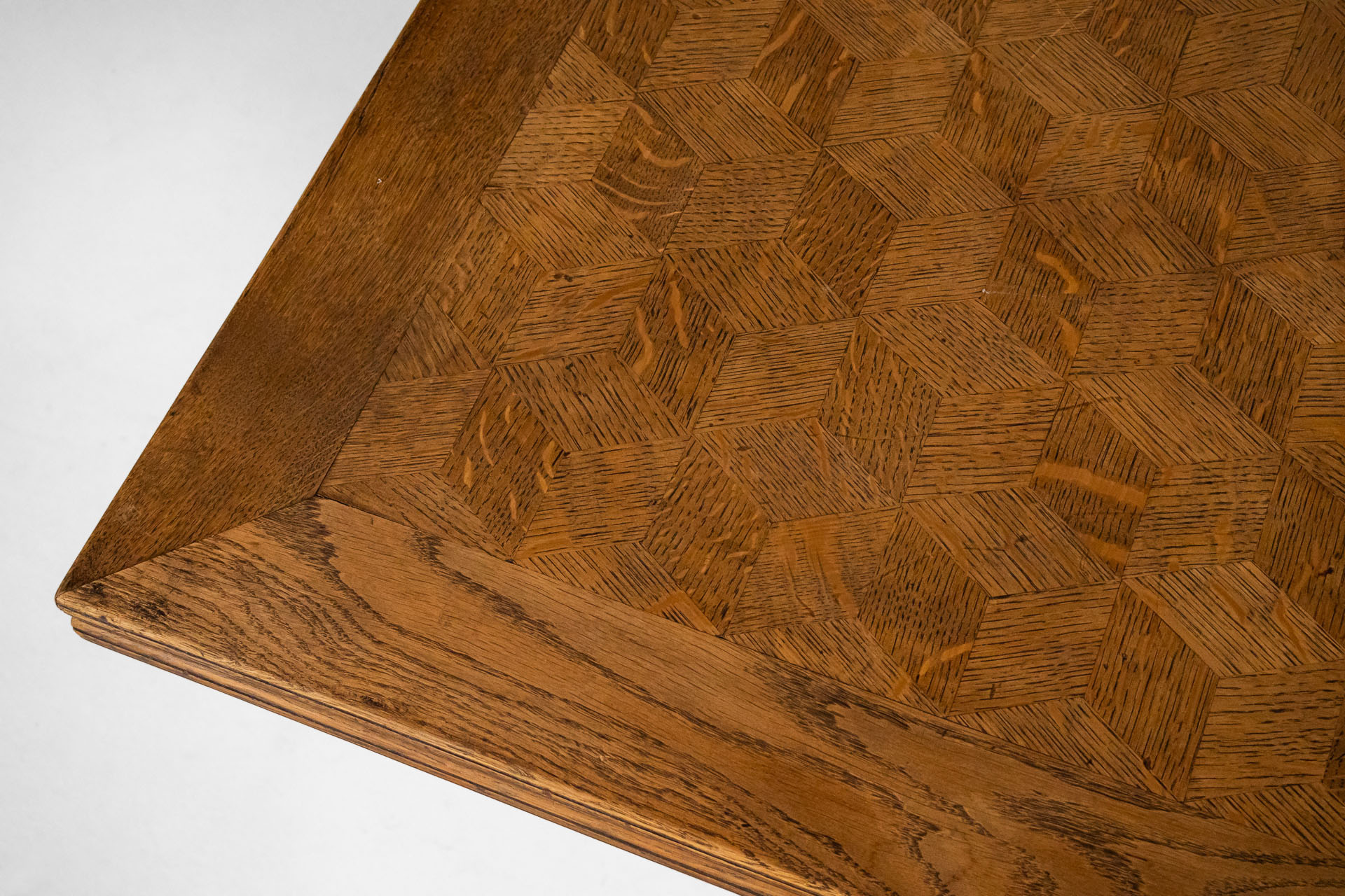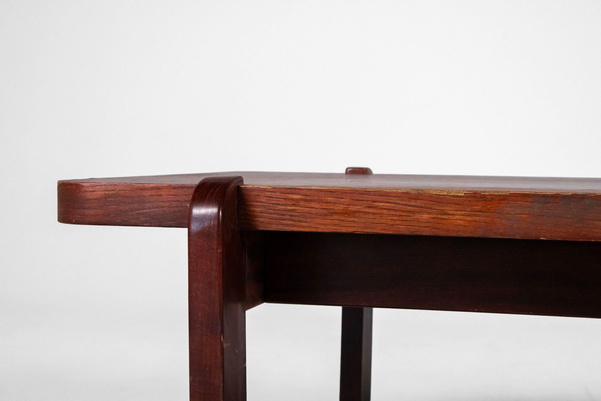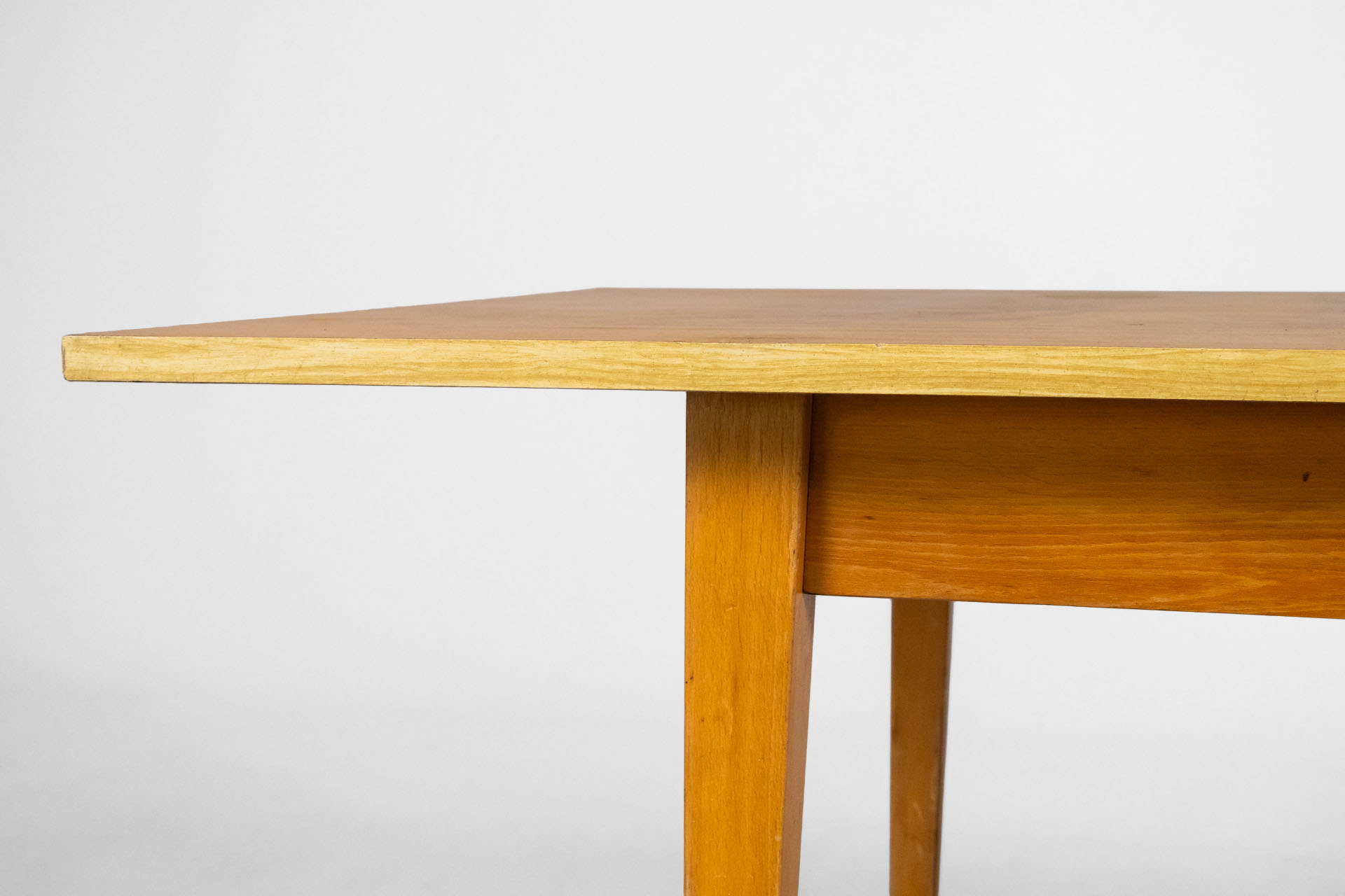 Masszív, vintage stílusú, téglalap alakú asztal rusztikus megjelenéssel. Az asztal felülete enyhén kopott, ami a használat nyomait tükrözi