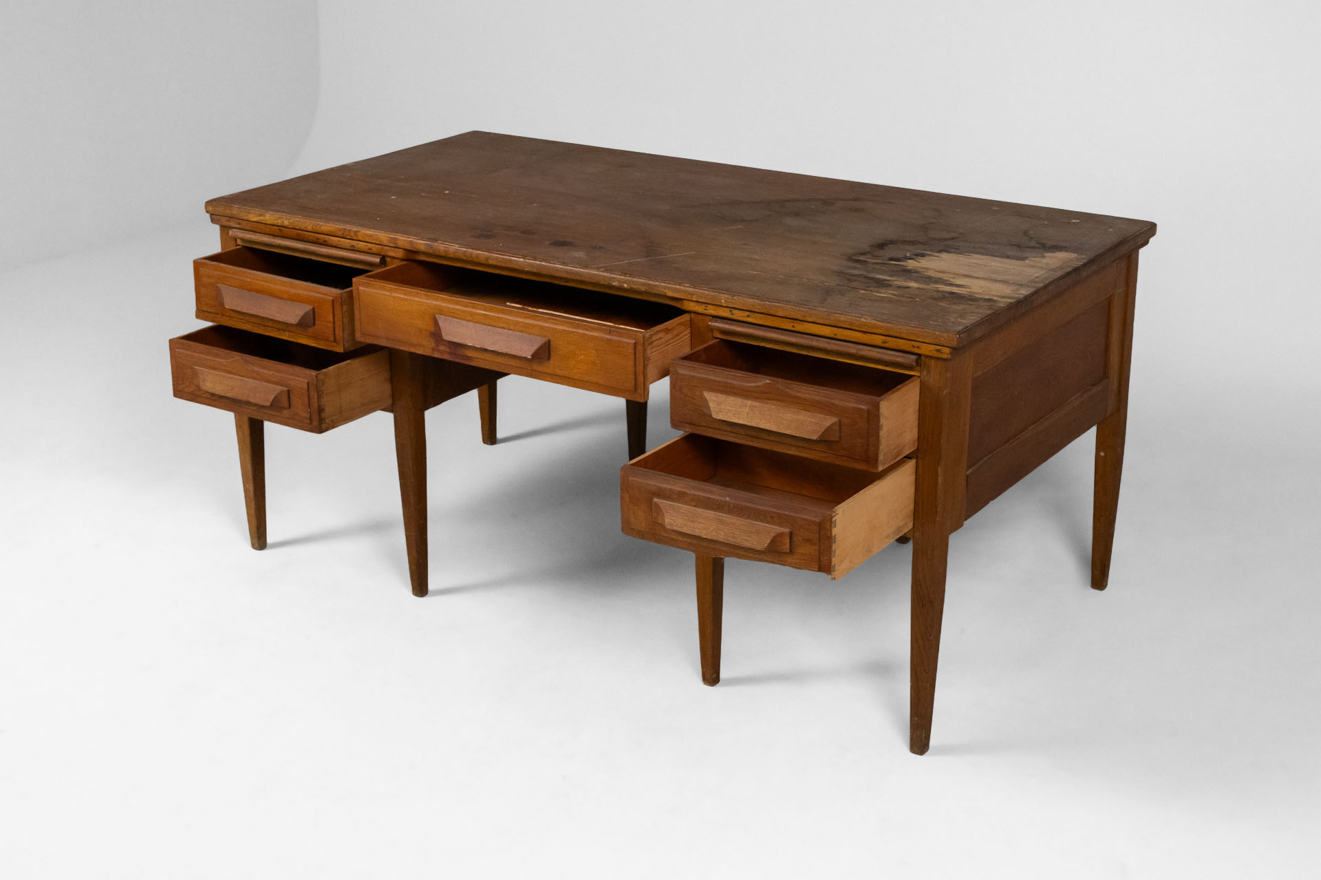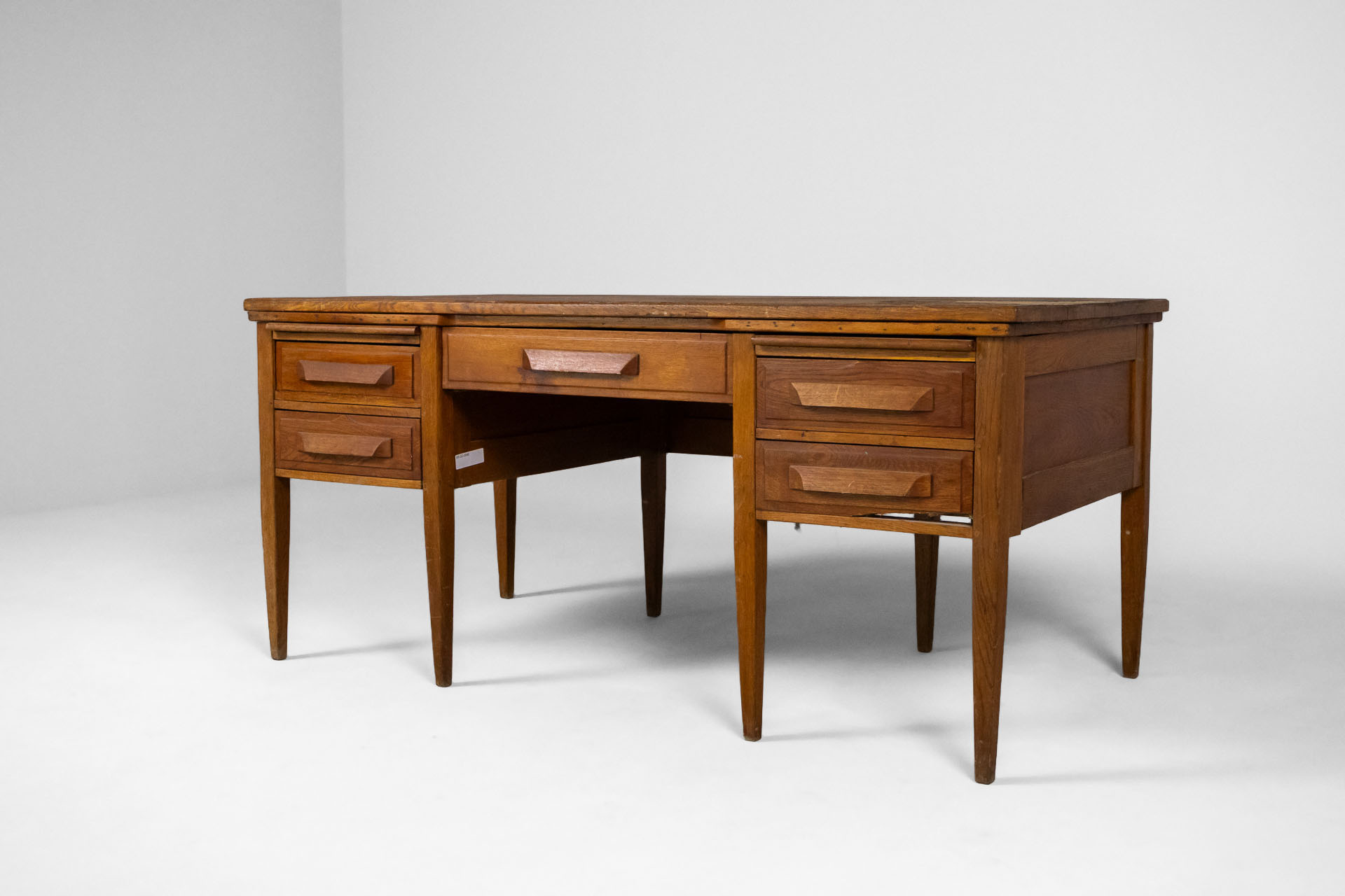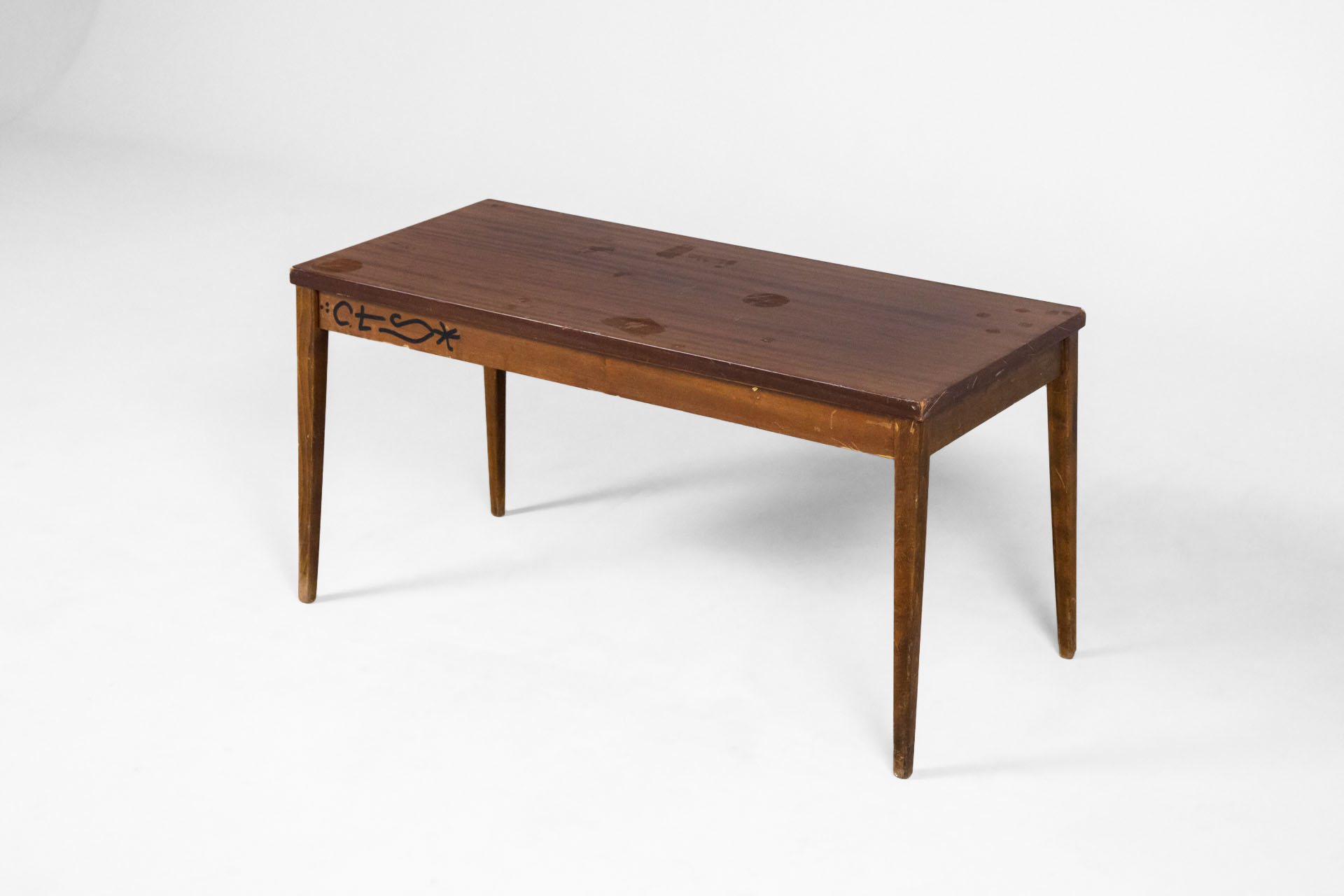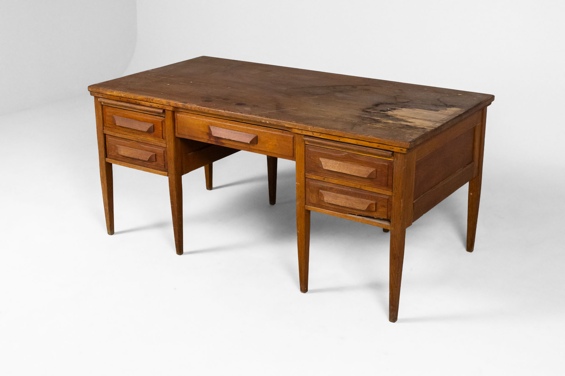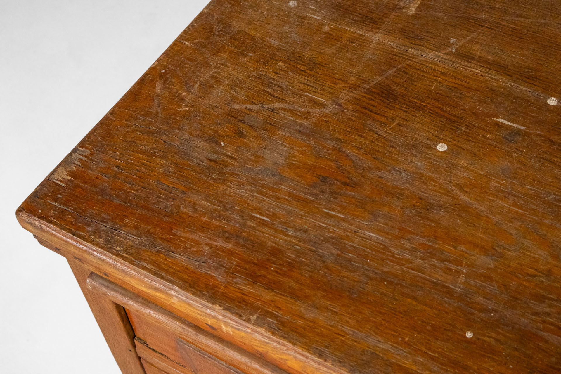 Masszív, vintage stílusú, téglalap alakú asztal rusztikus megjelenéssel. Az asztal felülete enyhén kopott, ami a használat nyomait tükrözi