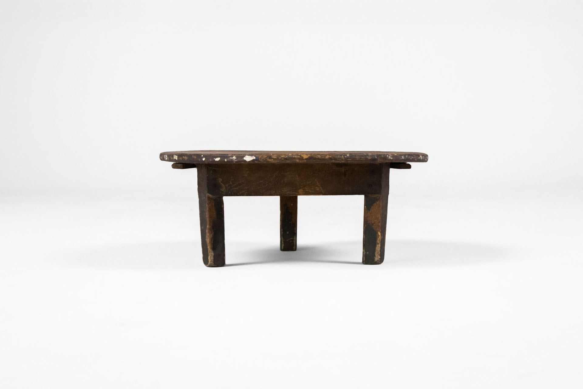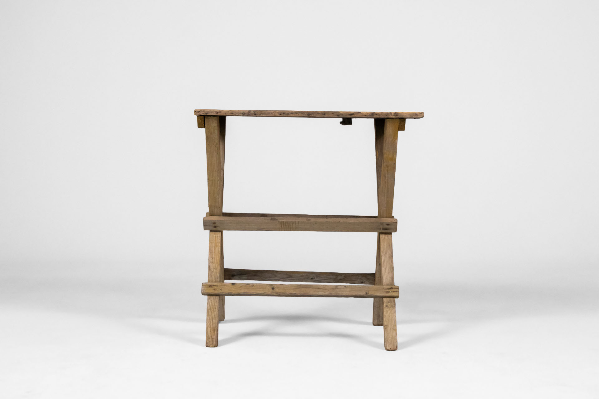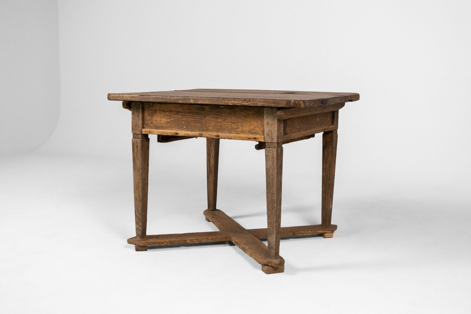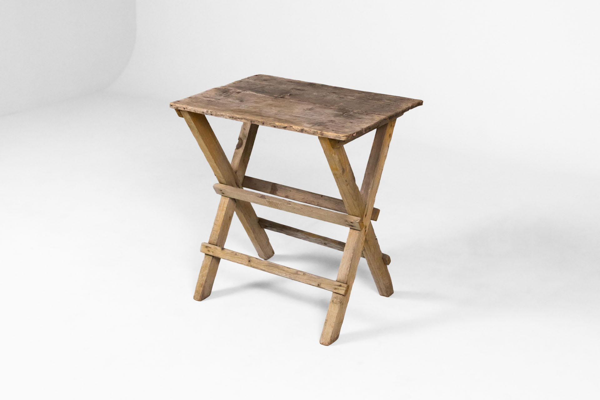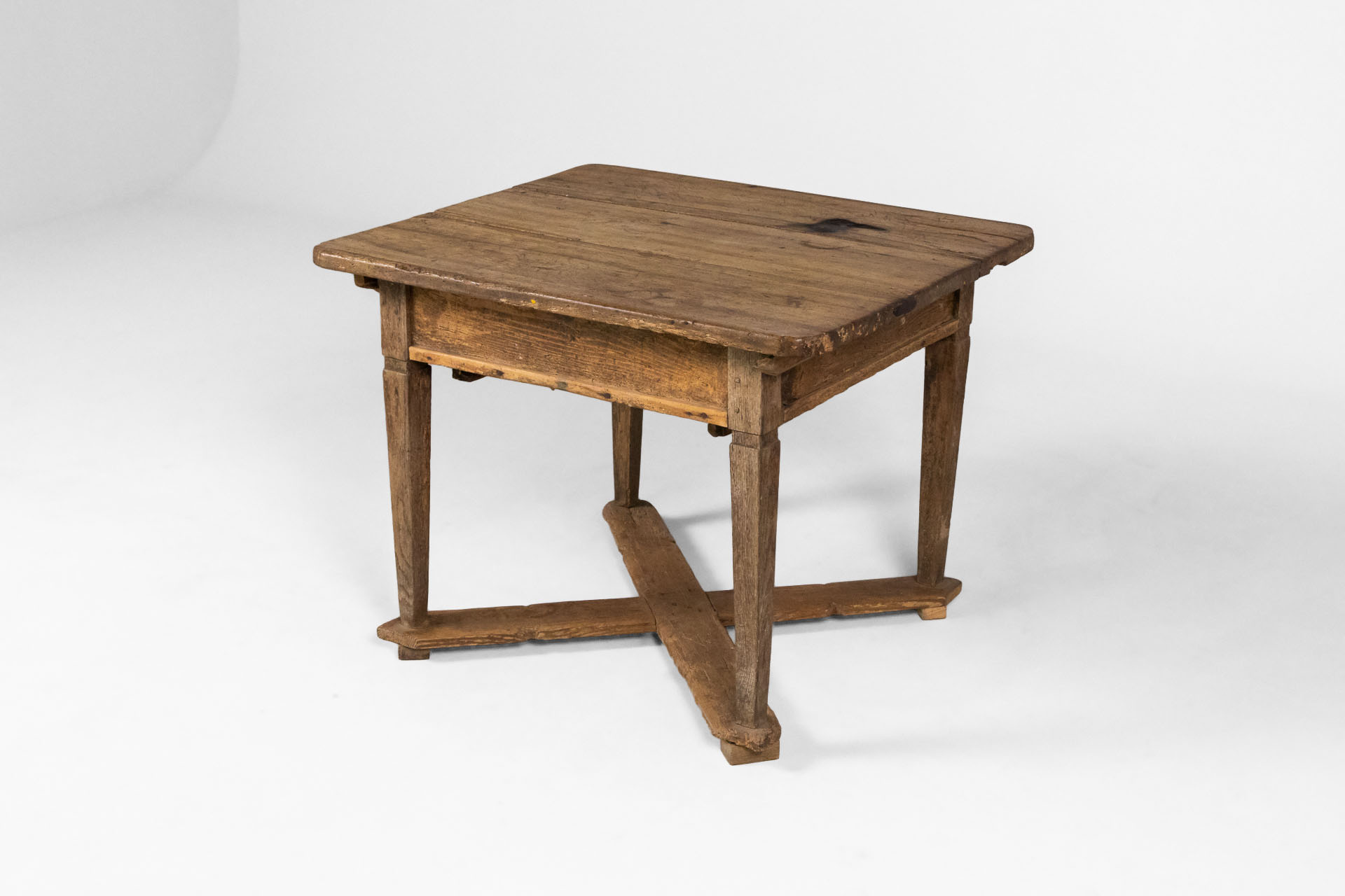 Egyszerű, rusztikus stílusú kocka formájú asztal, masszív fából készült, erős lábakkal, amely tökéletesen illeszkedik vidéki vagy vintage enteriőrökbe. Az asztallap felülete enyhén kopott, ami időtlen karaktert kölcsönöz neki