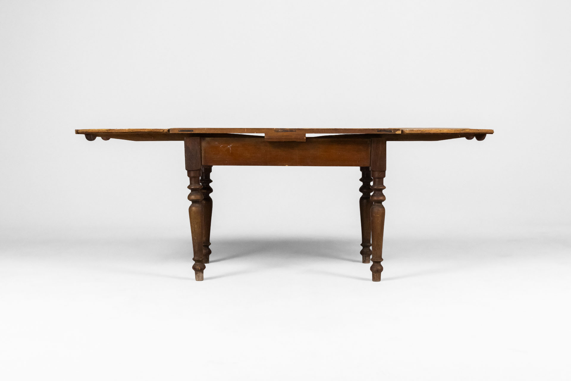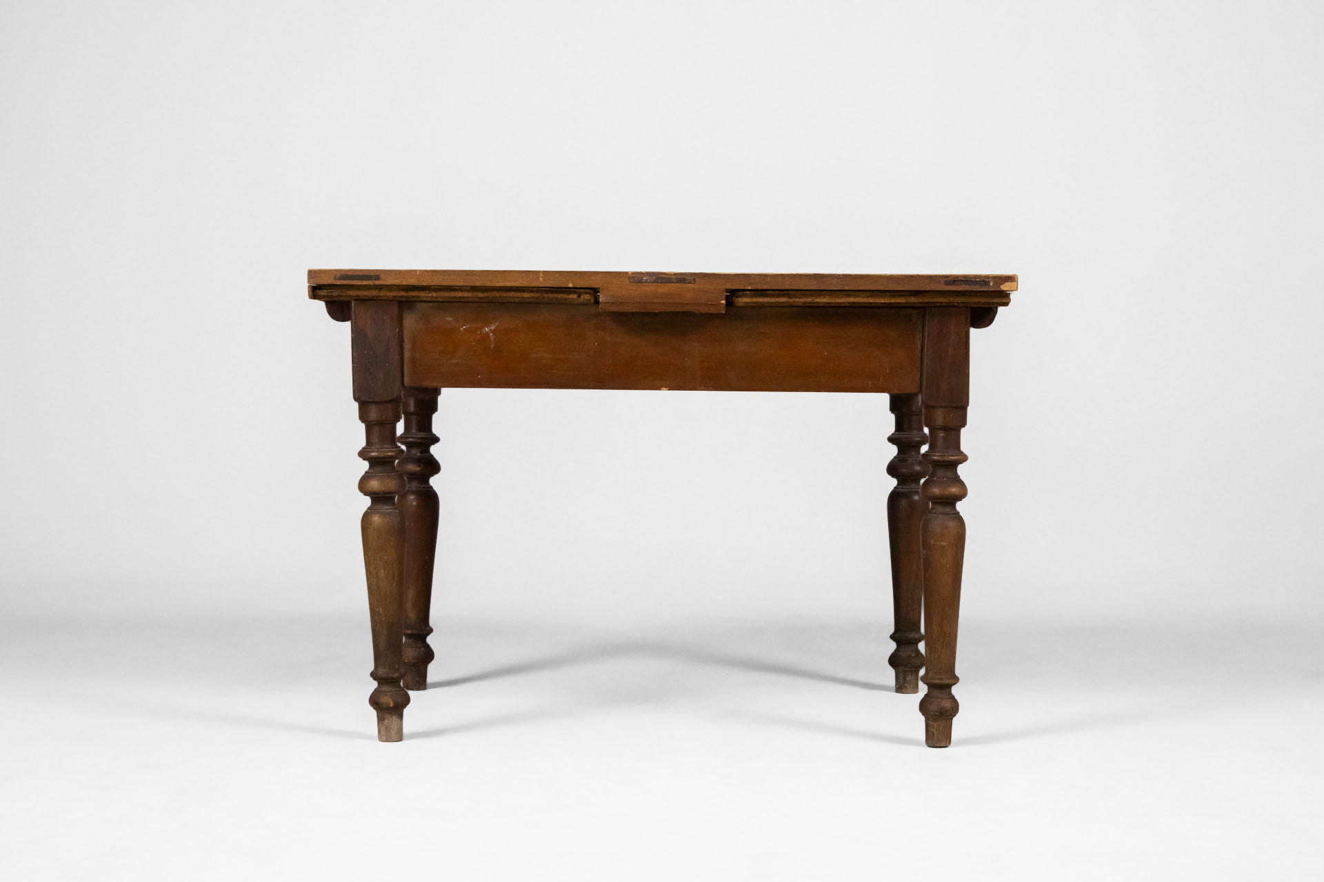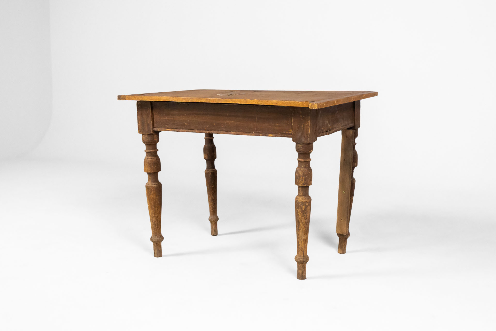 Klasszikus, rusztikus stílusú, négyzet alakú fa asztal, masszív, esztergált lábakkal és egyszerű, de elegáns kialakítással. Az asztallap enyhén kopott, ami időtlen karaktert kölcsönöz neki, ideális választás...