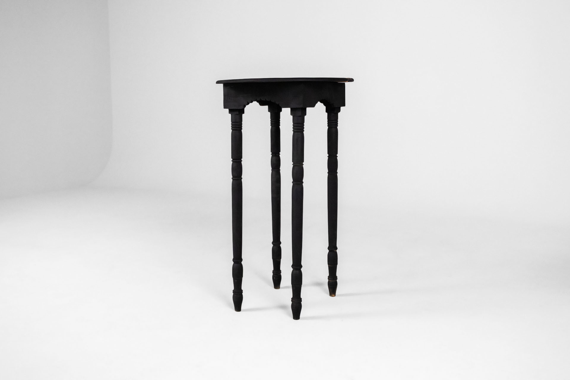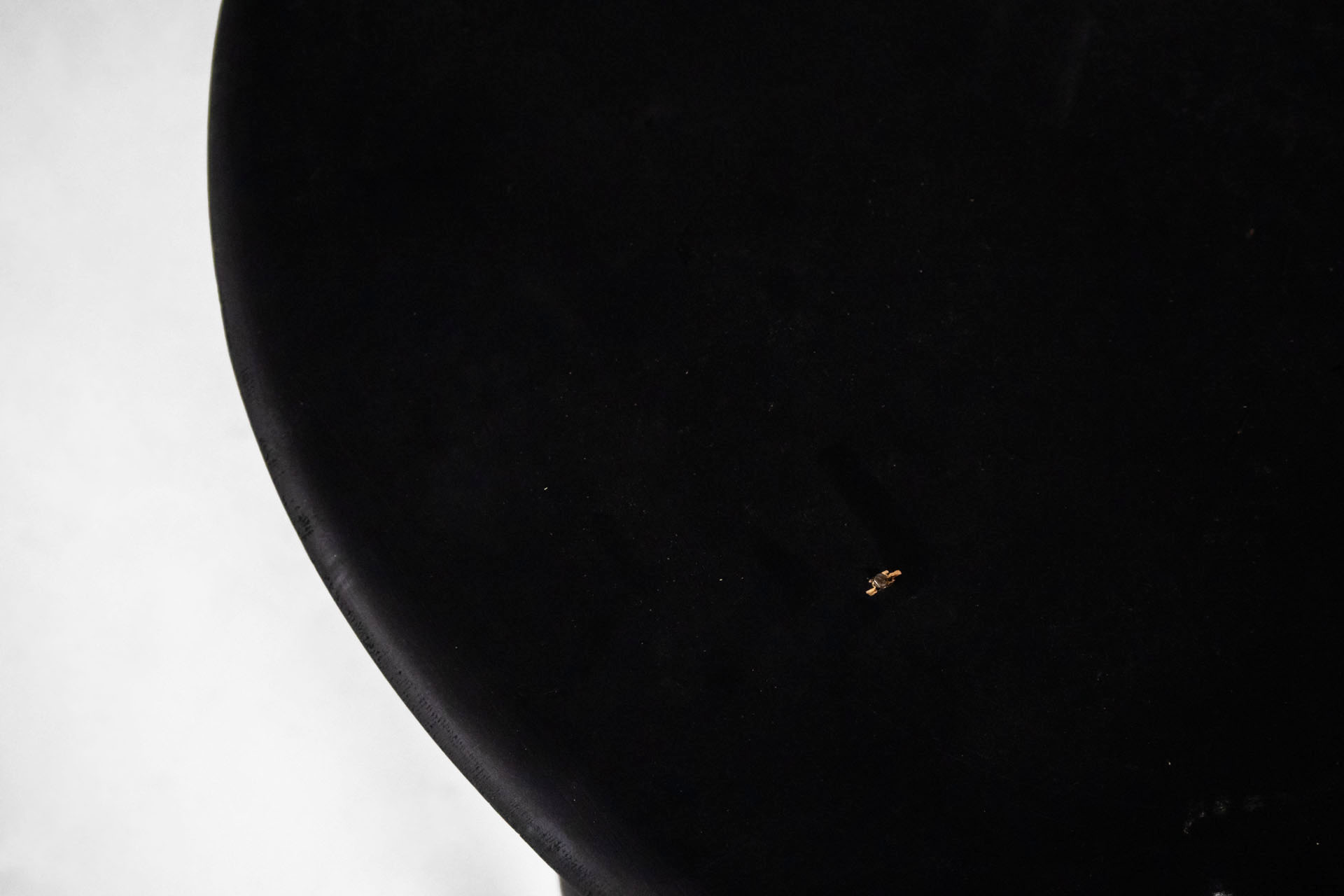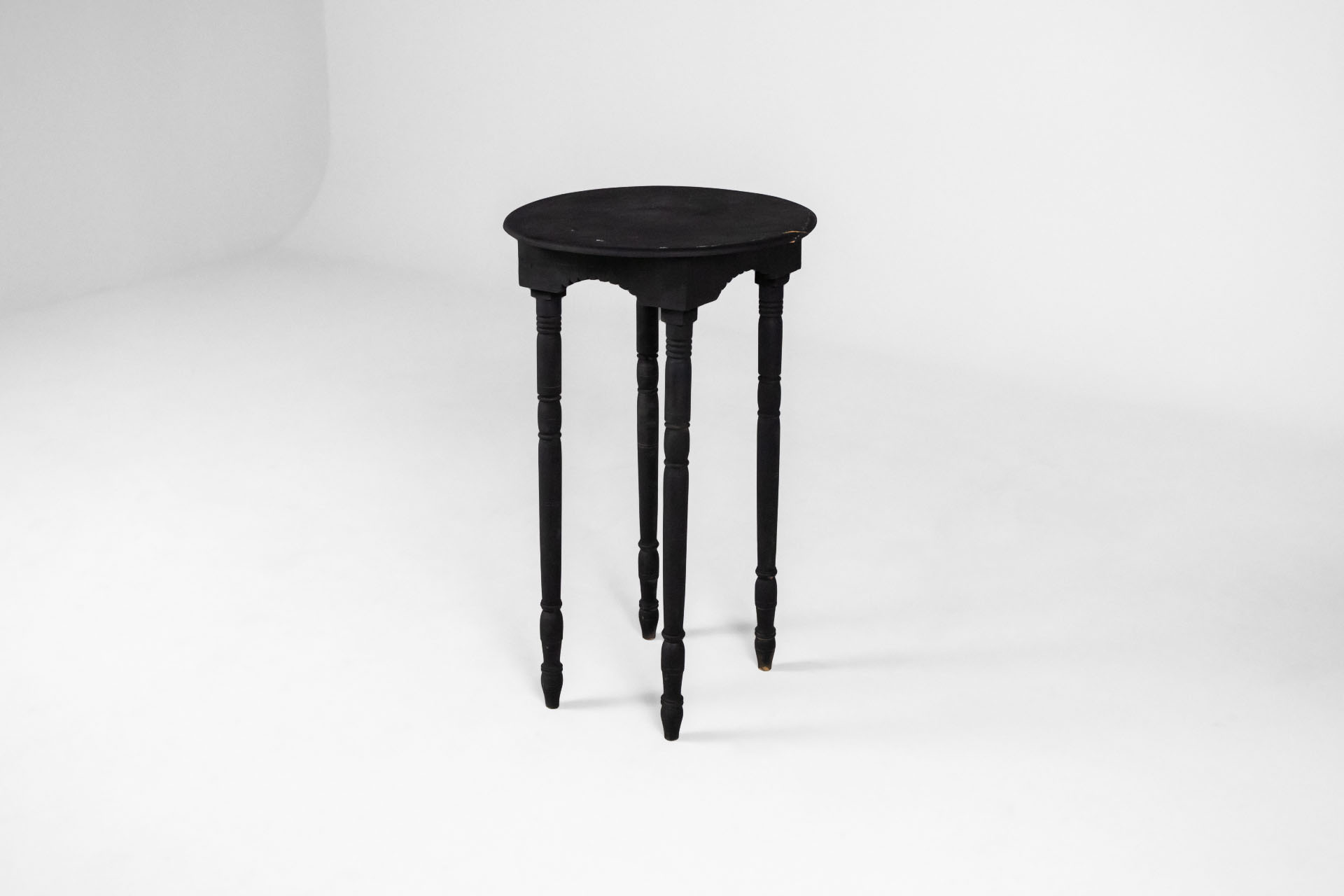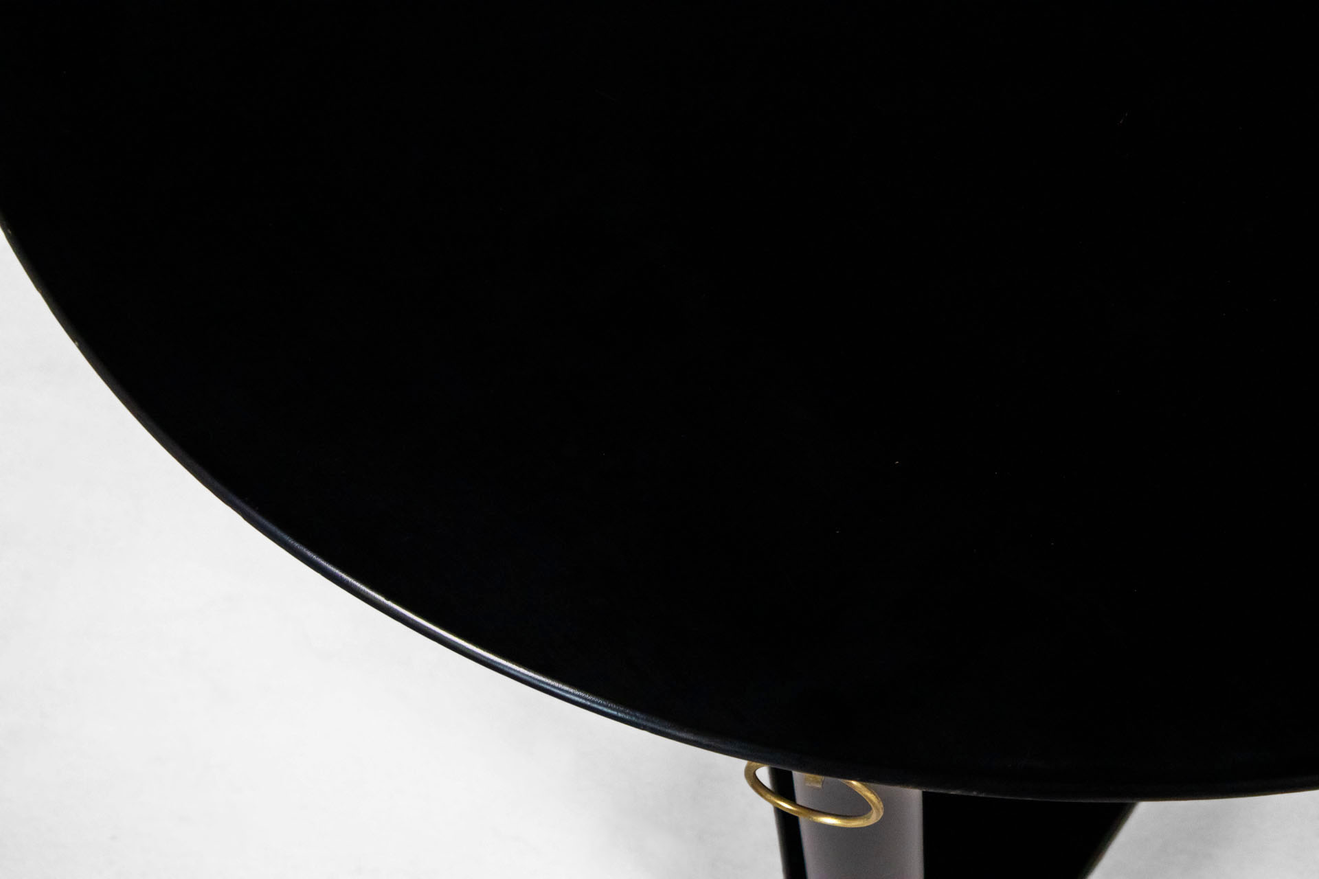 Minimalista stílusú, kerek formájú dohányzóasztal, elegáns fekete felülettel és vékony, esztergált lábakkal, amely modern és letisztult megjelenést kölcsönöz bármely enteriőrnek