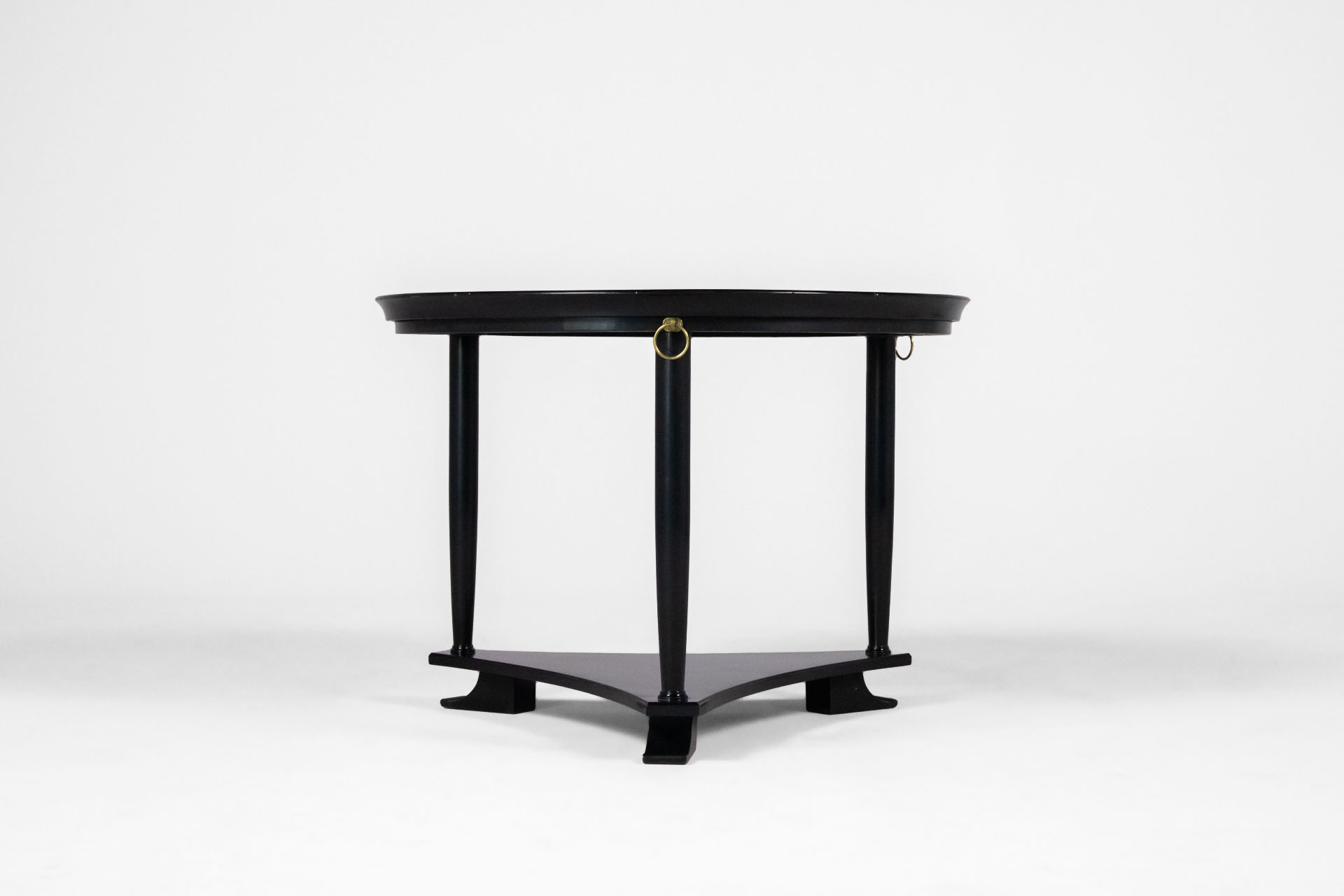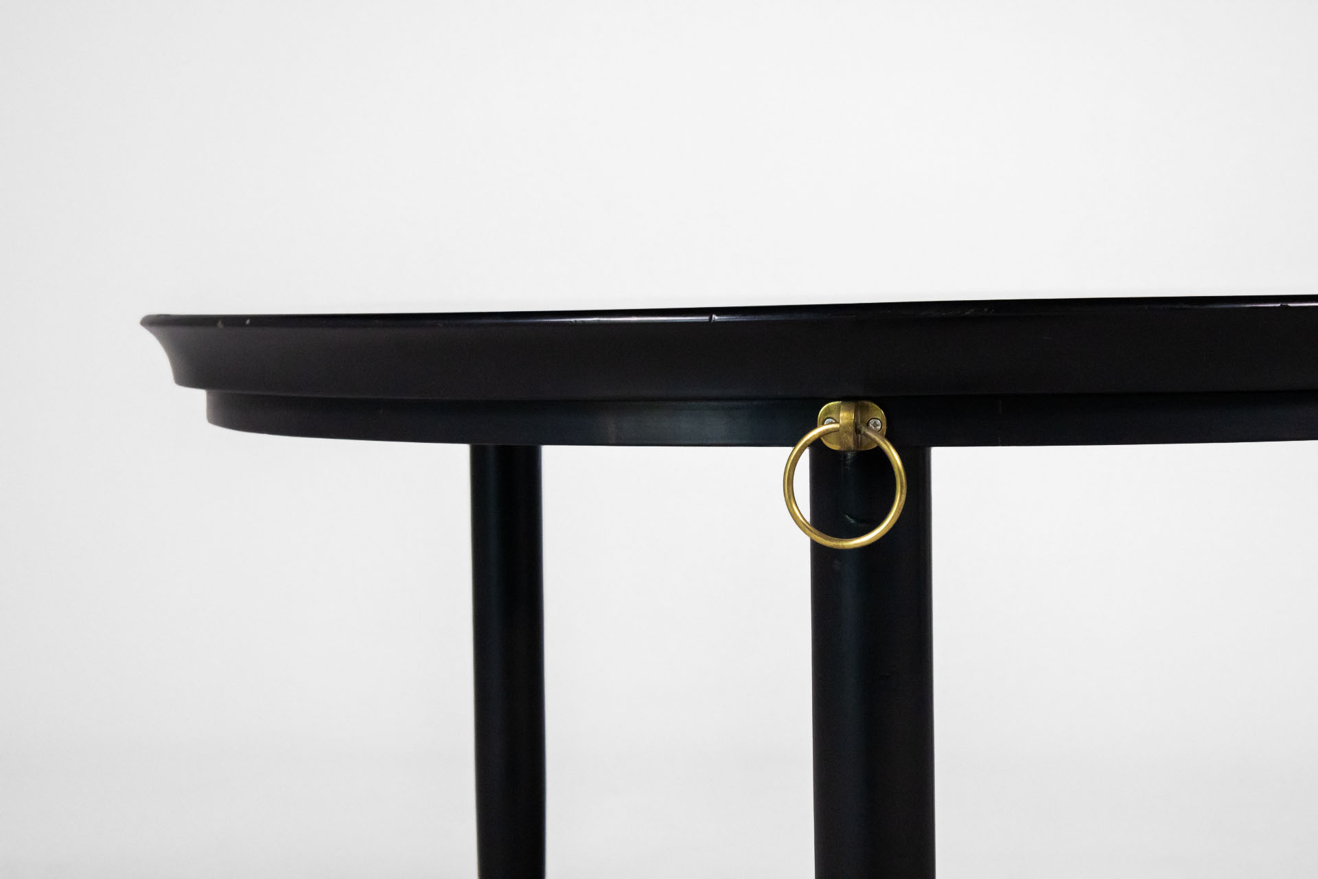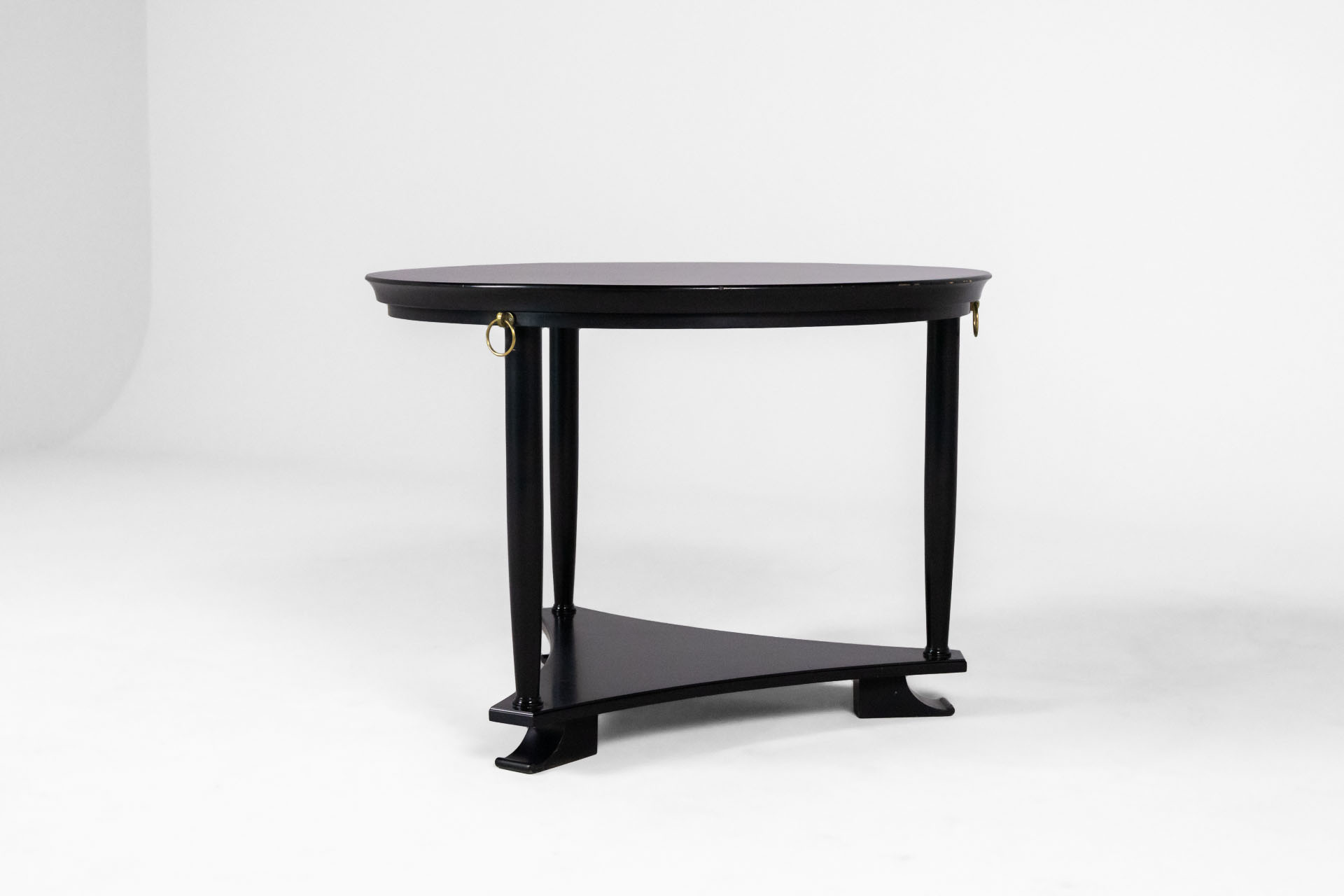 Minimalista stílusú, kerek formájú dohányzóasztal, elegáns fekete felülettel és vékony, esztergált lábakkal, amely modern és letisztult megjelenést kölcsönöz bármely enteriőrnek