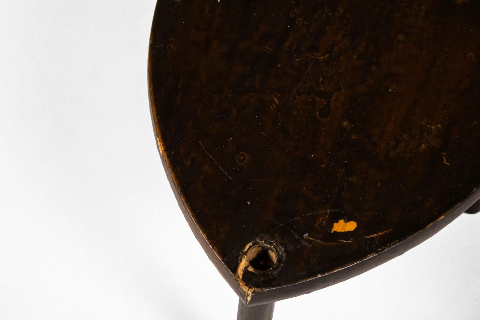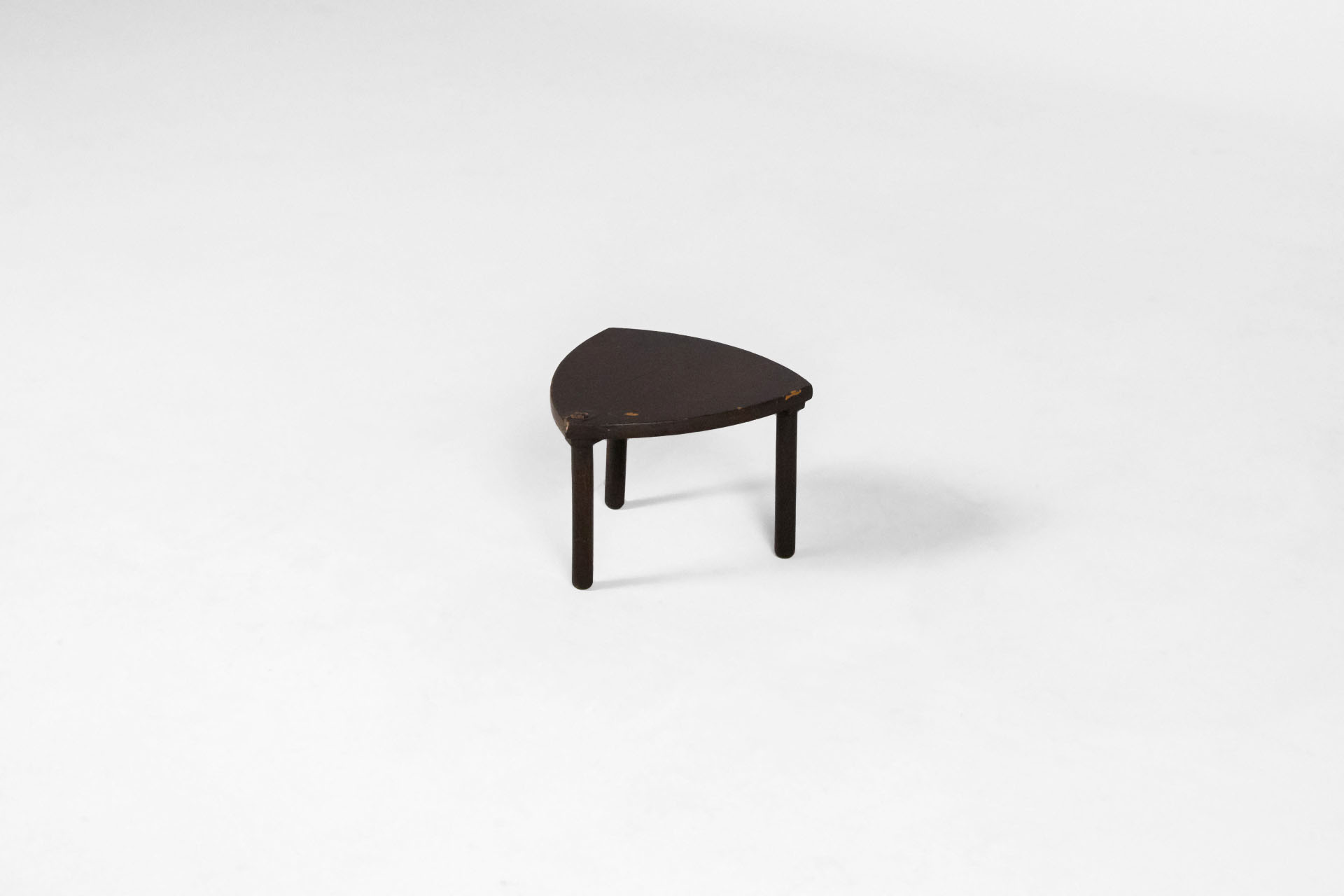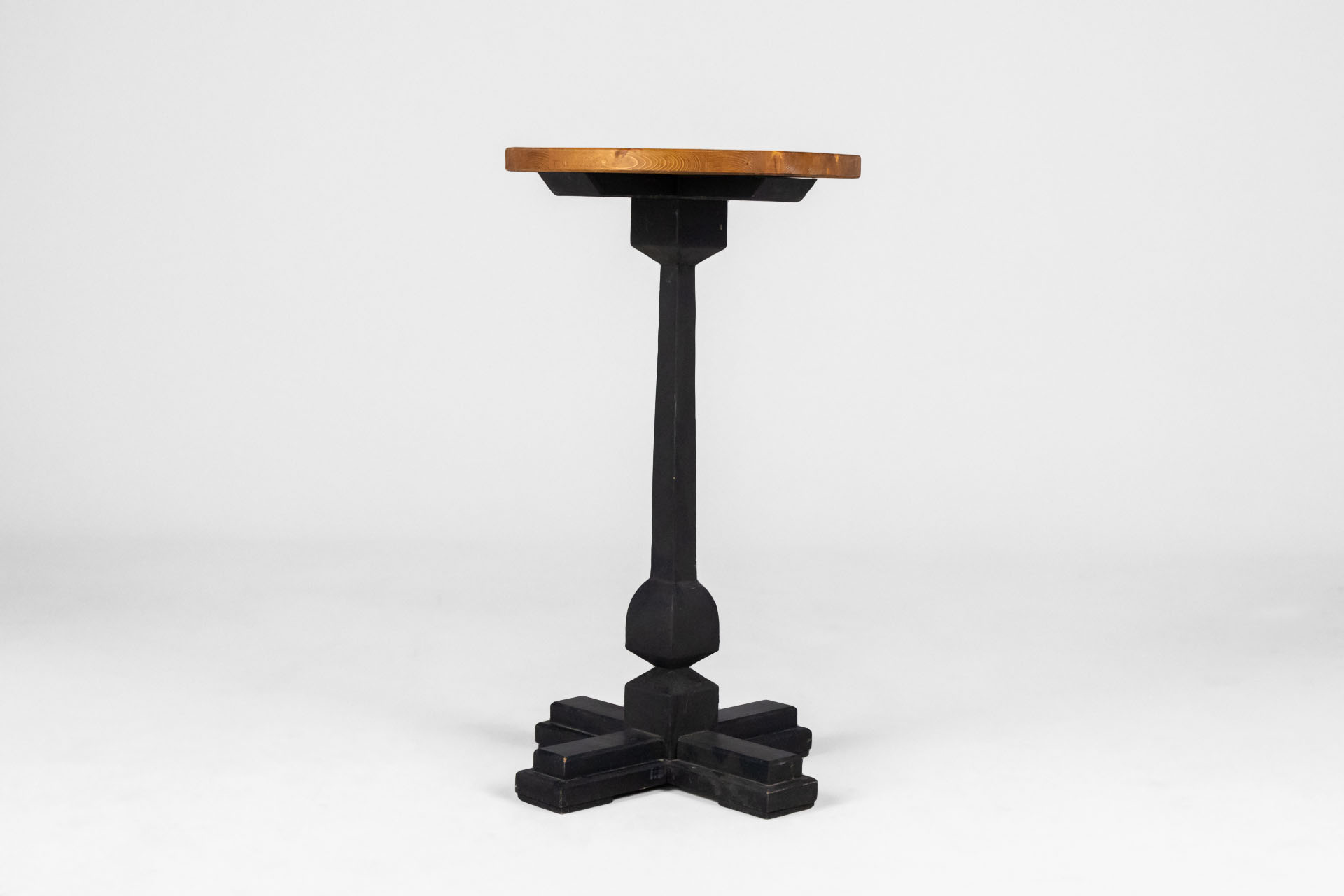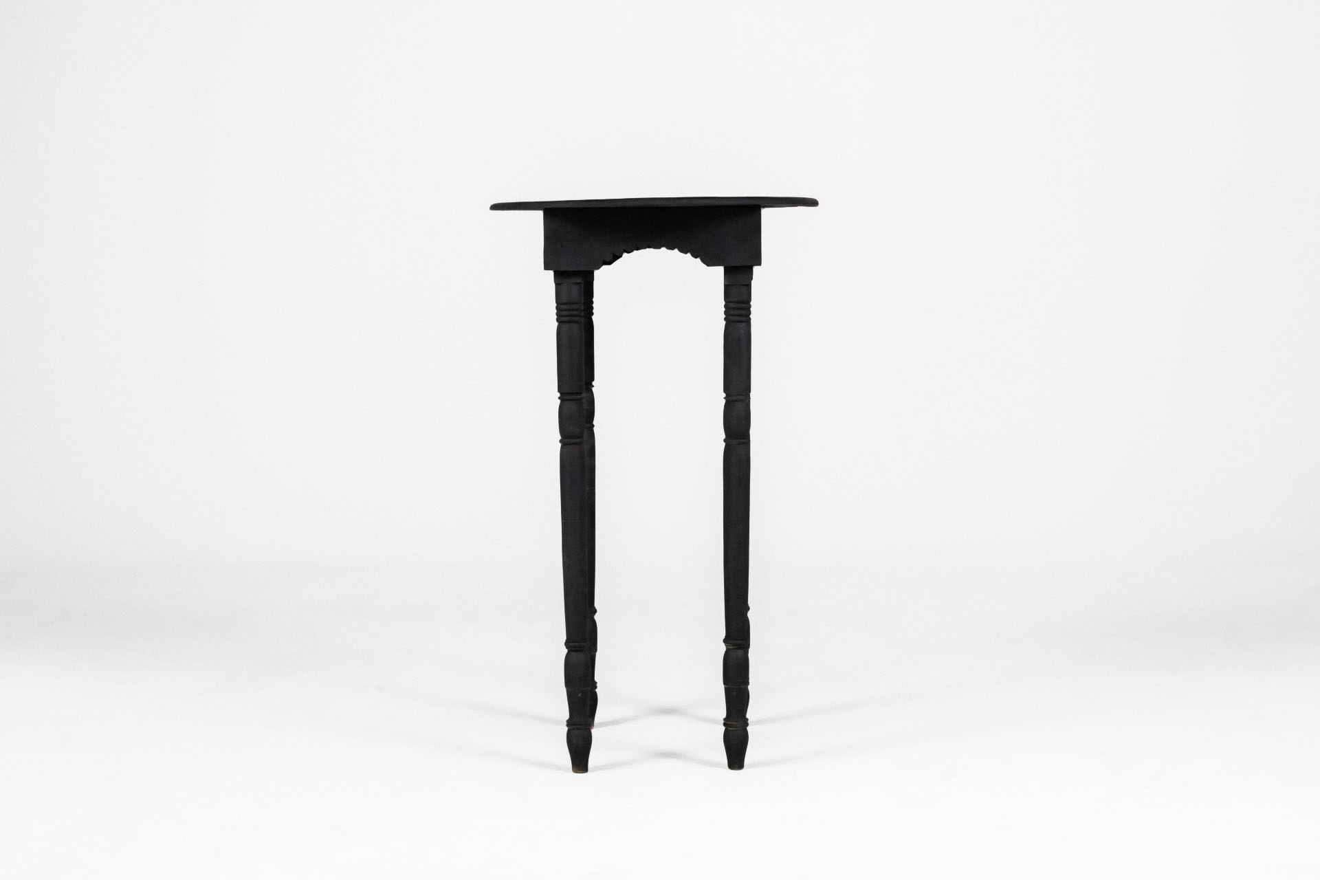 Minimalista stílusú, kerek formájú dohányzóasztal, elegáns fekete felülettel és vékony, esztergált lábakkal, amely modern és letisztult megjelenést kölcsönöz bármely enteriőrnek