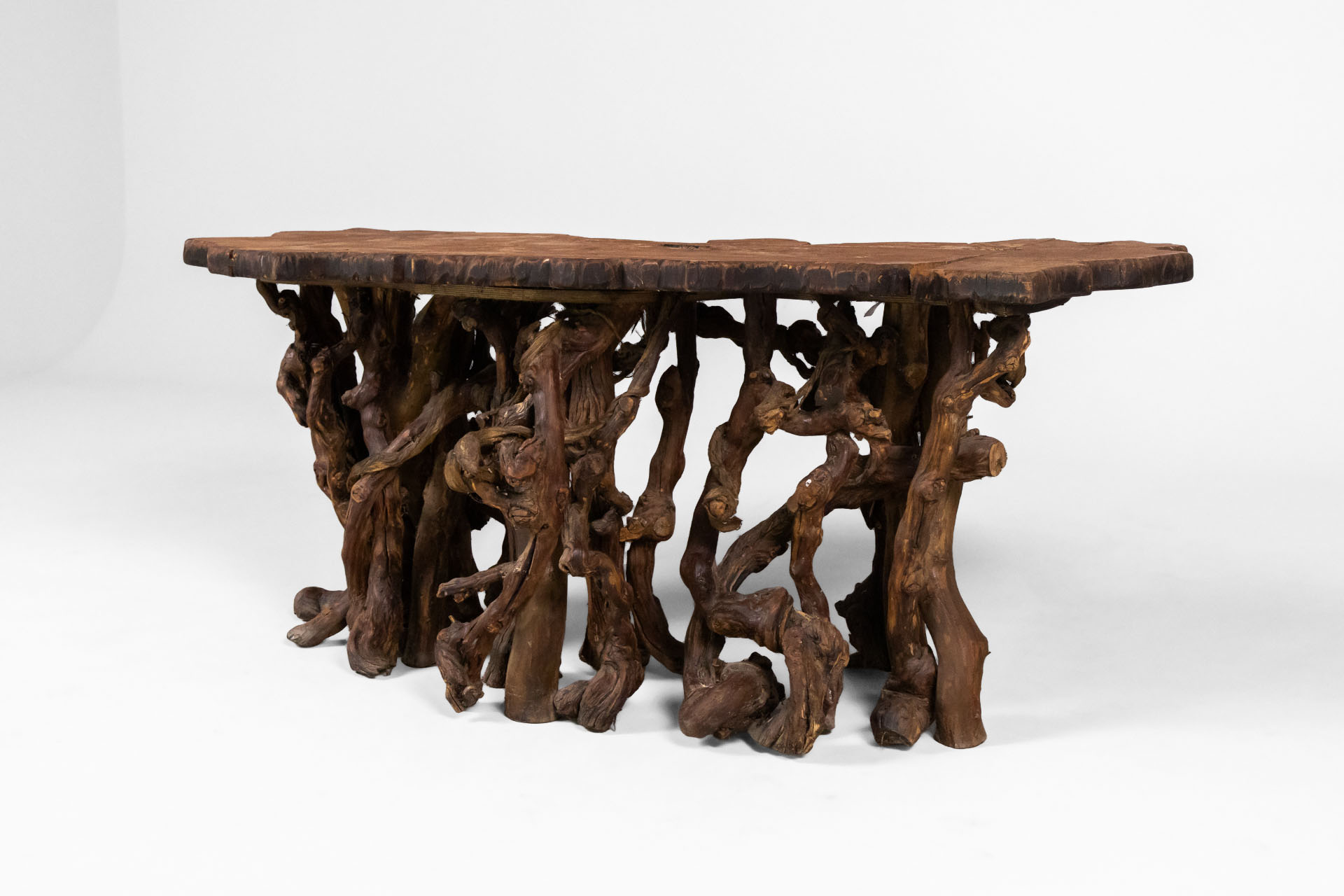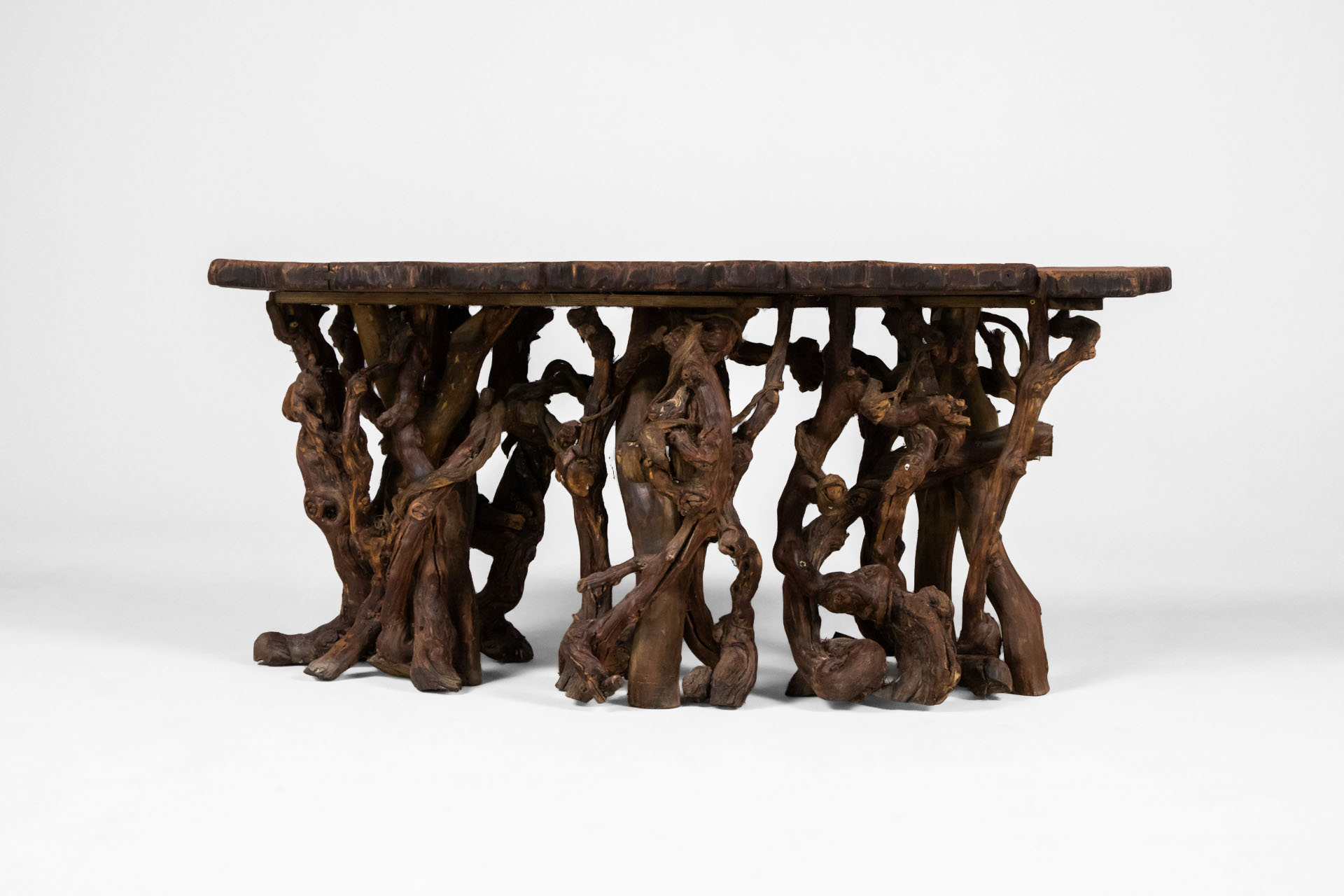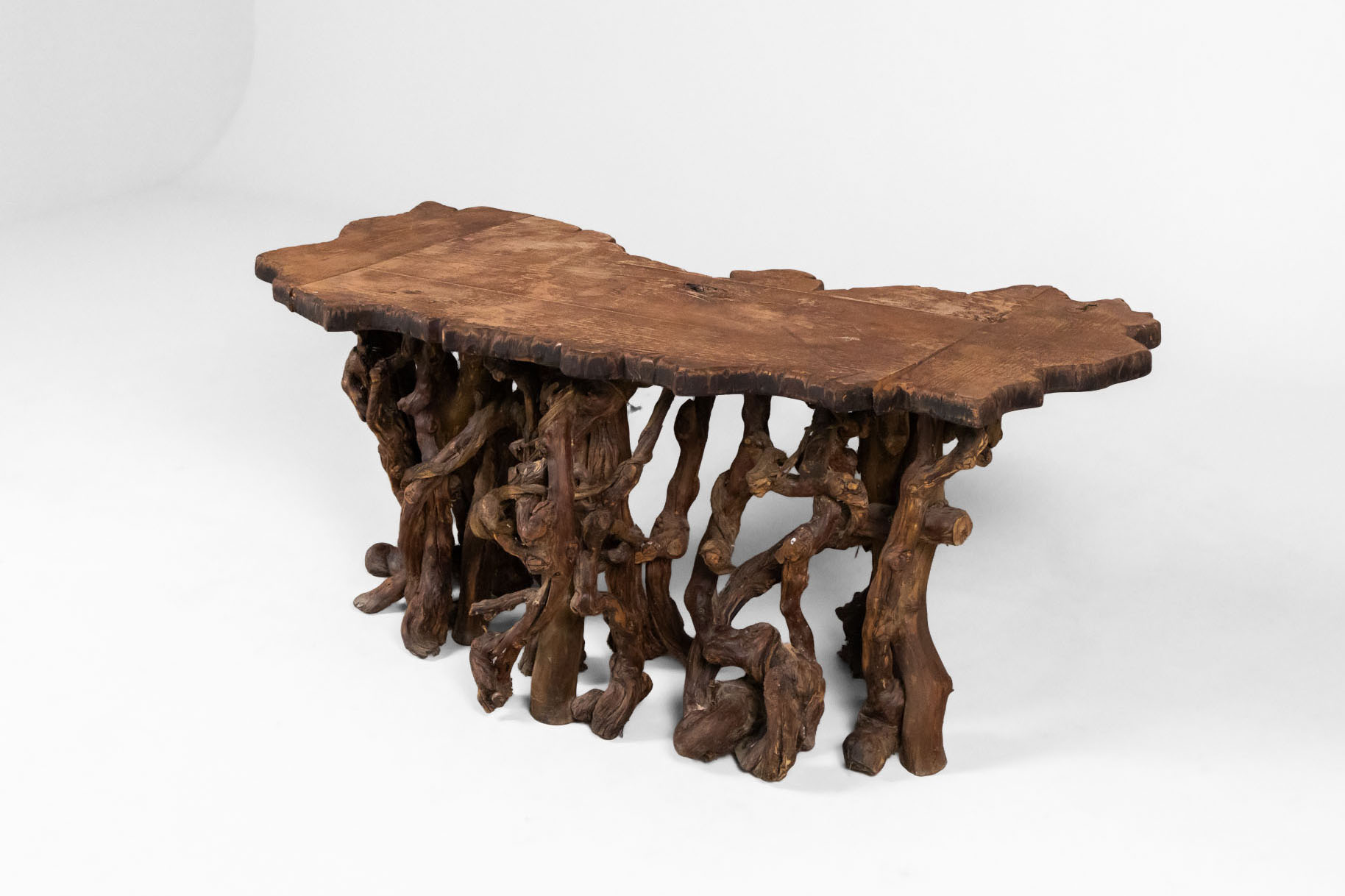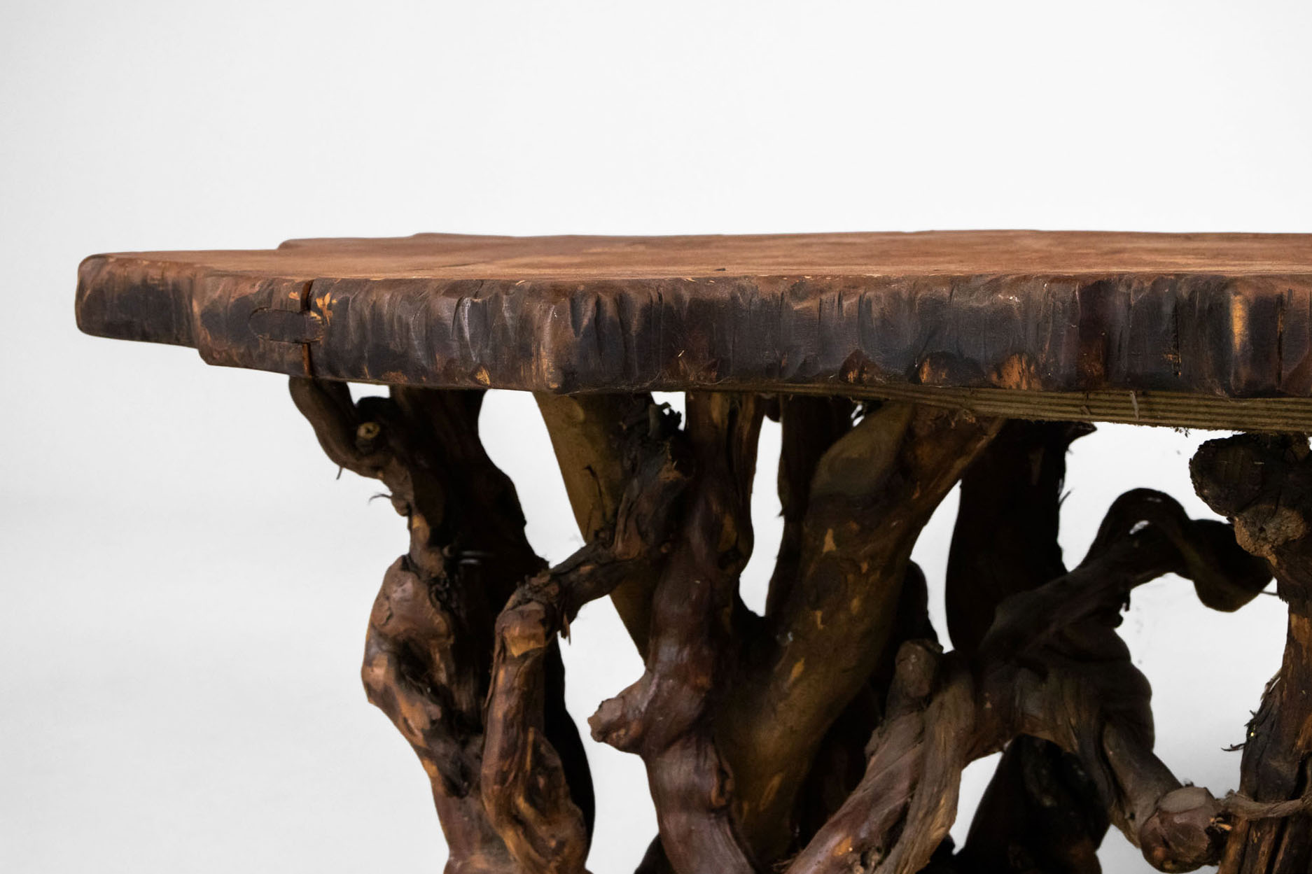Egyedi, organikus formájú asztal, amely természetes faanyagból készült. Az asztallap rusztikus, szabad formájú, míg az alapja különleges, gyökérszerű kialakítással rendelkezik, ami a természetes szépséget tükrözi....