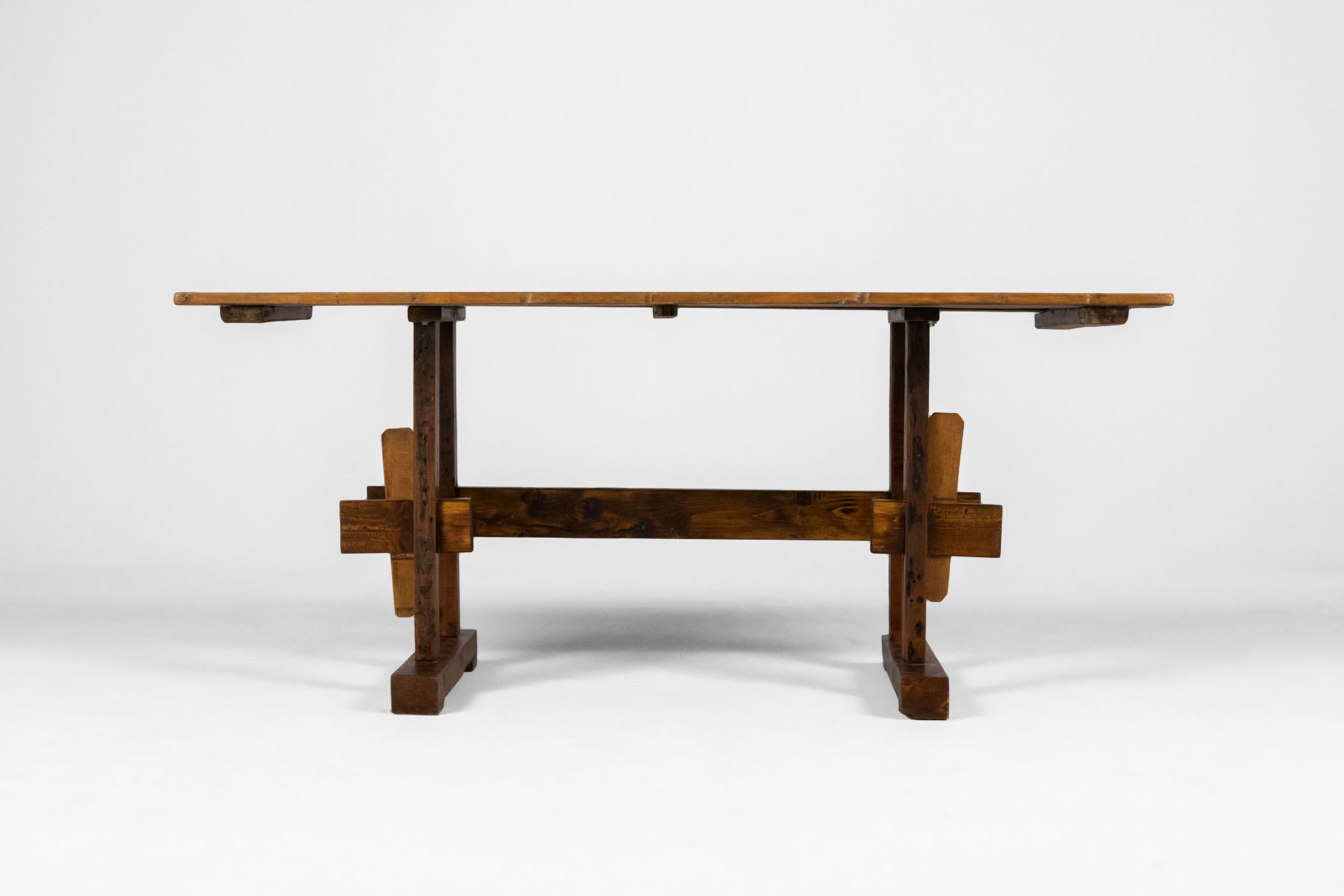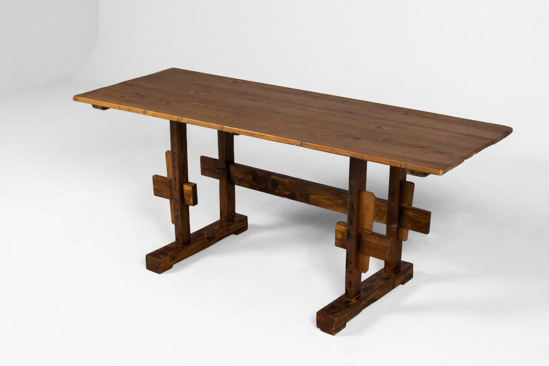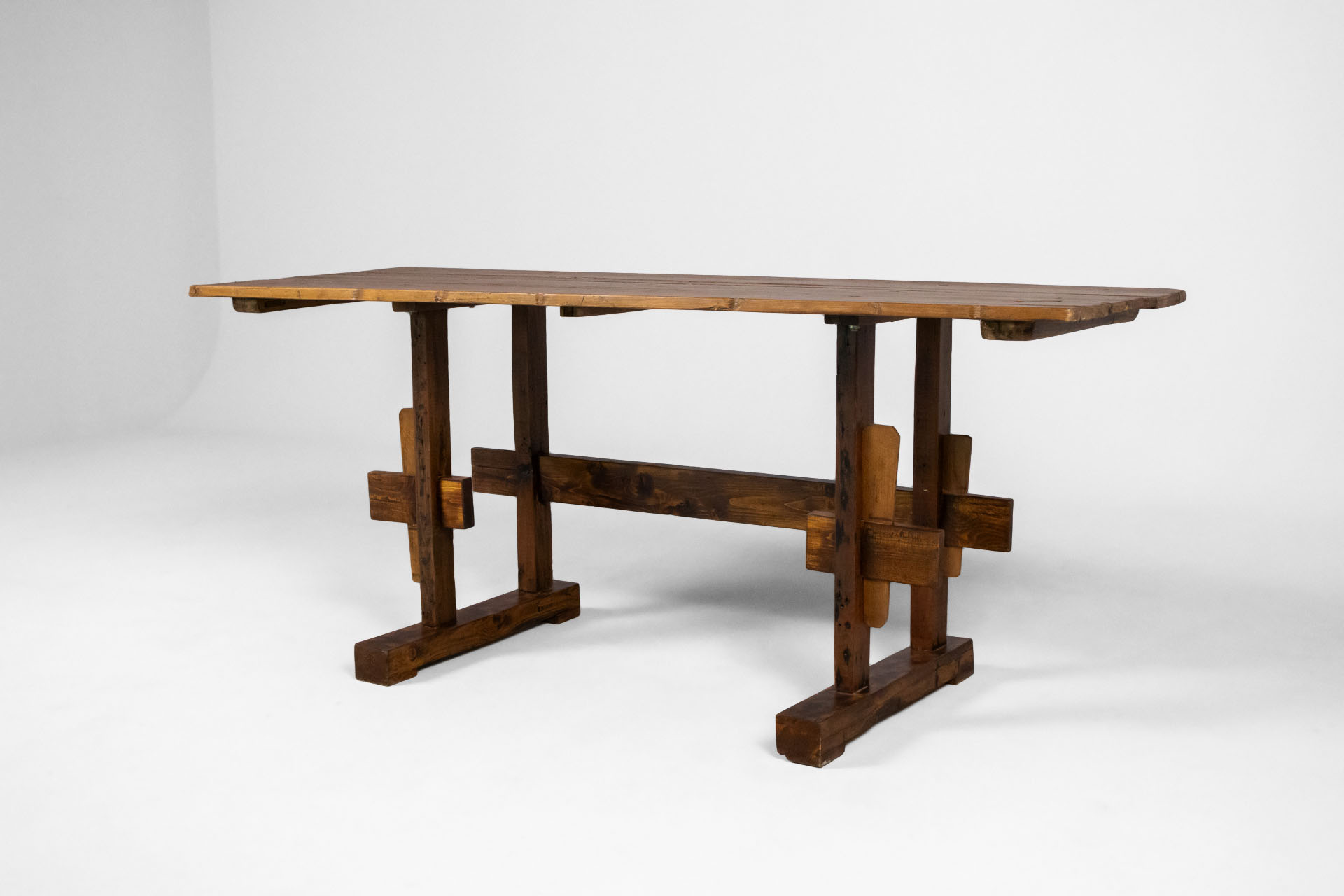 Masszív, rusztikus stílusú faasztal, széles, téglalap alakú asztallappal és erős, geometrikus formájú lábakkal, amely a vidéki otthonok vagy tökéletes kiegészítője lehet